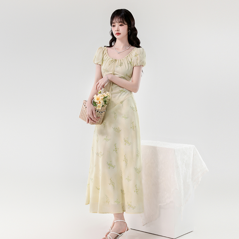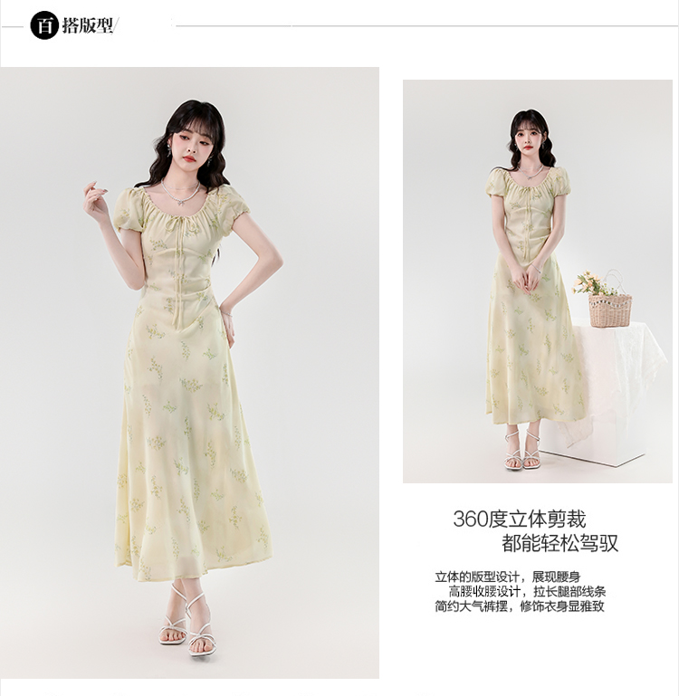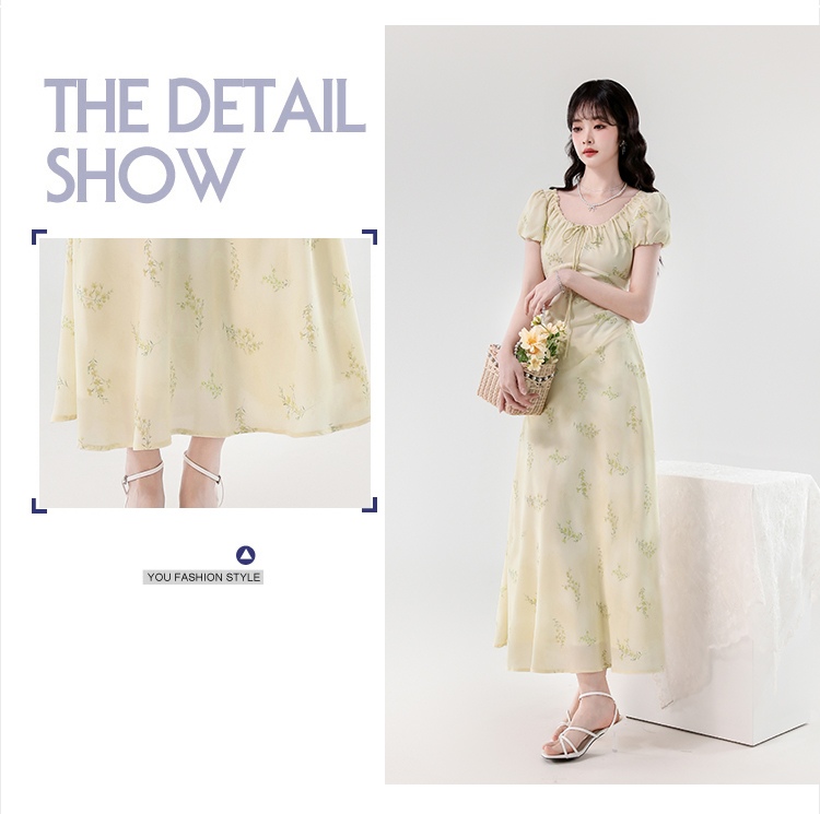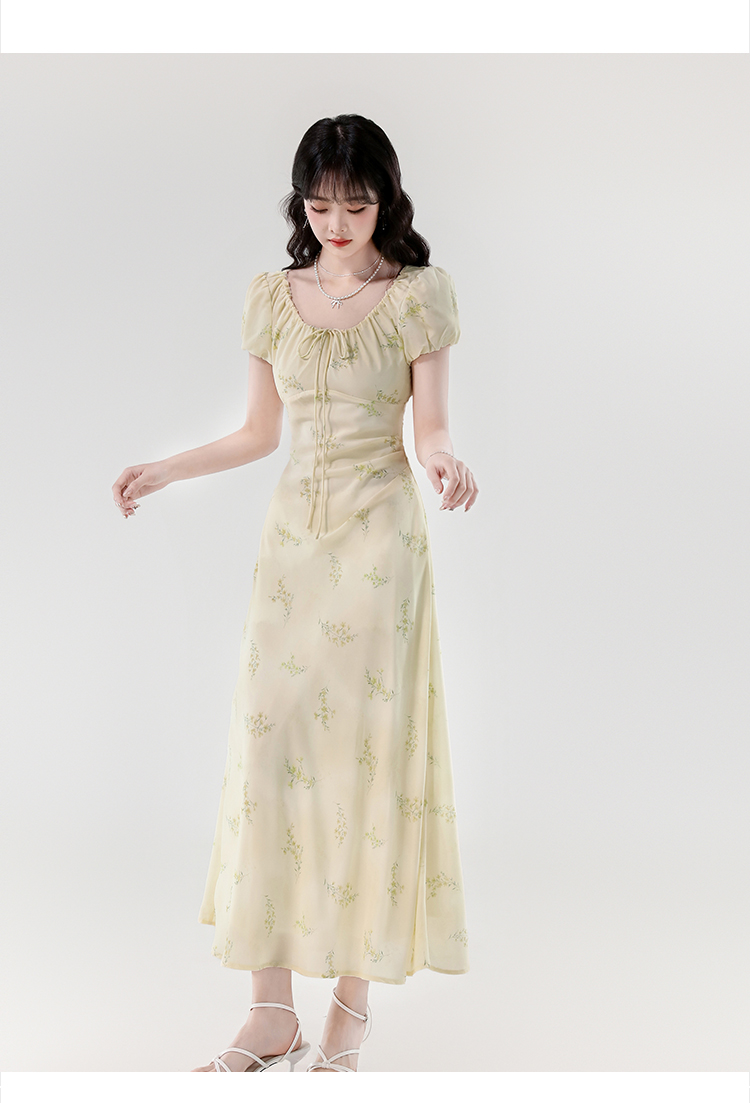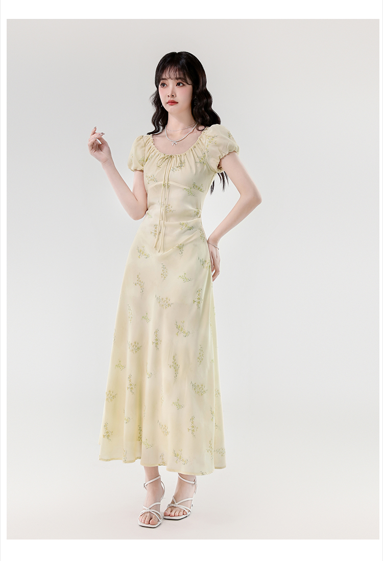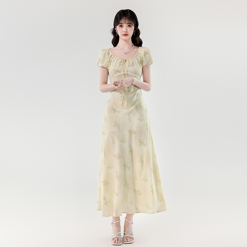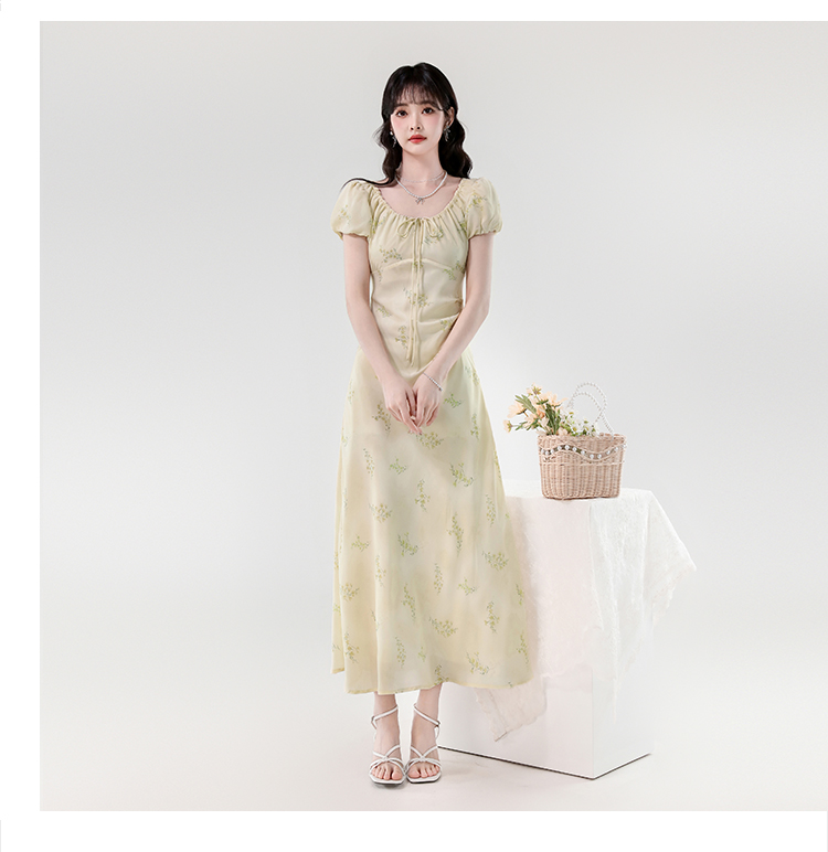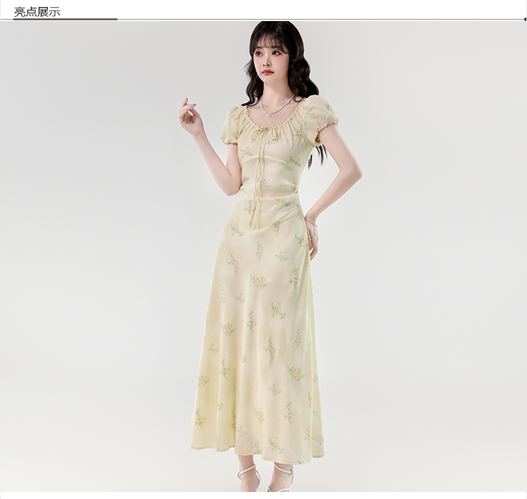 RY392# 实拍2026夏季新款法式浪漫小清新碎花抽绳设计感显瘦长款连衣裙