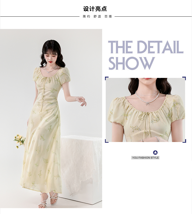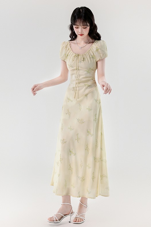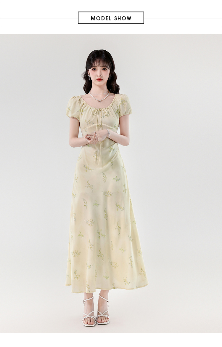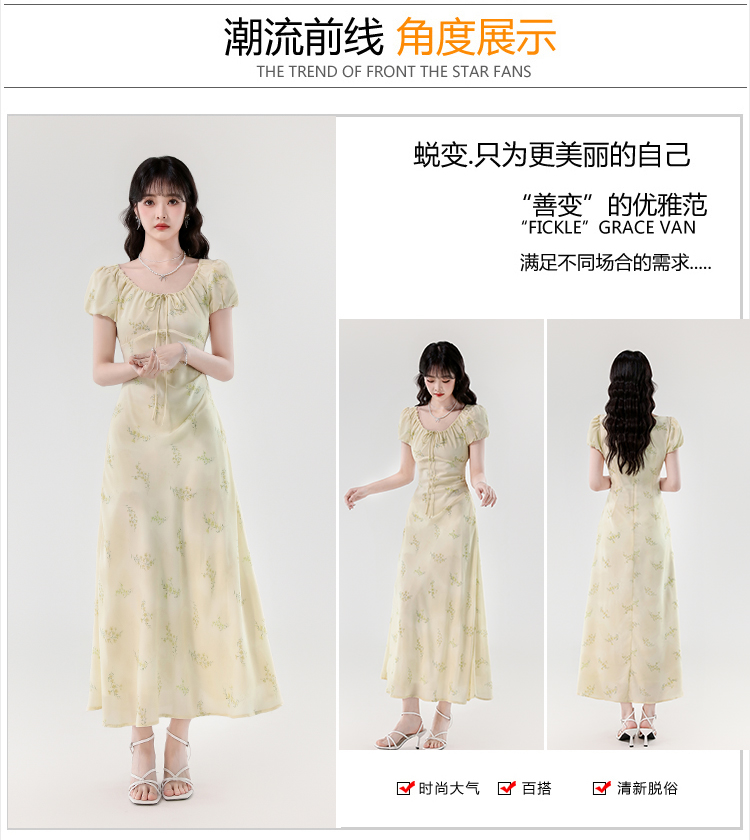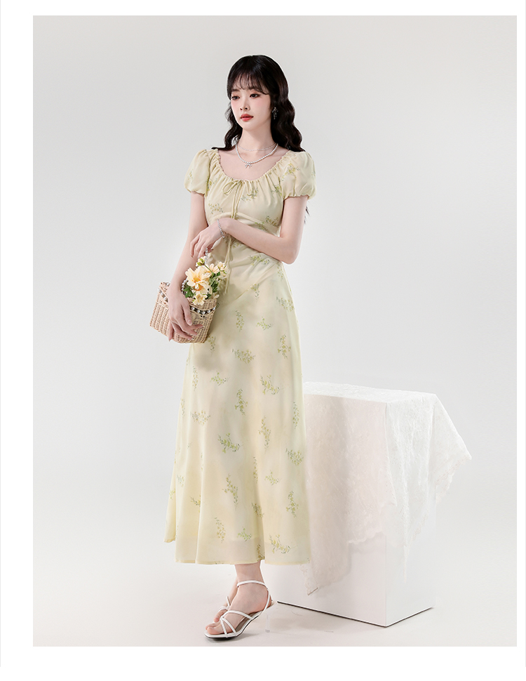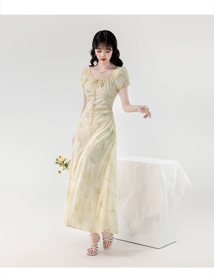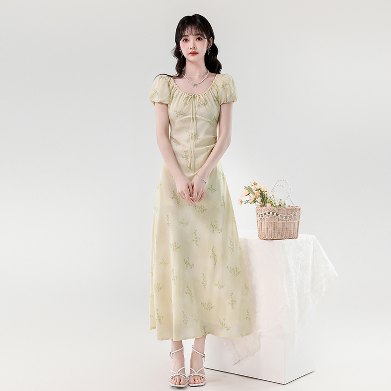 RY392# 实拍2026夏季新款法式浪漫小清新碎花抽绳设计感显瘦长款连衣裙
