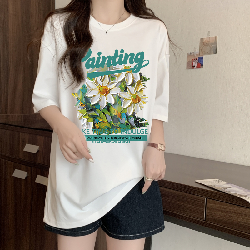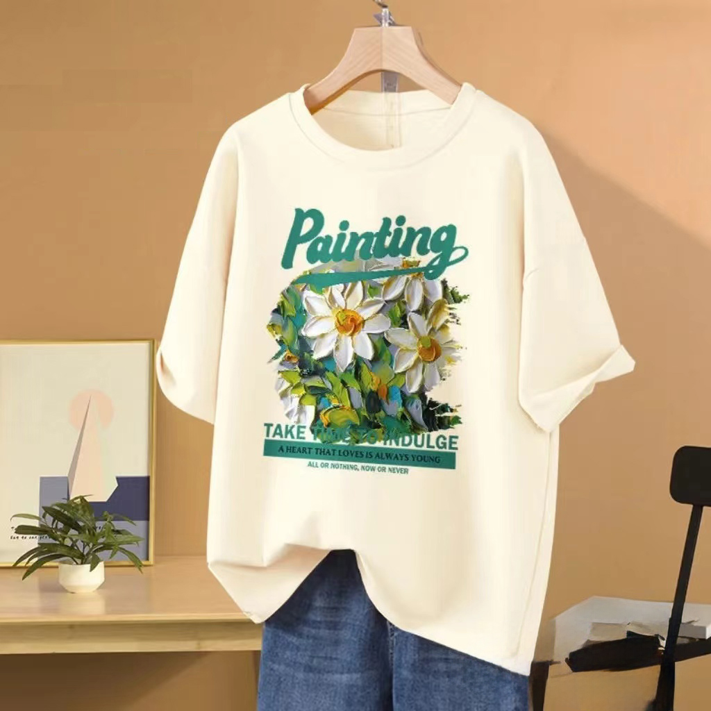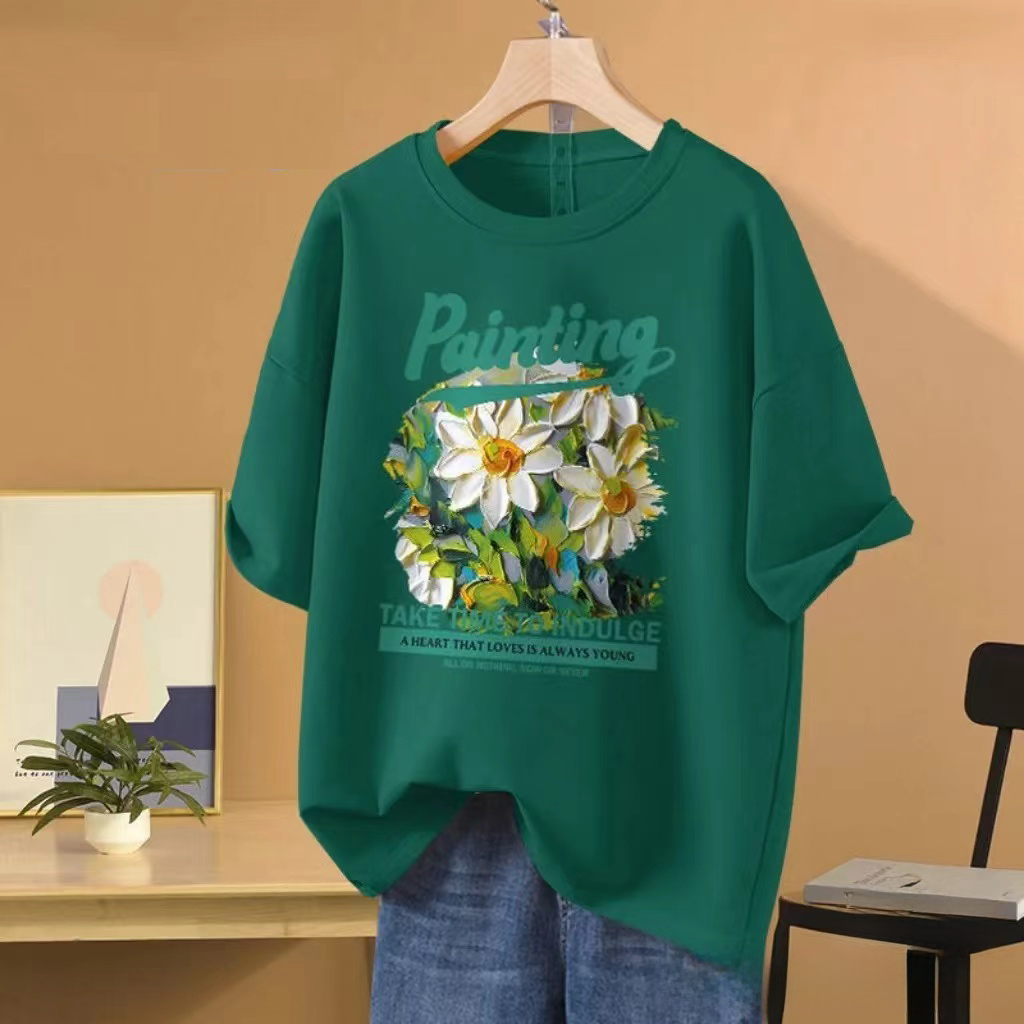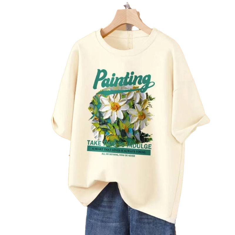 RY416# 短袖t恤女纯棉夏季2025韩版新款设计感油画菊小青新大码胖mm上衣