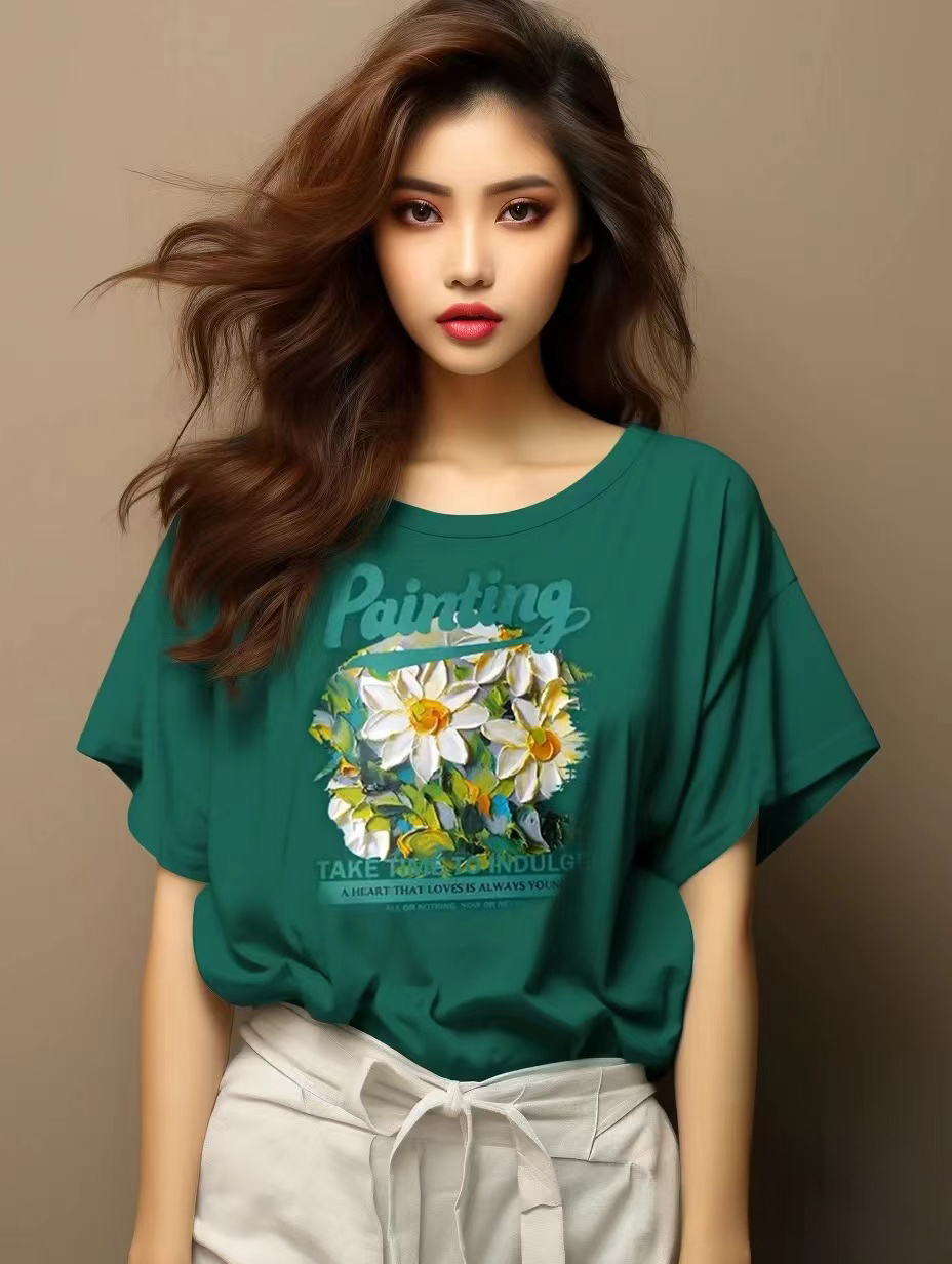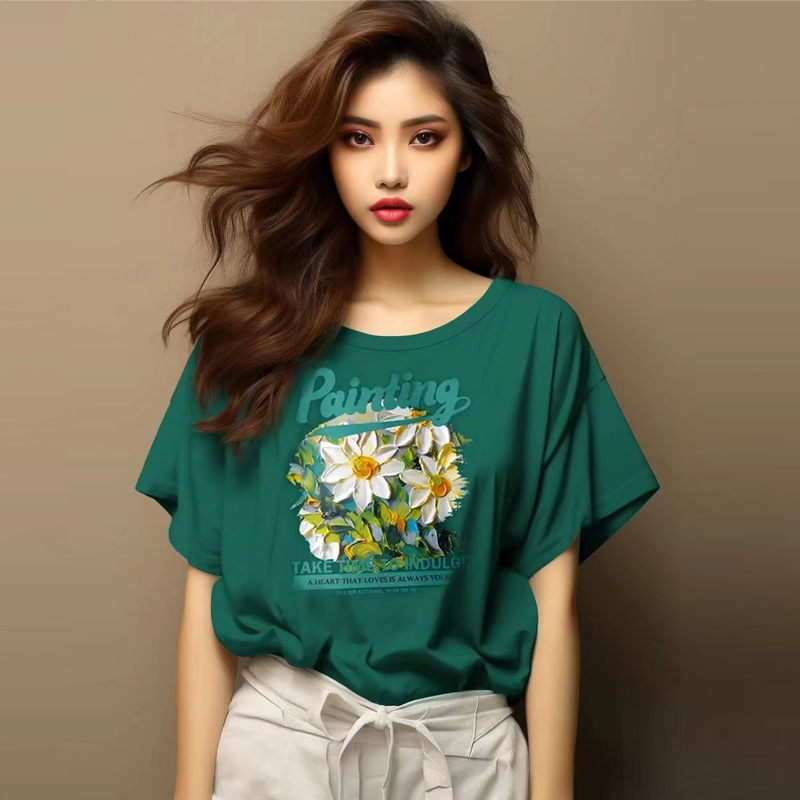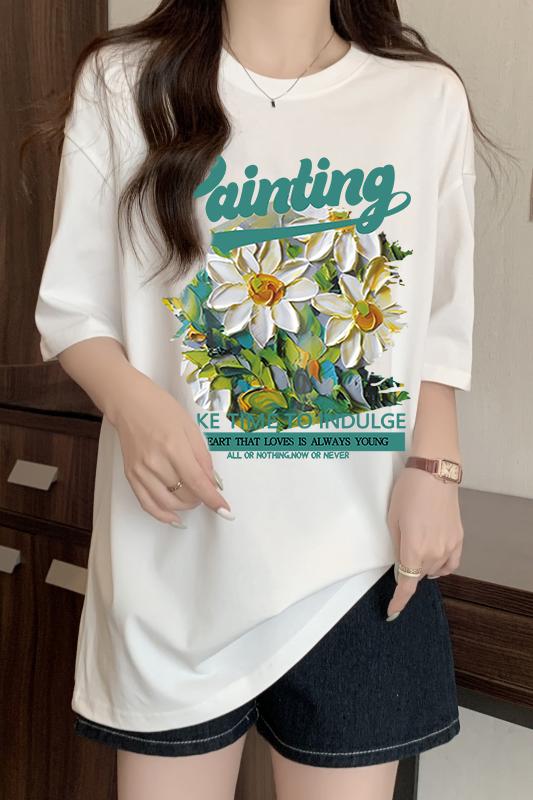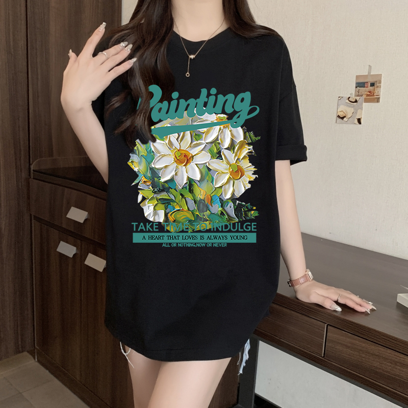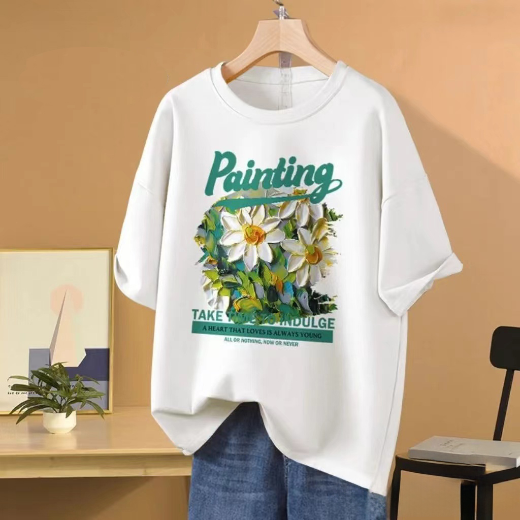 RY416# 短袖t恤女纯棉夏季2025韩版新款设计感油画菊小青新大码胖mm上衣