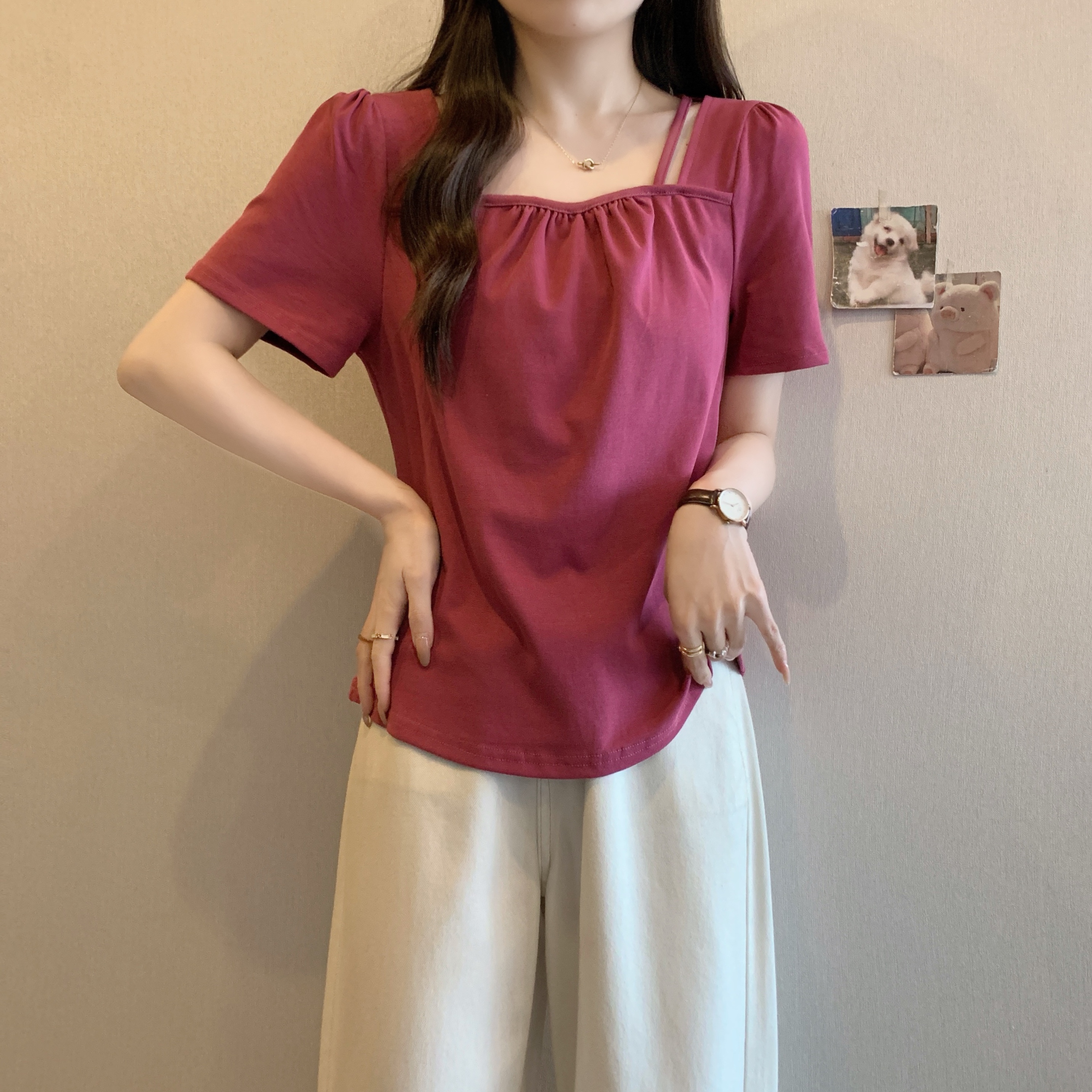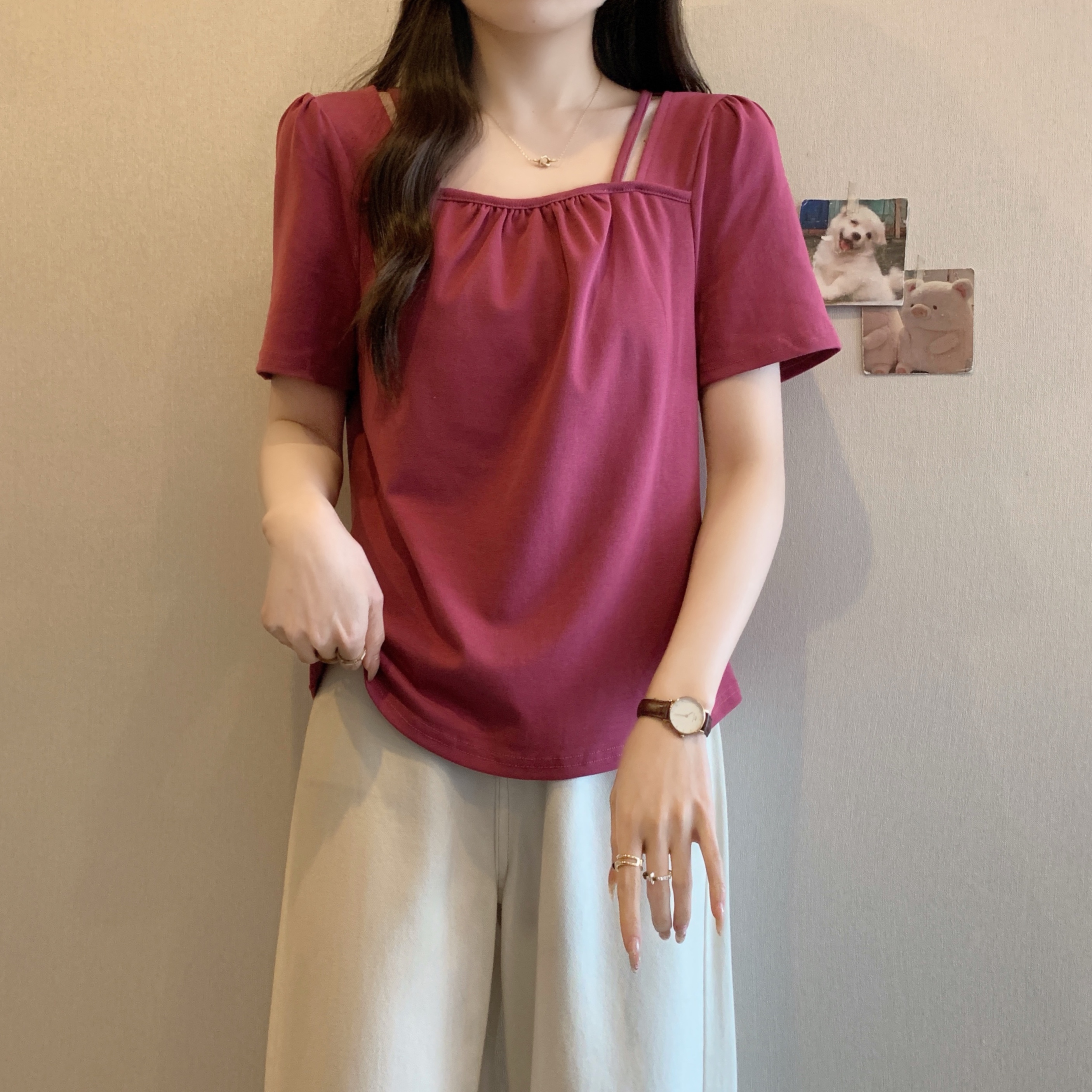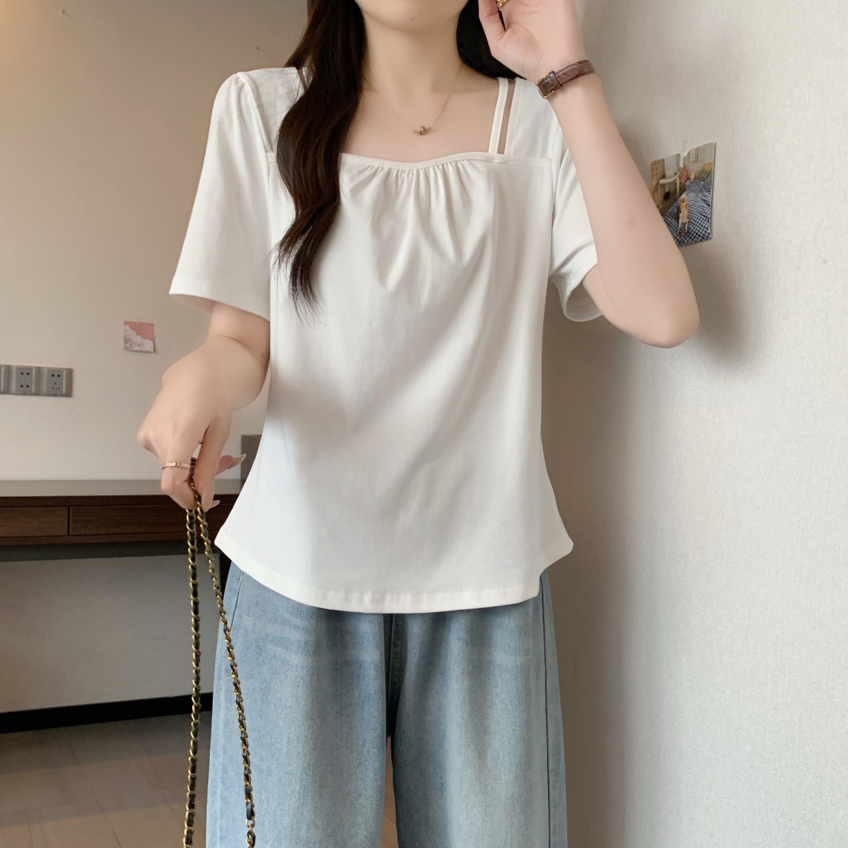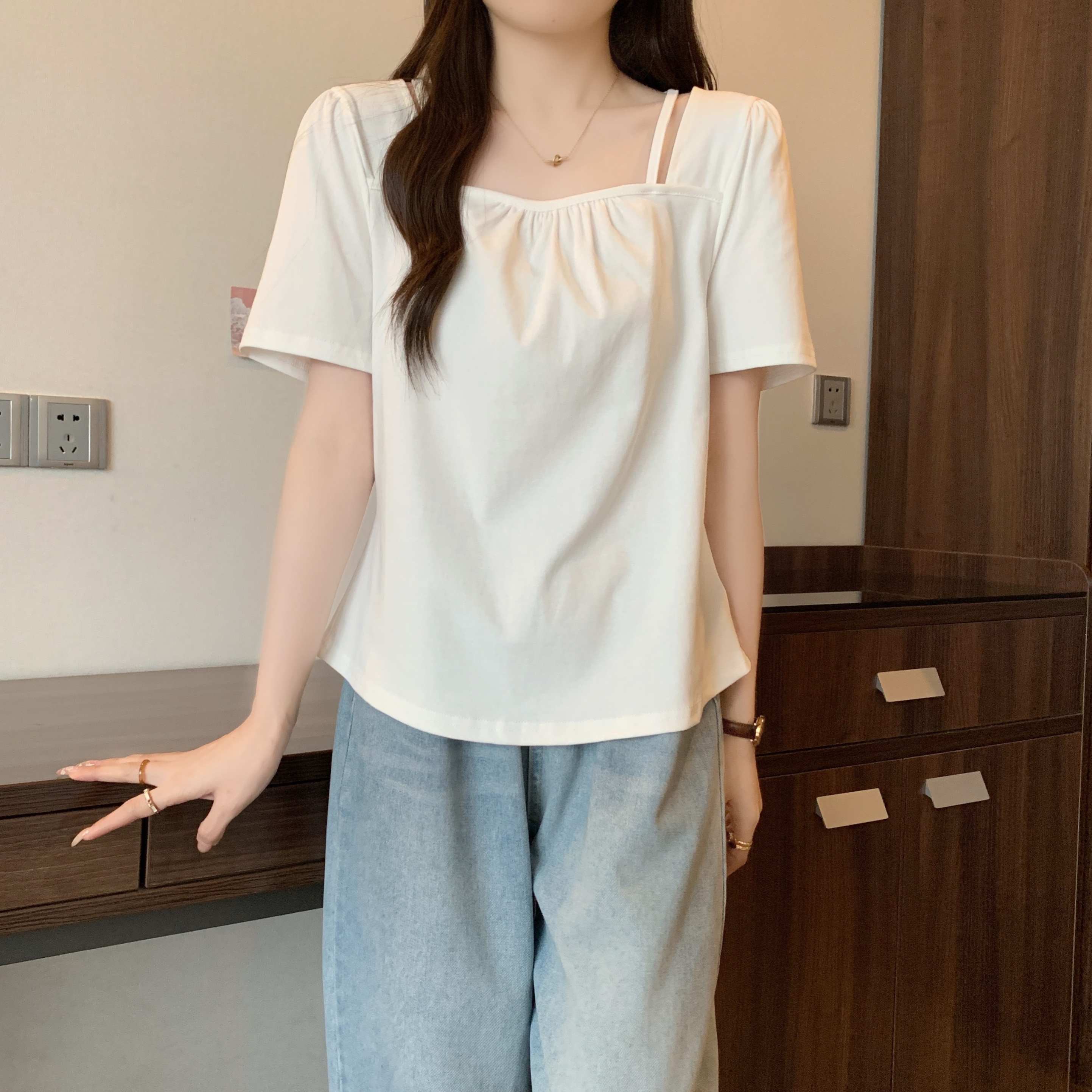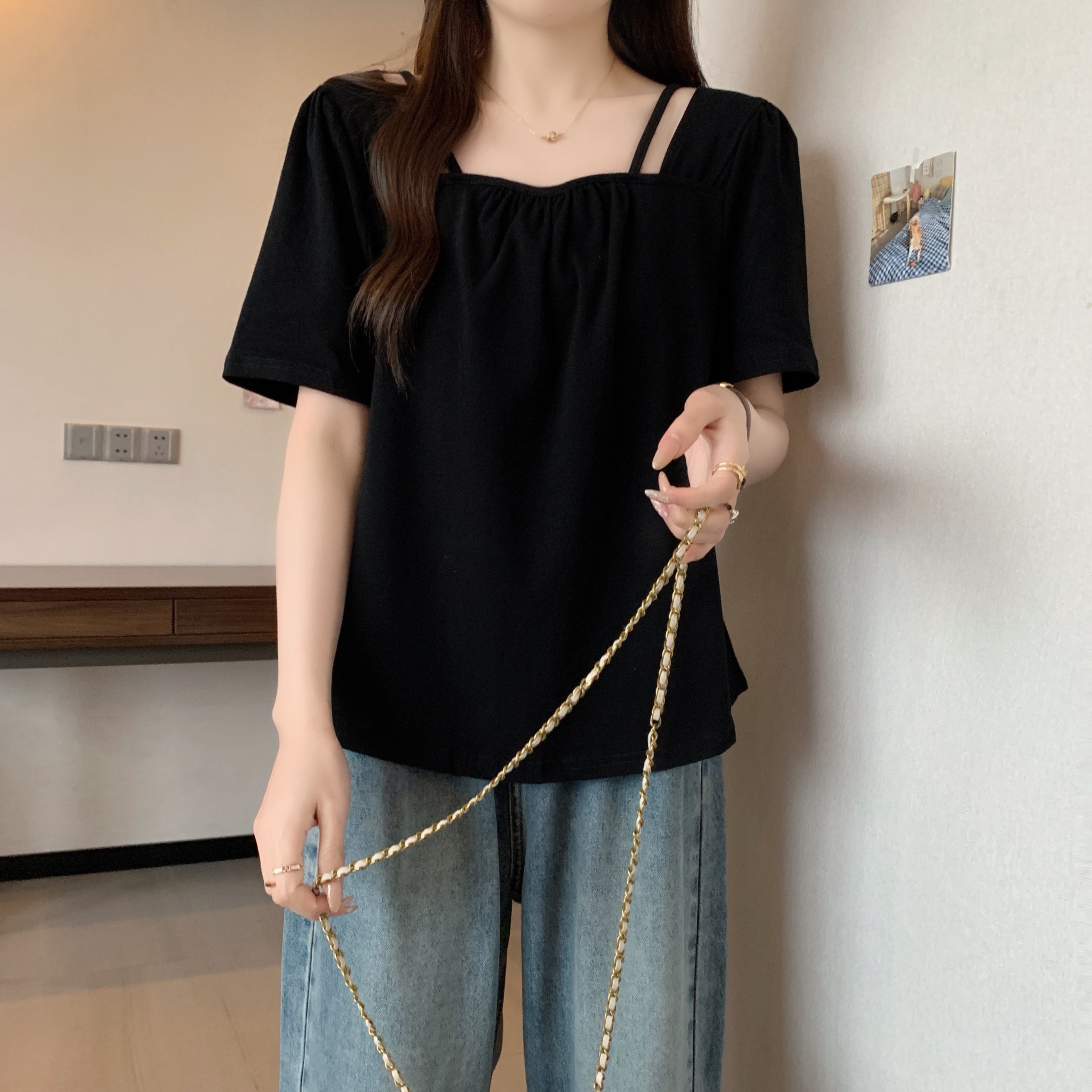 RY462# 实拍2026夏装新款胖mm大码女方领褶皱短袖t恤设计感正肩显瘦上衣