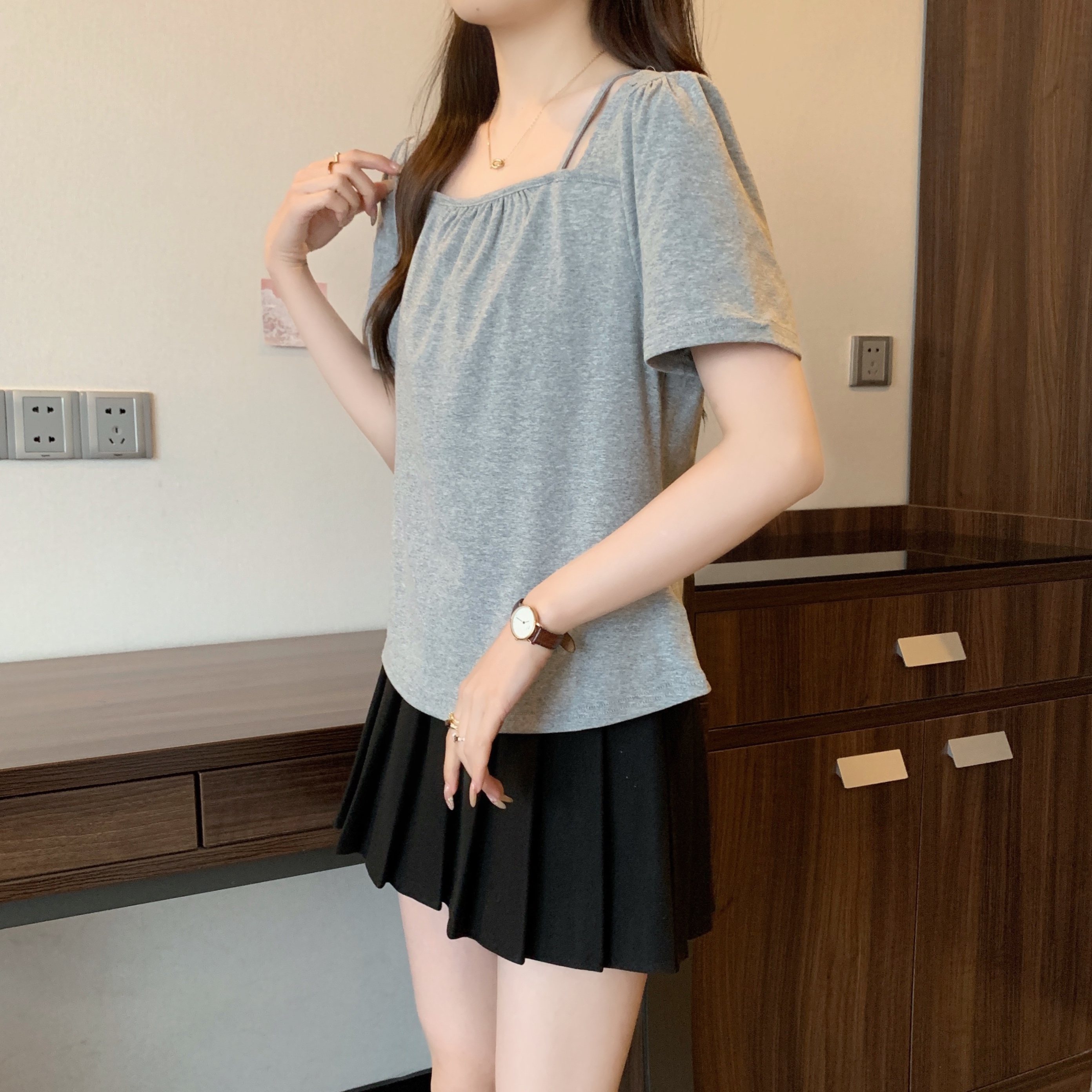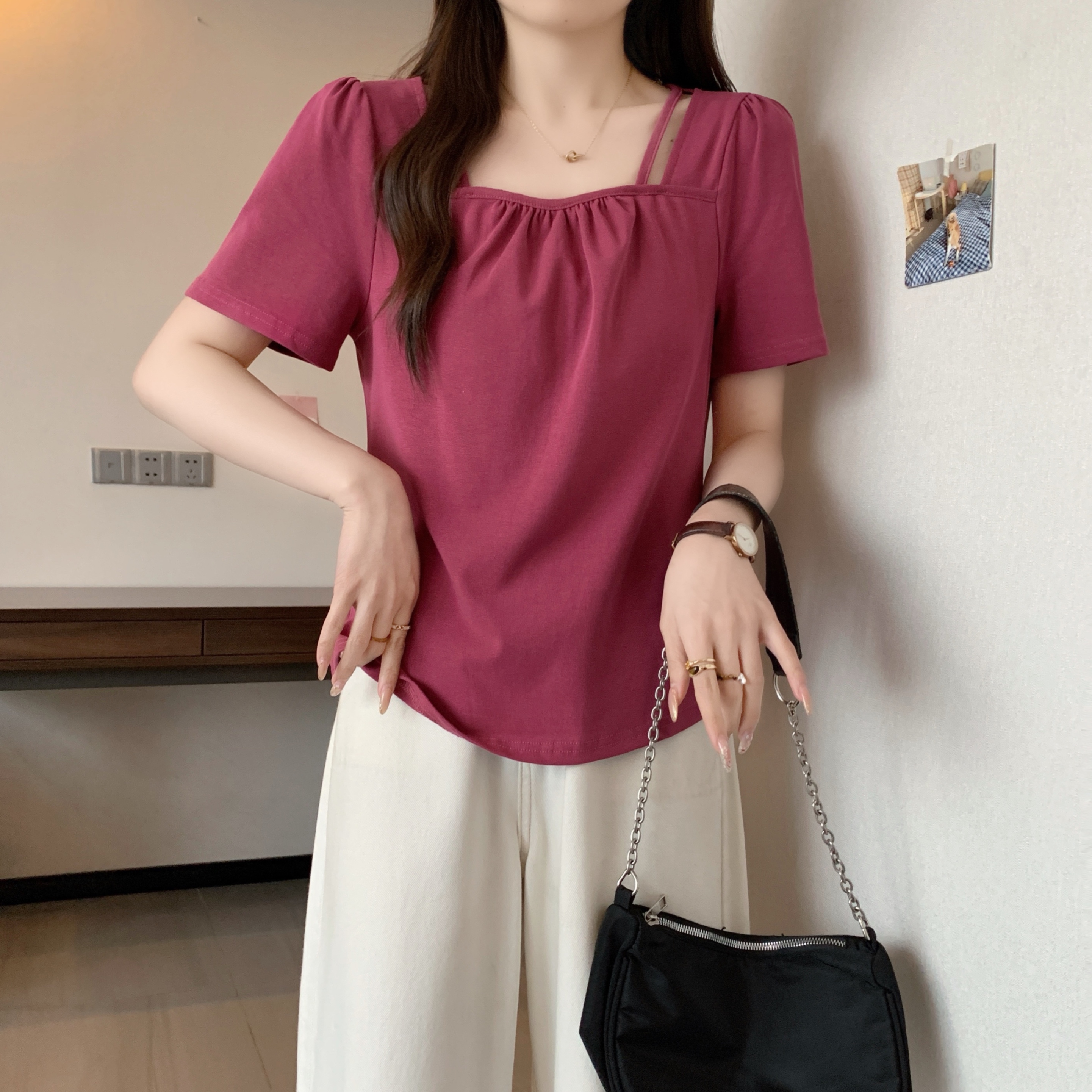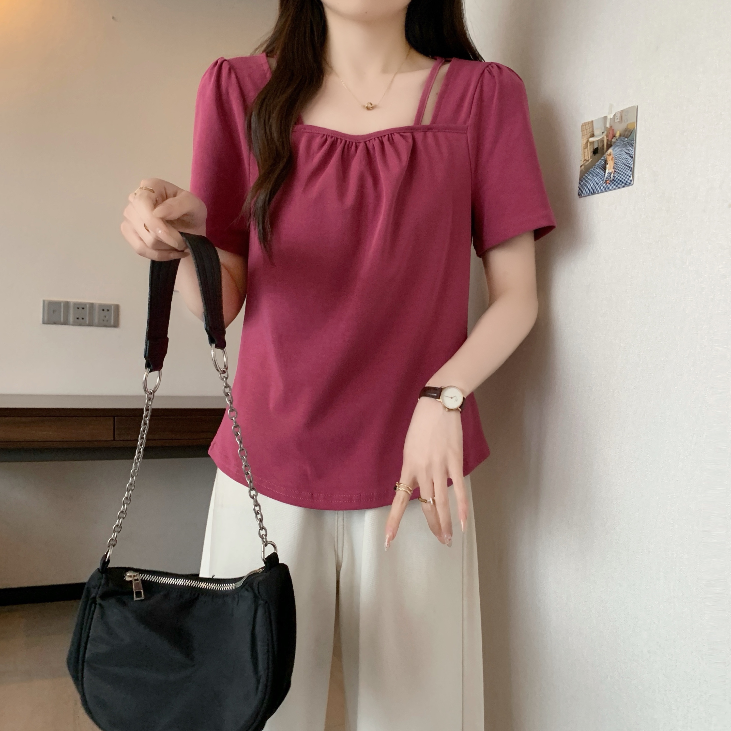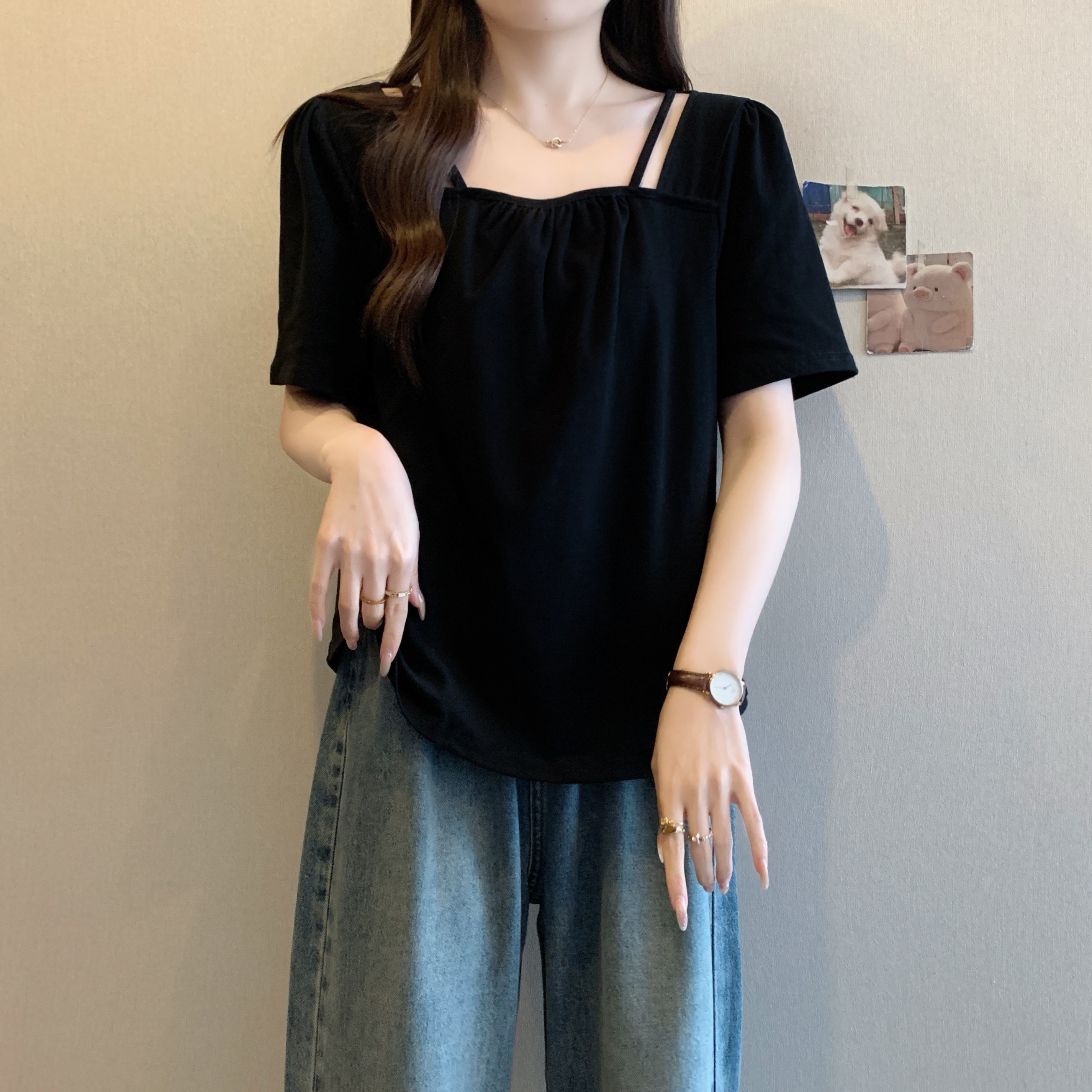 RY462# 实拍2026夏装新款胖mm大码女方领褶皱短袖t恤设计感正肩显瘦上衣