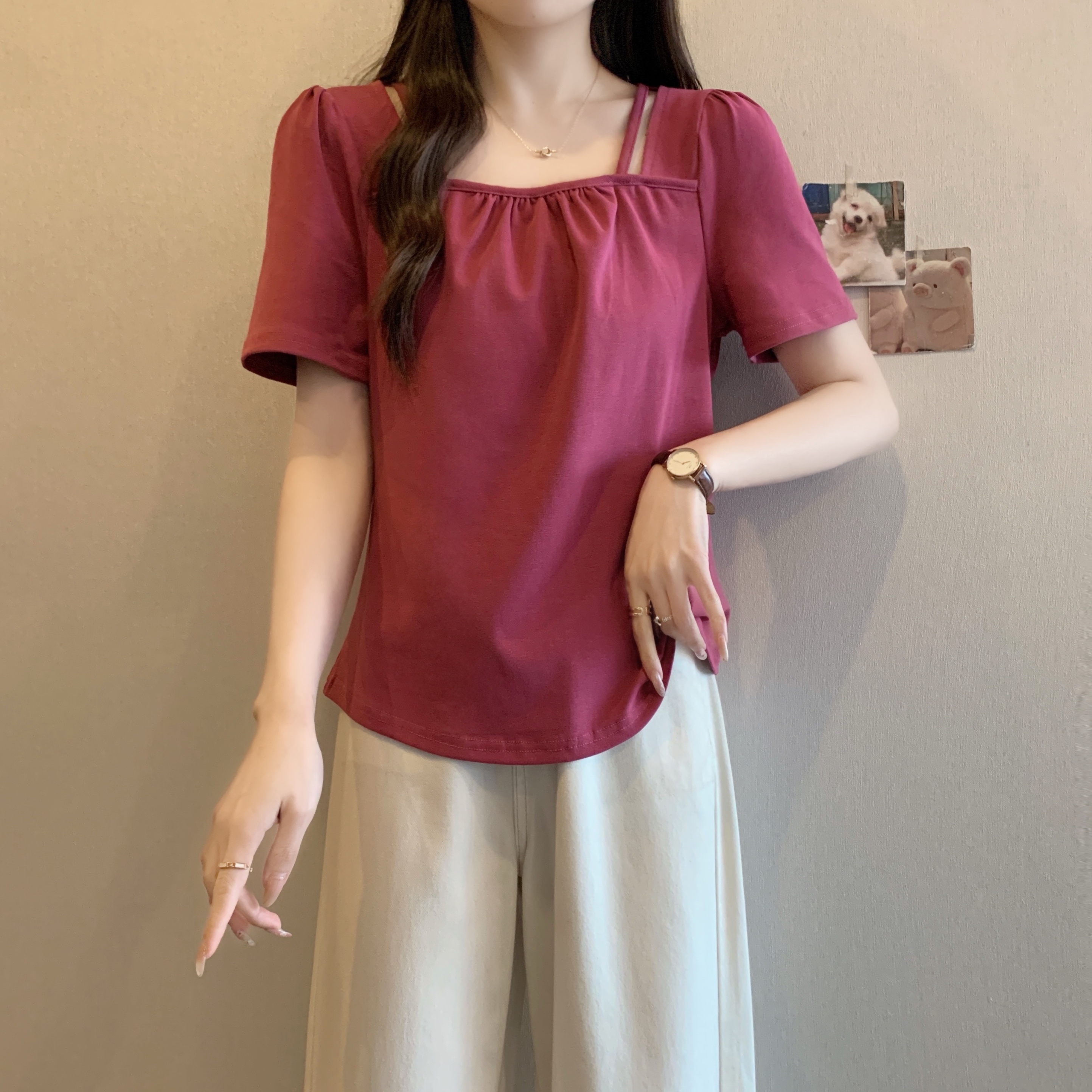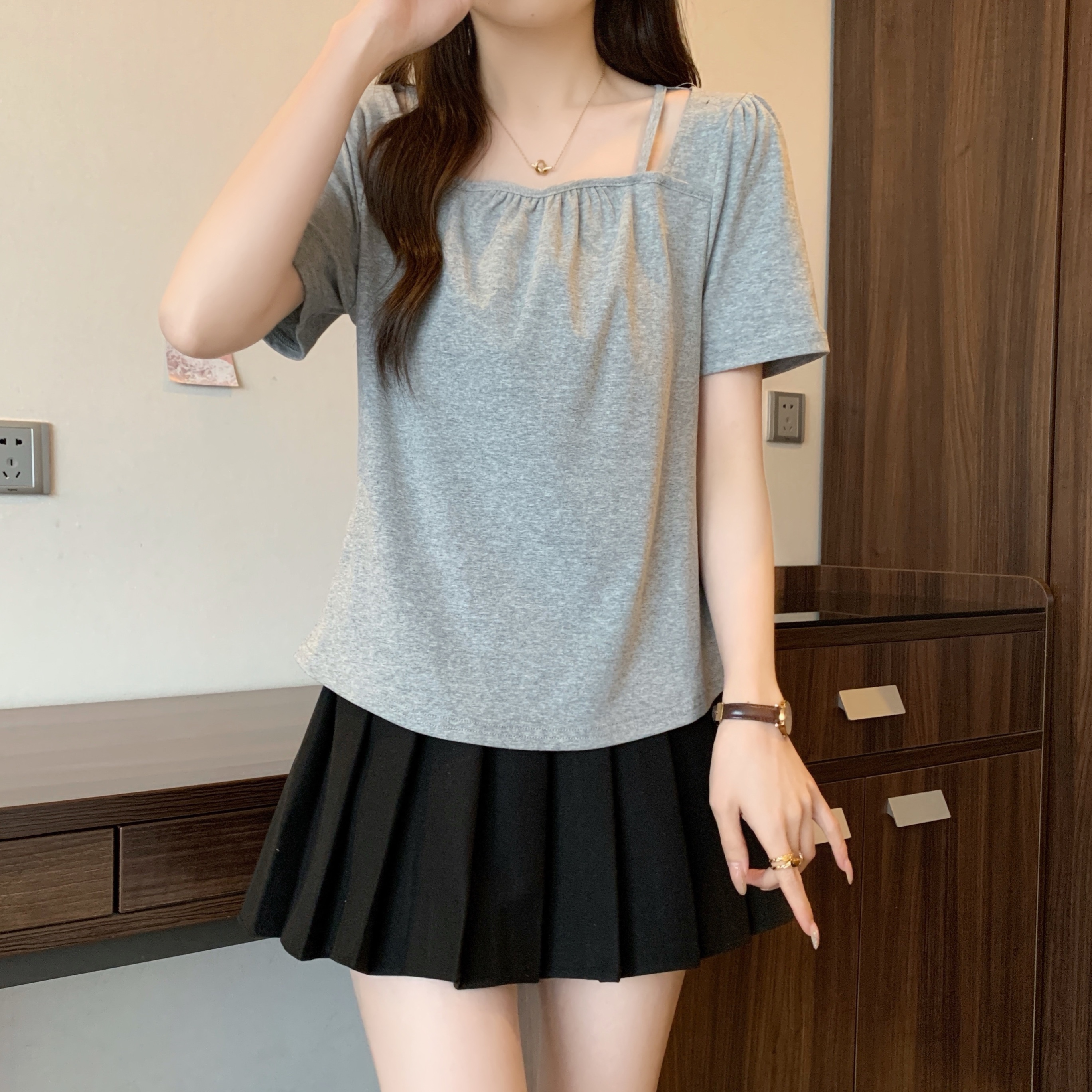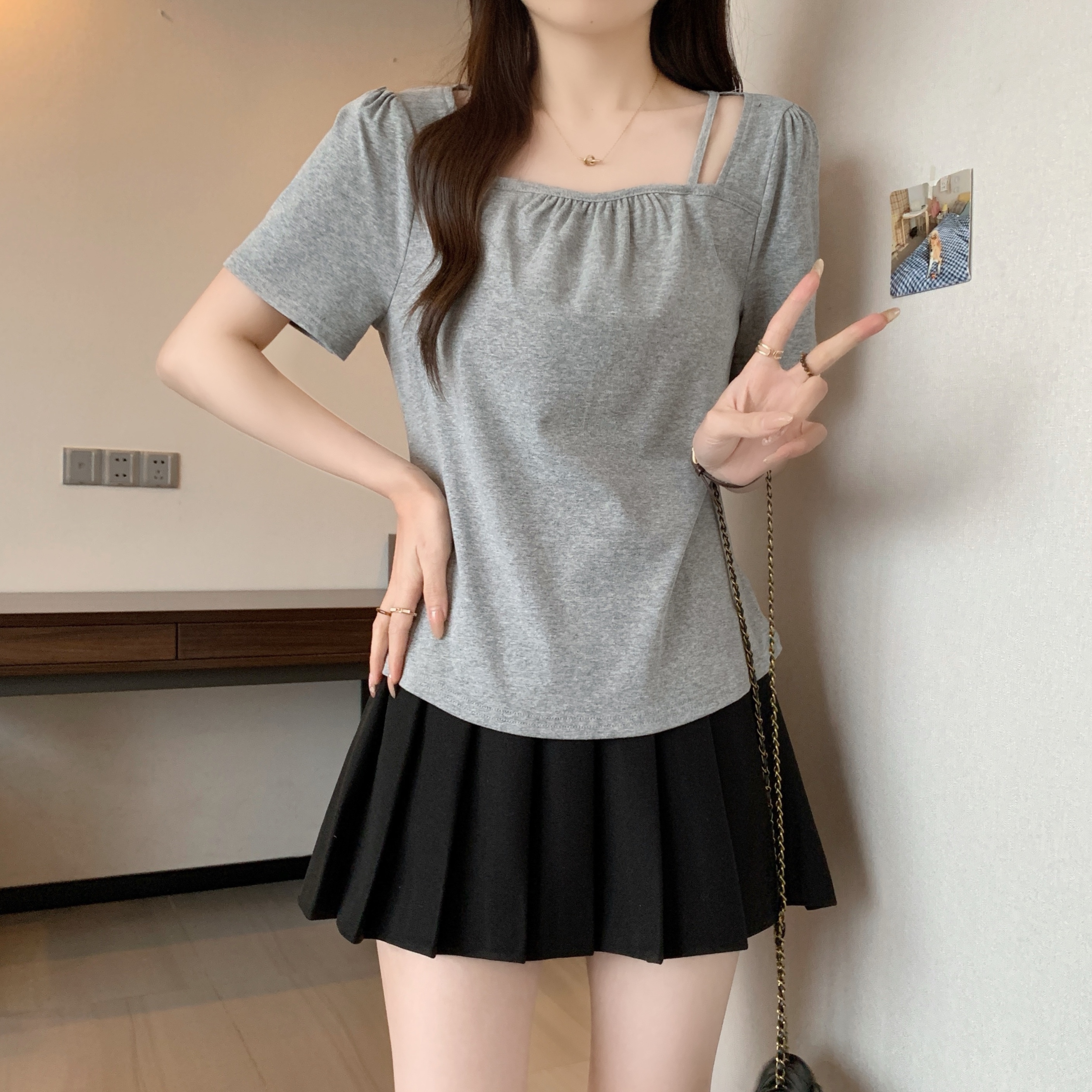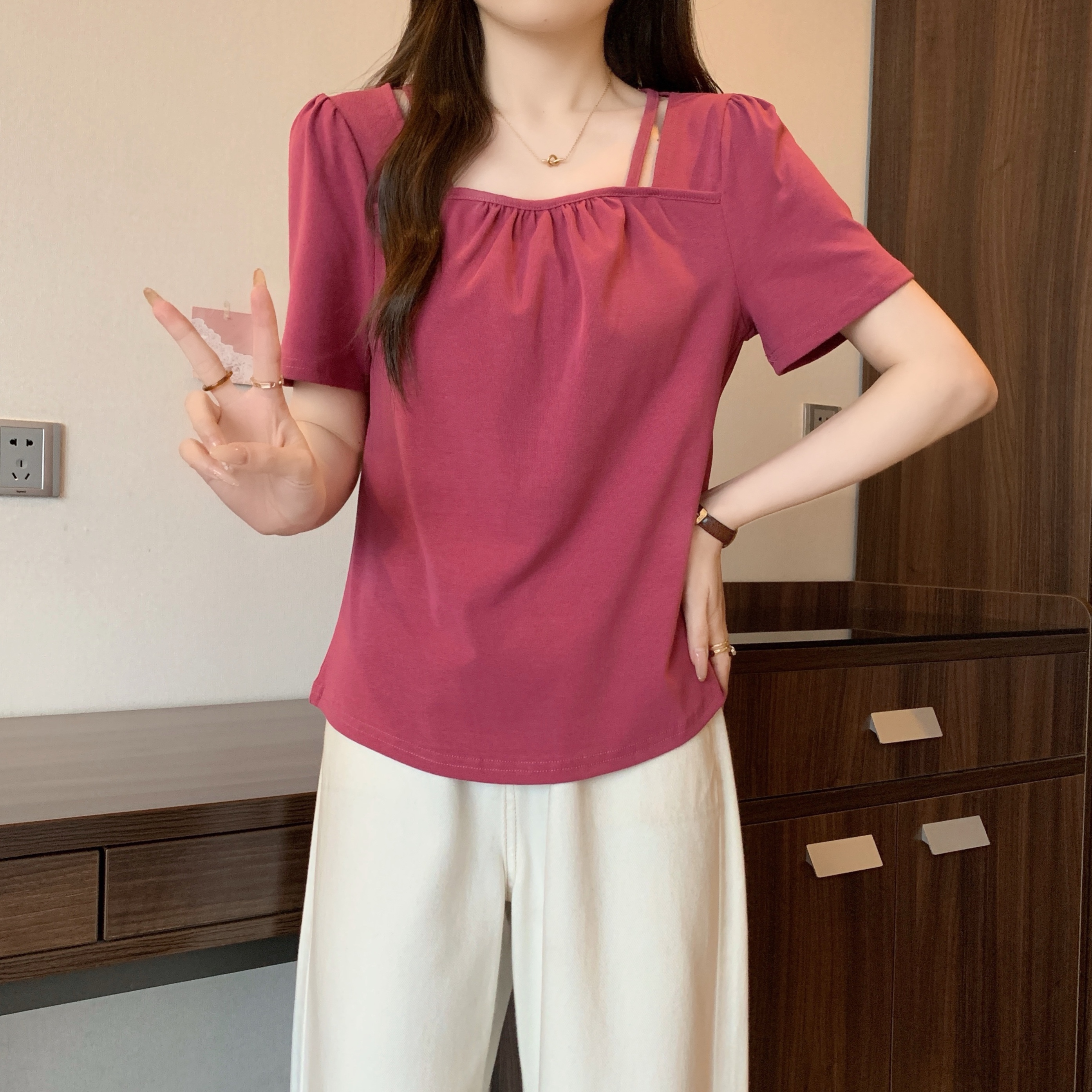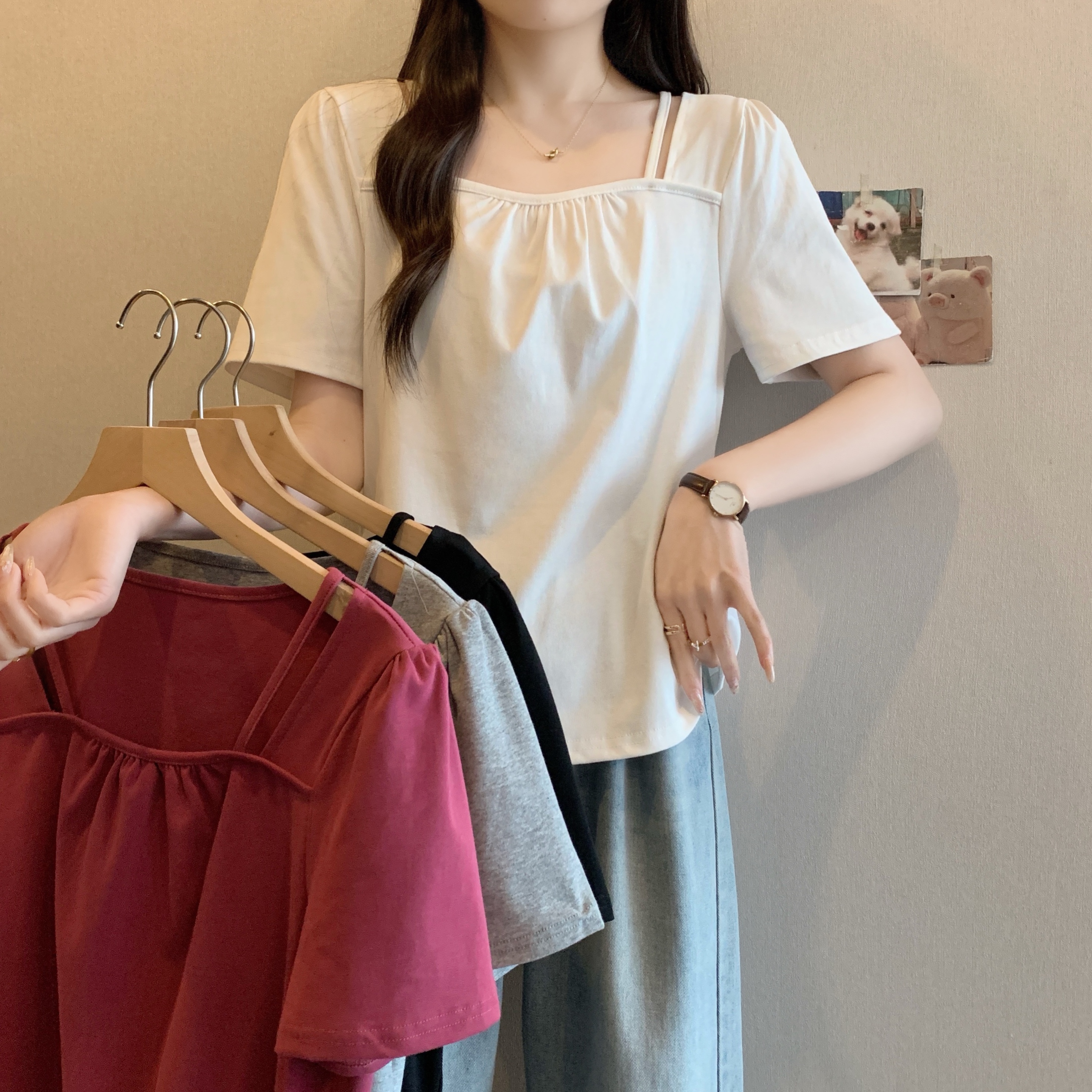 RY462# 实拍2026夏装新款胖mm大码女方领褶皱短袖t恤设计感正肩显瘦上衣
