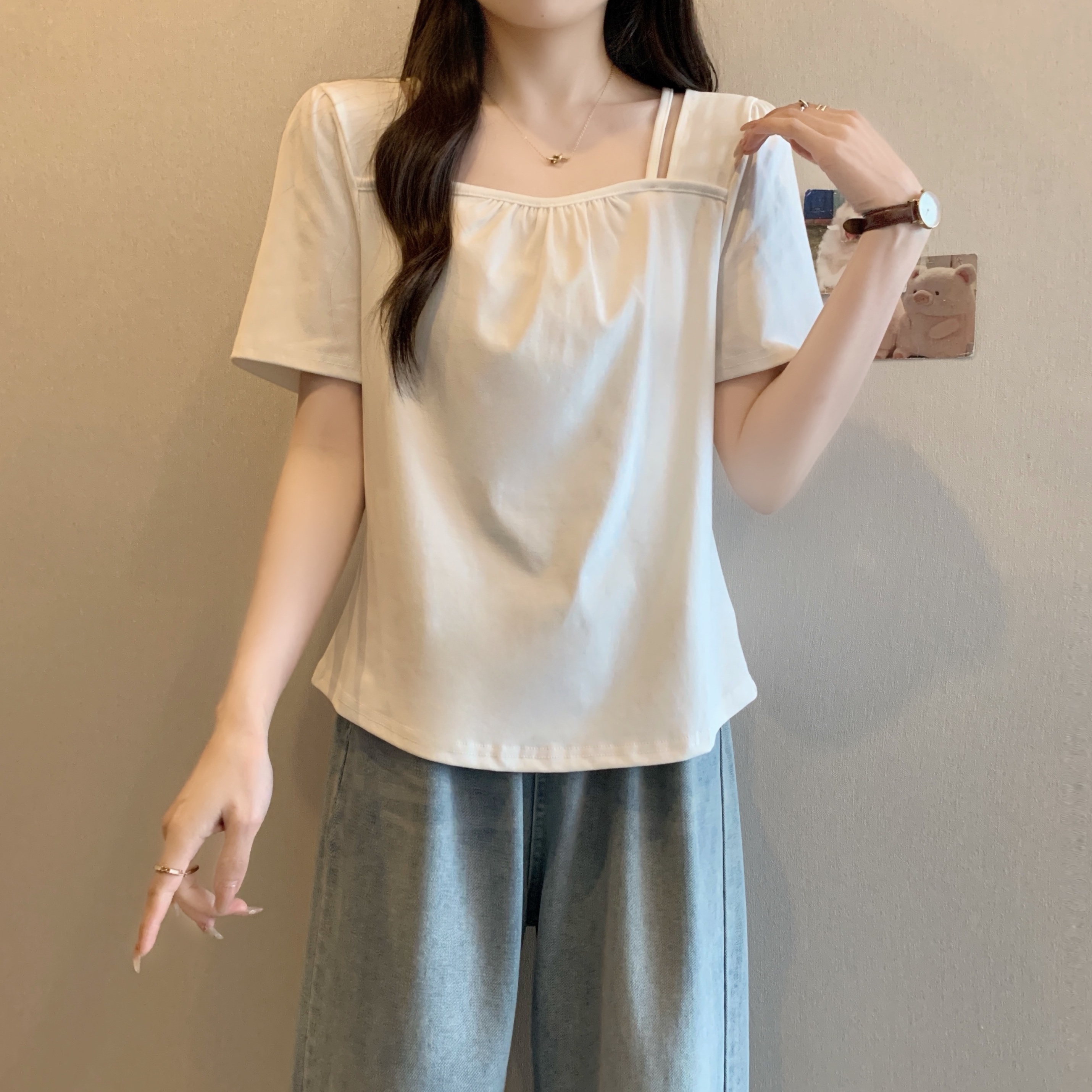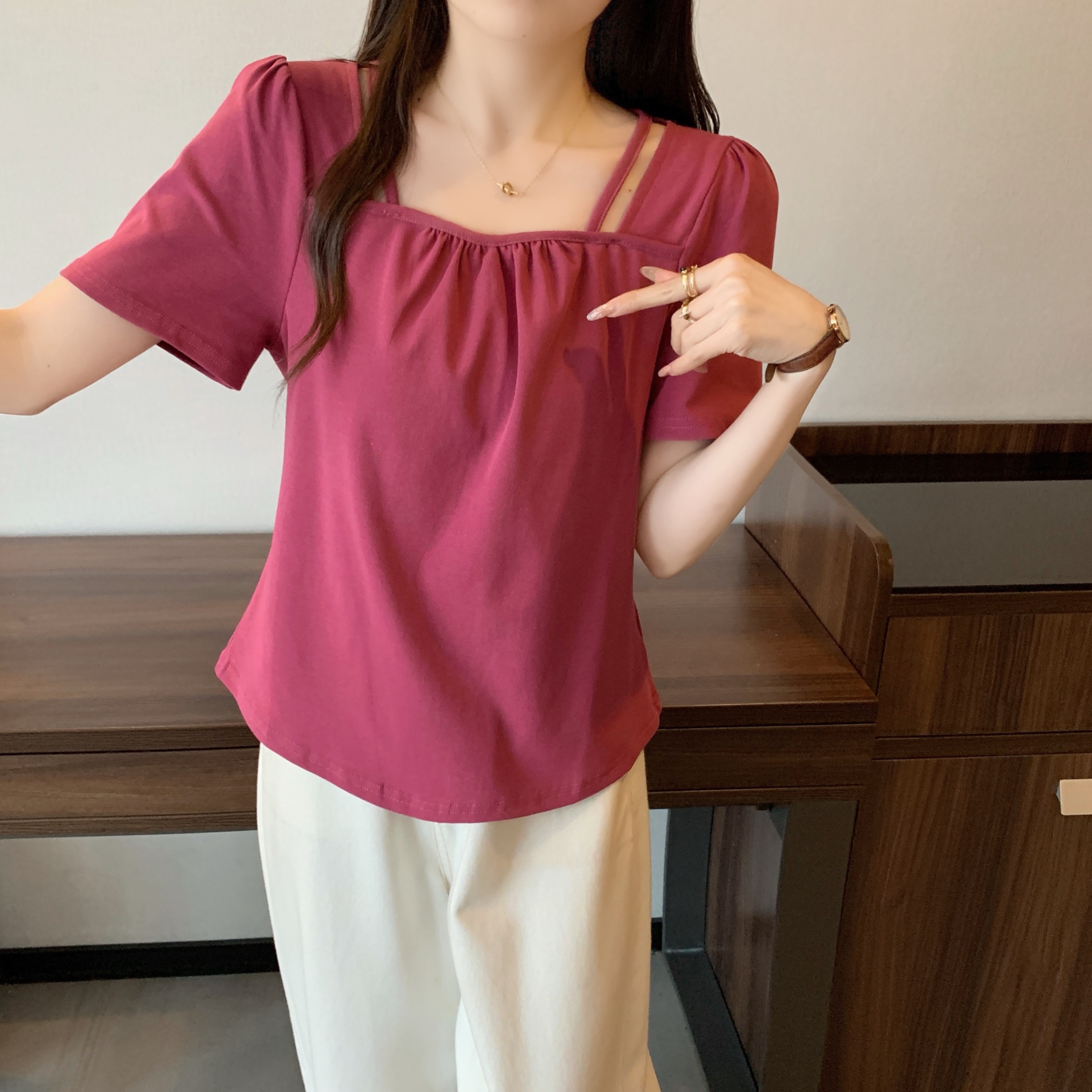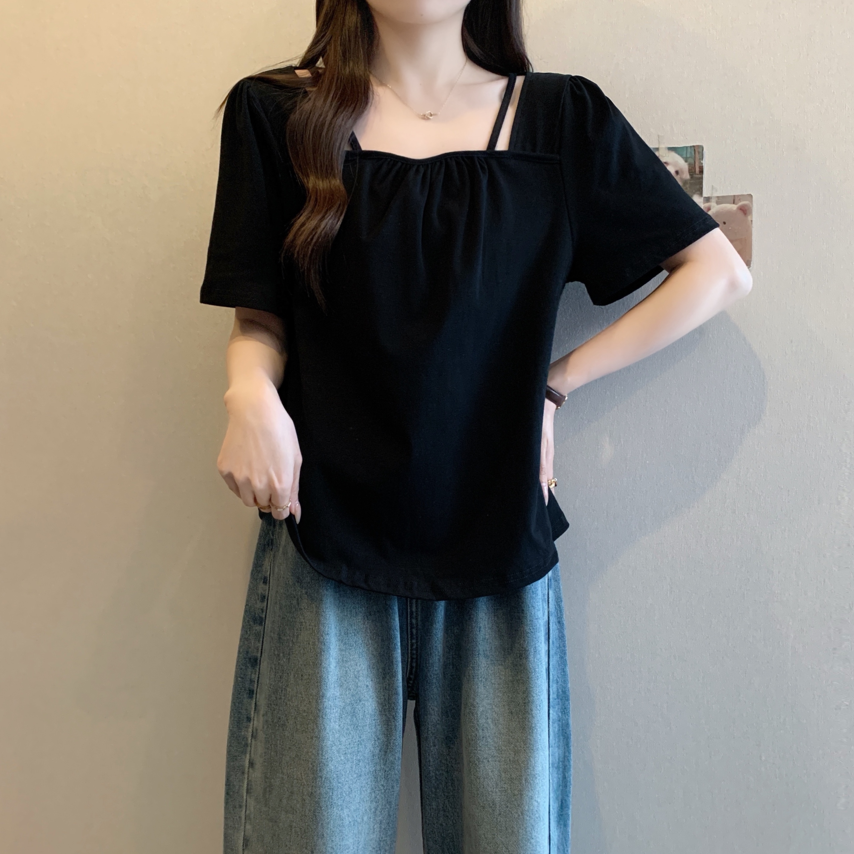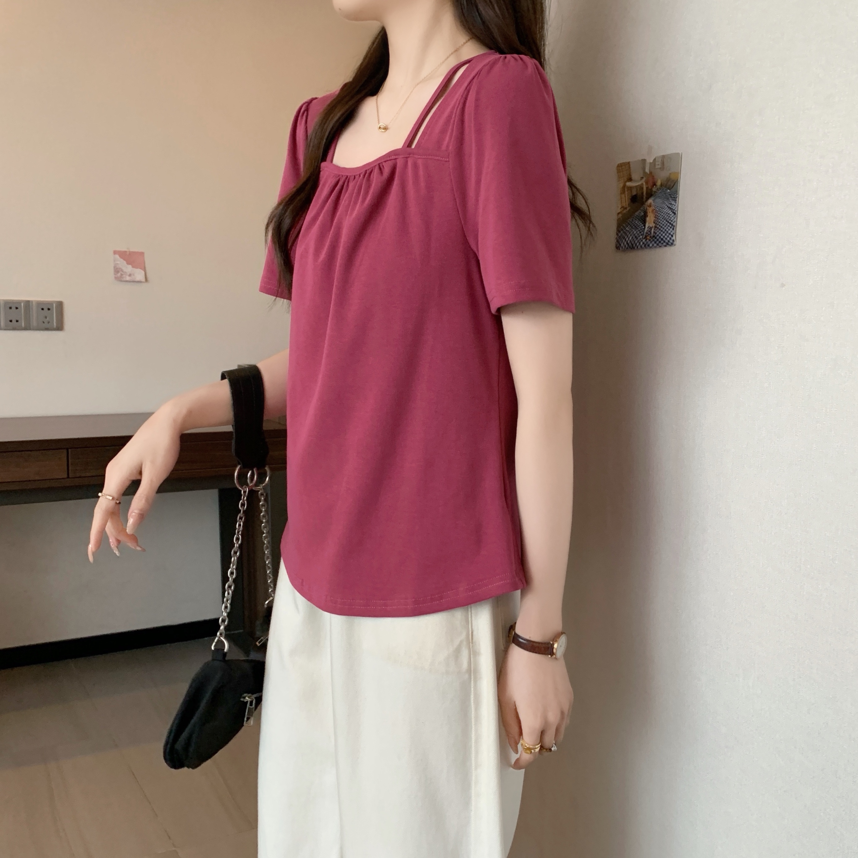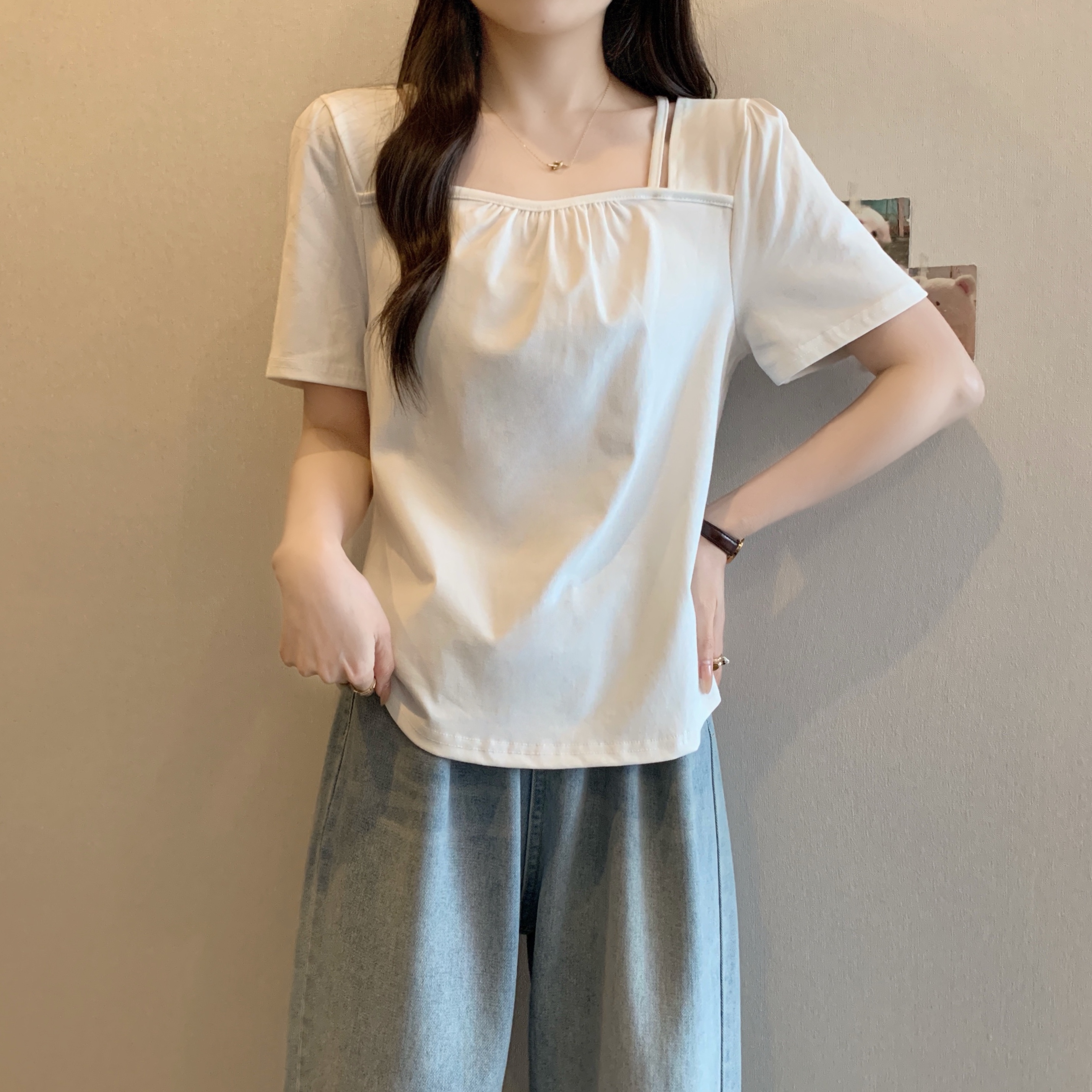 RY462# 实拍2026夏装新款胖mm大码女方领褶皱短袖t恤设计感正肩显瘦上衣