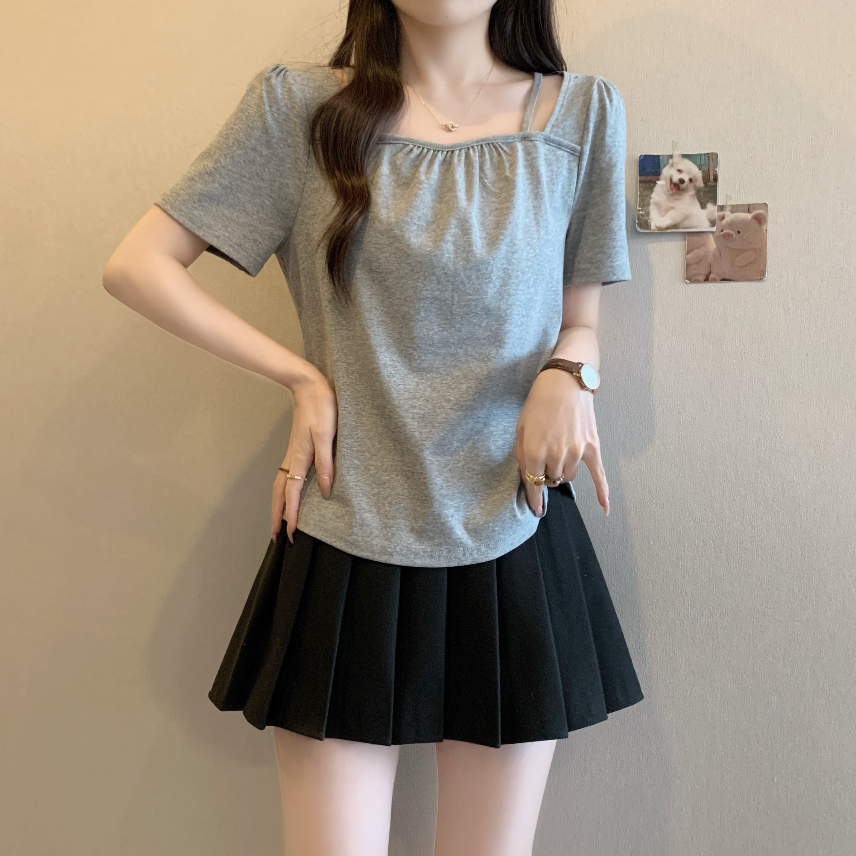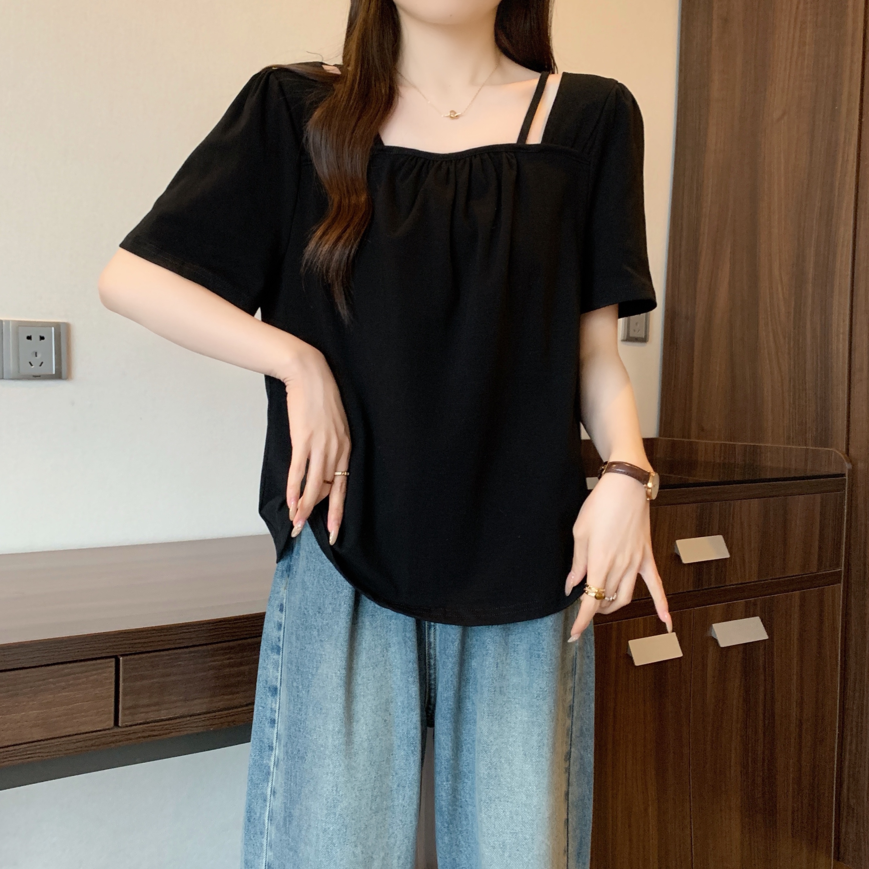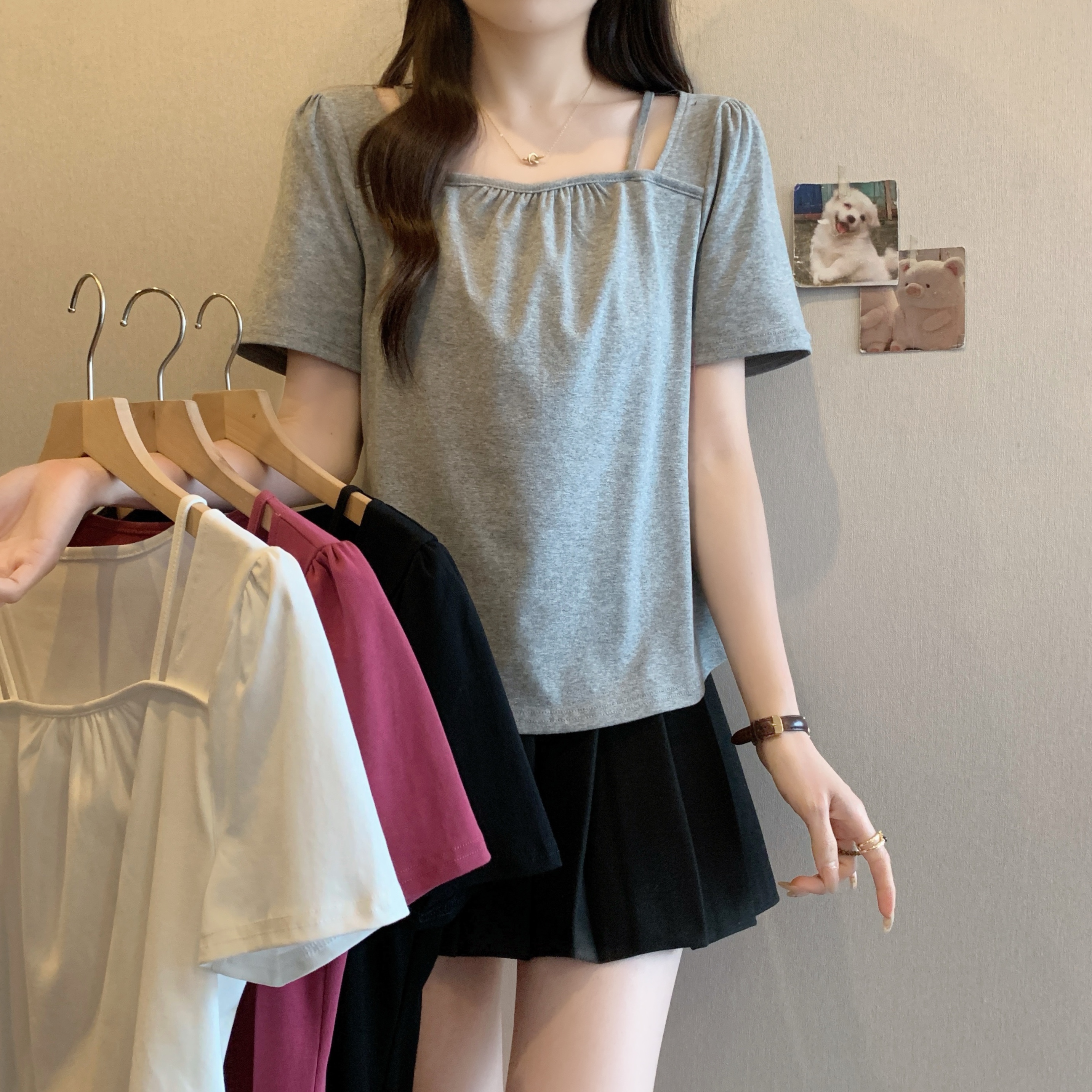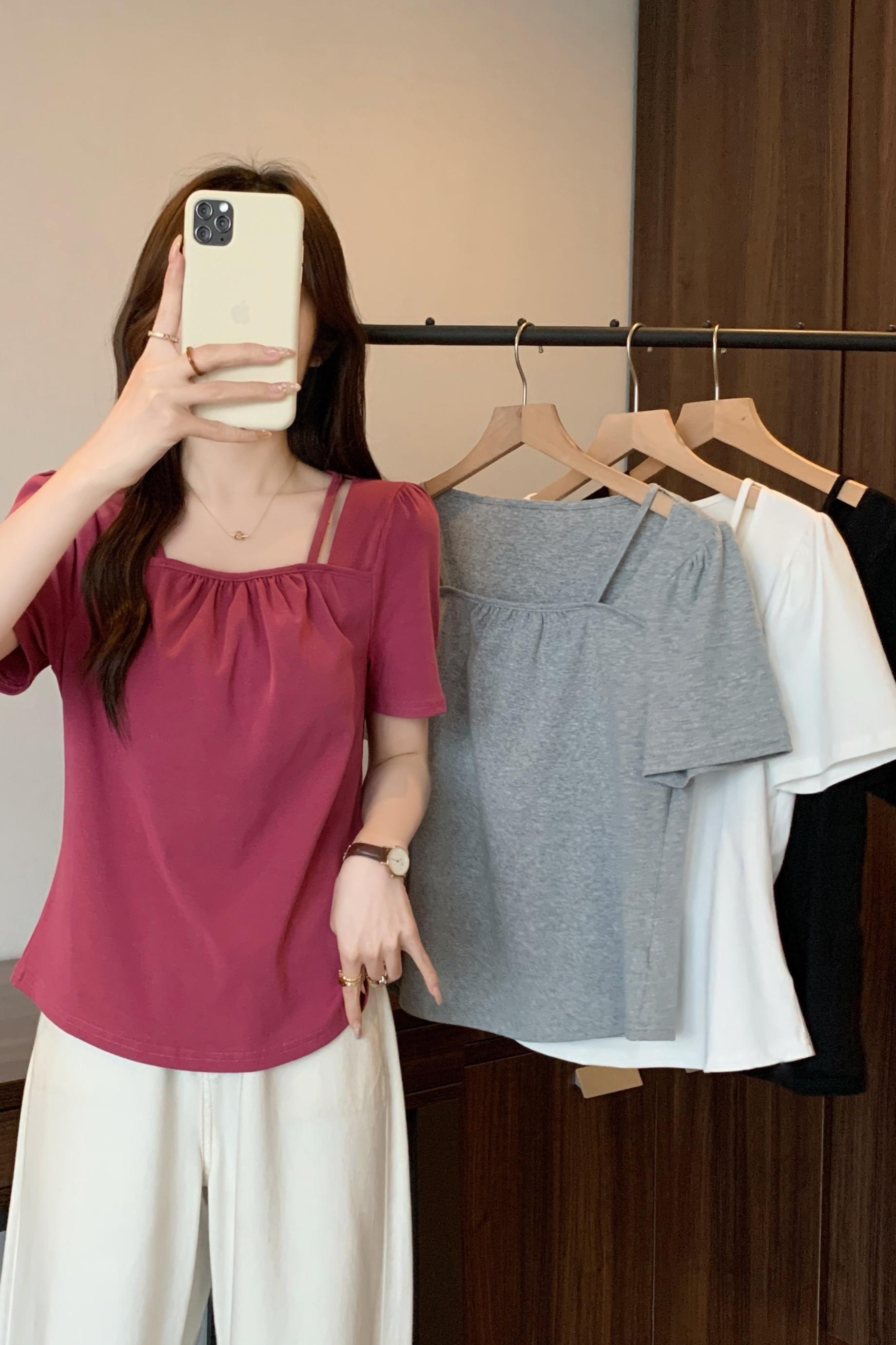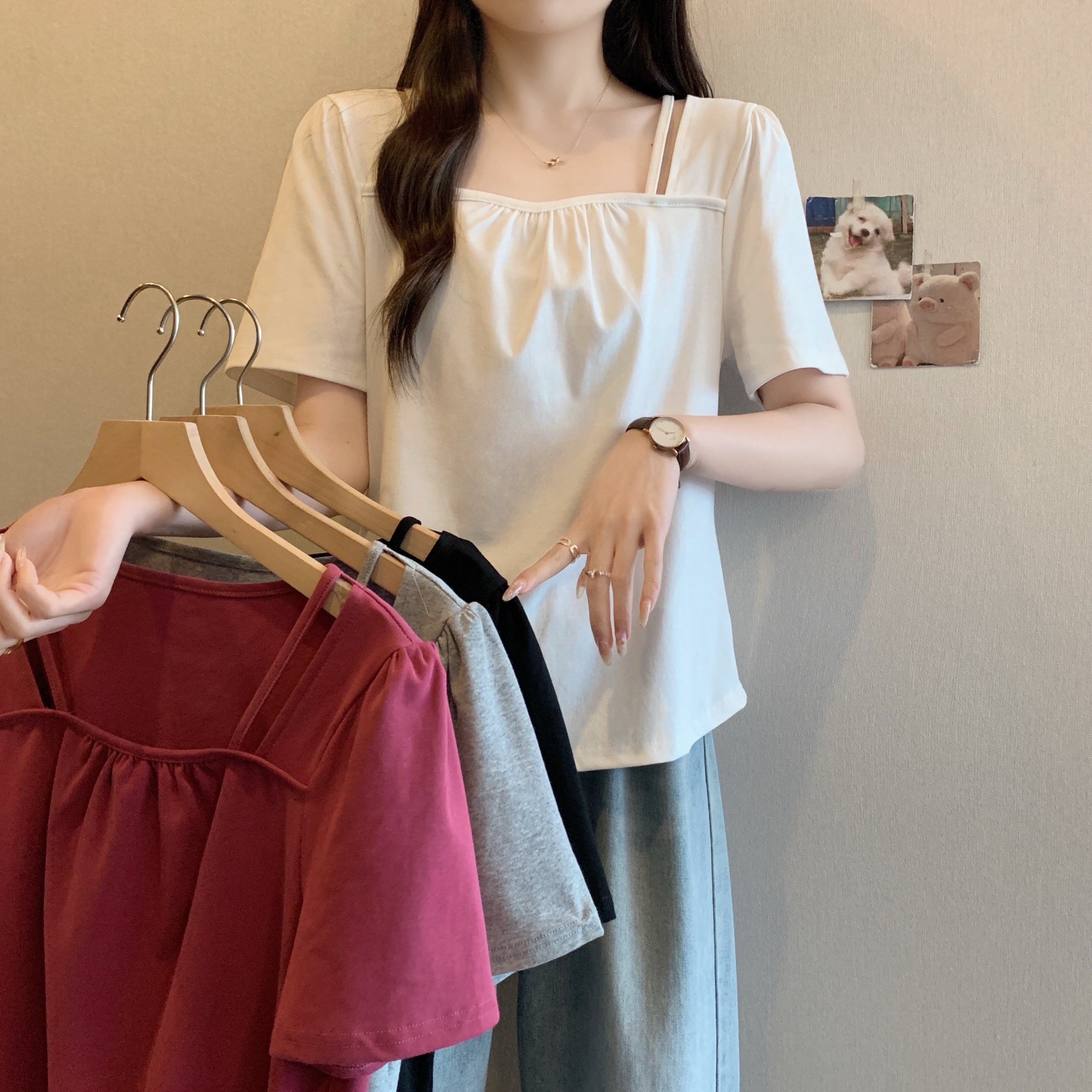 RY462# 实拍2026夏装新款胖mm大码女方领褶皱短袖t恤设计感正肩显瘦上衣