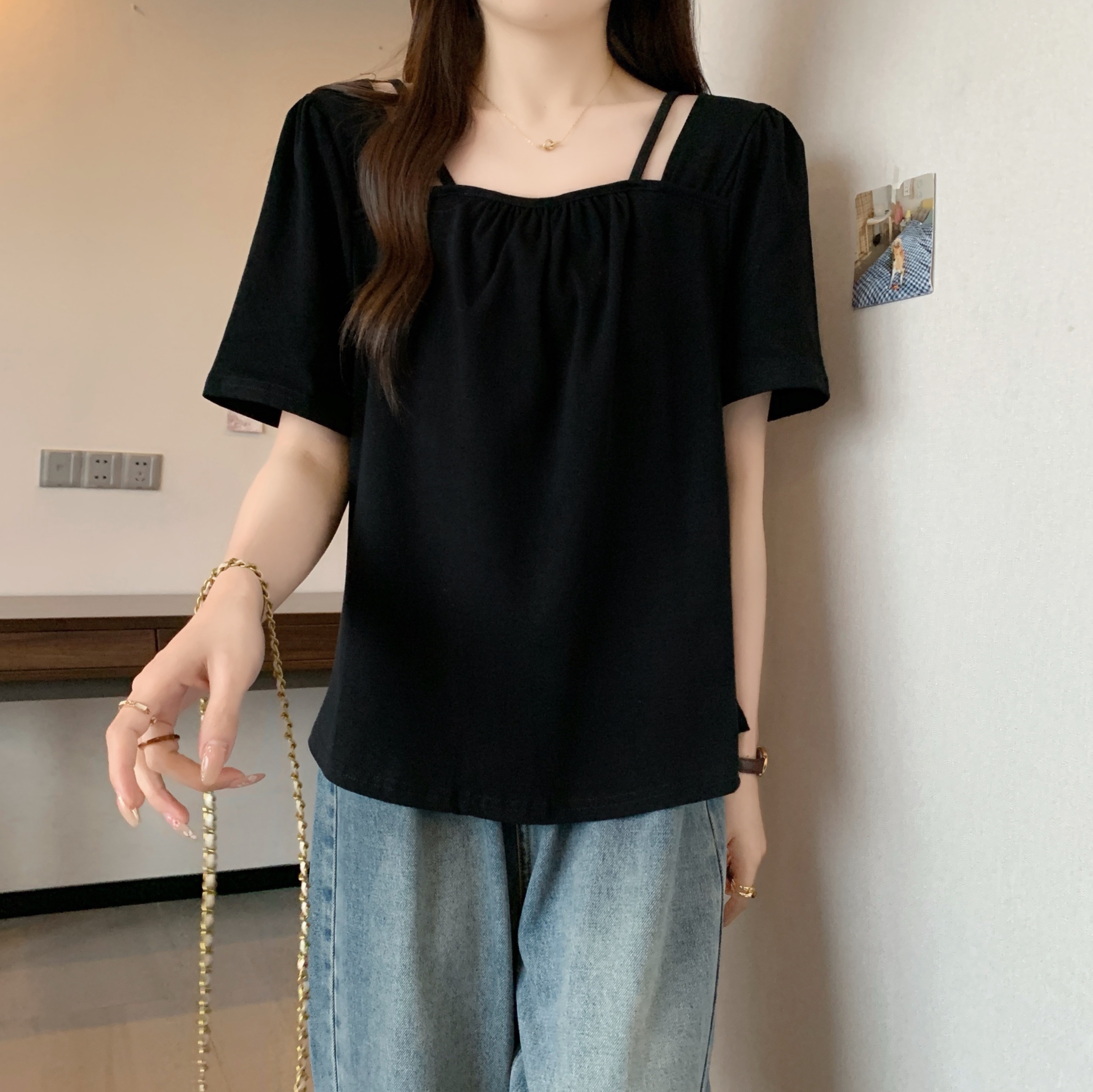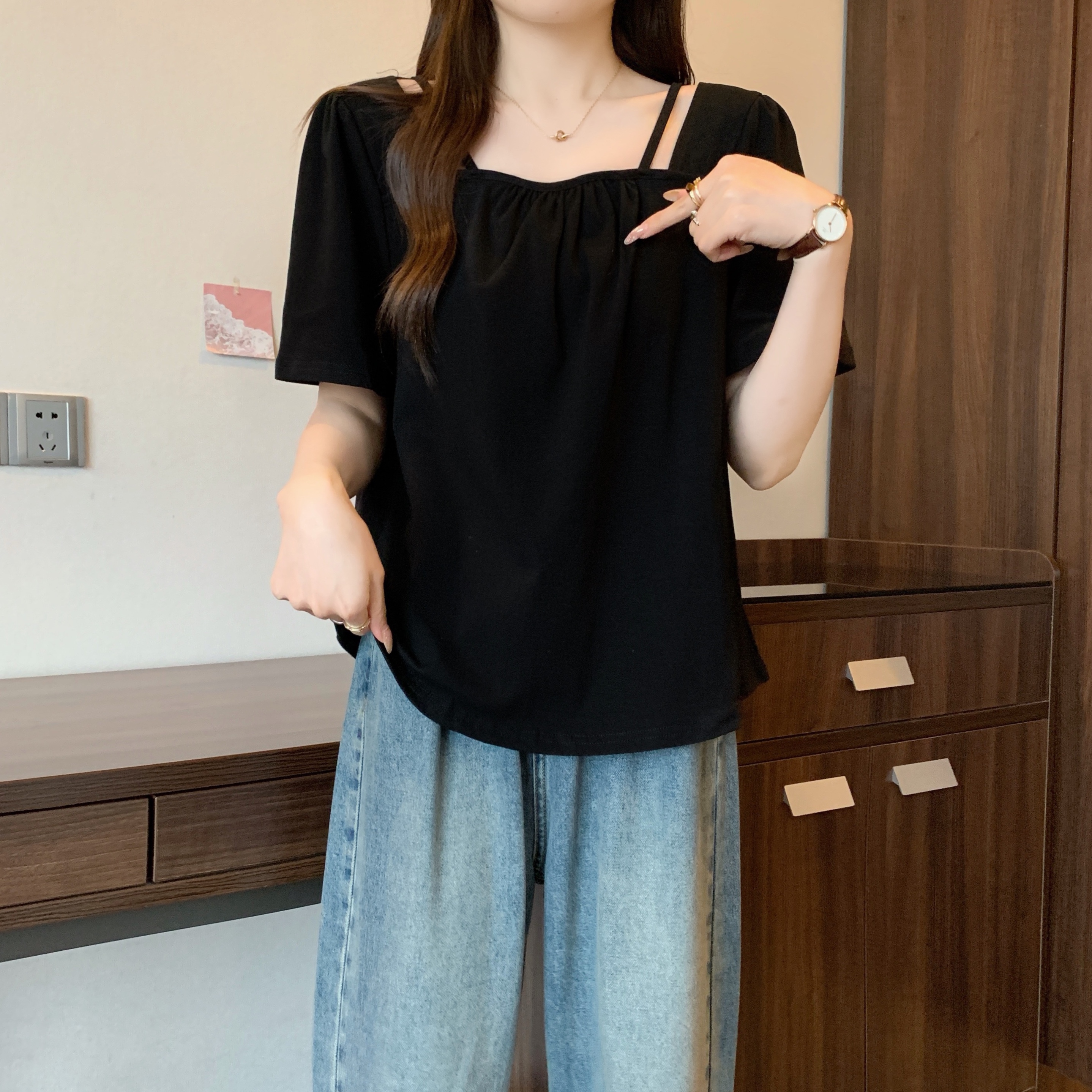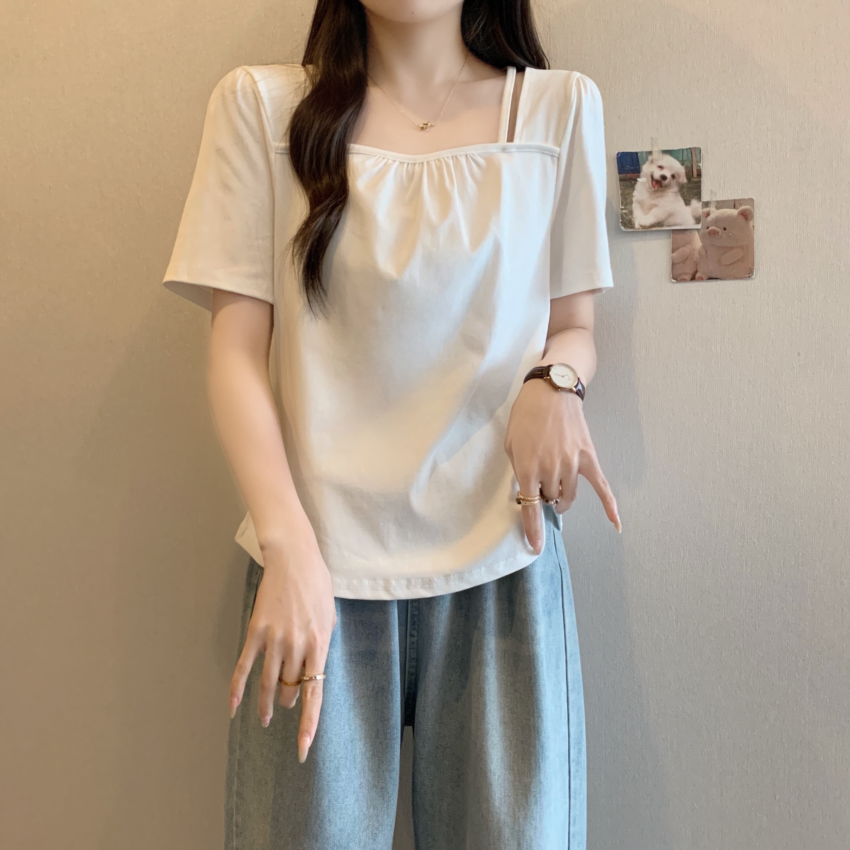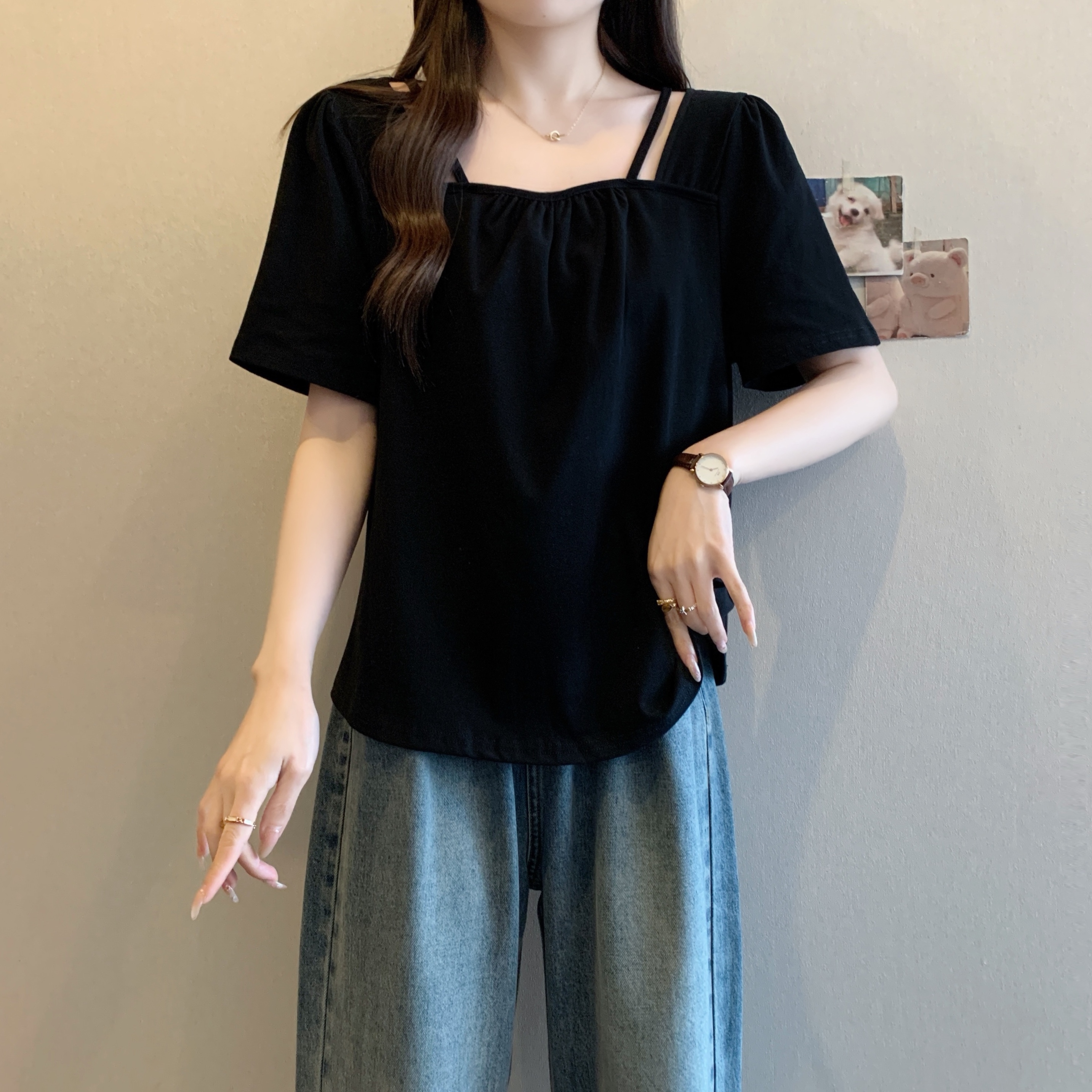 RY462# 实拍2026夏装新款胖mm大码女方领褶皱短袖t恤设计感正肩显瘦上衣