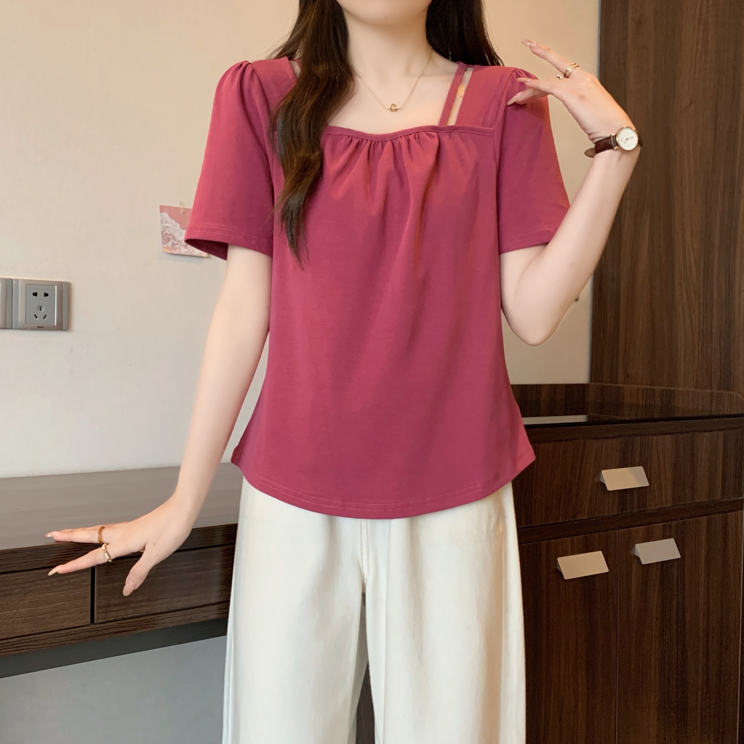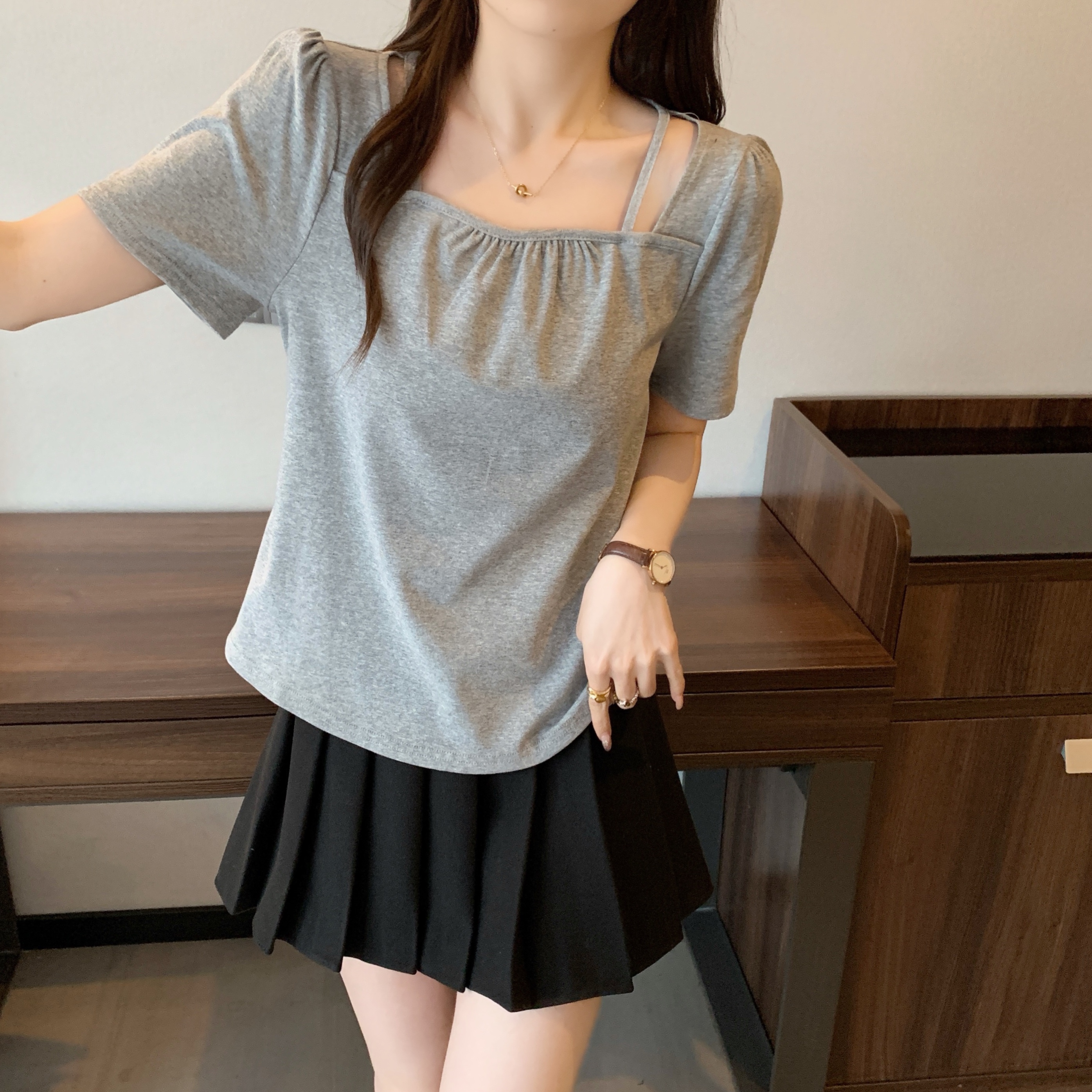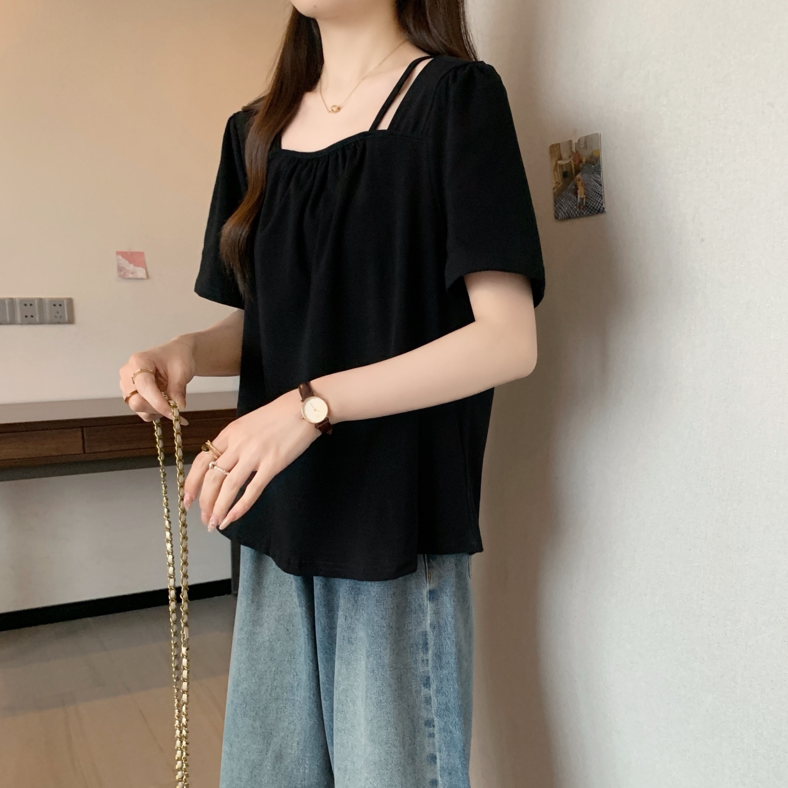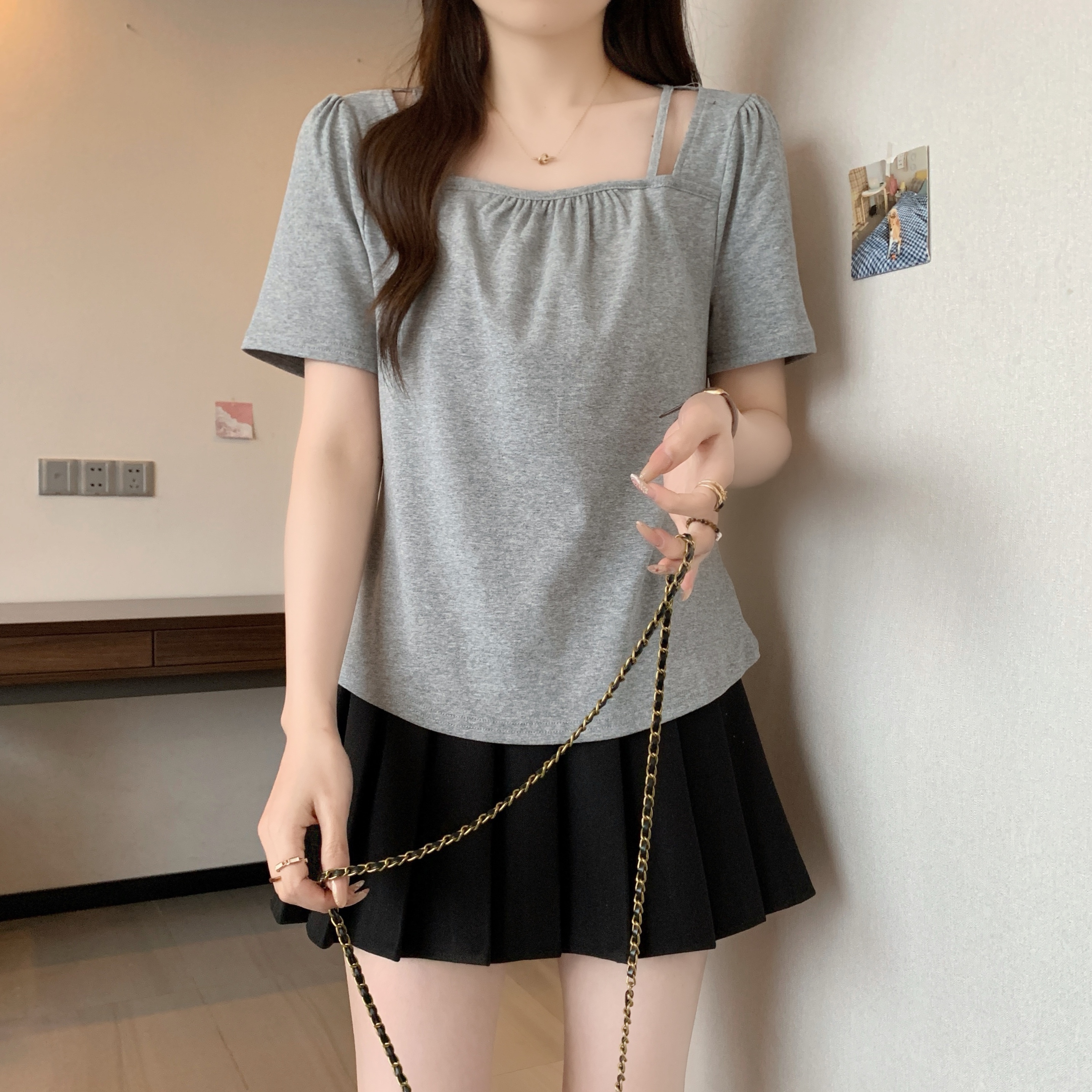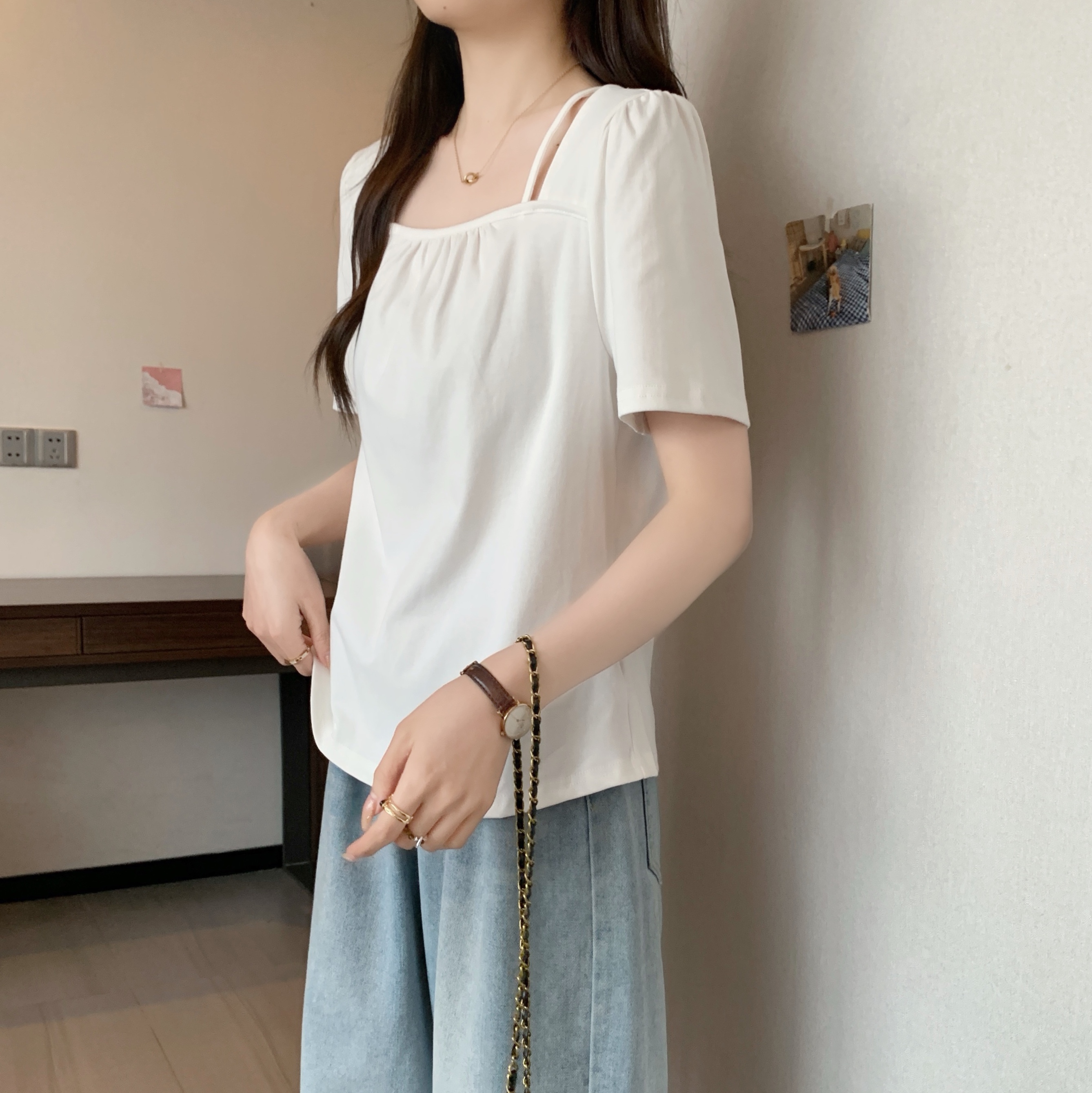 RY462# 实拍2026夏装新款胖mm大码女方领褶皱短袖t恤设计感正肩显瘦上衣