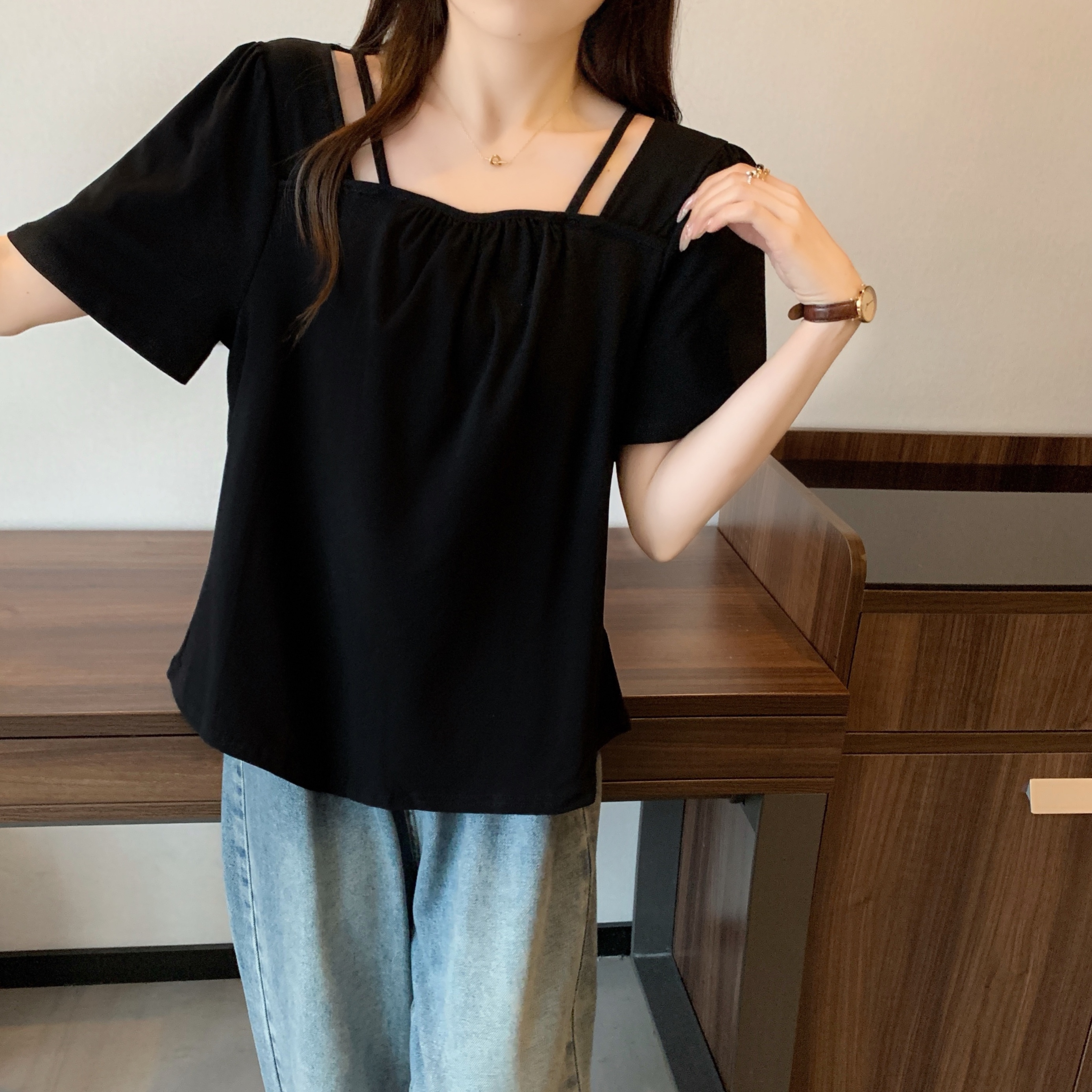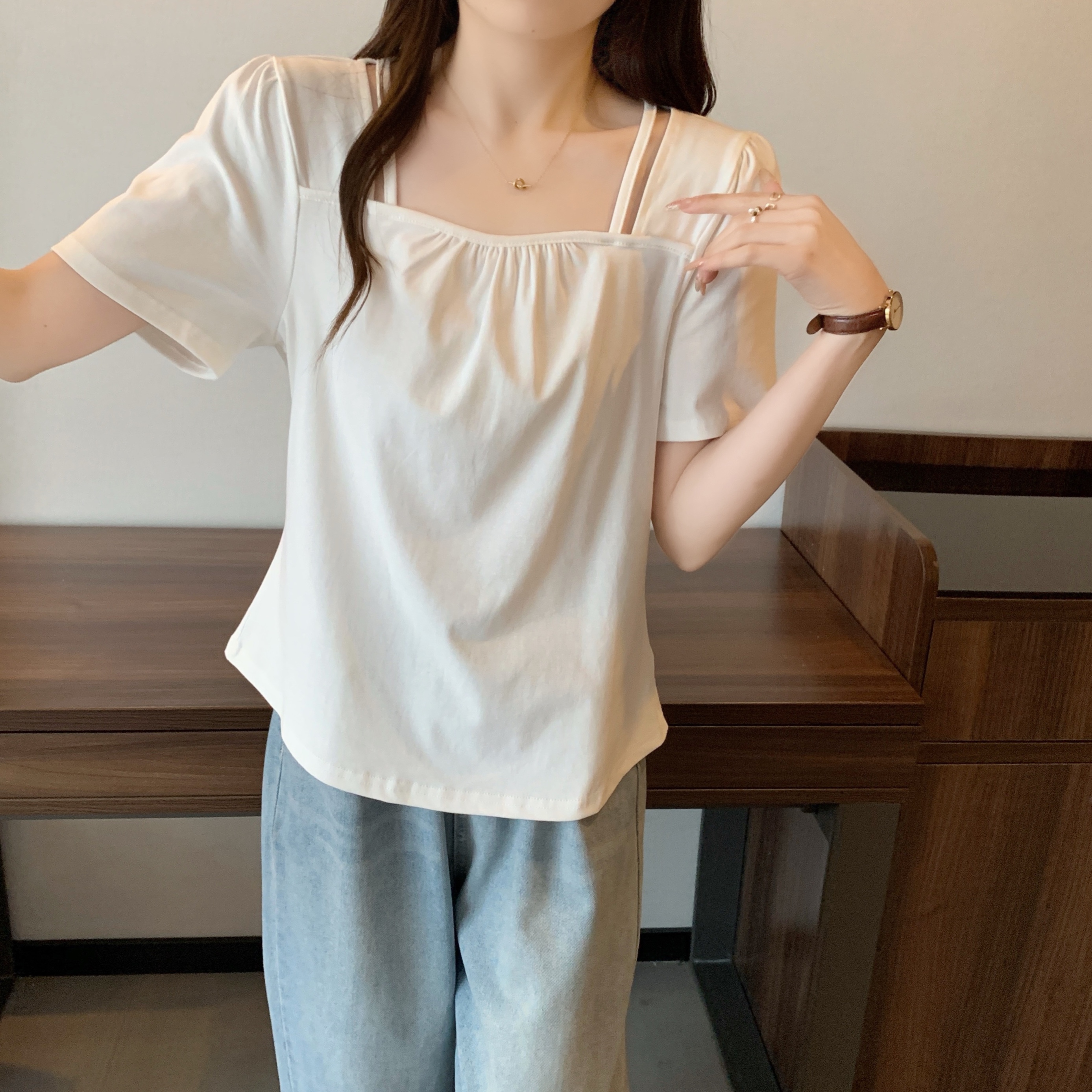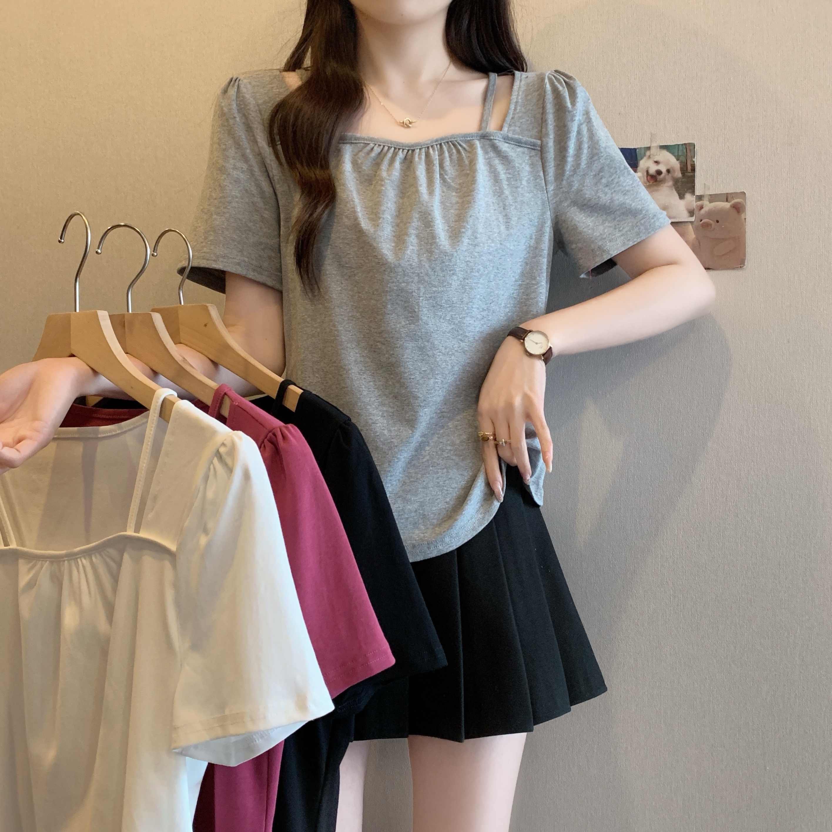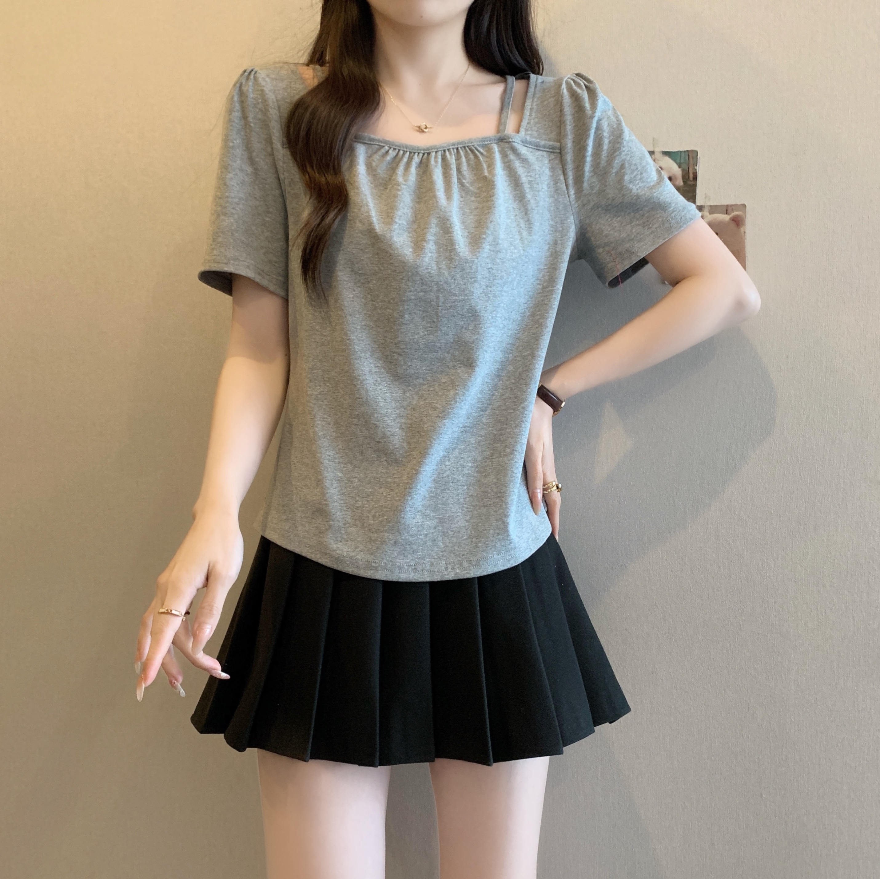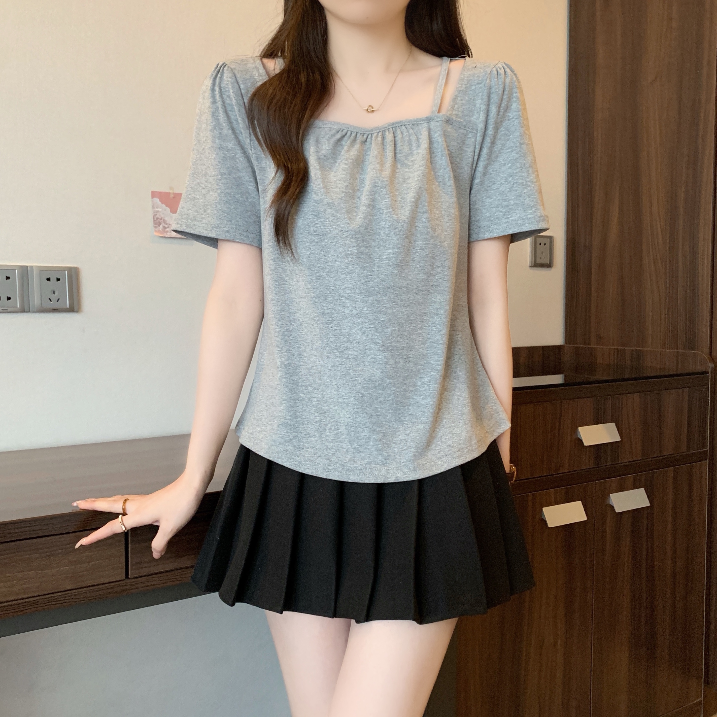 RY462# 实拍2026夏装新款胖mm大码女方领褶皱短袖t恤设计感正肩显瘦上衣