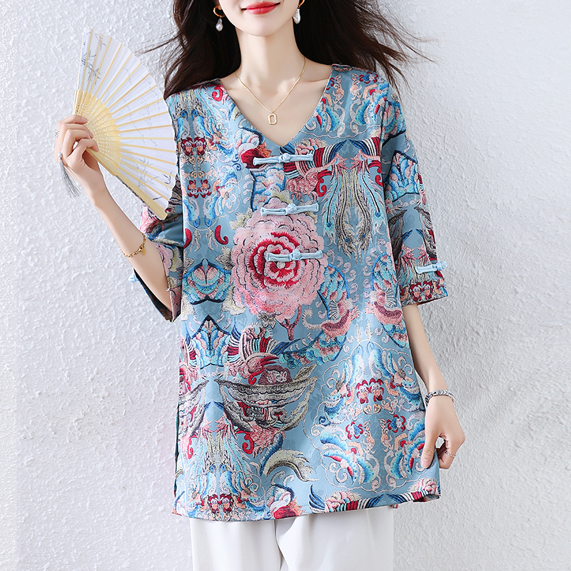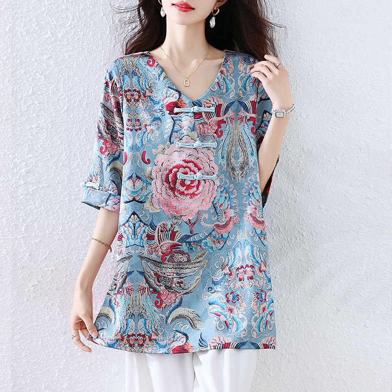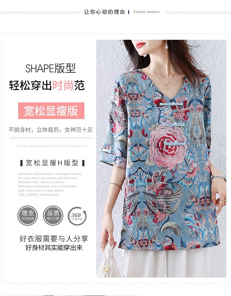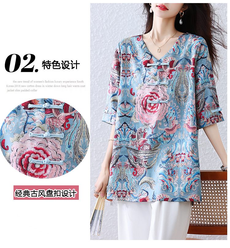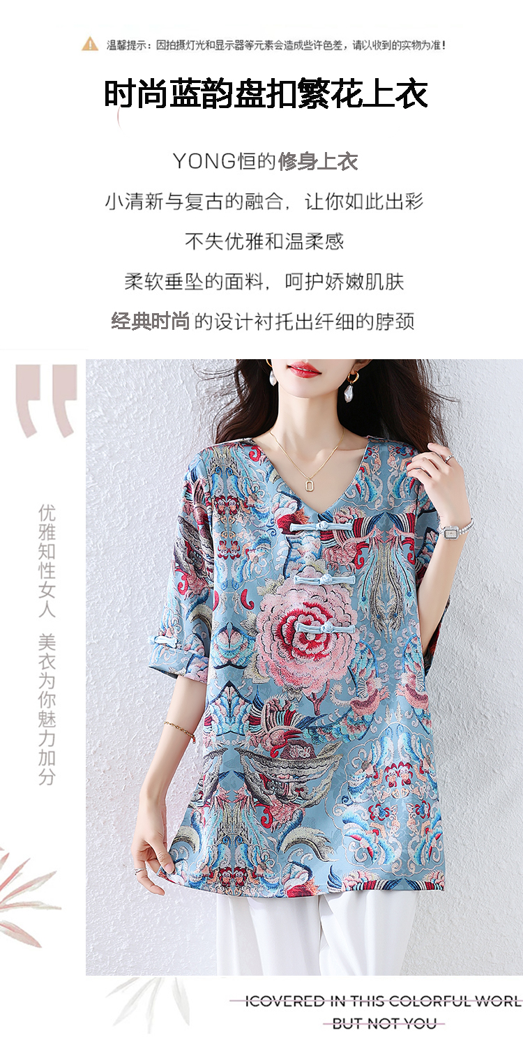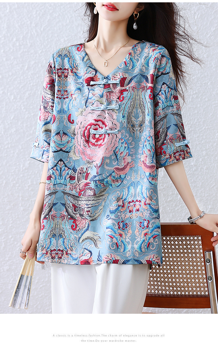 RY464# 实拍大码2026夏季气质百搭新中式盘扣提花复古遮肉短袖衬衫T恤女