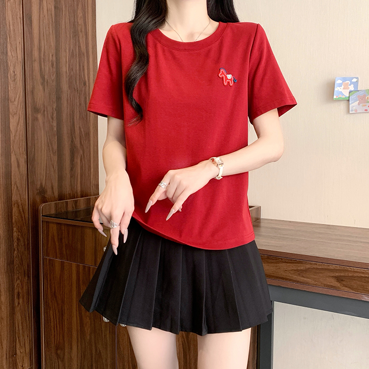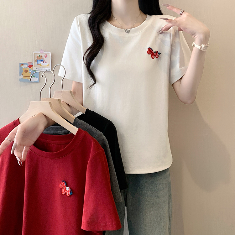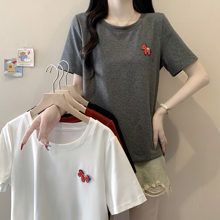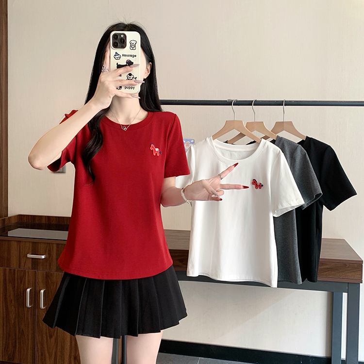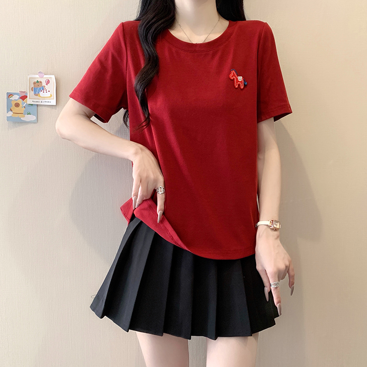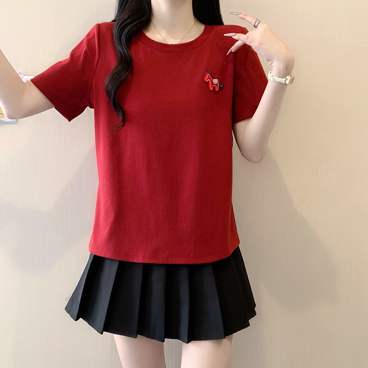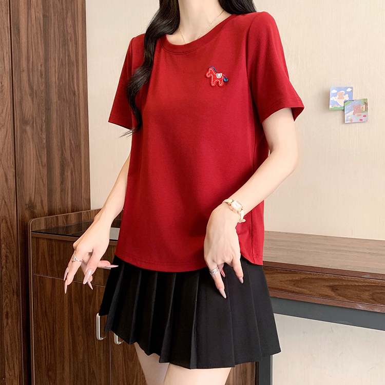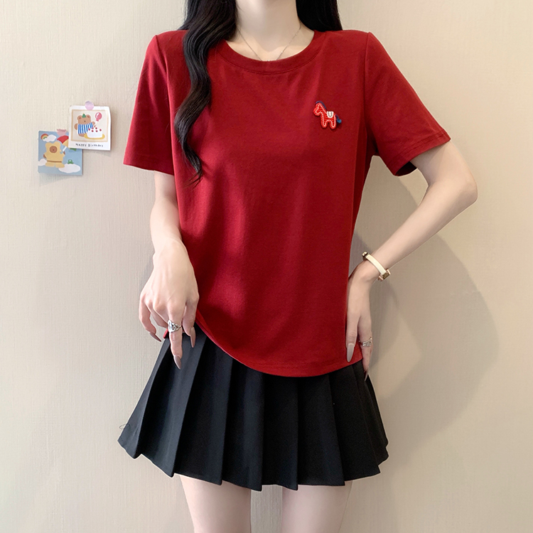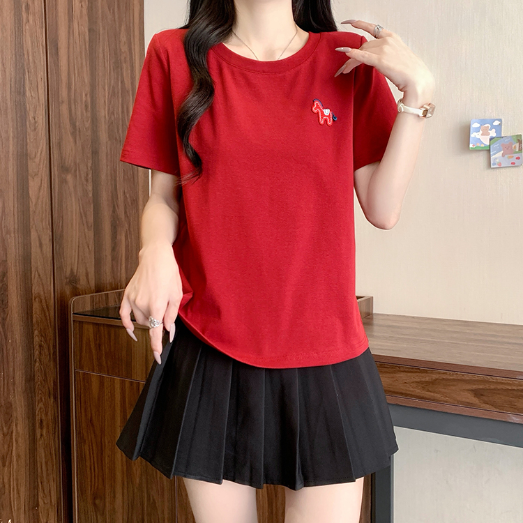 RY469# 实拍2026夏装新款胖mm大码女休闲百搭贴标红色小马设计感短袖T恤