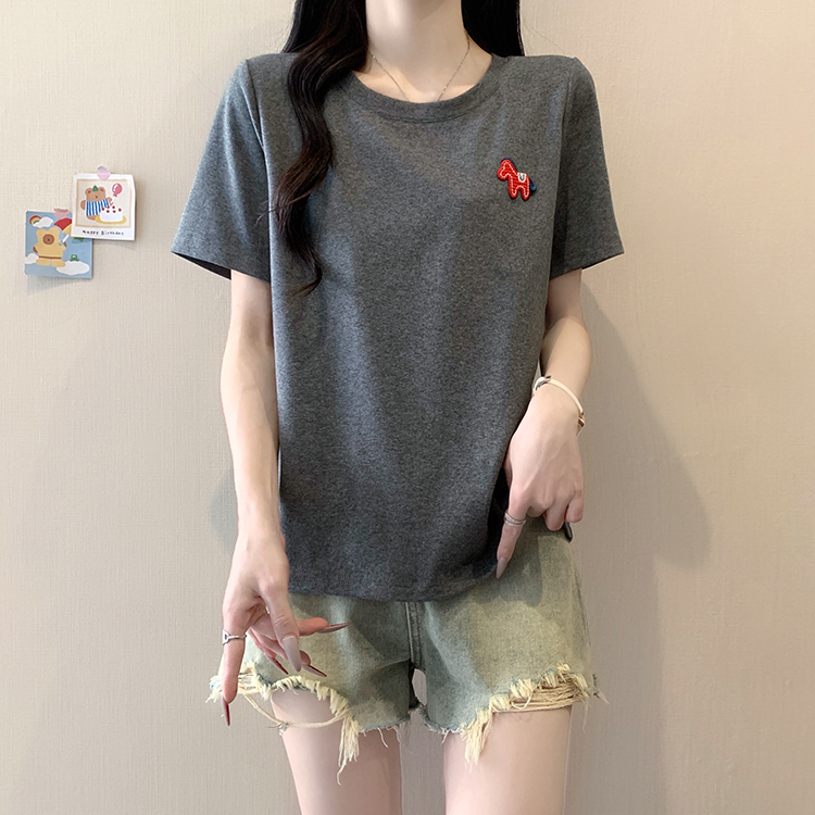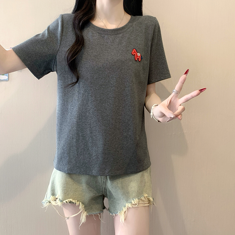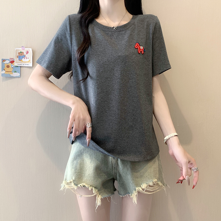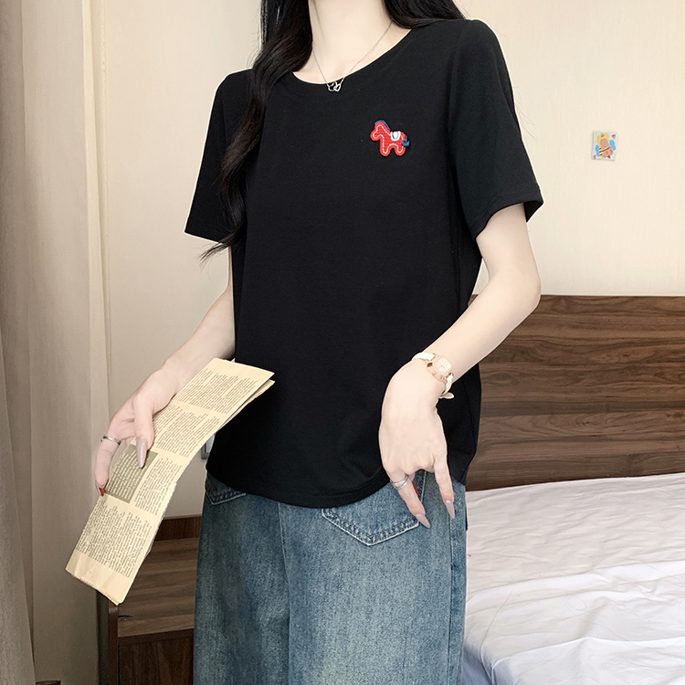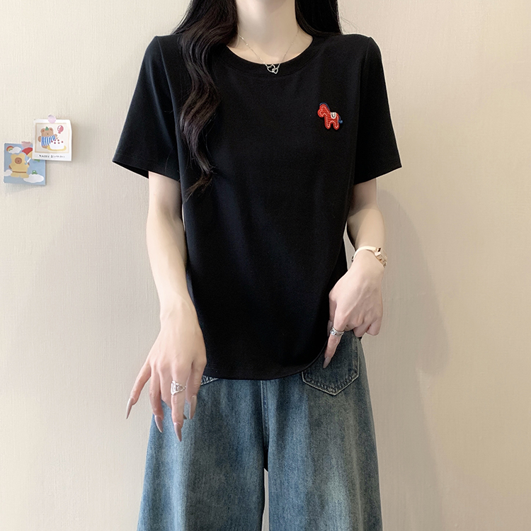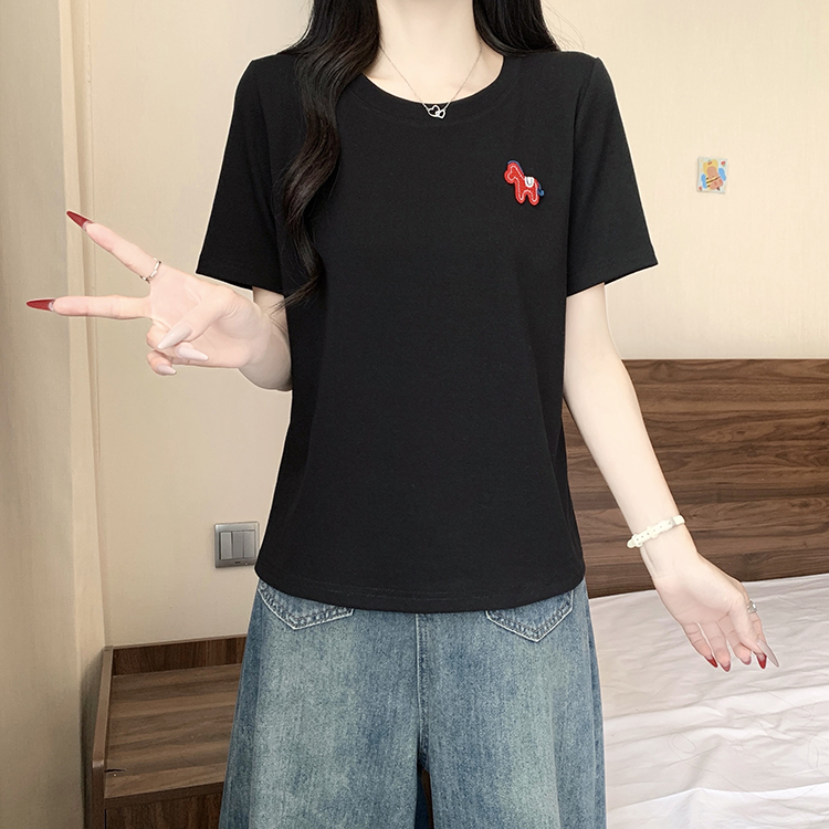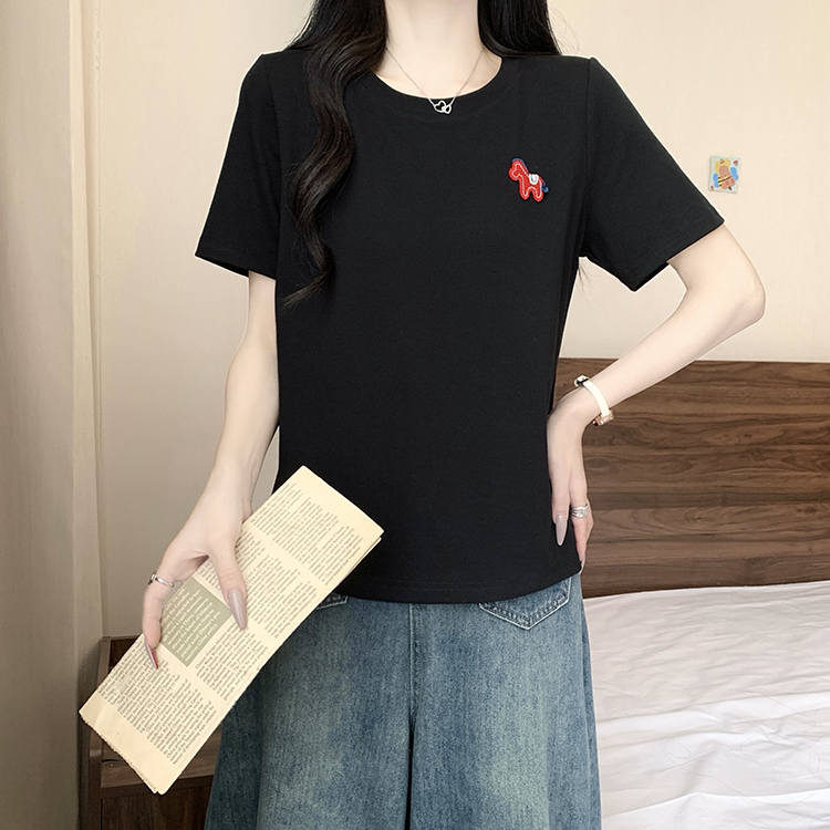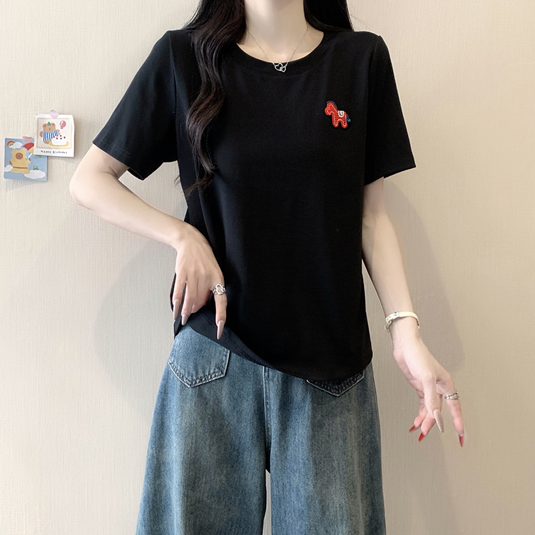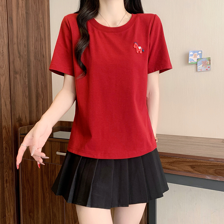 RY469# 实拍2026夏装新款胖mm大码女休闲百搭贴标红色小马设计感短袖T恤