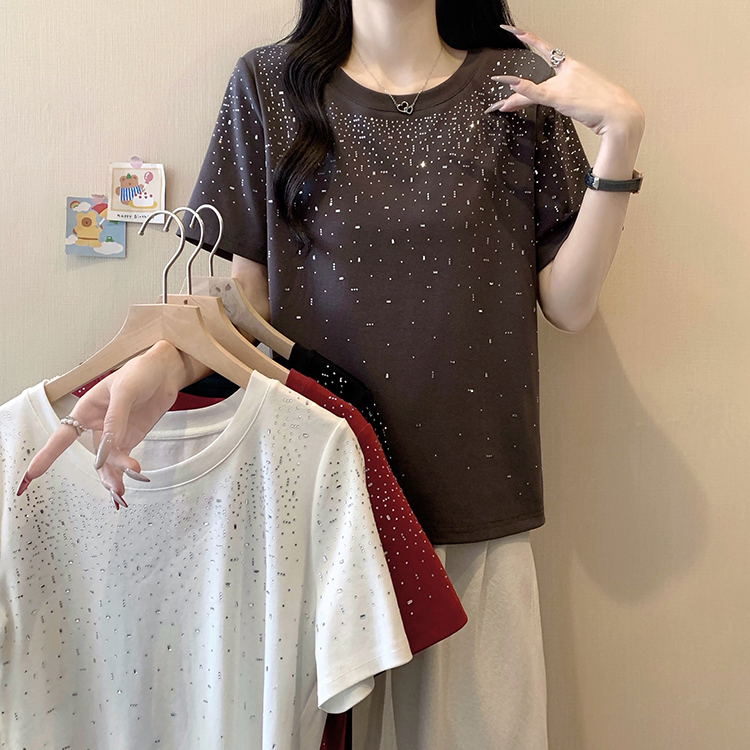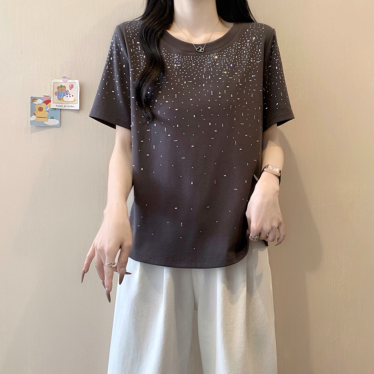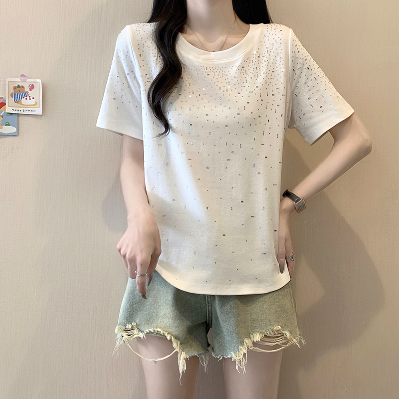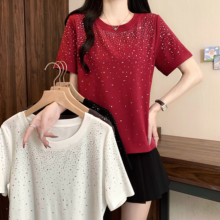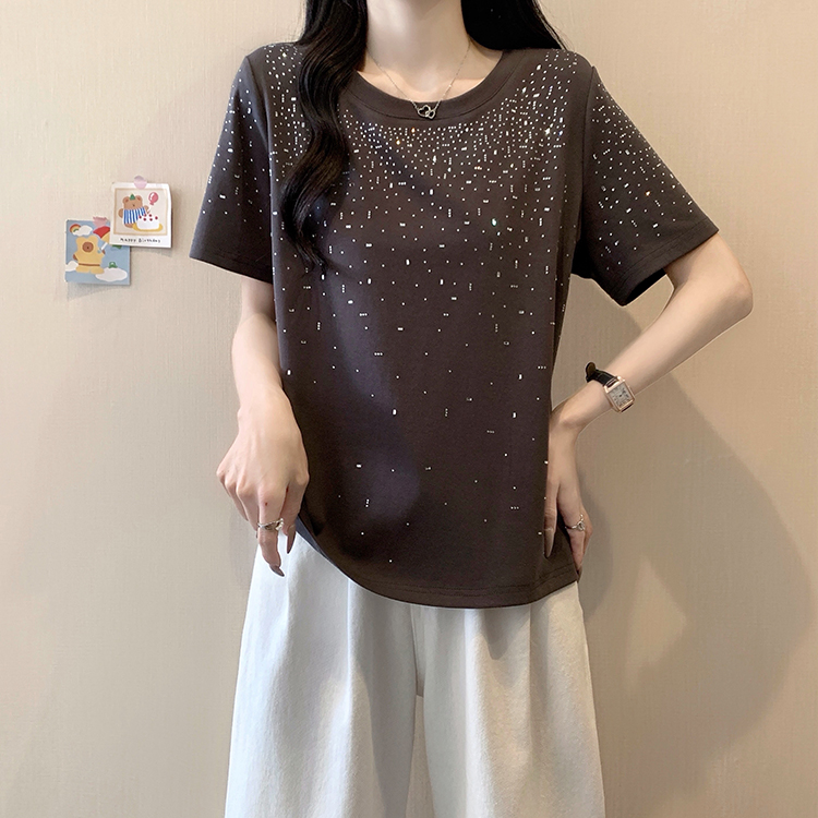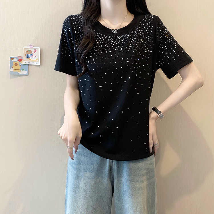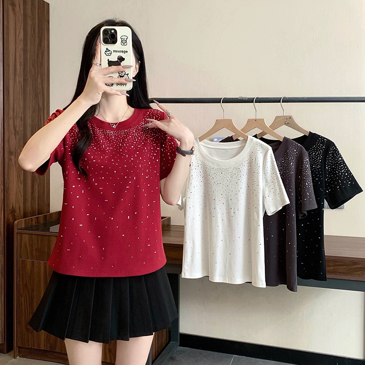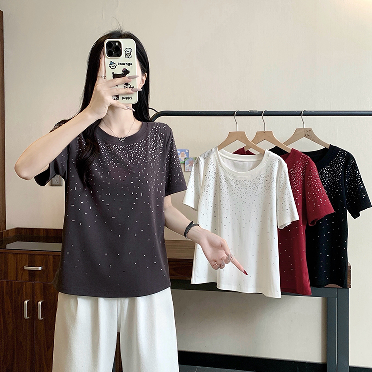 RY472# 实拍2026夏装新款胖mm大码女别致重工烫钻亮闪闪圆领正肩短袖T恤