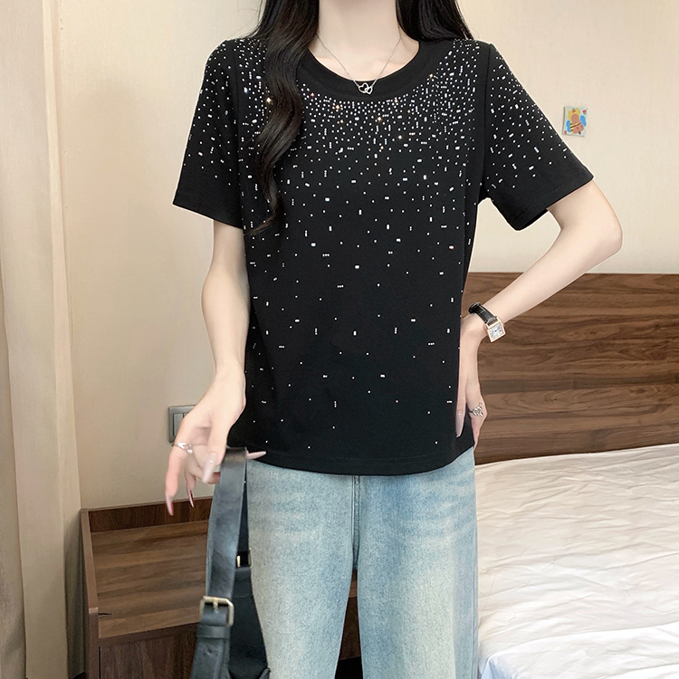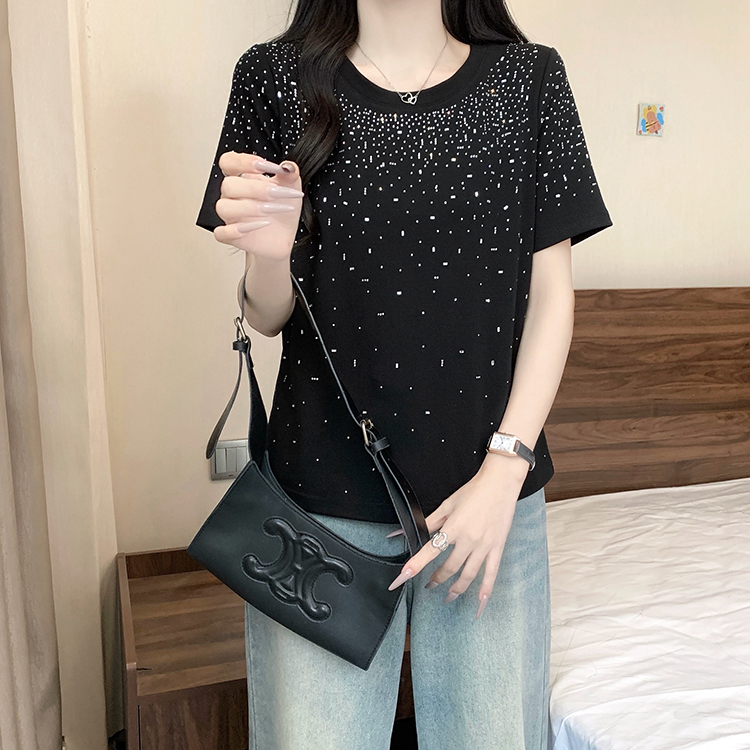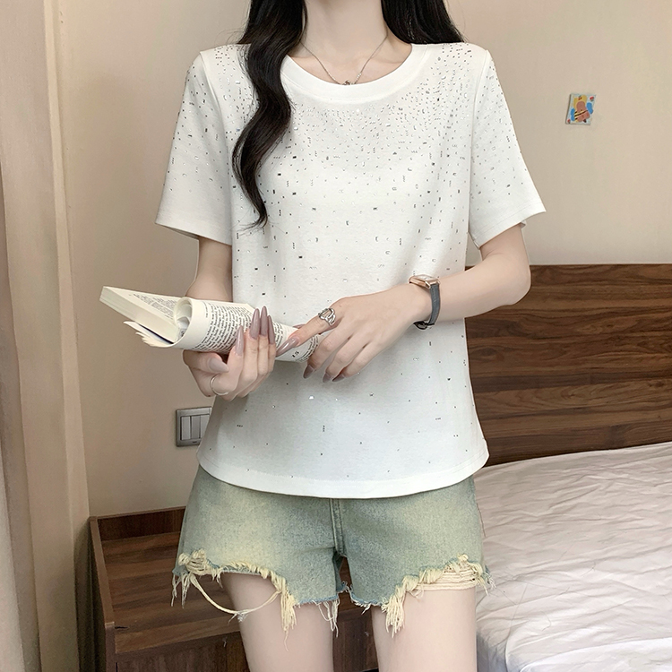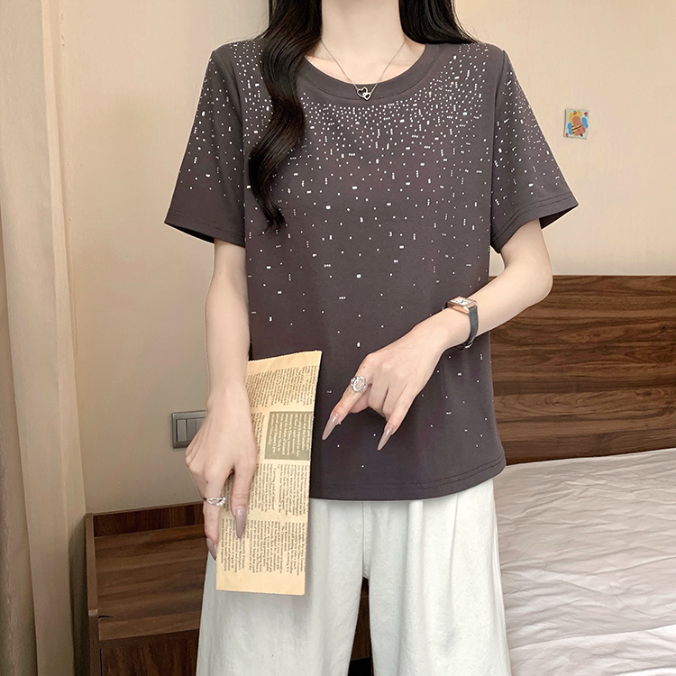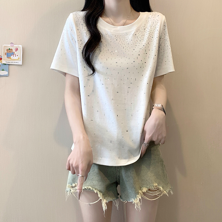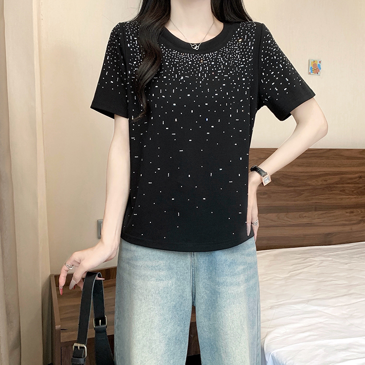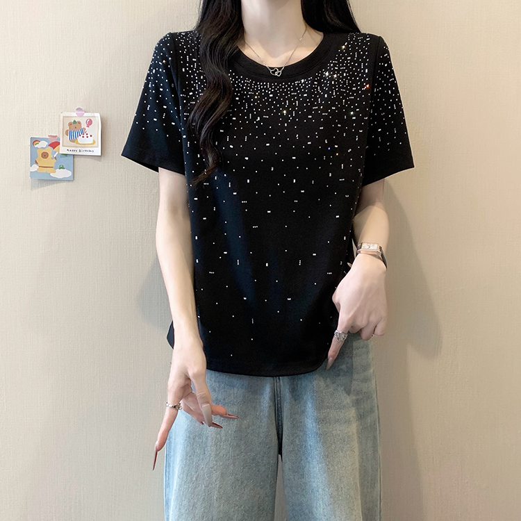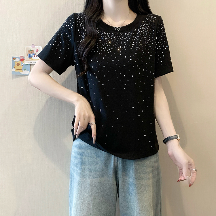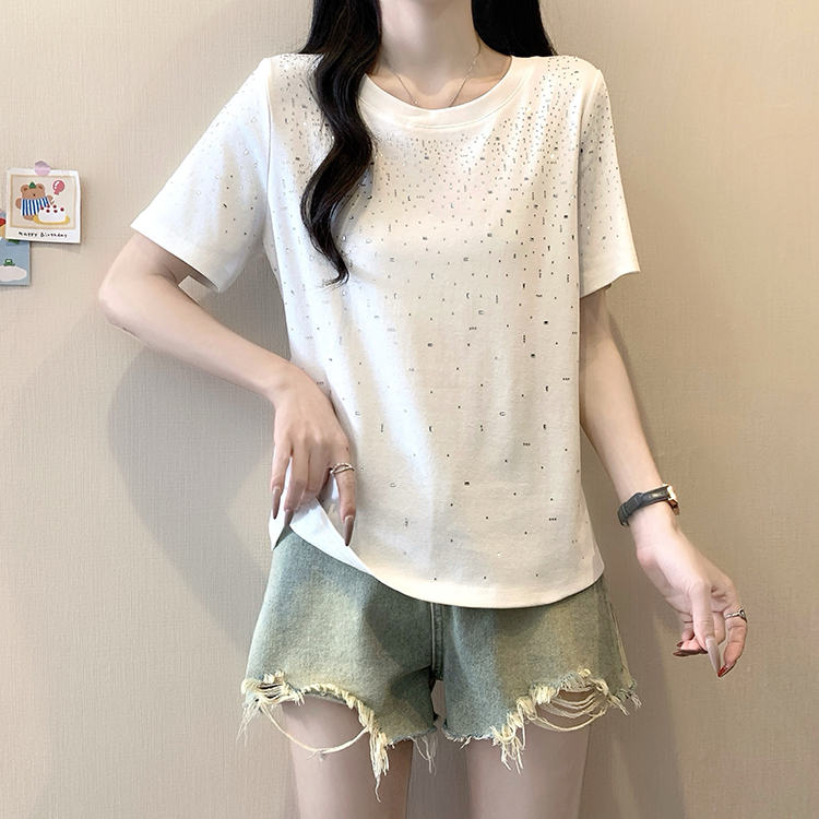 RY472# 实拍2026夏装新款胖mm大码女别致重工烫钻亮闪闪圆领正肩短袖T恤