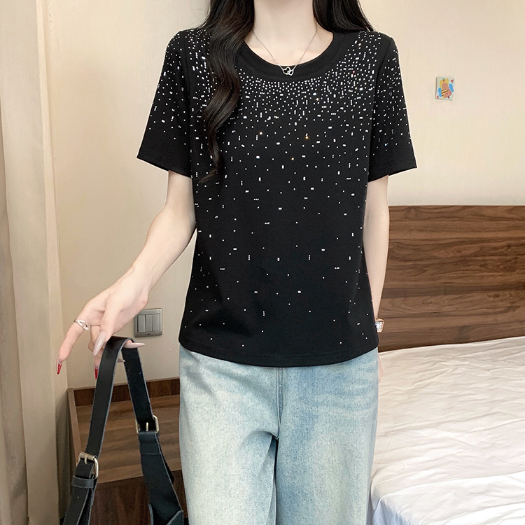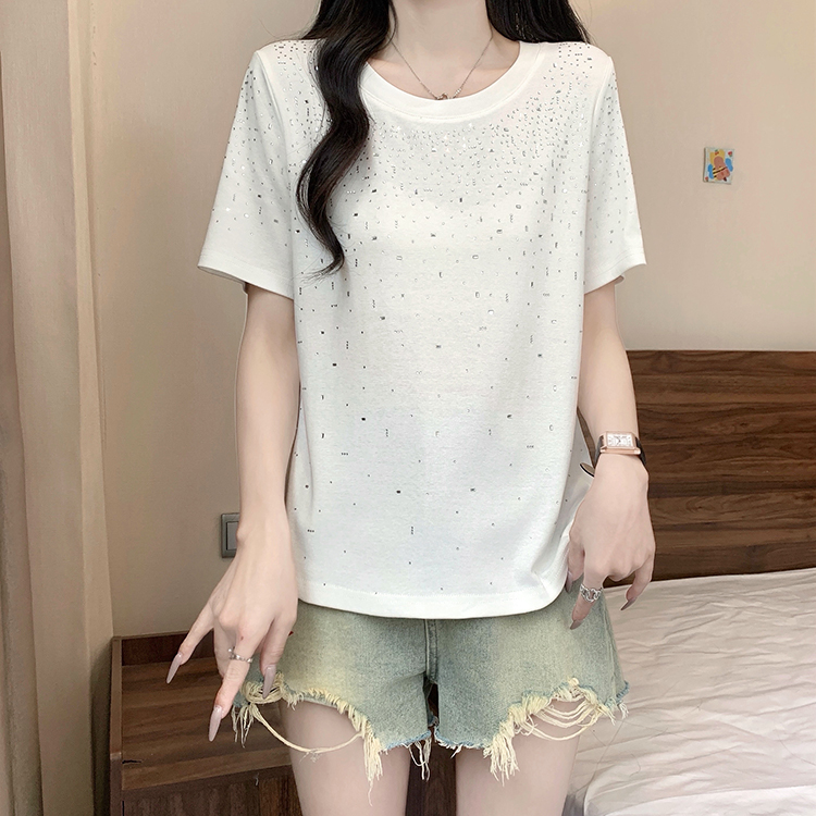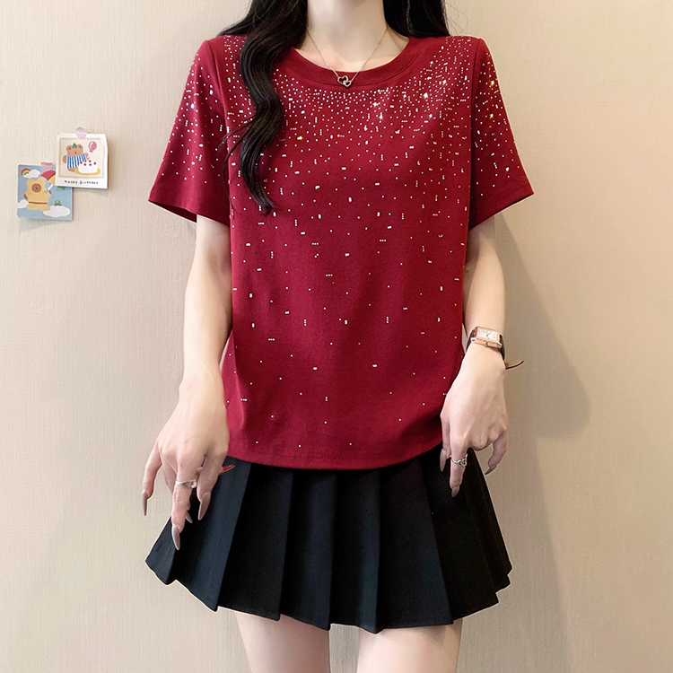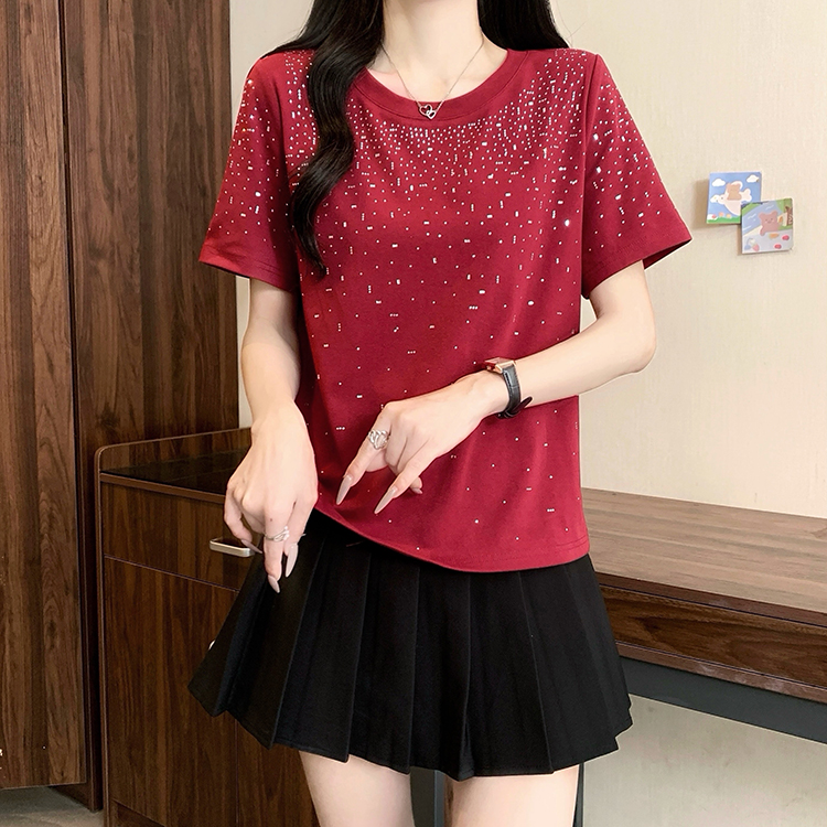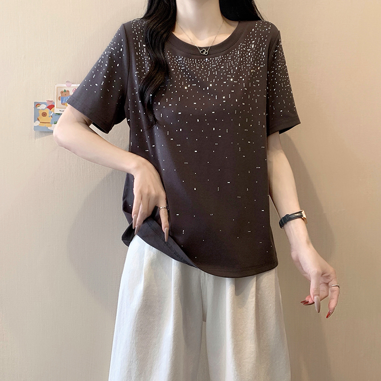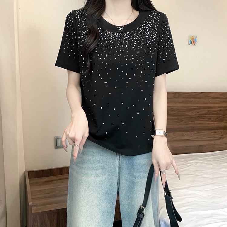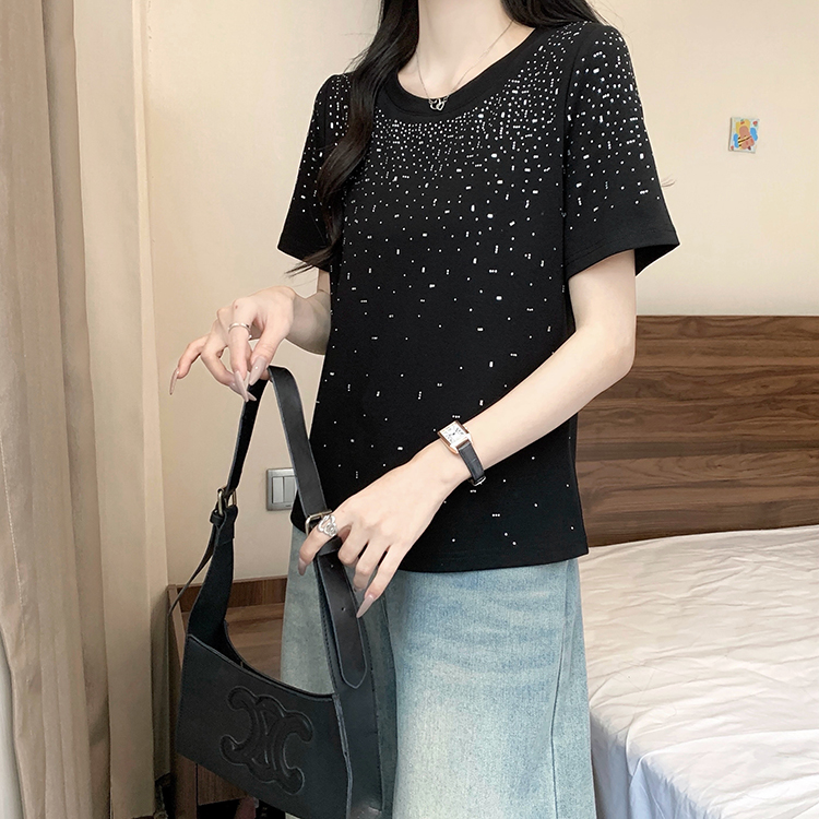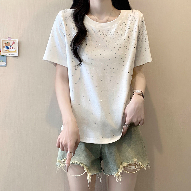 RY472# 实拍2026夏装新款胖mm大码女别致重工烫钻亮闪闪圆领正肩短袖T恤