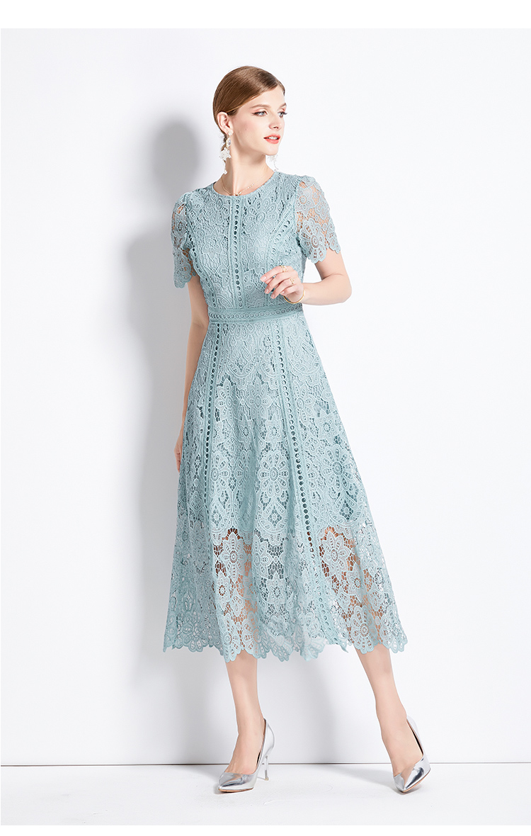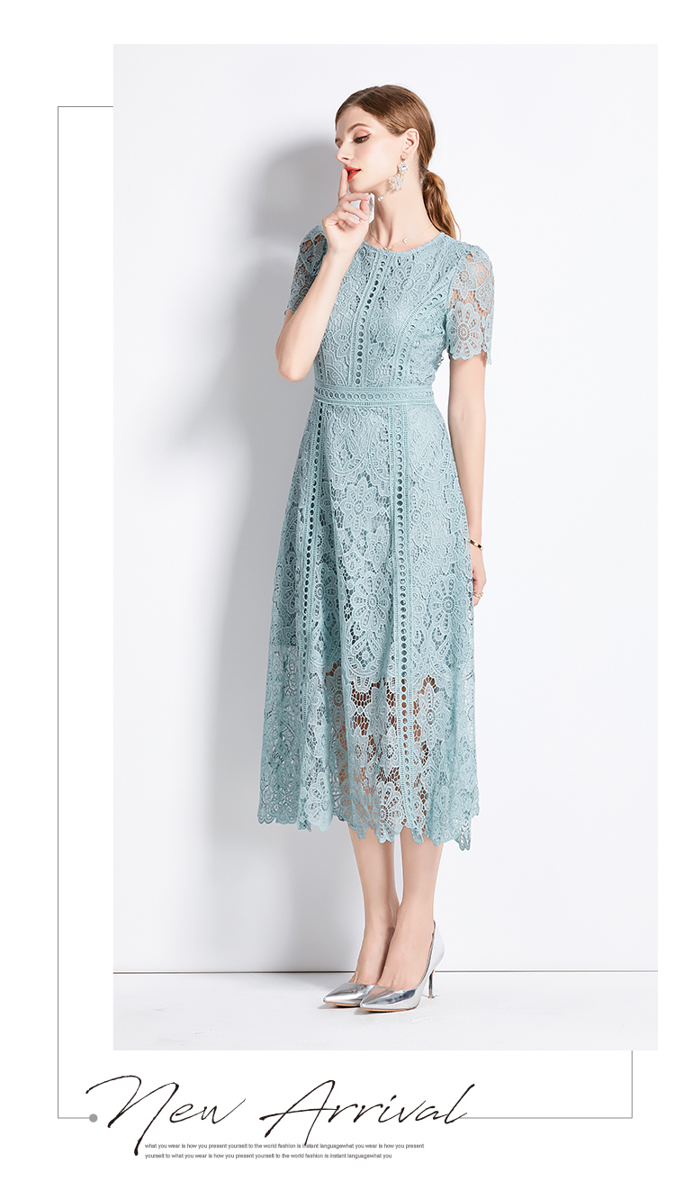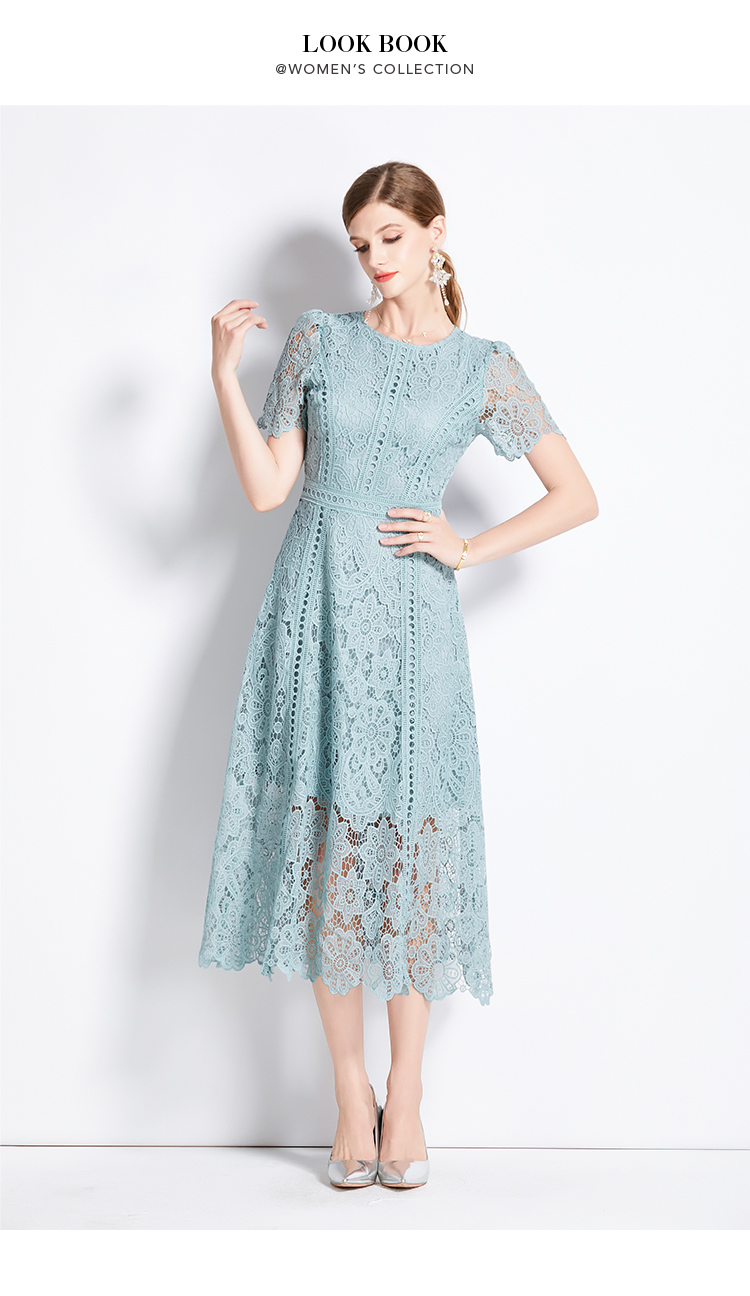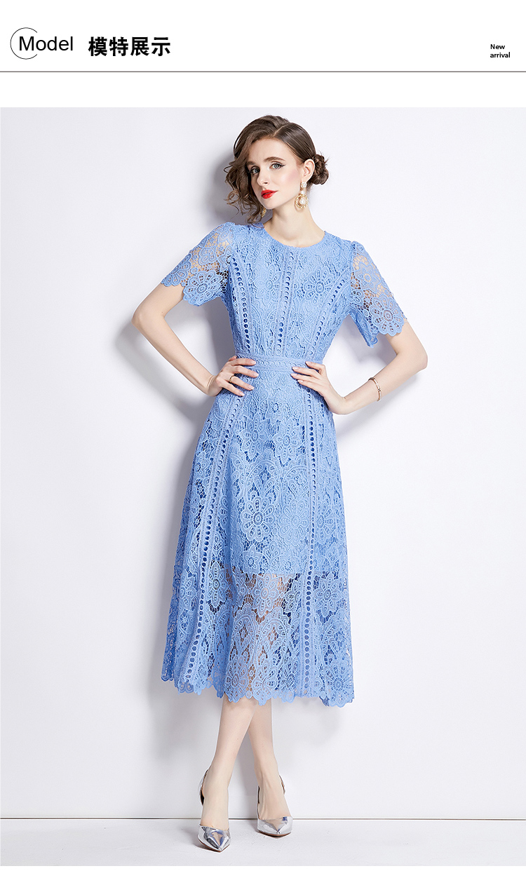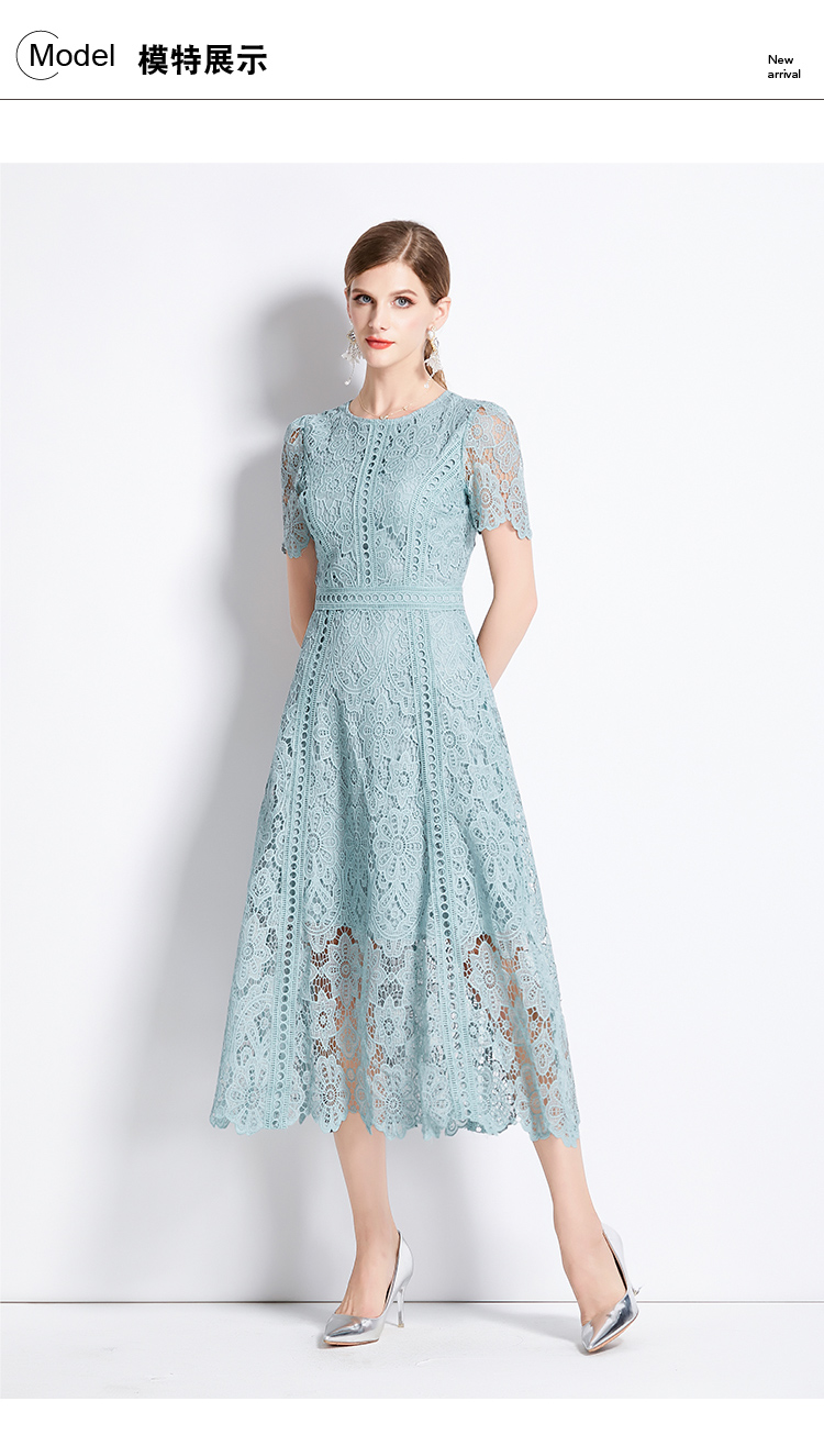 RY531# 小众复古高级感圆领荷叶袖蕾丝连衣裙女夏季新款显瘦气质优雅长裙