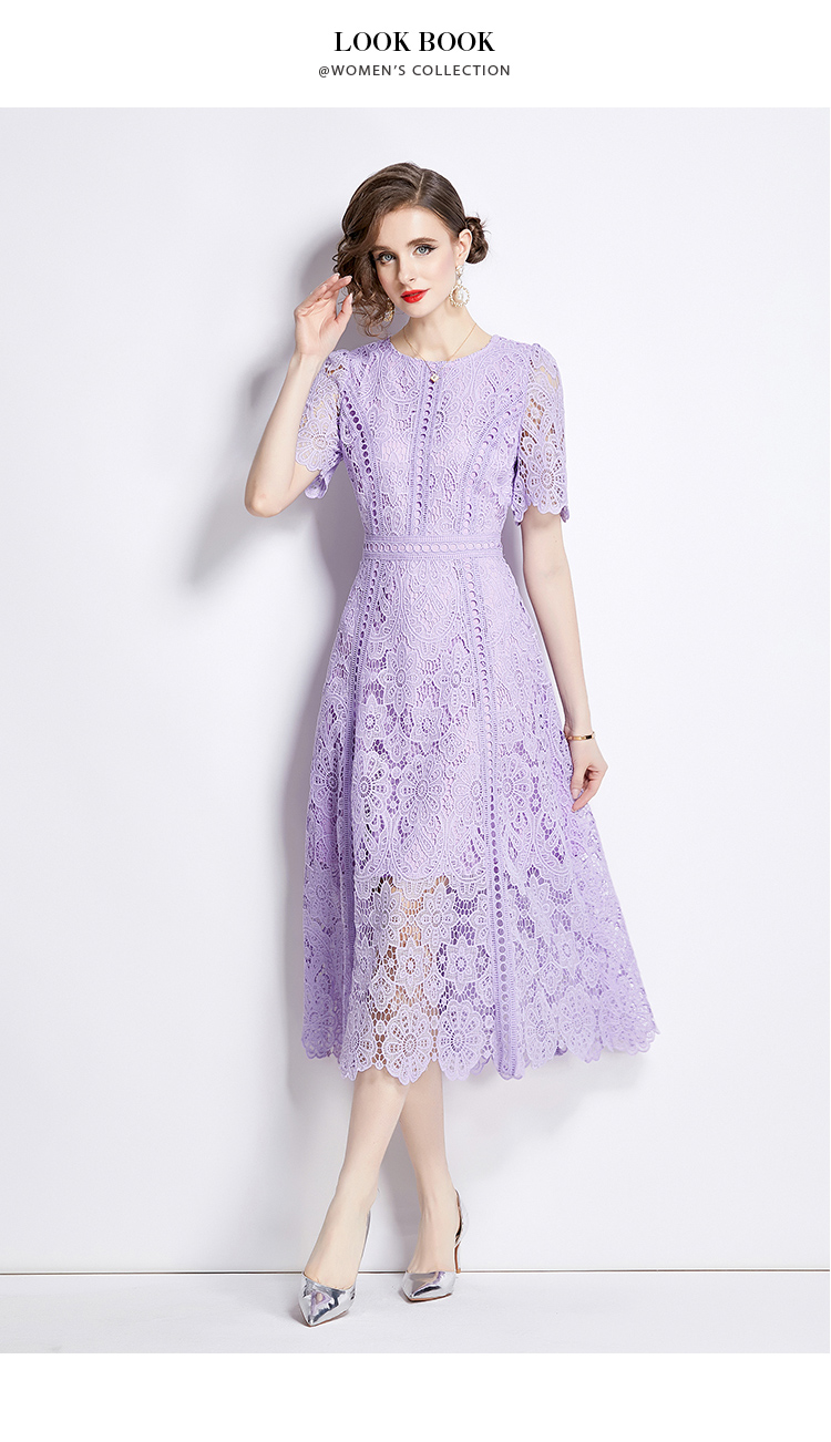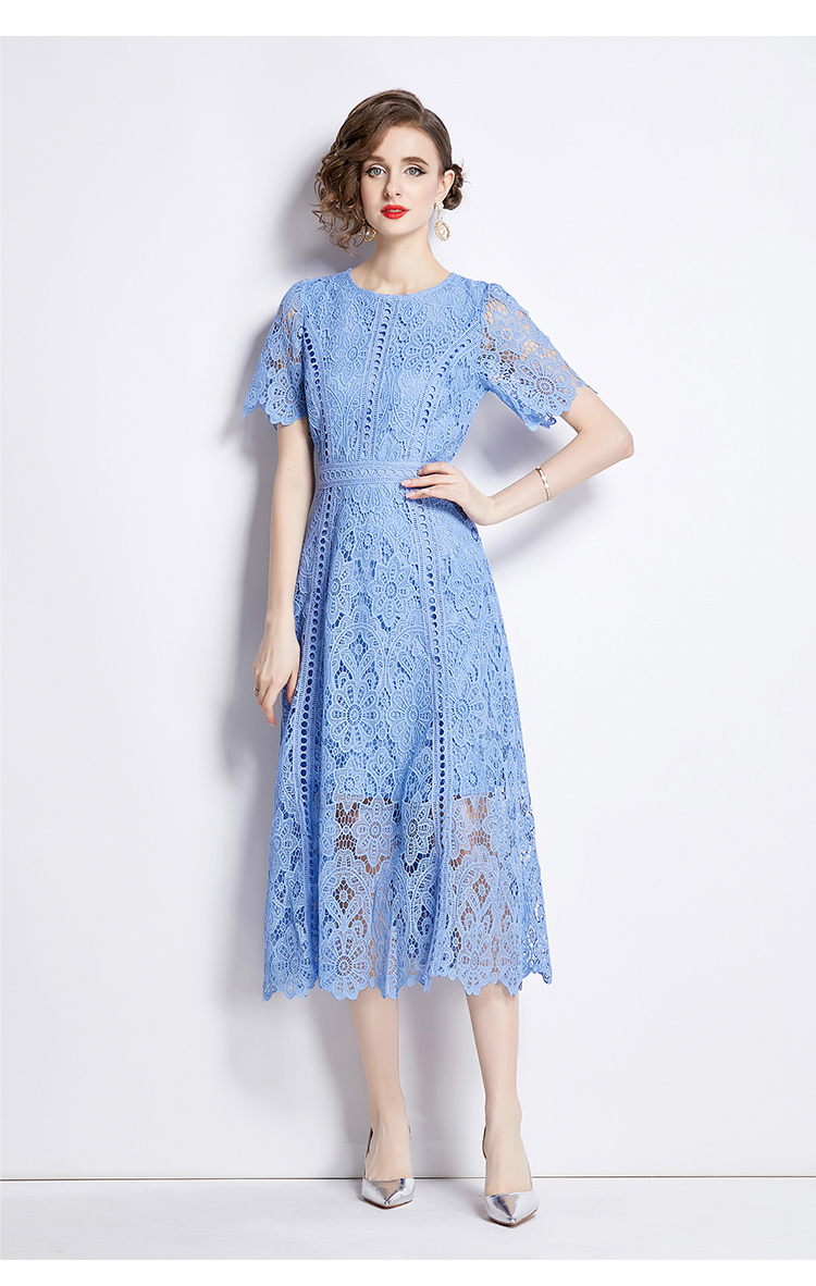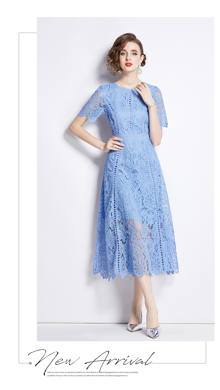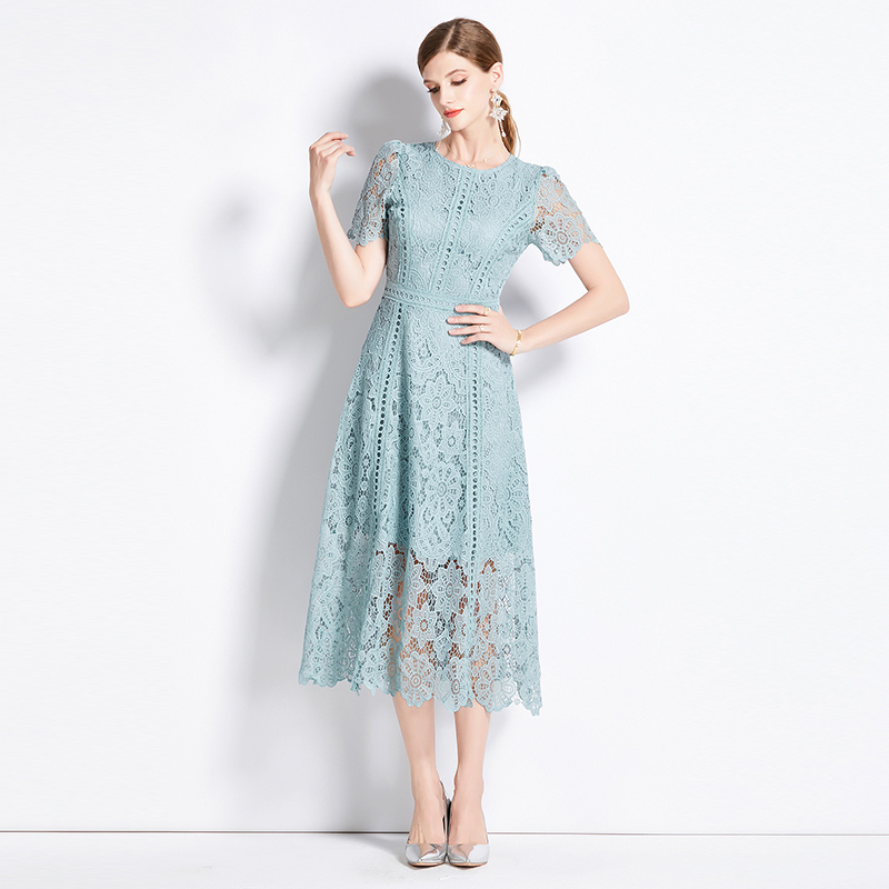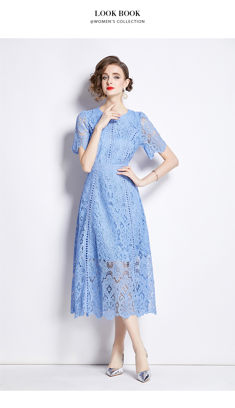 RY531# 小众复古高级感圆领荷叶袖蕾丝连衣裙女夏季新款显瘦气质优雅长裙