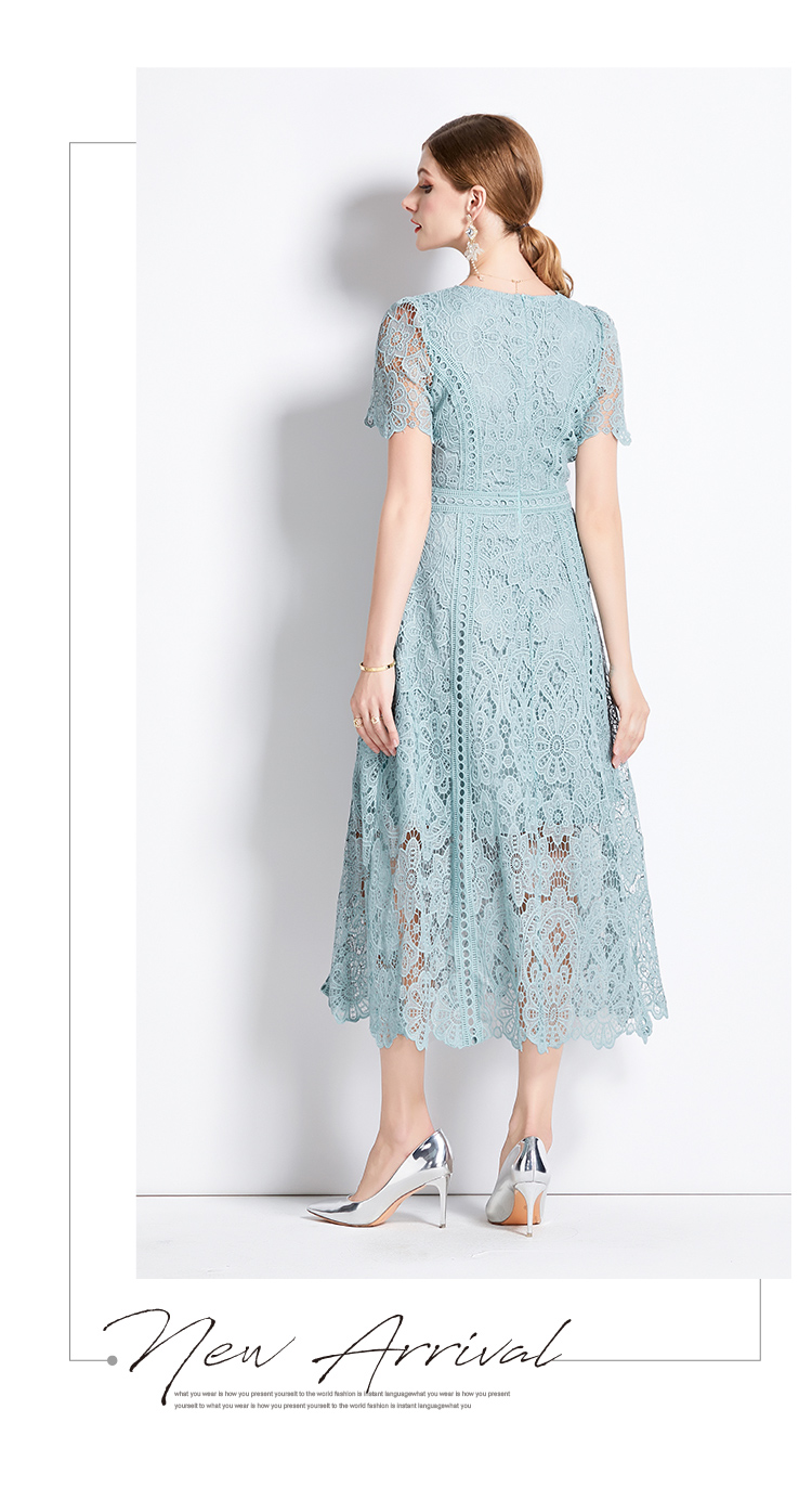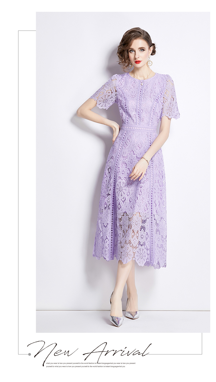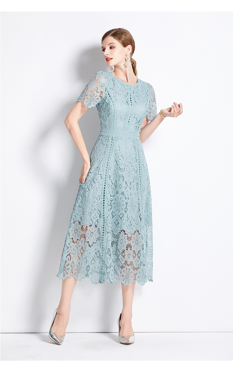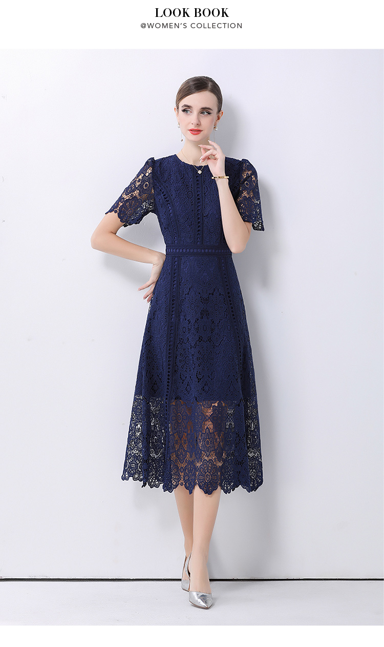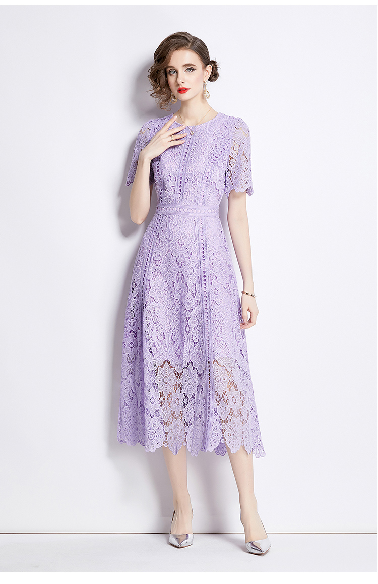 RY531# 小众复古高级感圆领荷叶袖蕾丝连衣裙女夏季新款显瘦气质优雅长裙