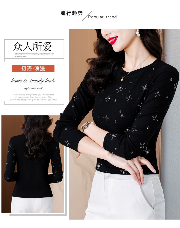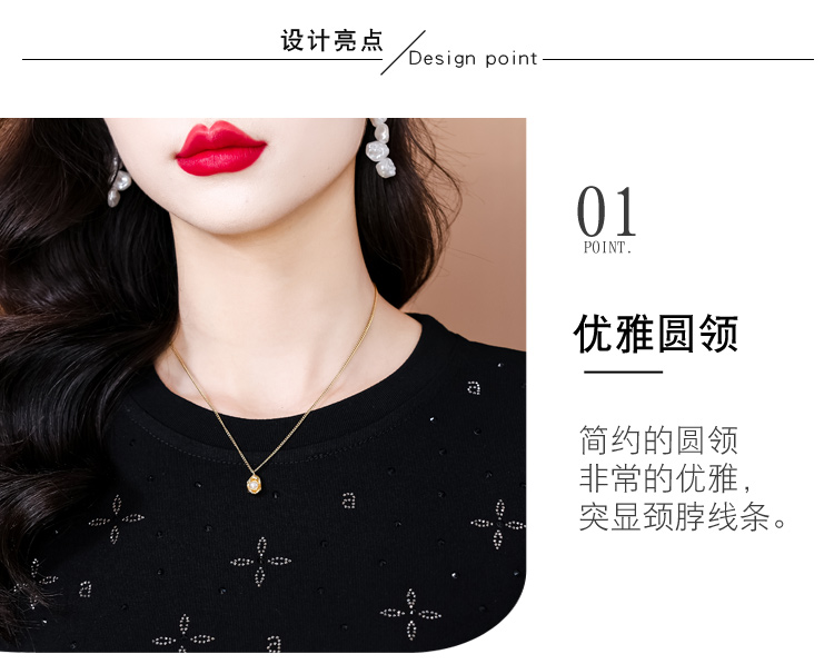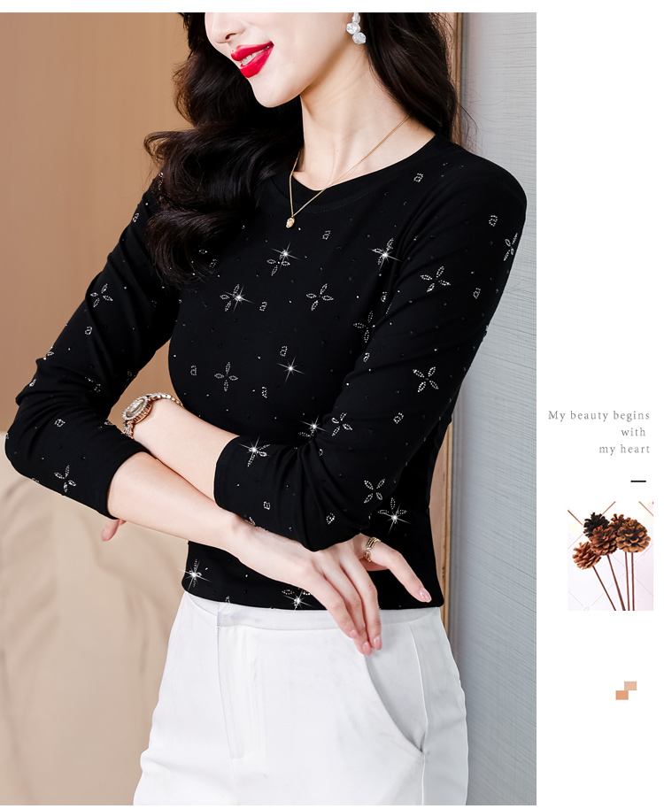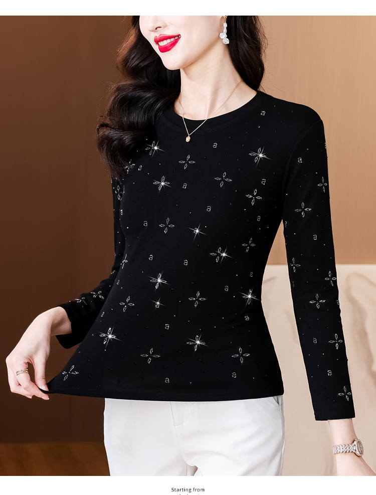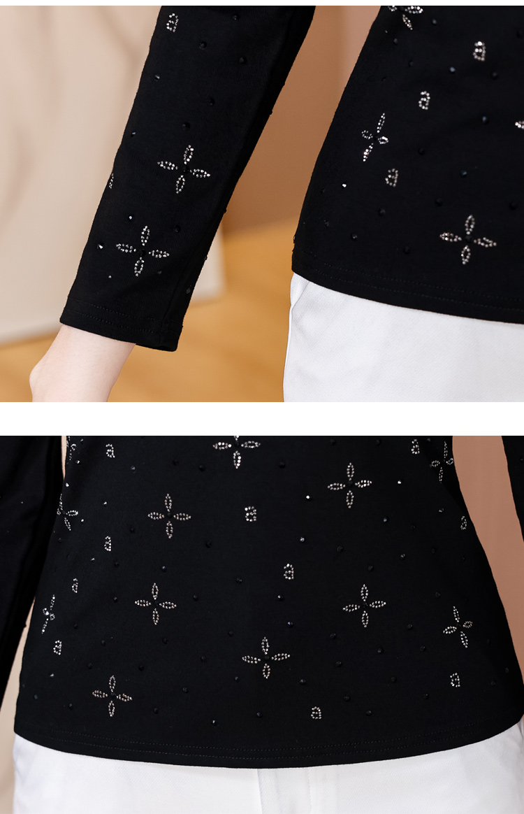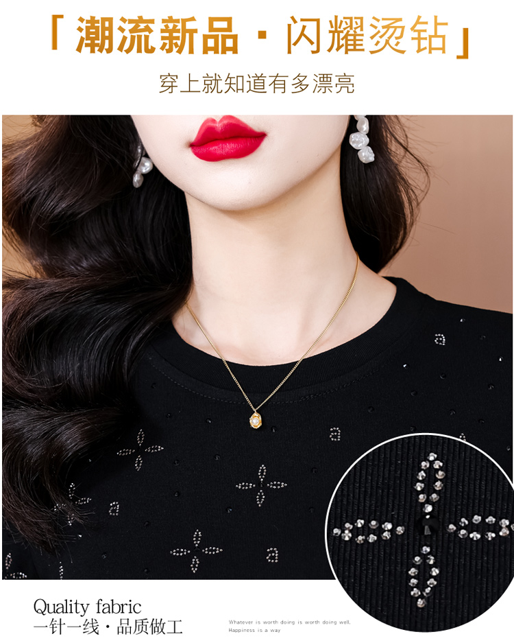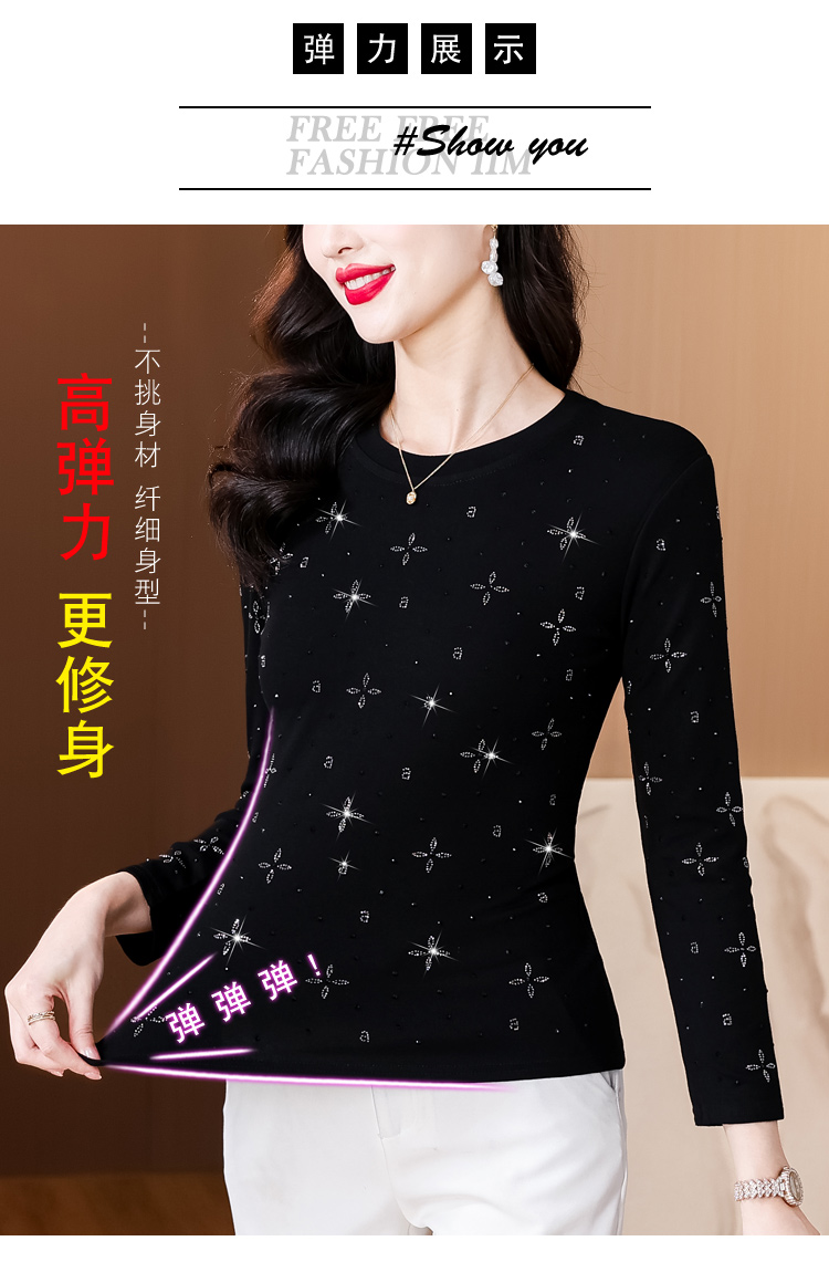 RY540# 实拍2026春新款大码女装重工烫澳钻四叶草花型圆领长袖棉t上衣女