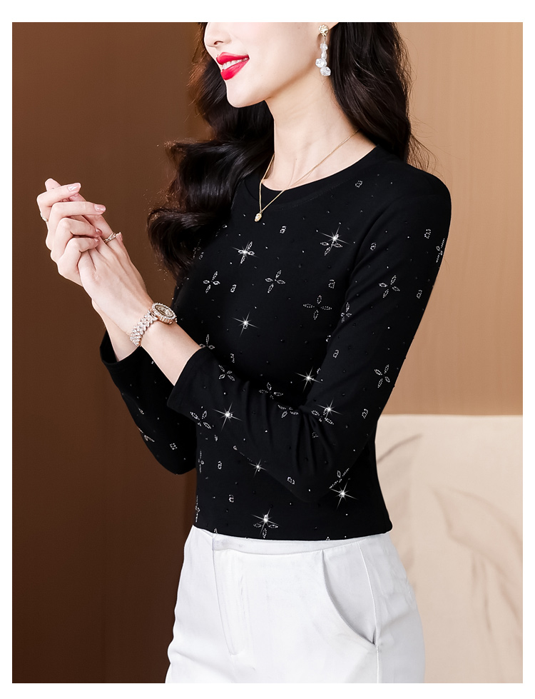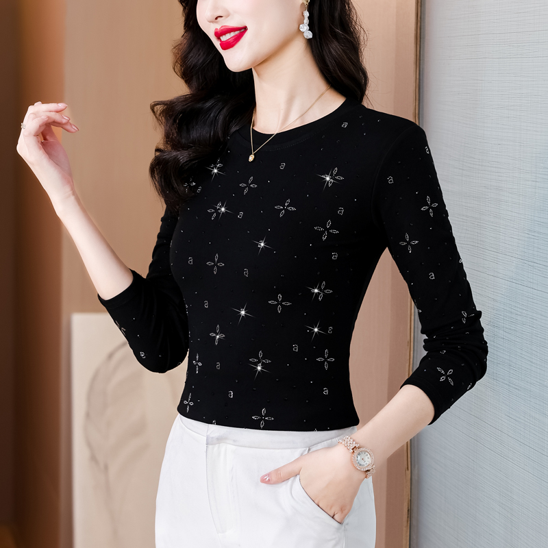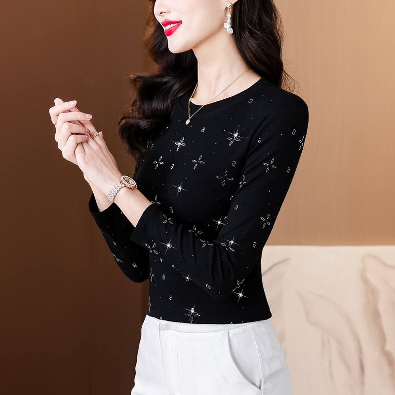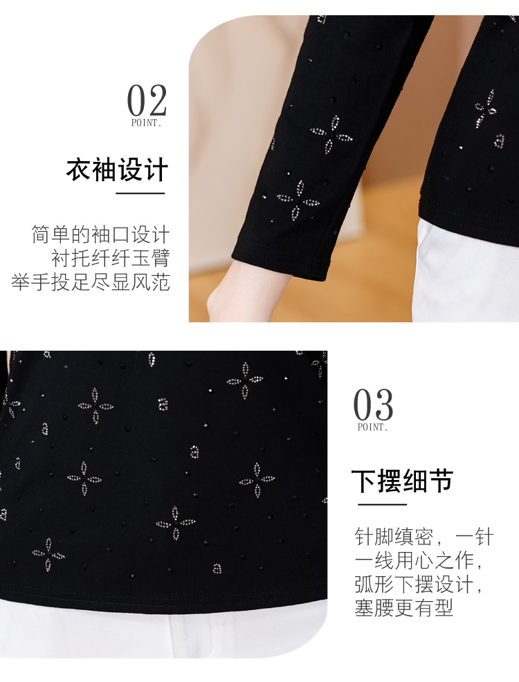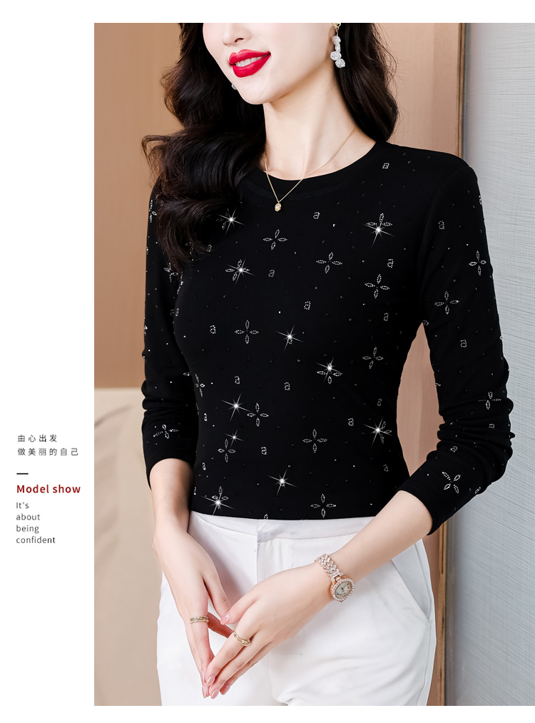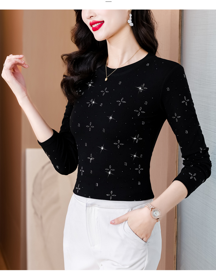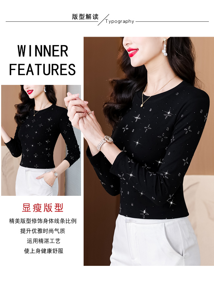 RY540# 实拍2026春新款大码女装重工烫澳钻四叶草花型圆领长袖棉t上衣女