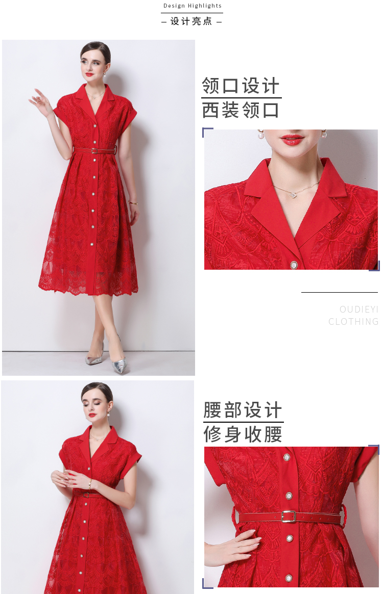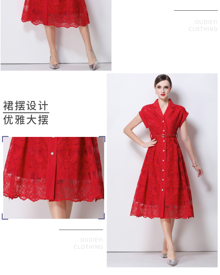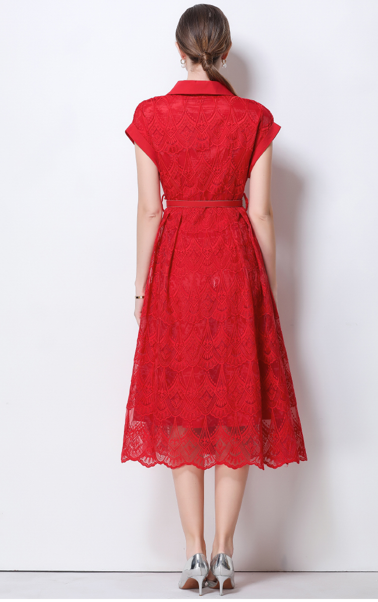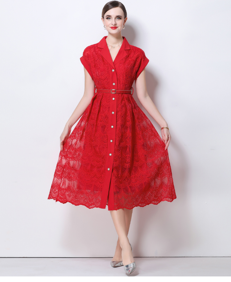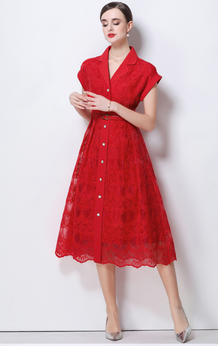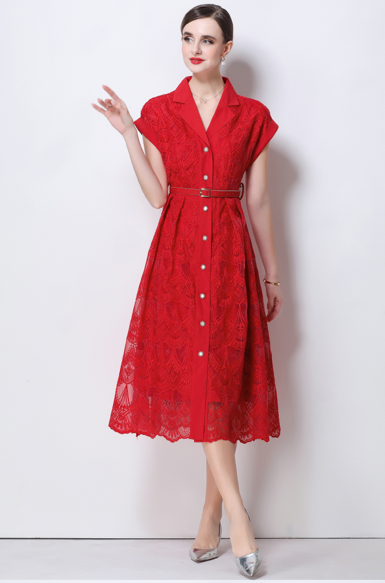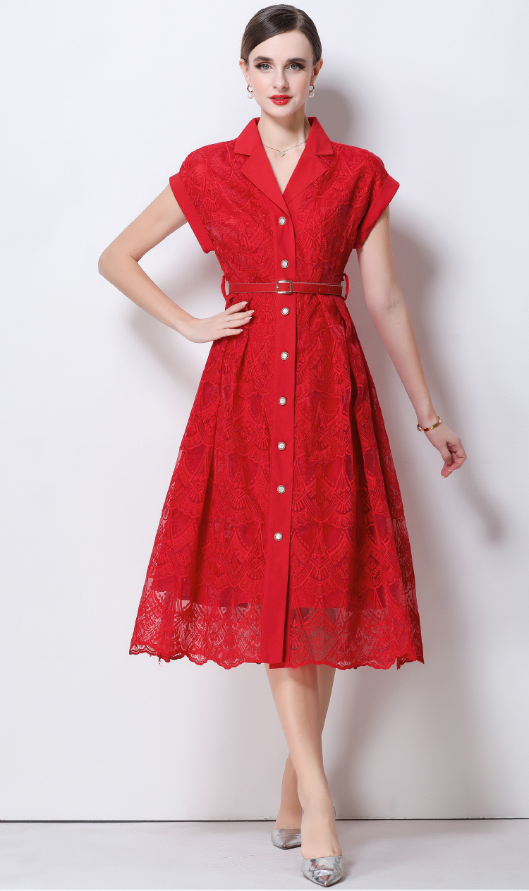 RY546# 实拍优雅气质重工刺绣蕾丝西装领连衣裙女收腰显瘦中长裙送腰带