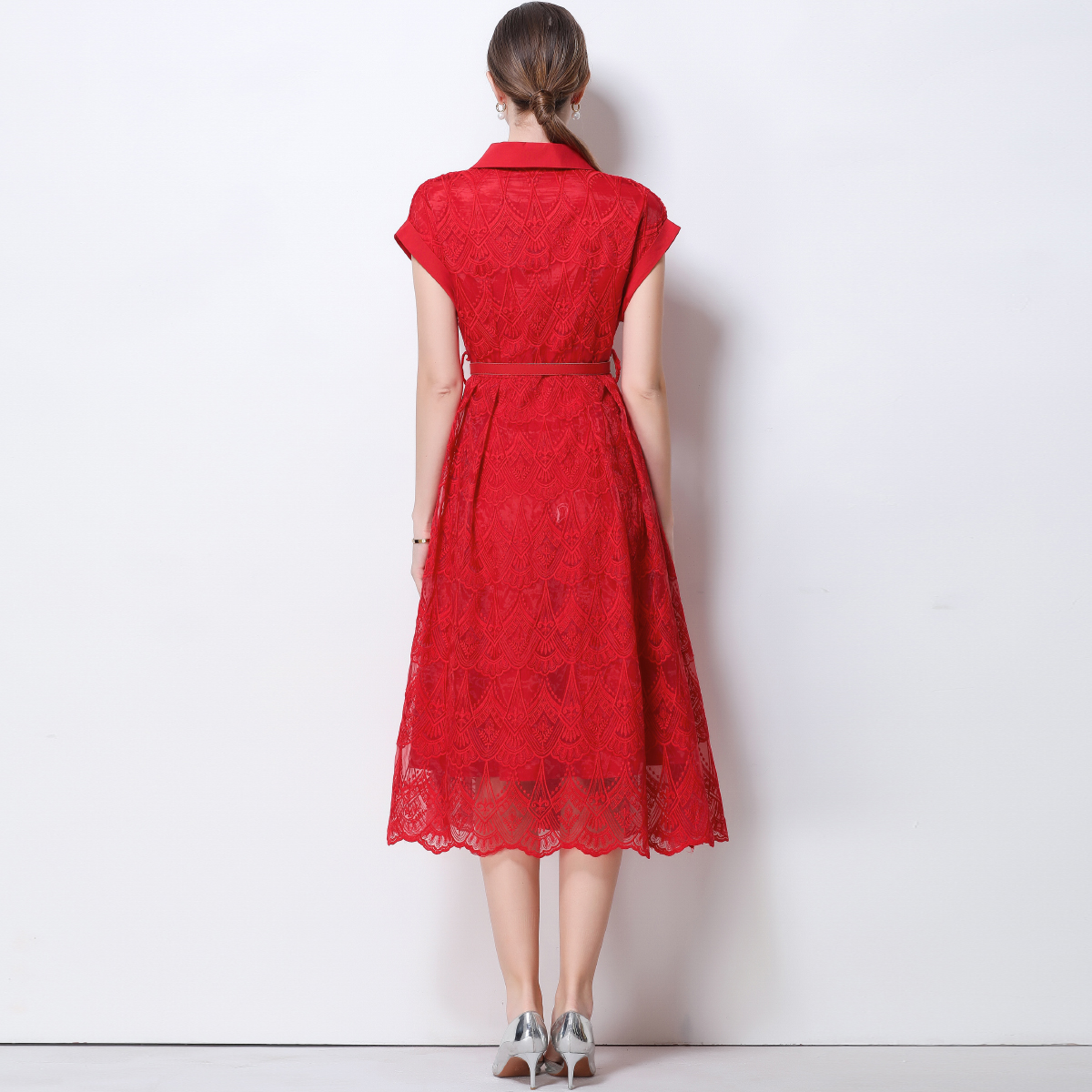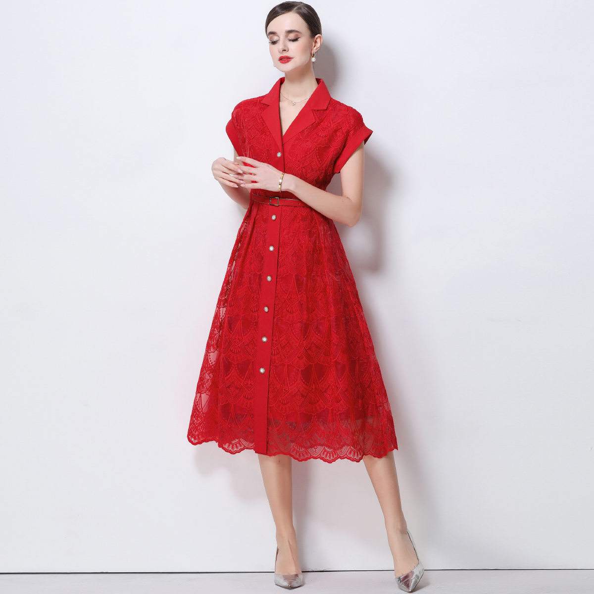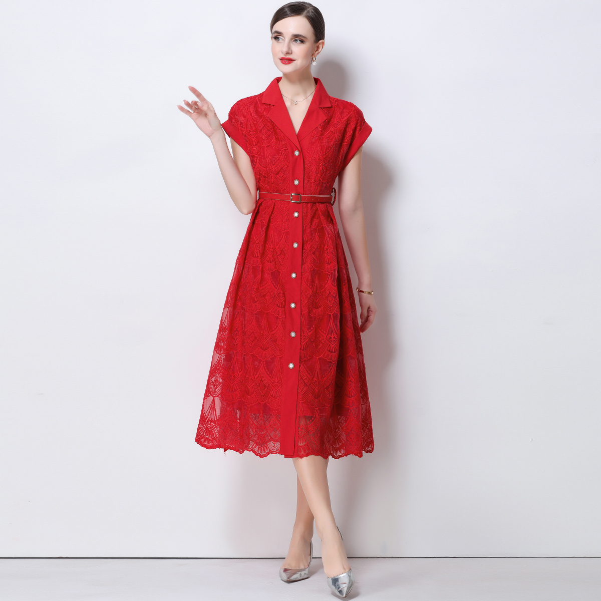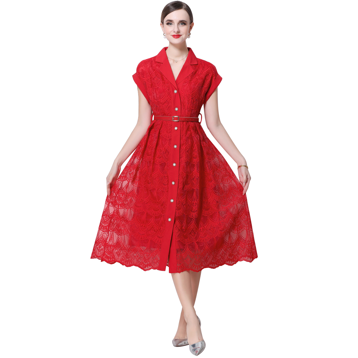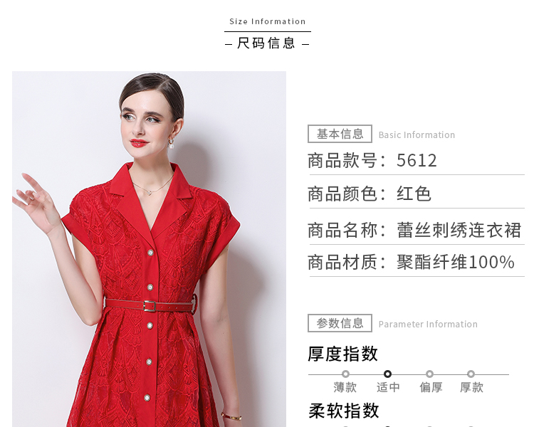 RY546# 实拍优雅气质重工刺绣蕾丝西装领连衣裙女收腰显瘦中长裙送腰带