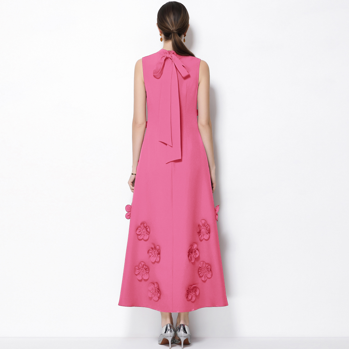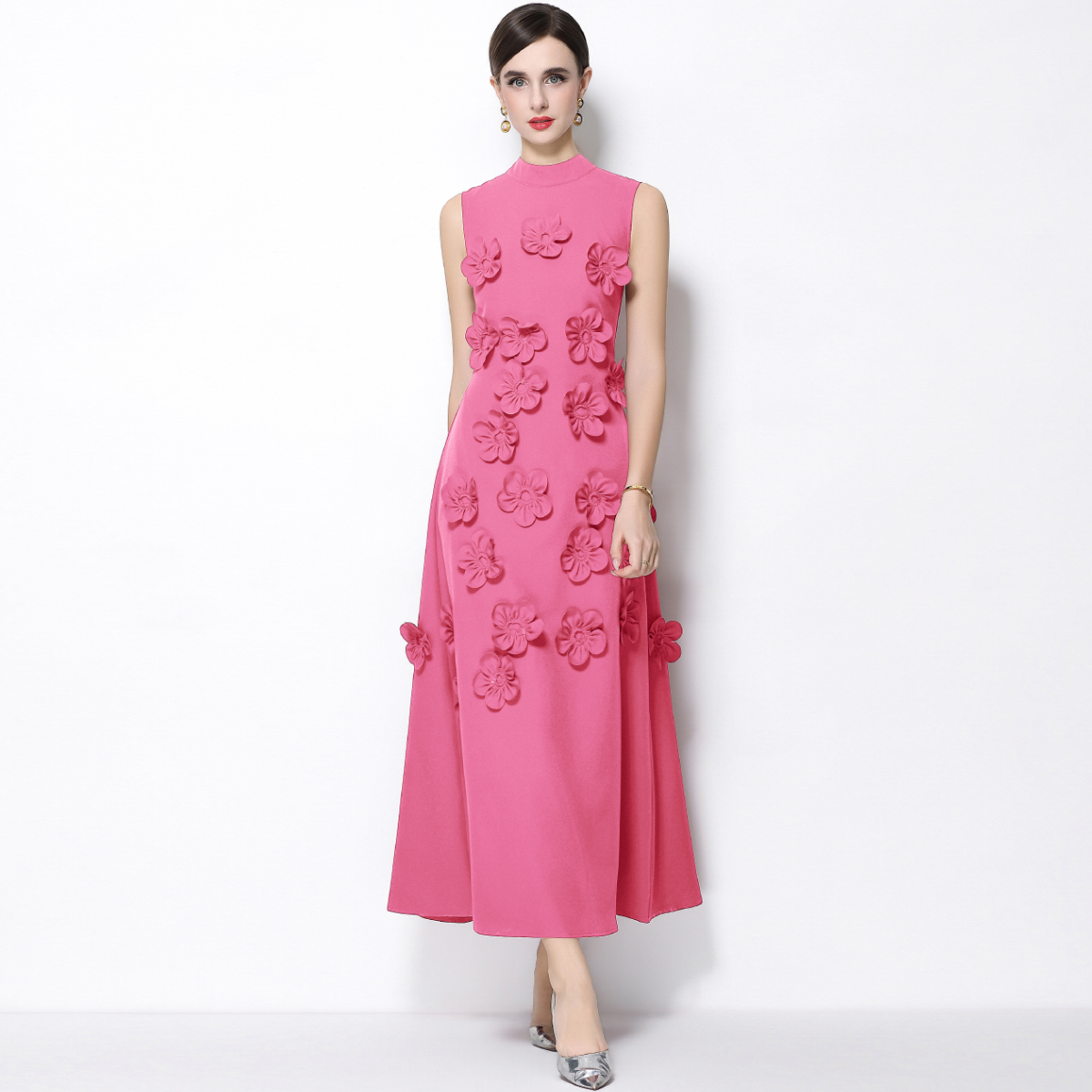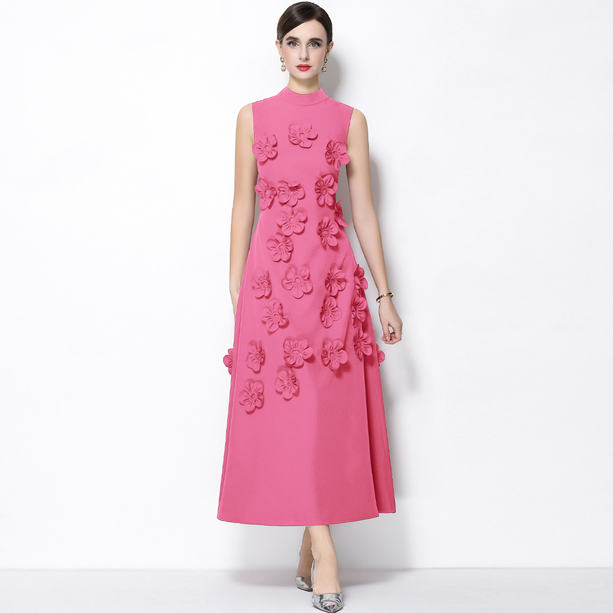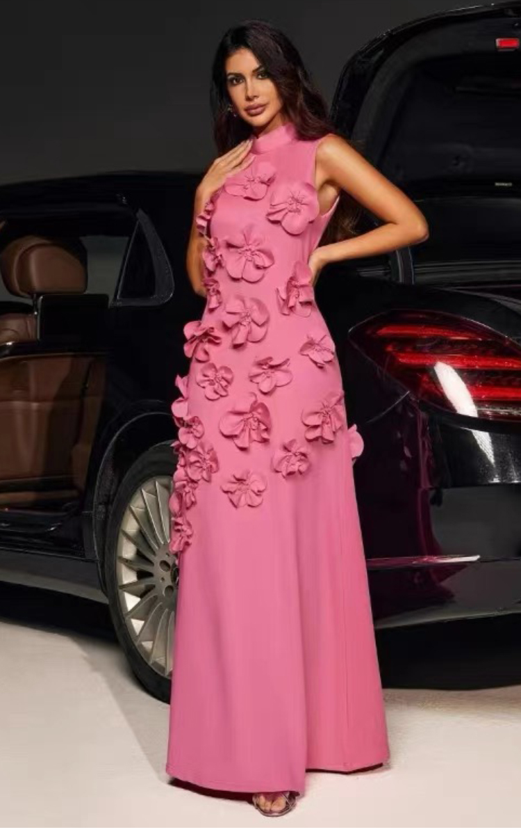 RY547# 实拍气质优雅重工立体花朵立领圆领无袖收腰显瘦A字连衣裙