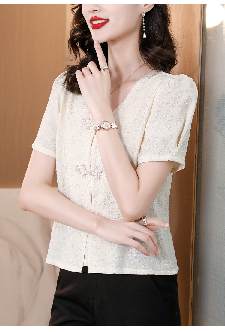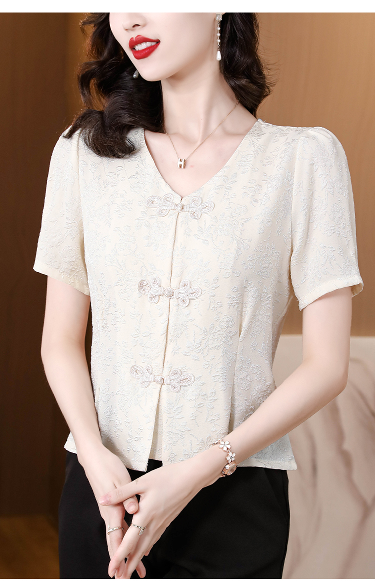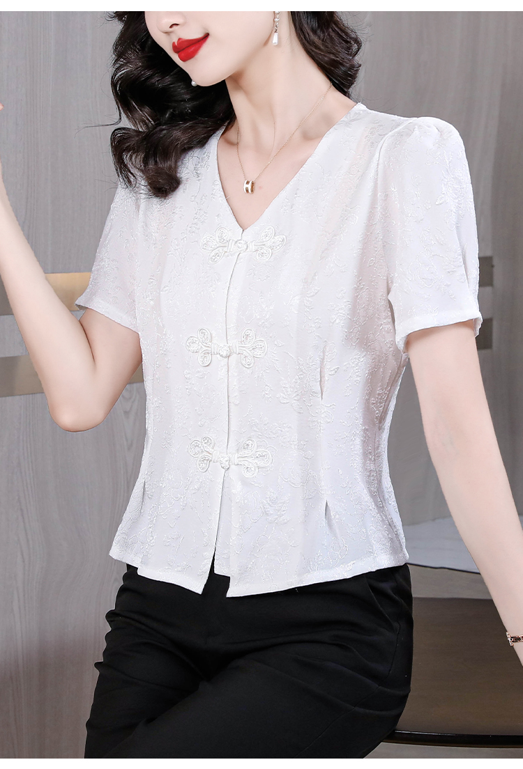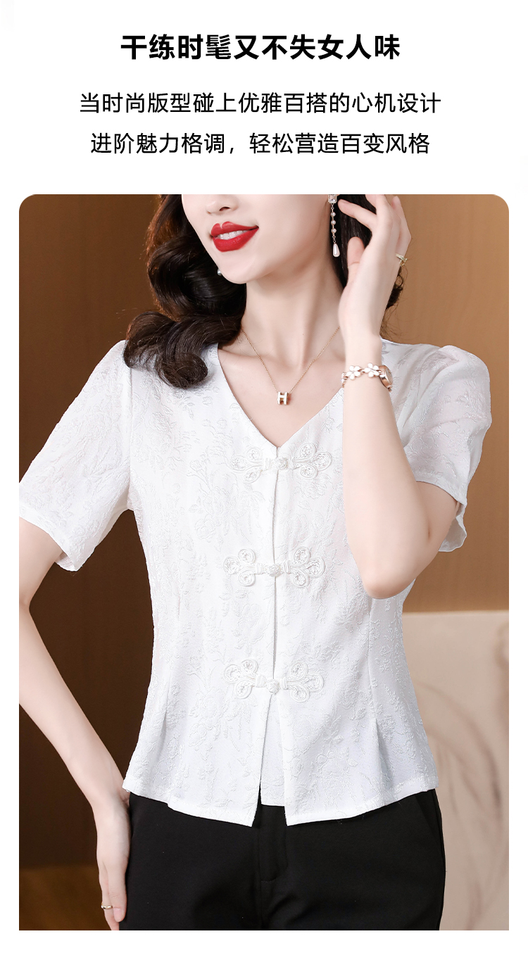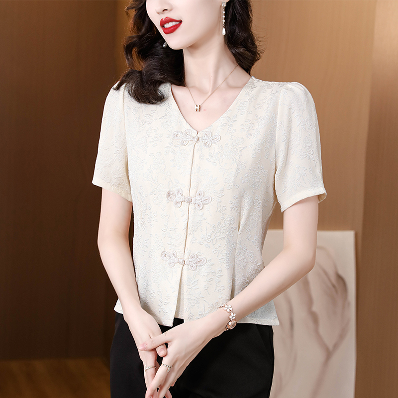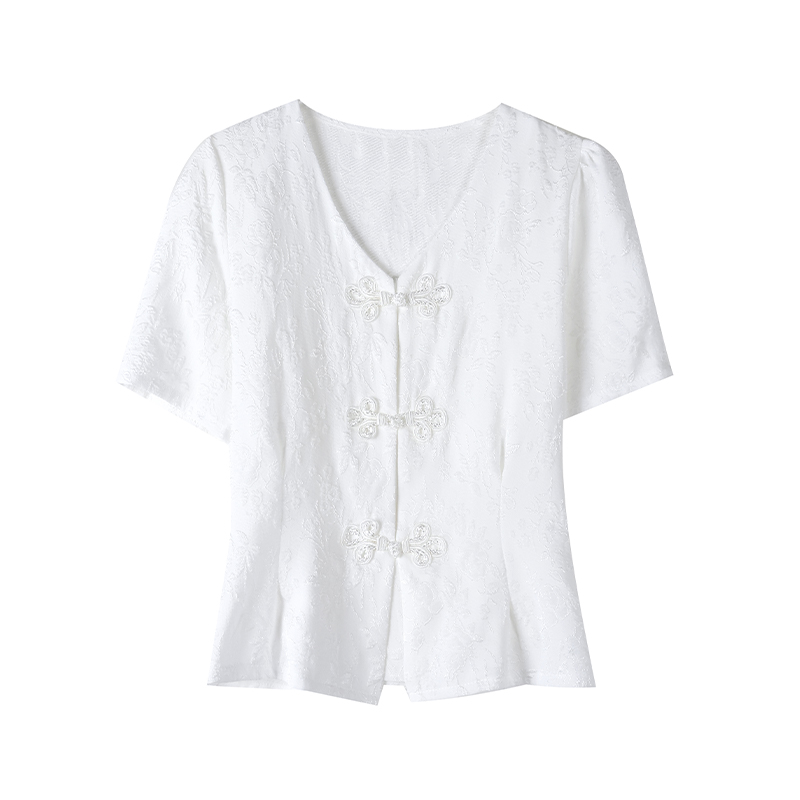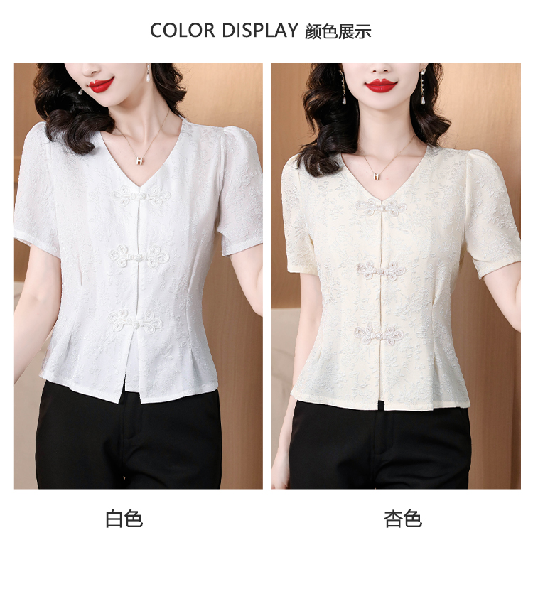 RY552# 国风盘扣雪纺衫夏季新中式提花v领别致短上衣女修身显瘦复古小衫