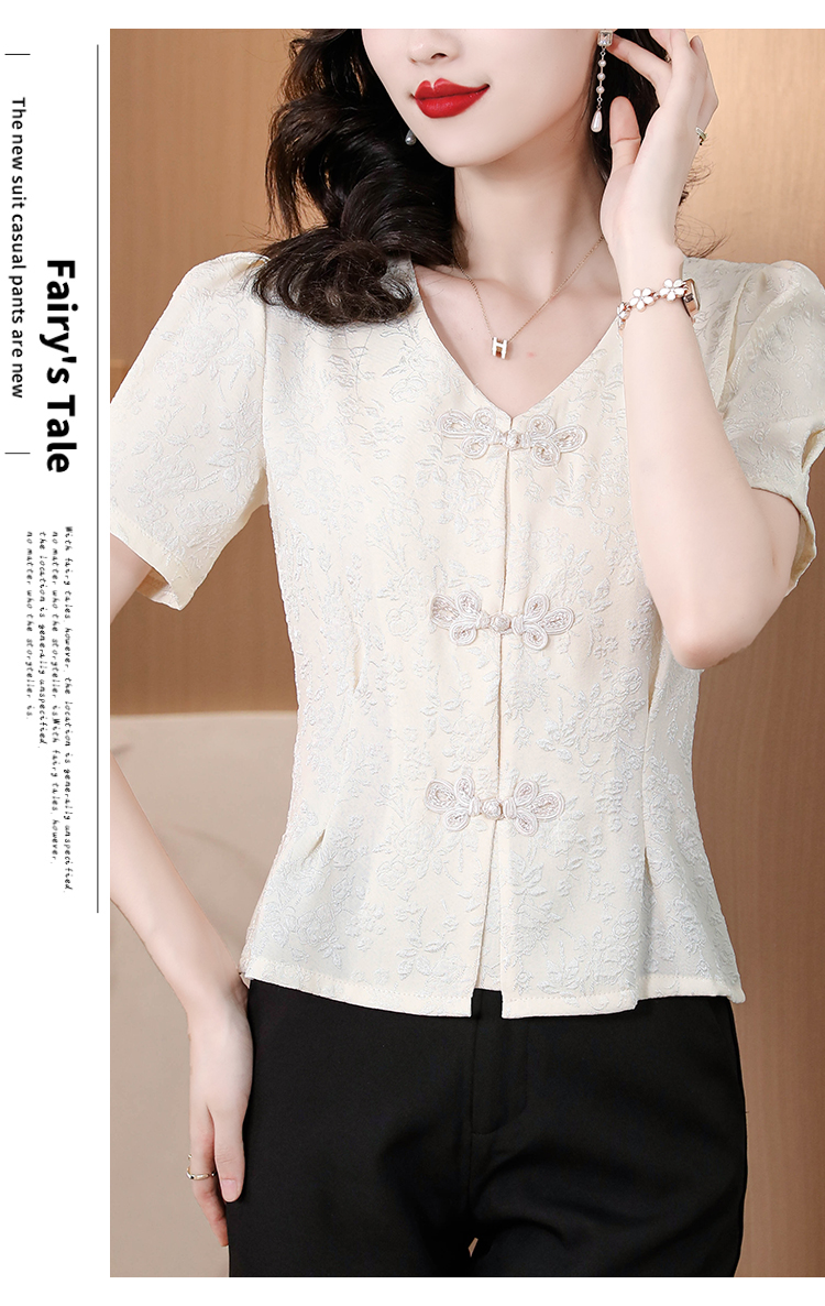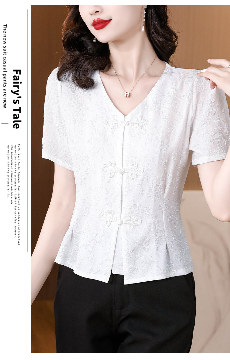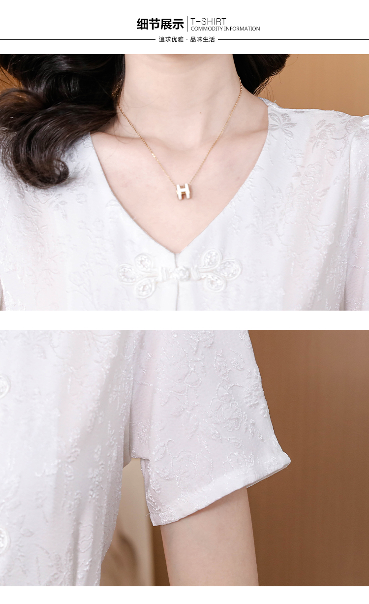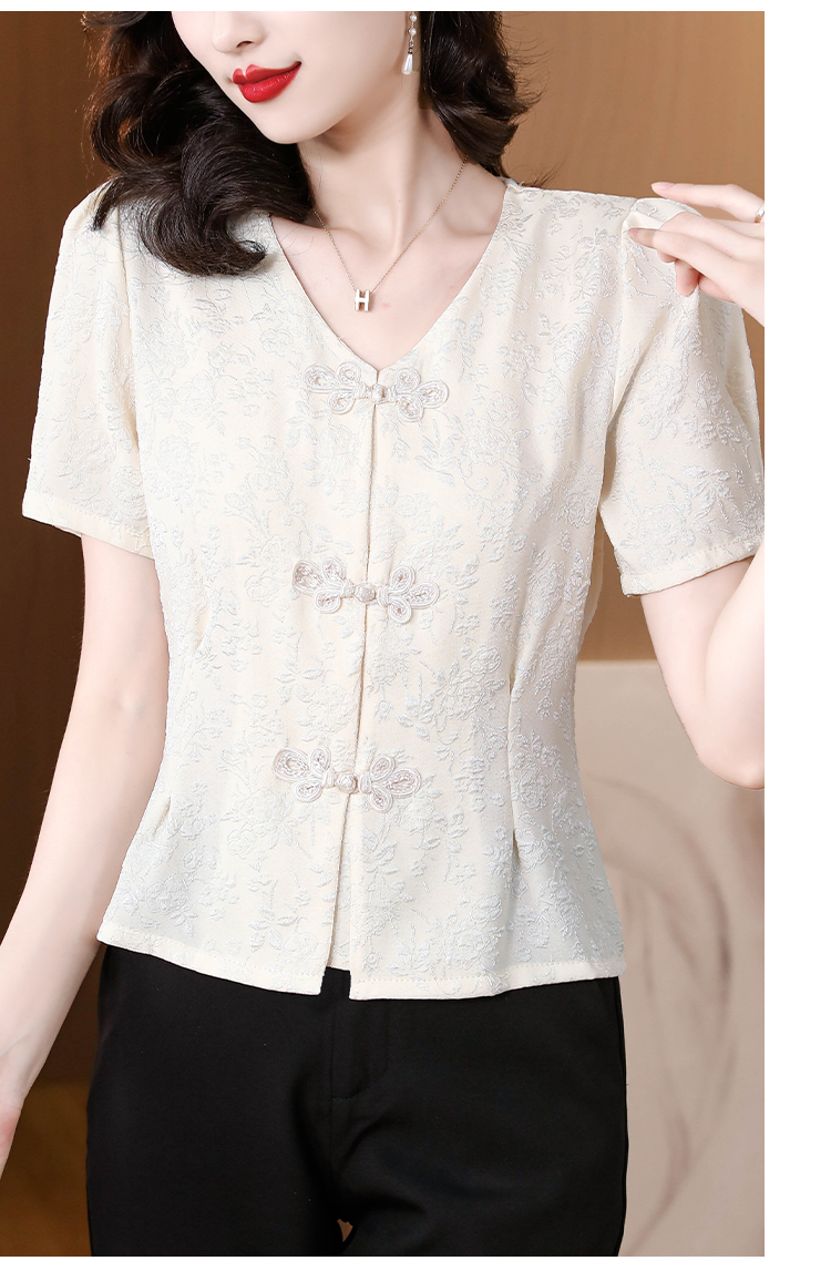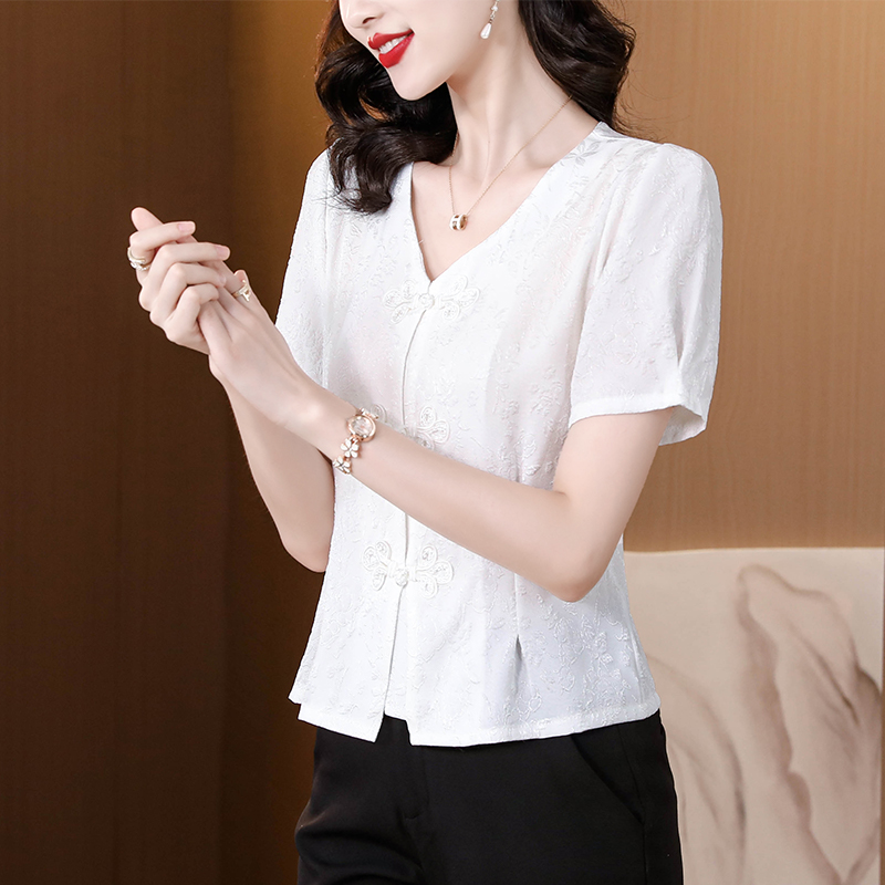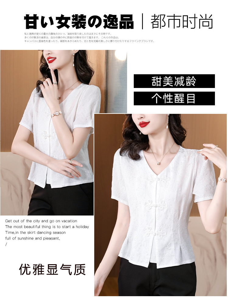 RY552# 国风盘扣雪纺衫夏季新中式提花v领别致短上衣女修身显瘦复古小衫