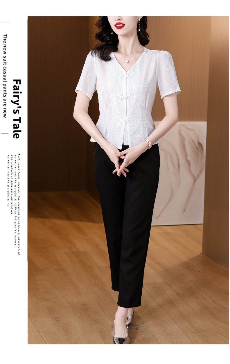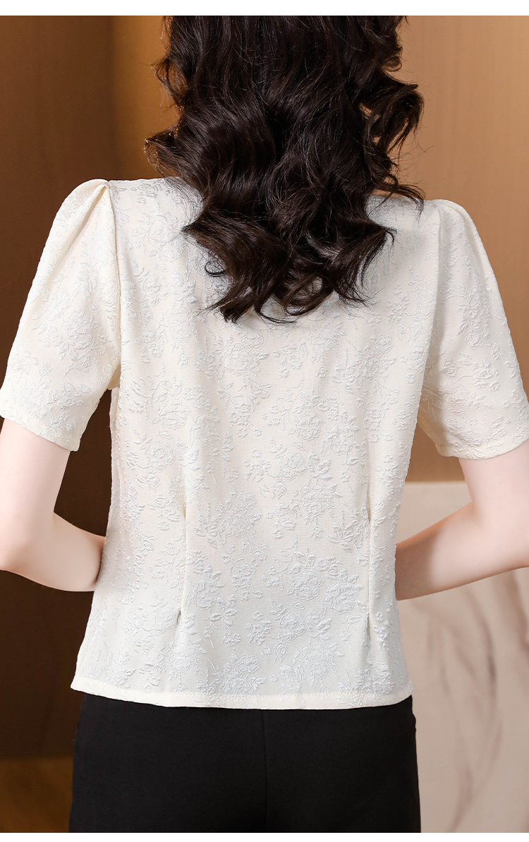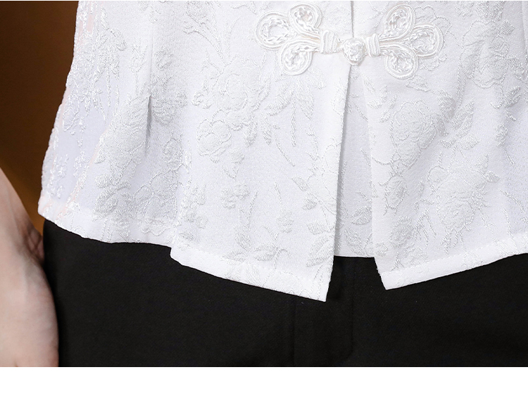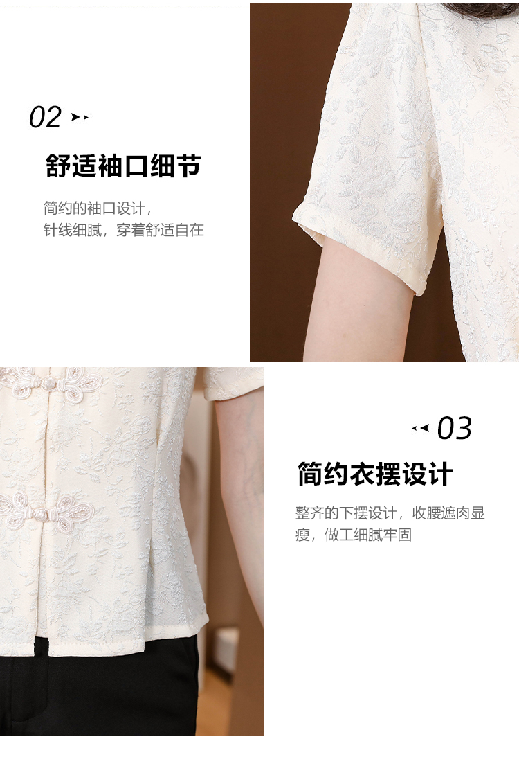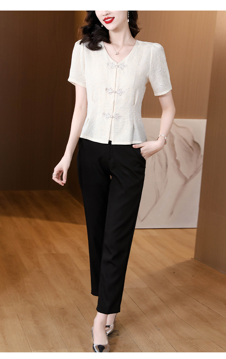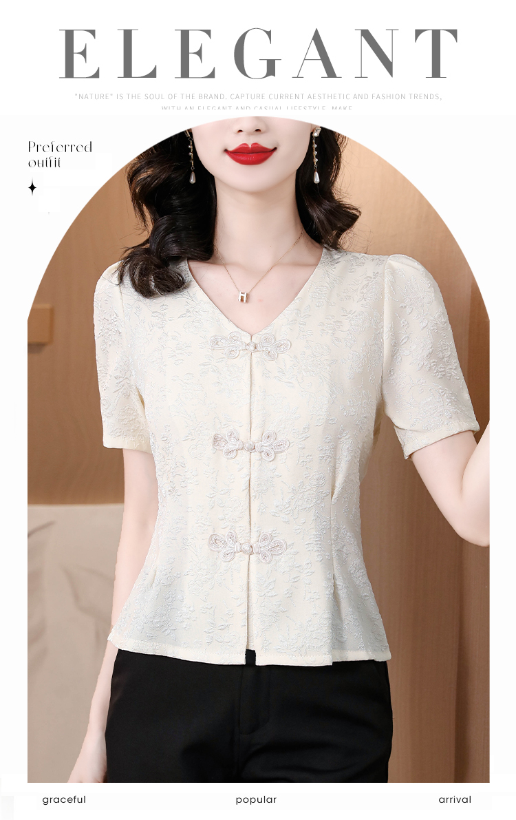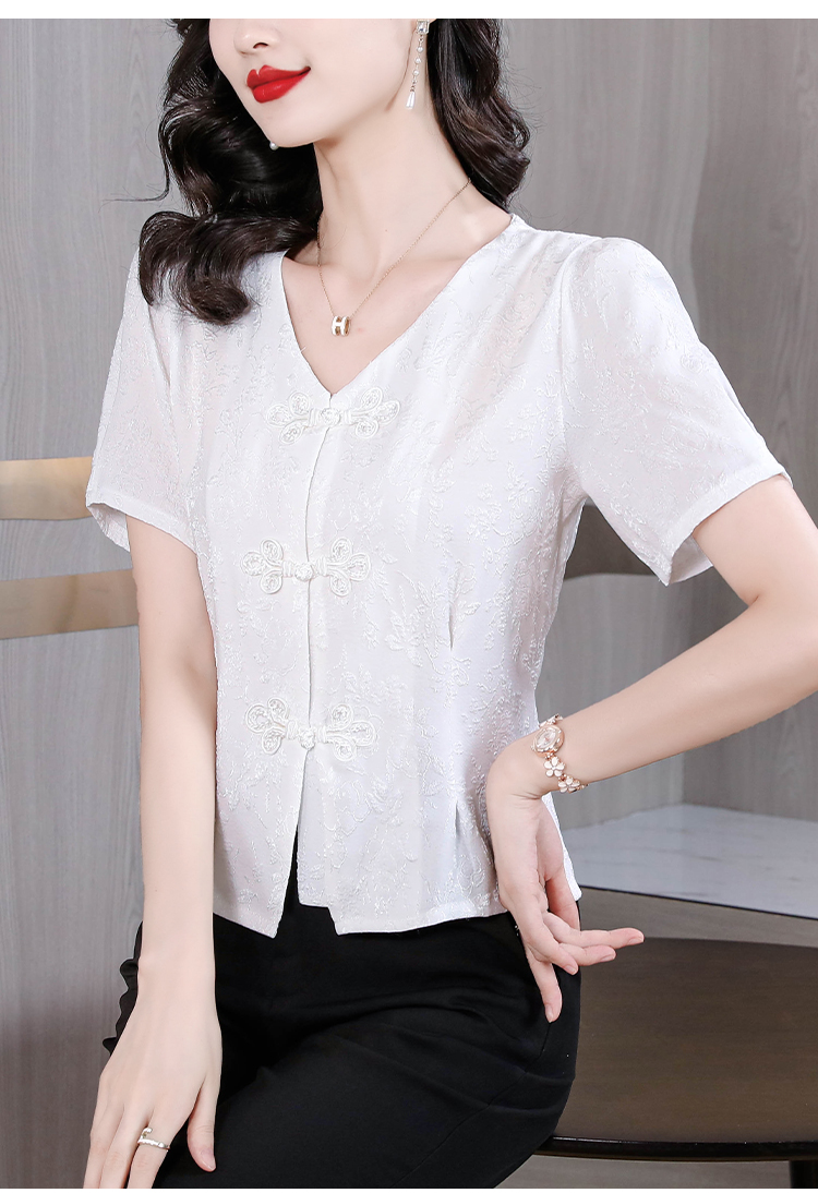 RY552# 国风盘扣雪纺衫夏季新中式提花v领别致短上衣女修身显瘦复古小衫