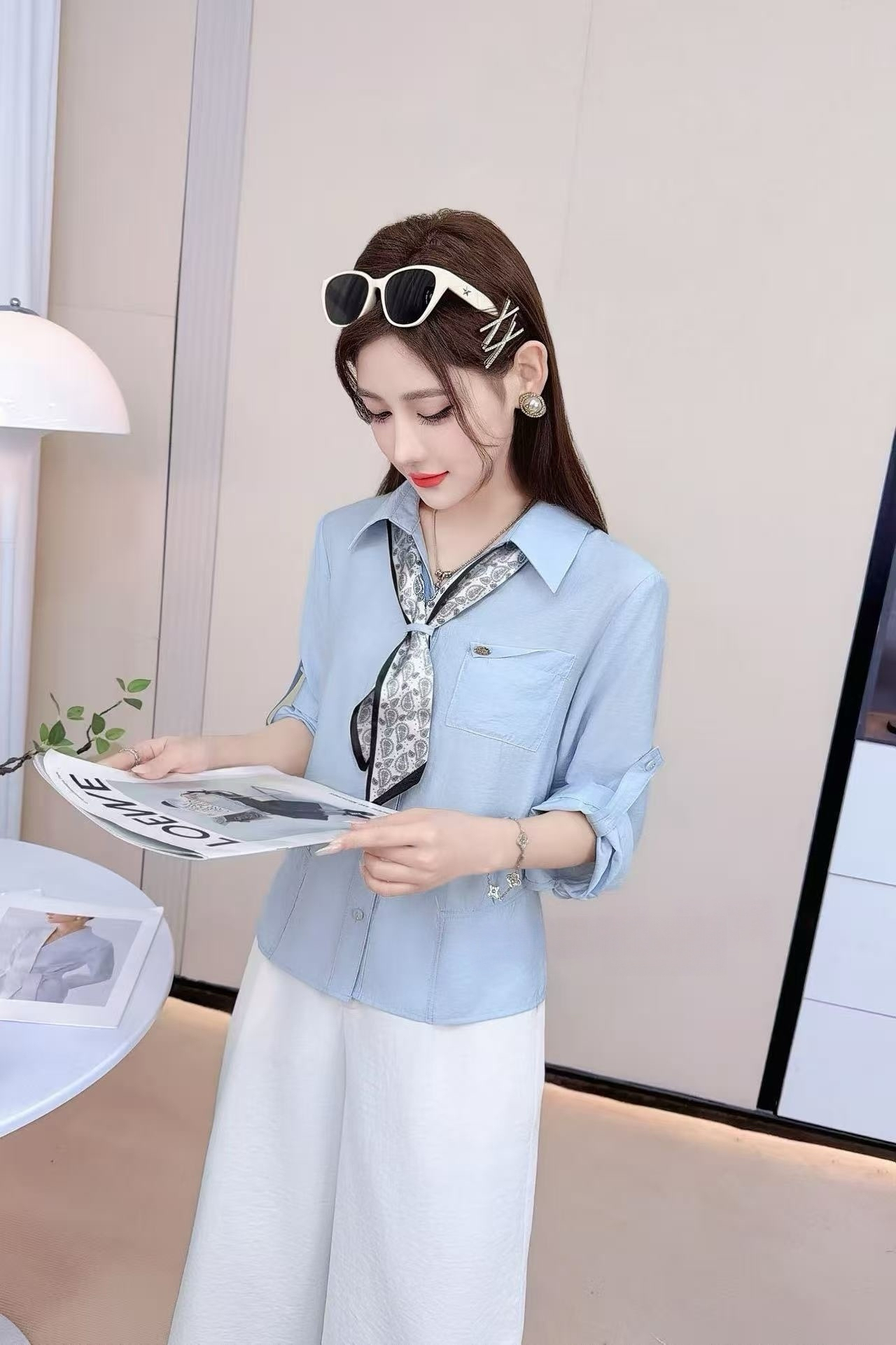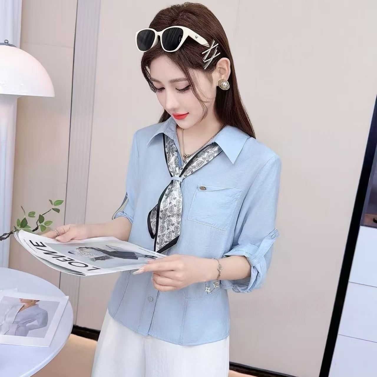 RY557# 气质名媛淑女风七分袖衬衫2026春季新款丝巾百搭设计感女士衬衣
