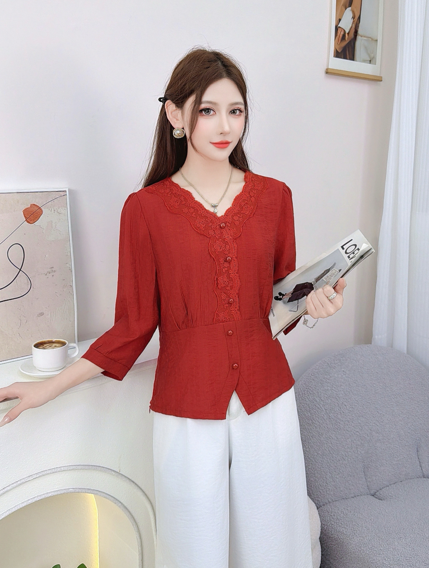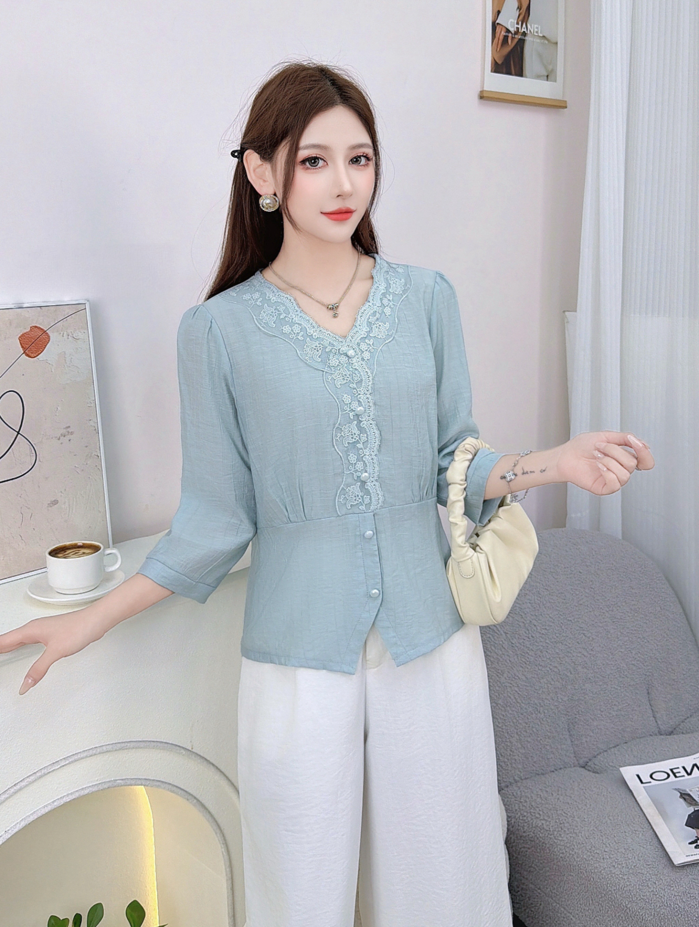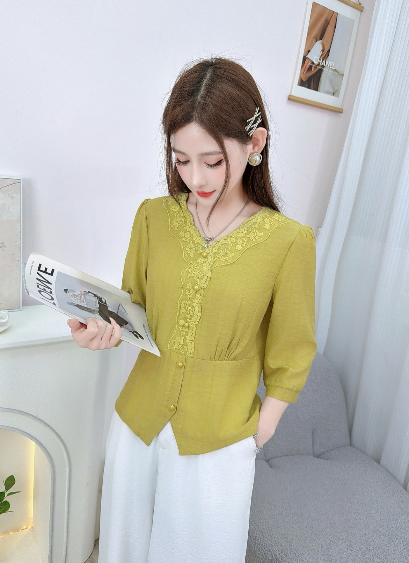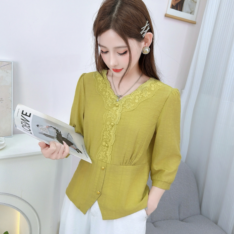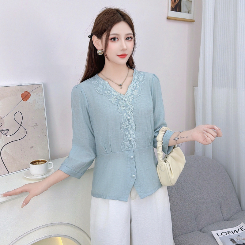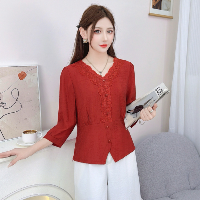 RY559# 蕾丝花边拼接V领中袖衬衫女2026新款高级感法式气质显瘦百搭上衣