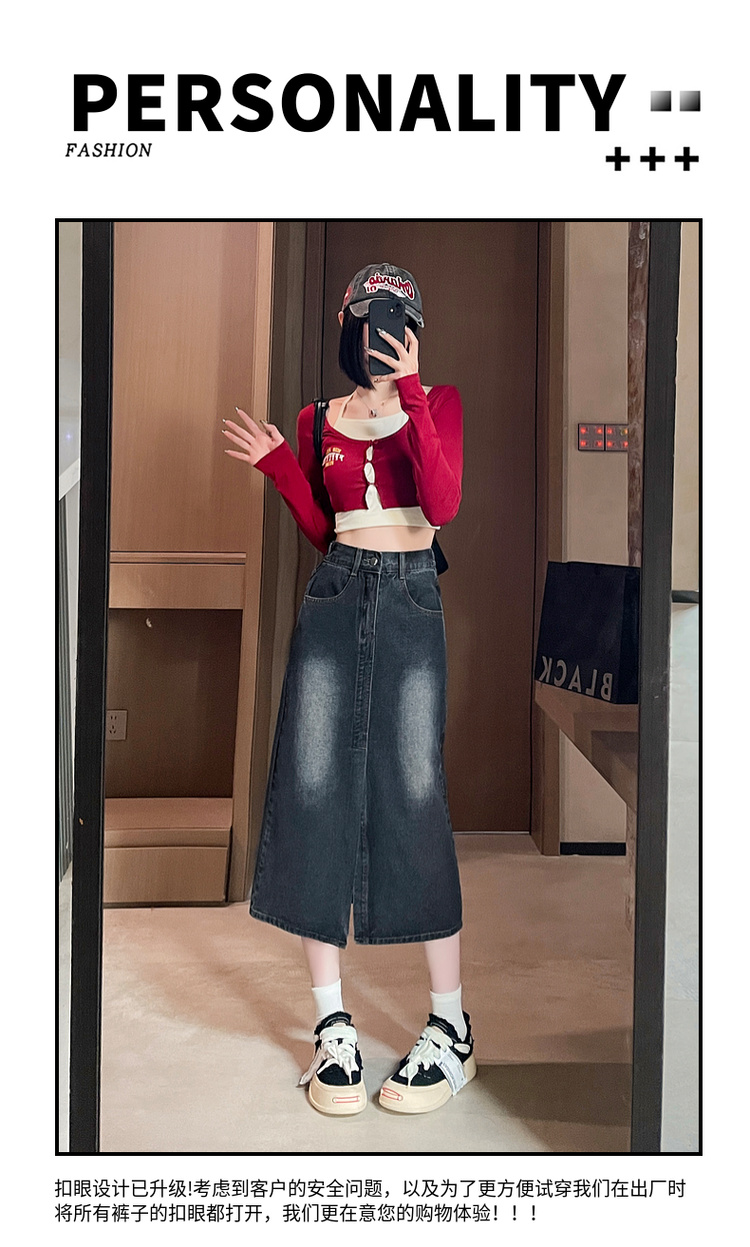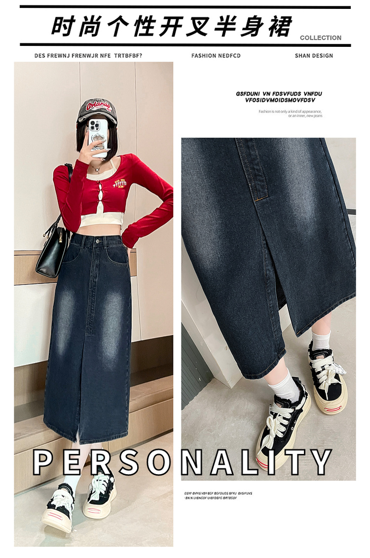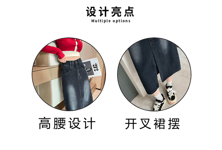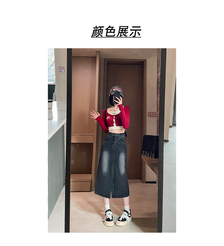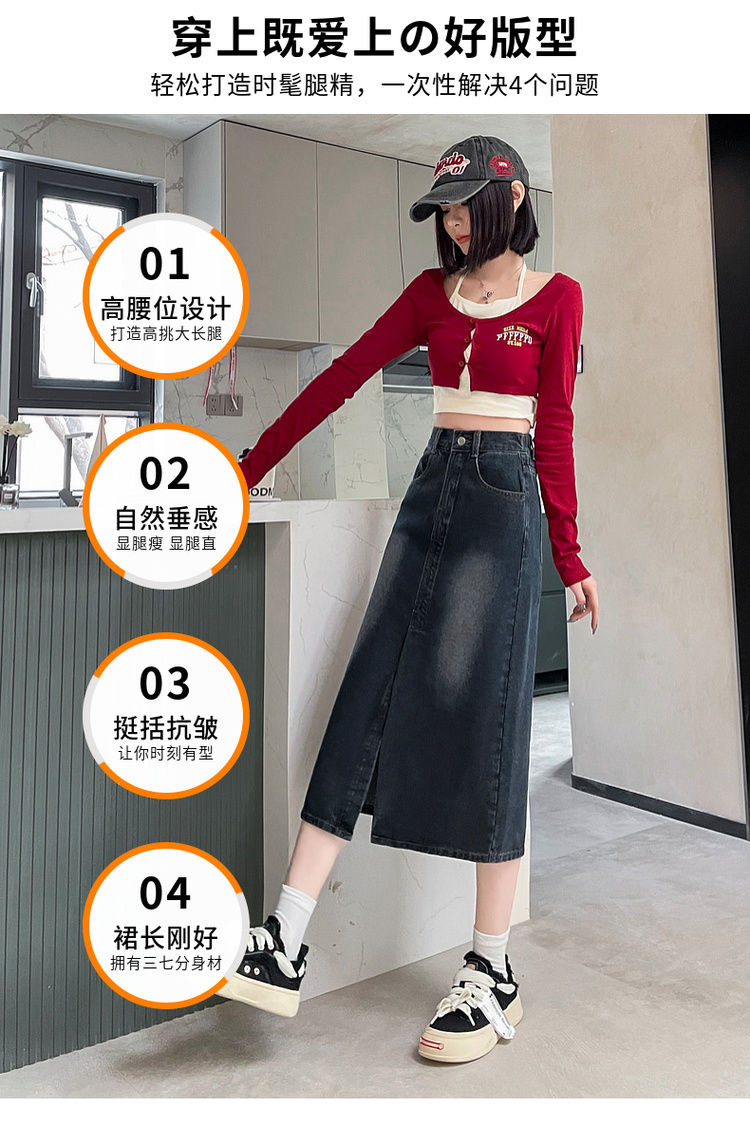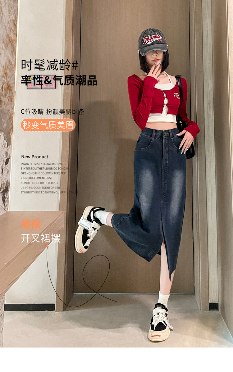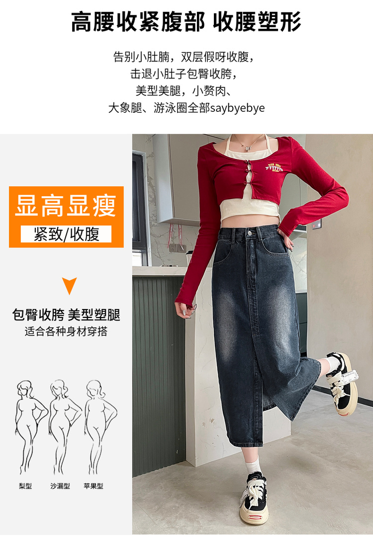 RY678# 实拍2026夏季新款小个子牛仔裙后松紧腰半身裙后开叉中长裙撞色