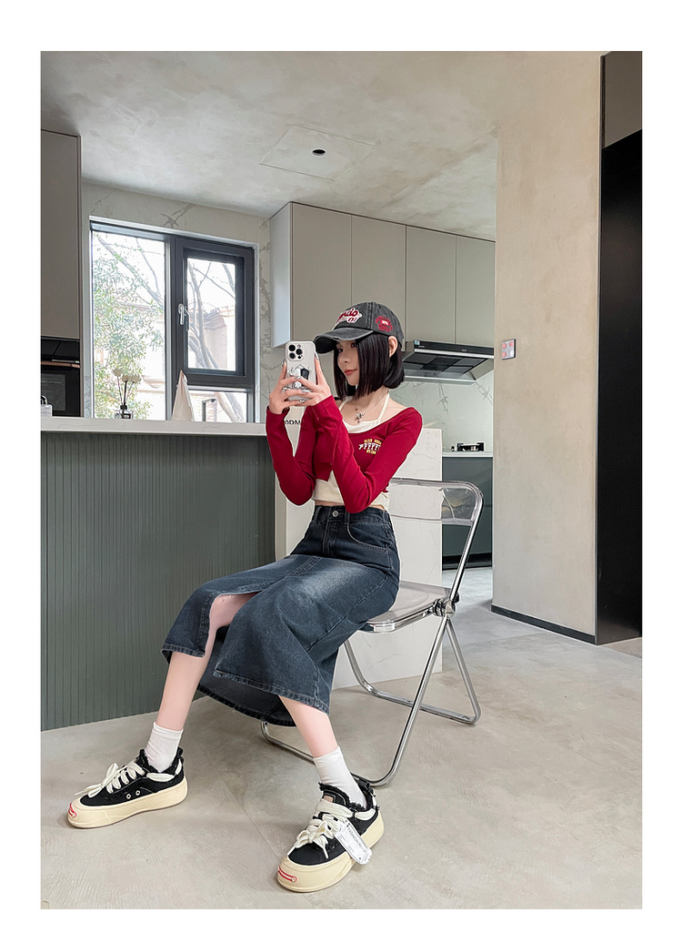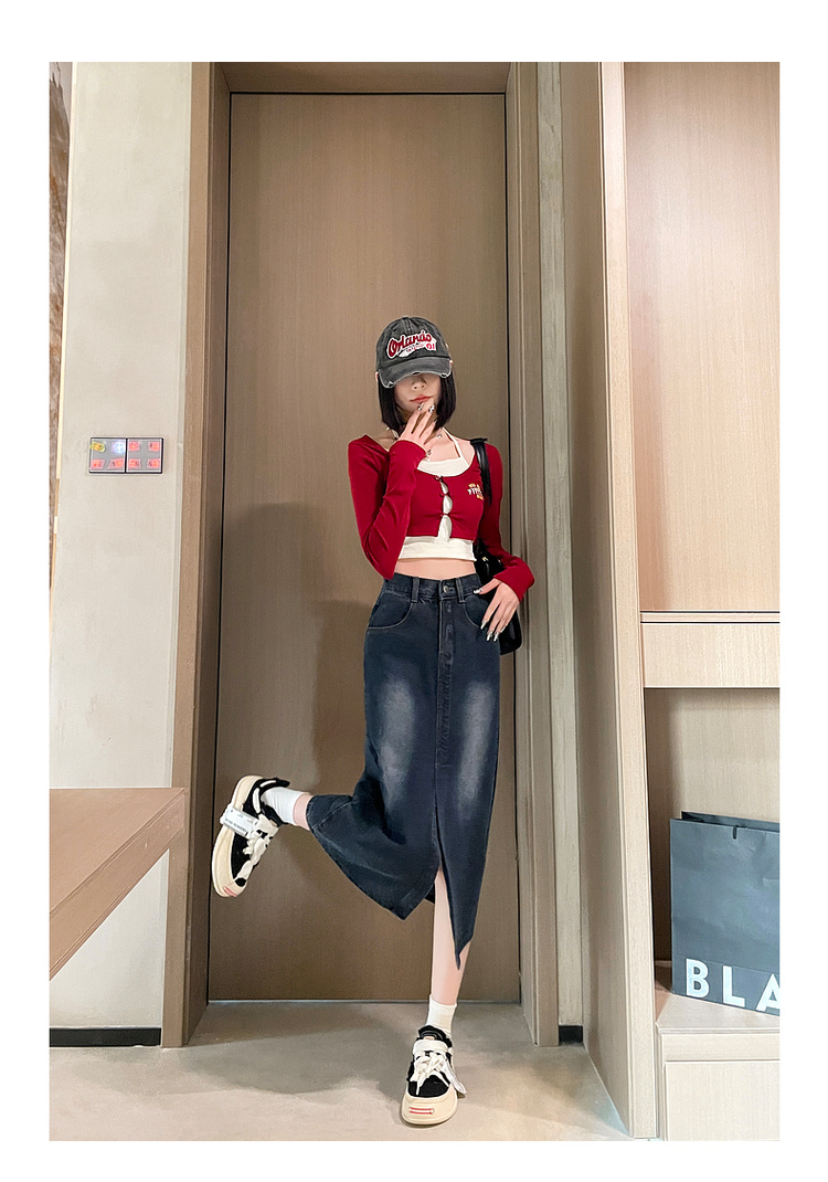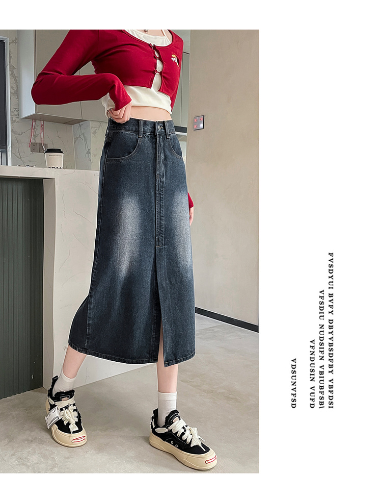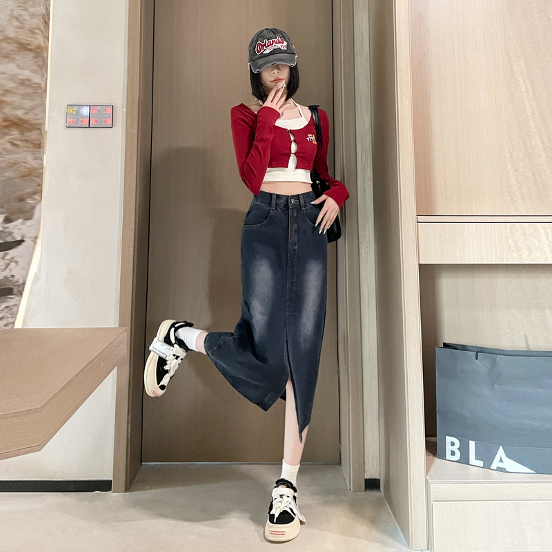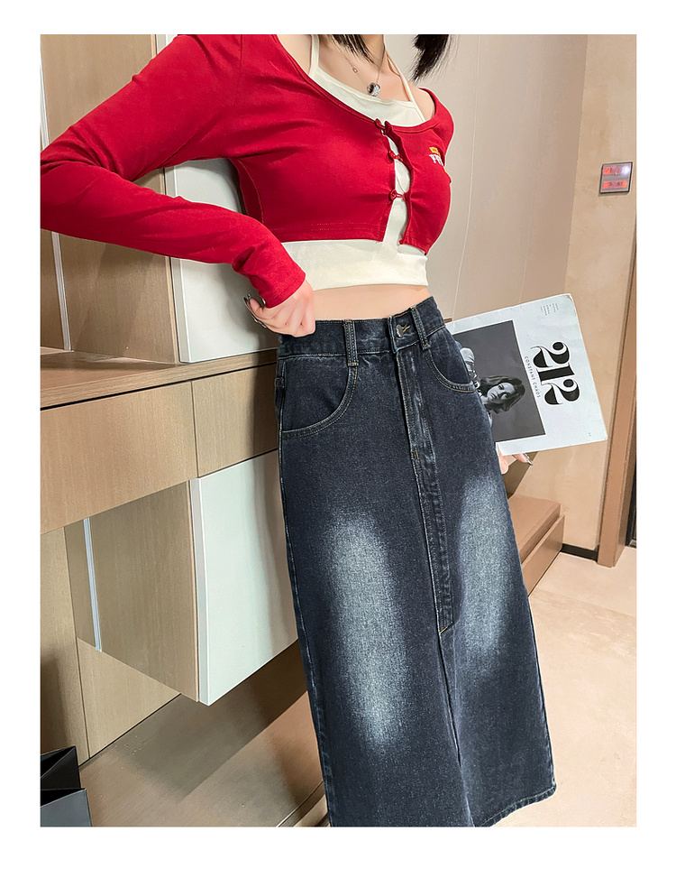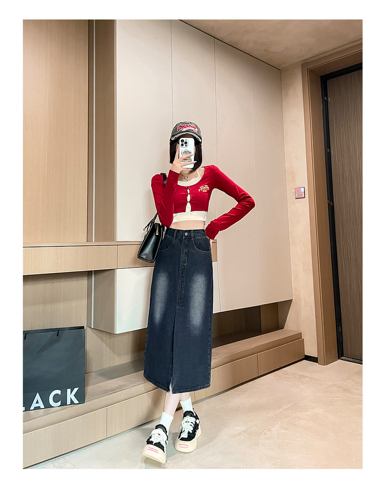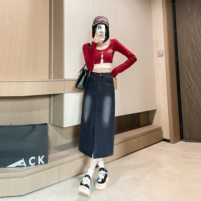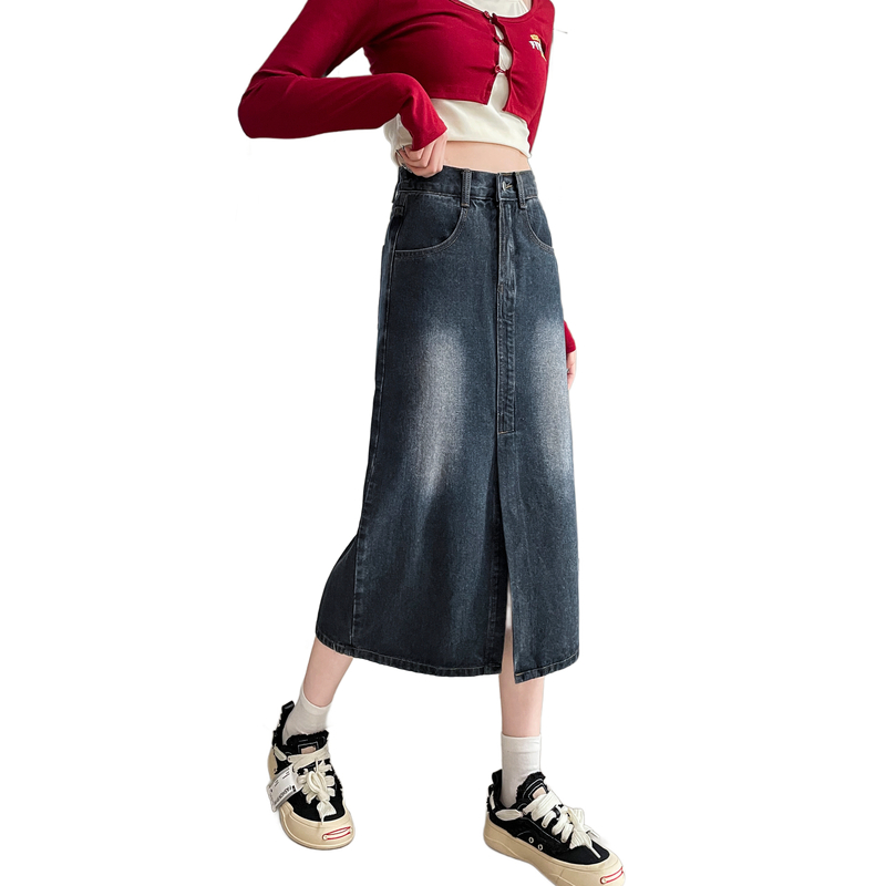 RY678# 实拍2026夏季新款小个子牛仔裙后松紧腰半身裙后开叉中长裙撞色
