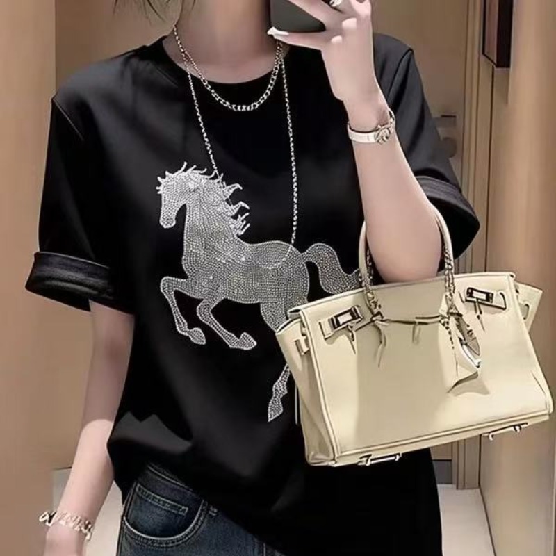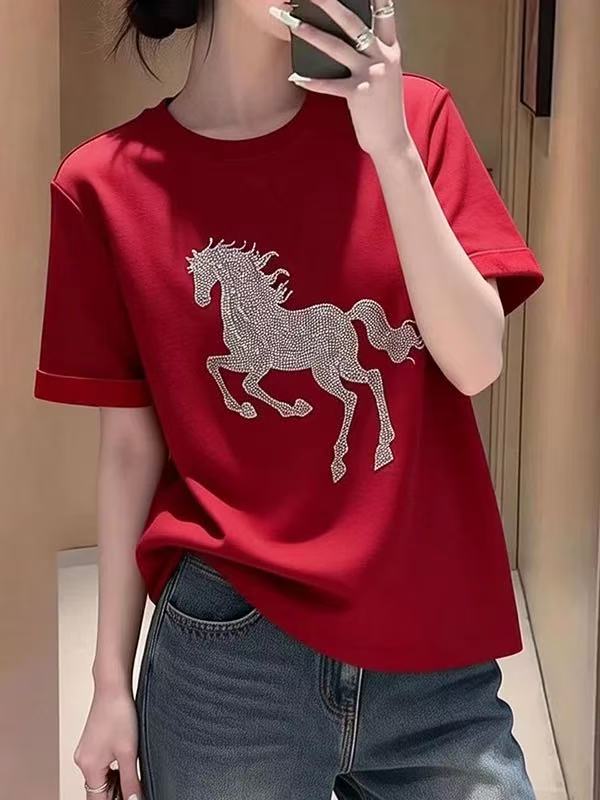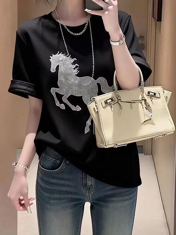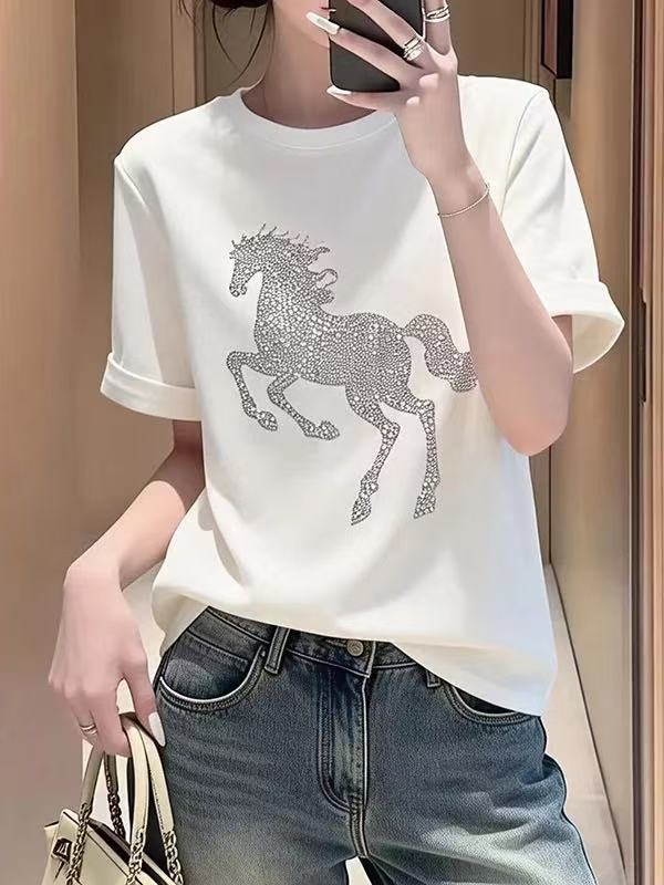 RY696# 韩版重工烫钻小马短袖T恤女春夏美式打底衫体恤休闲通勤上衣百搭