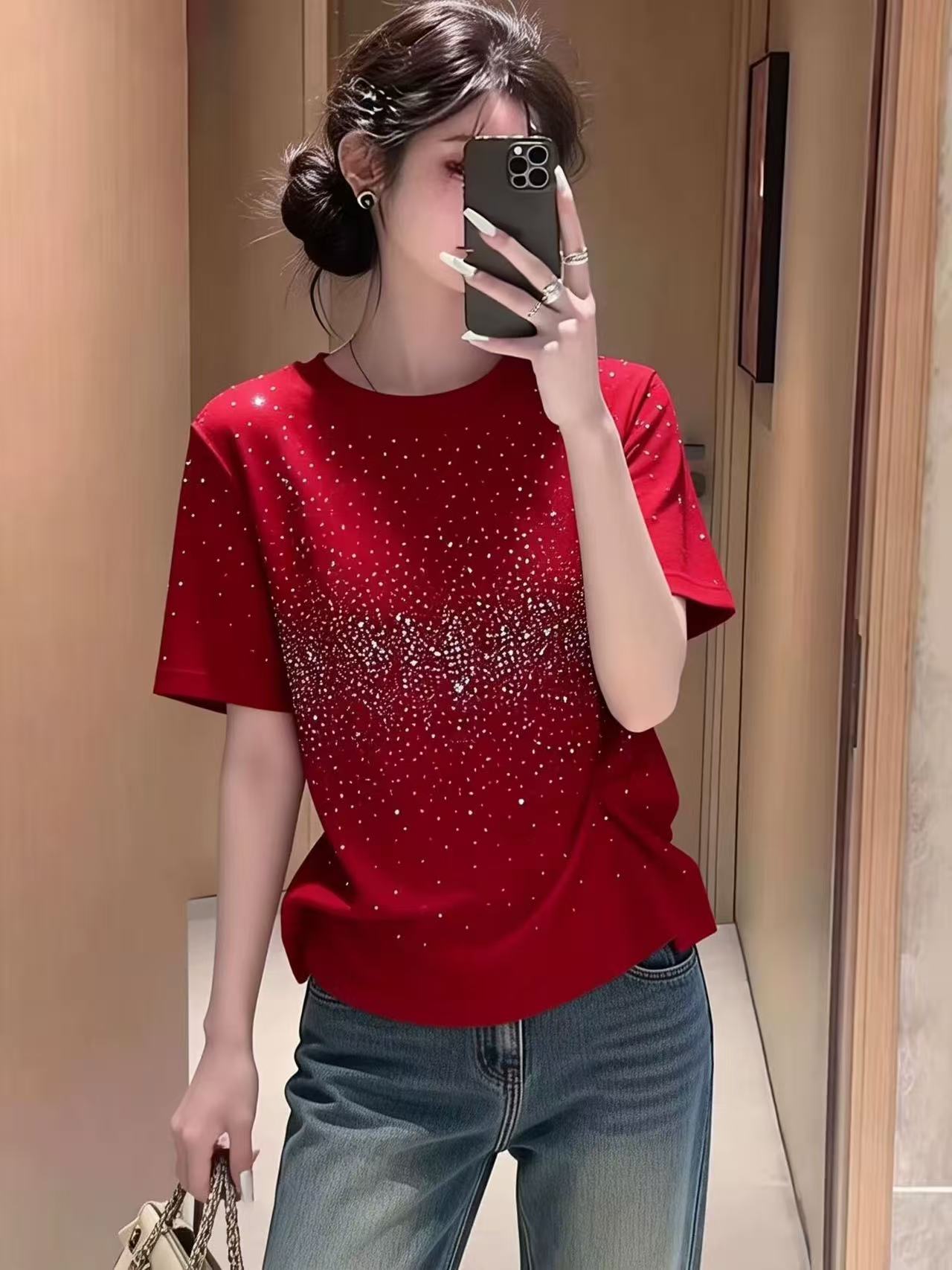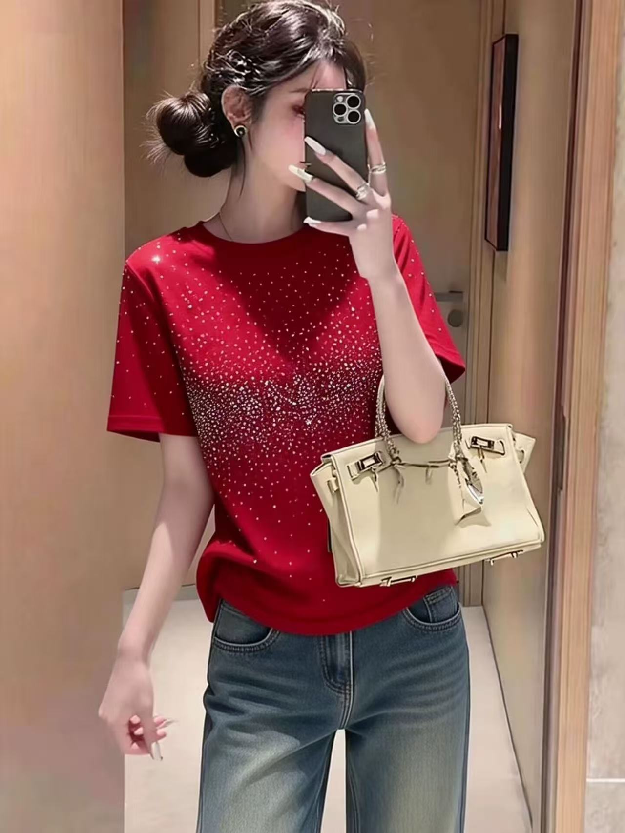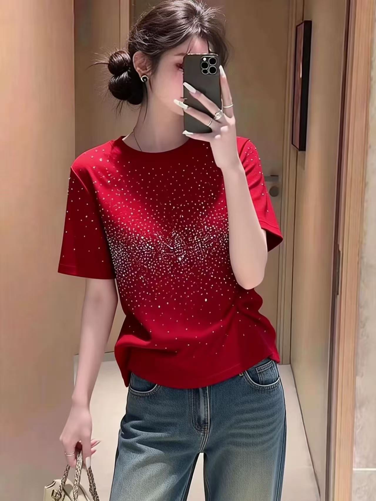 RY699# 2026春季新款时尚简约烫钻满天星短袖T恤女宽松显瘦百搭圆领上衣