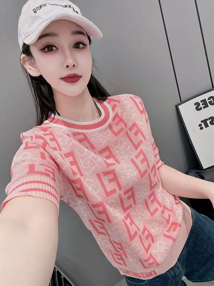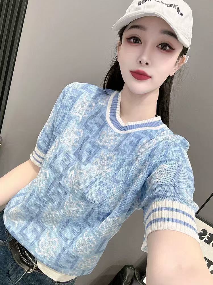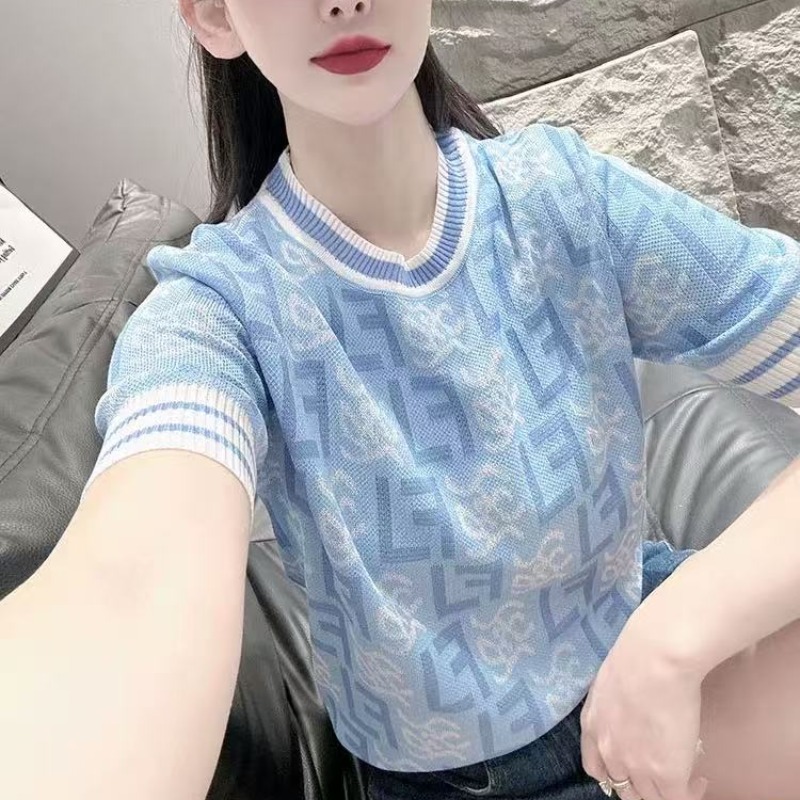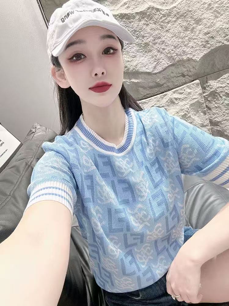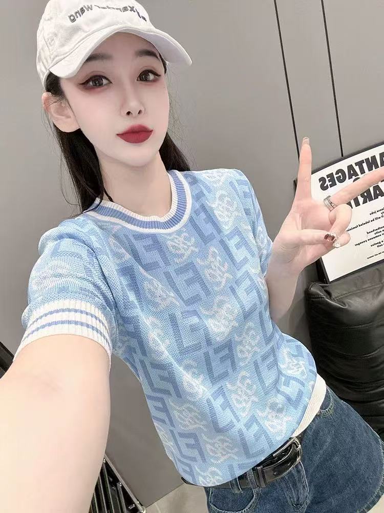 RY700# 2026夏季新款高级圆领短袖t恤女宽松冰丝针织打底衫正肩别致上衣