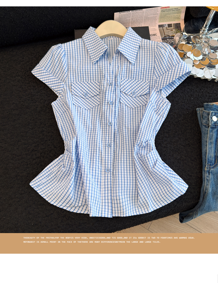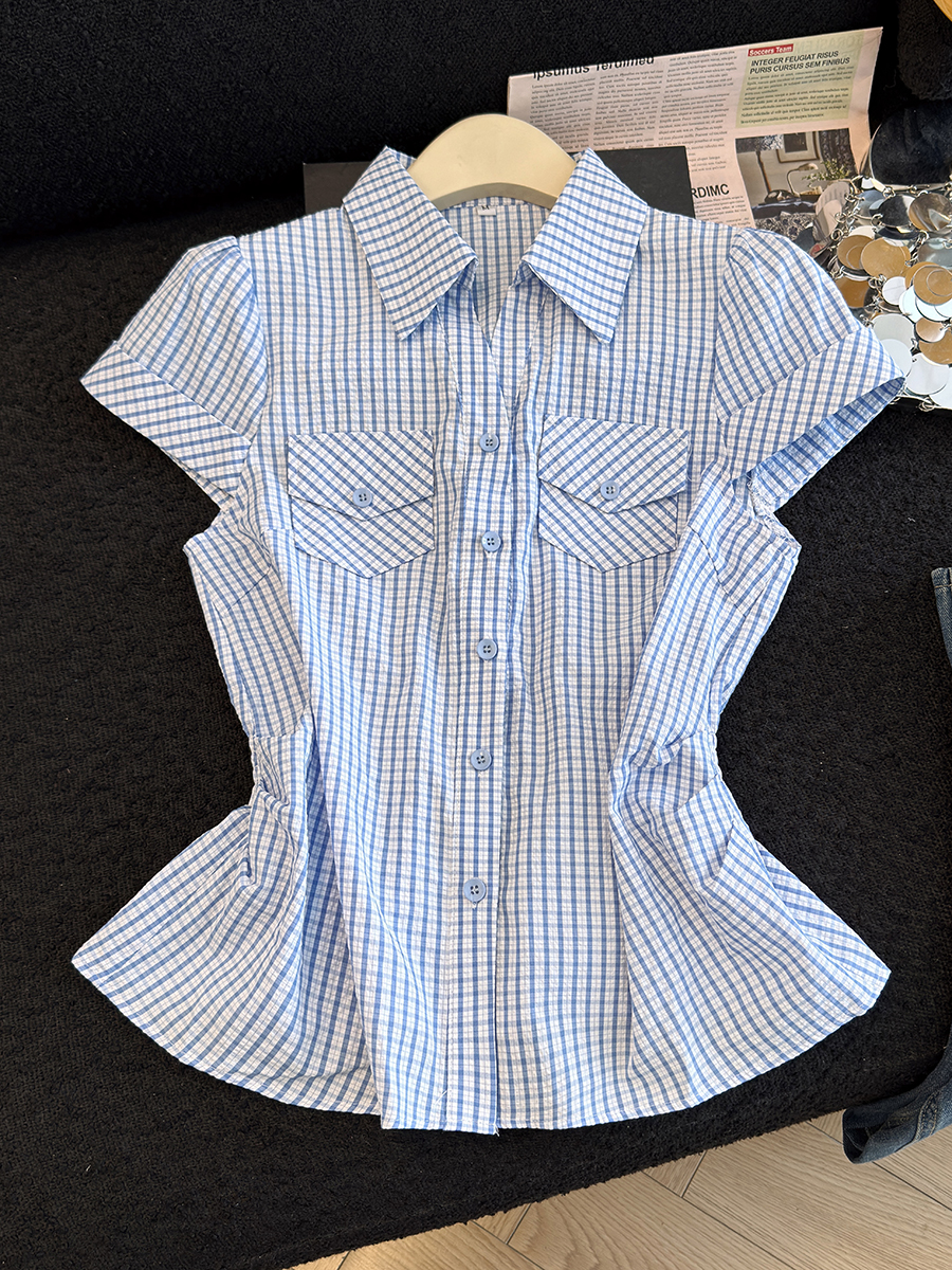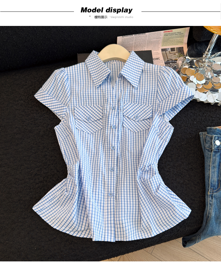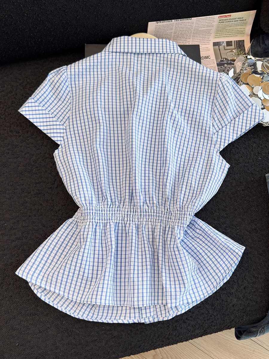 RY707# 2026夏季新款时尚洋气格子短袖衬衫女设计感收腰显瘦减龄韩系上衣