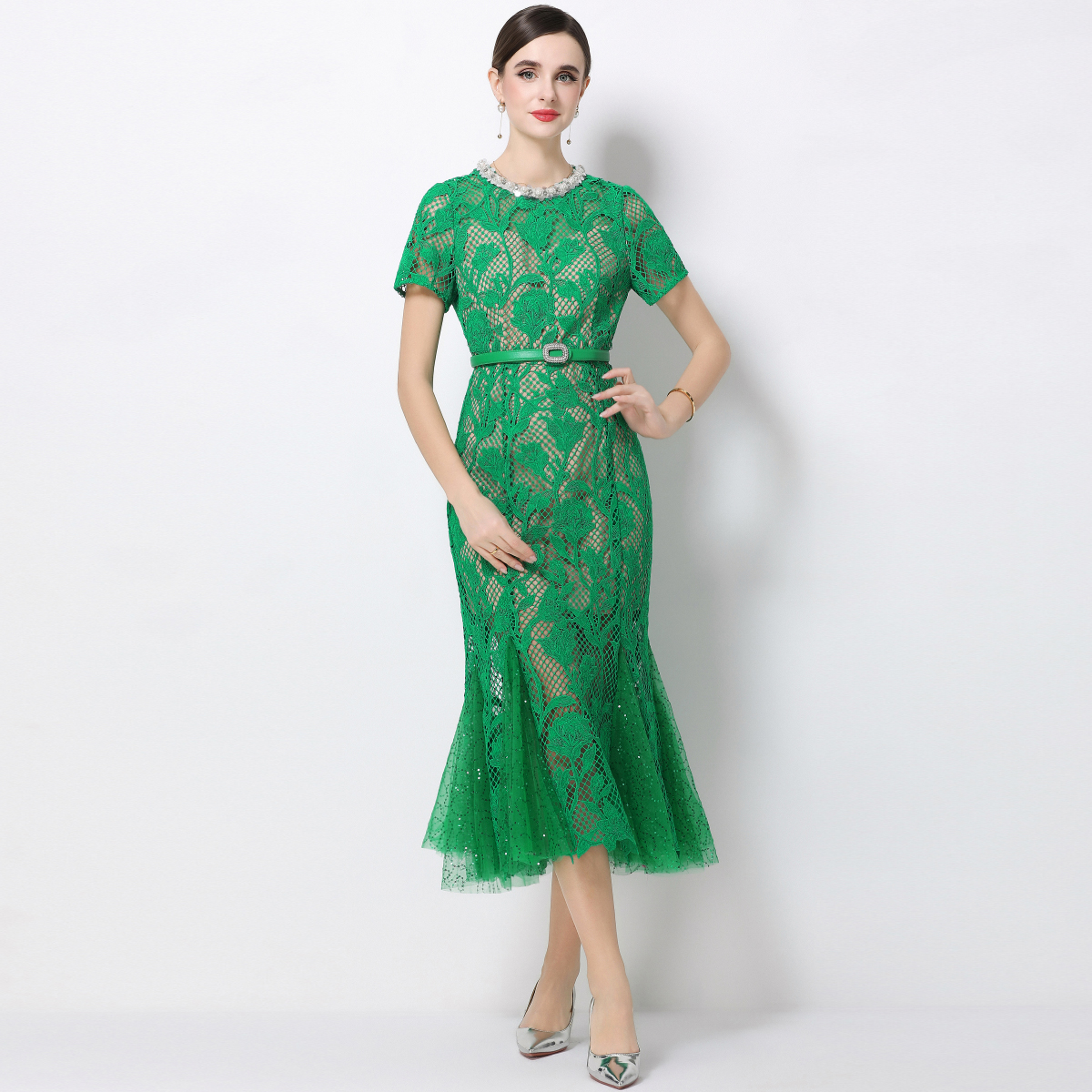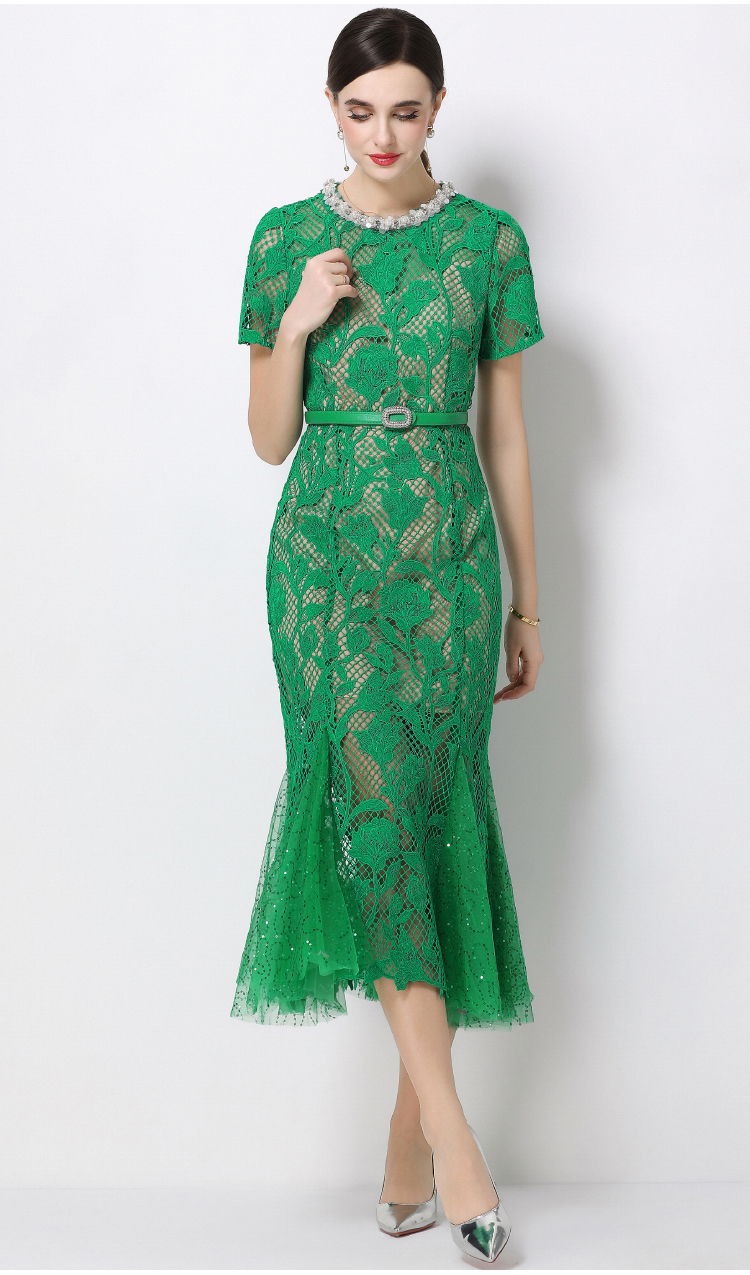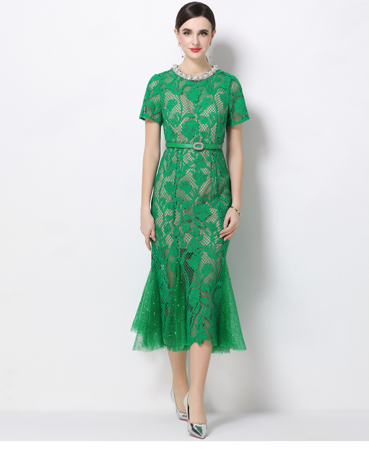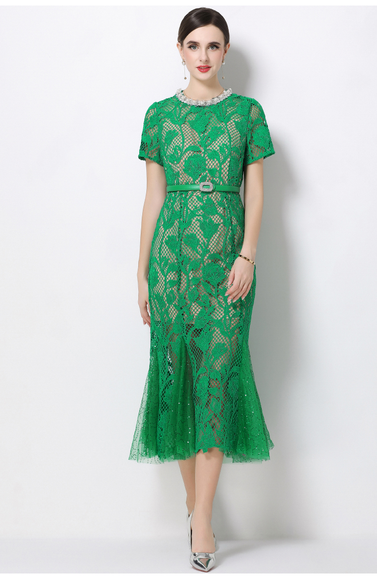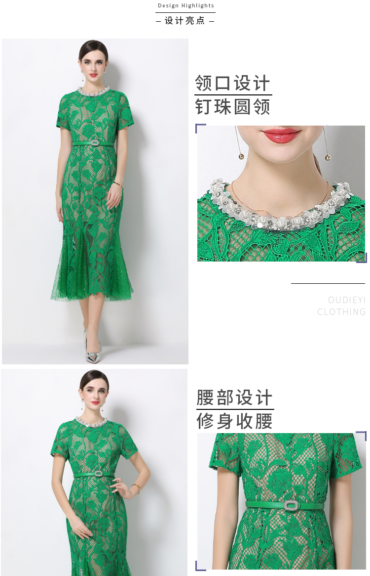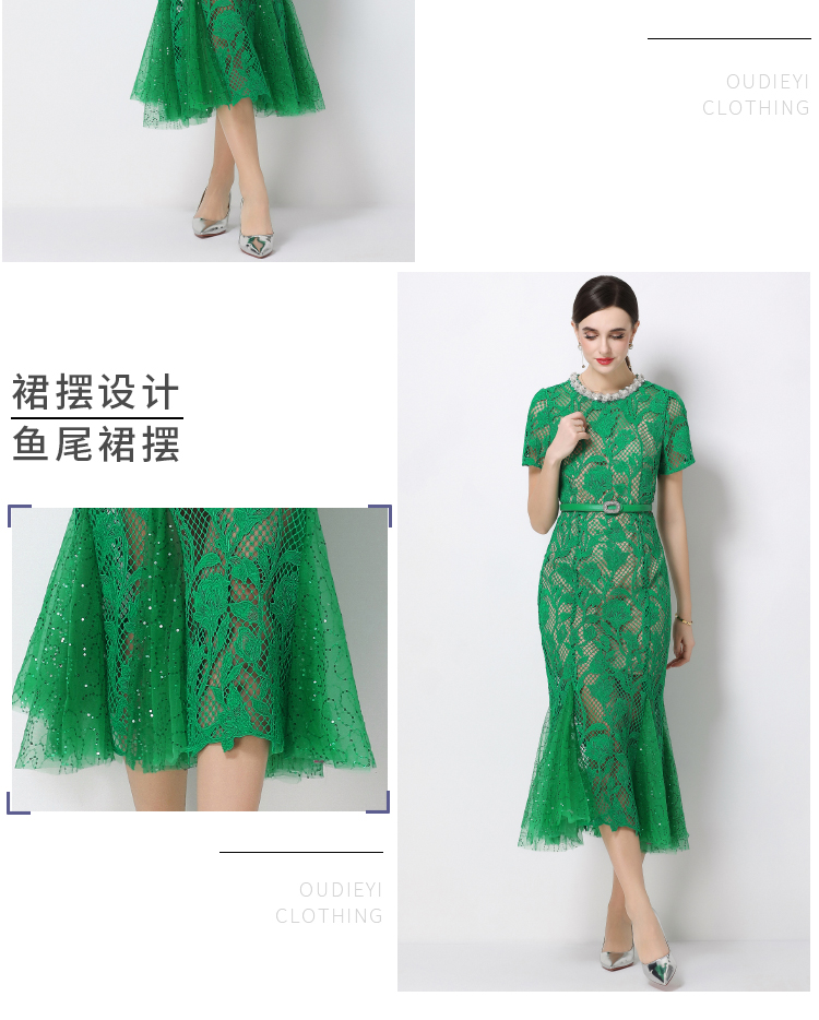 RY744# 实拍高级感重工钉珠蕾丝收腰显瘦镂空短袖鱼尾裙连衣裙配腰带