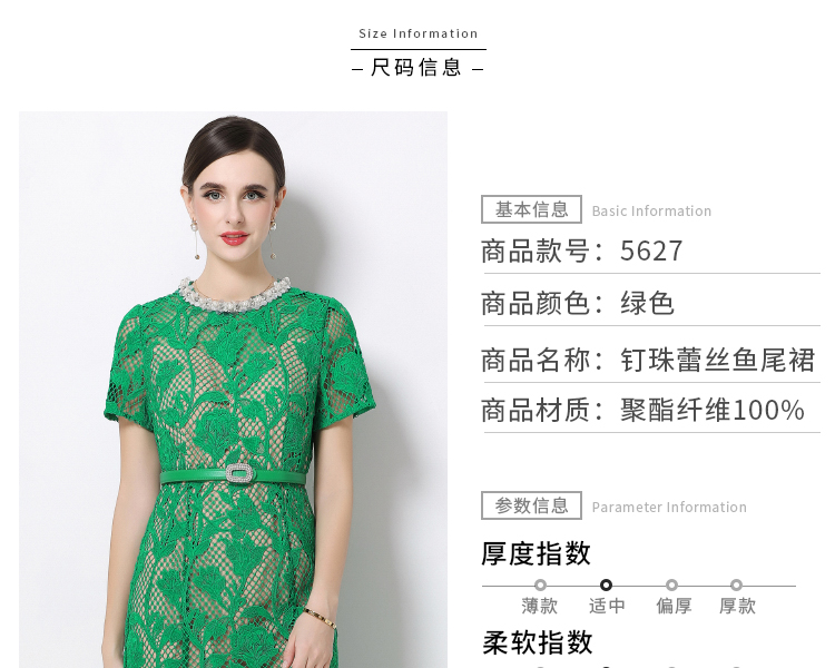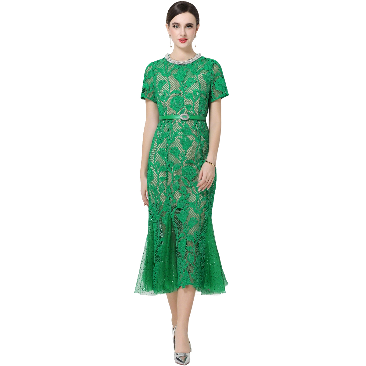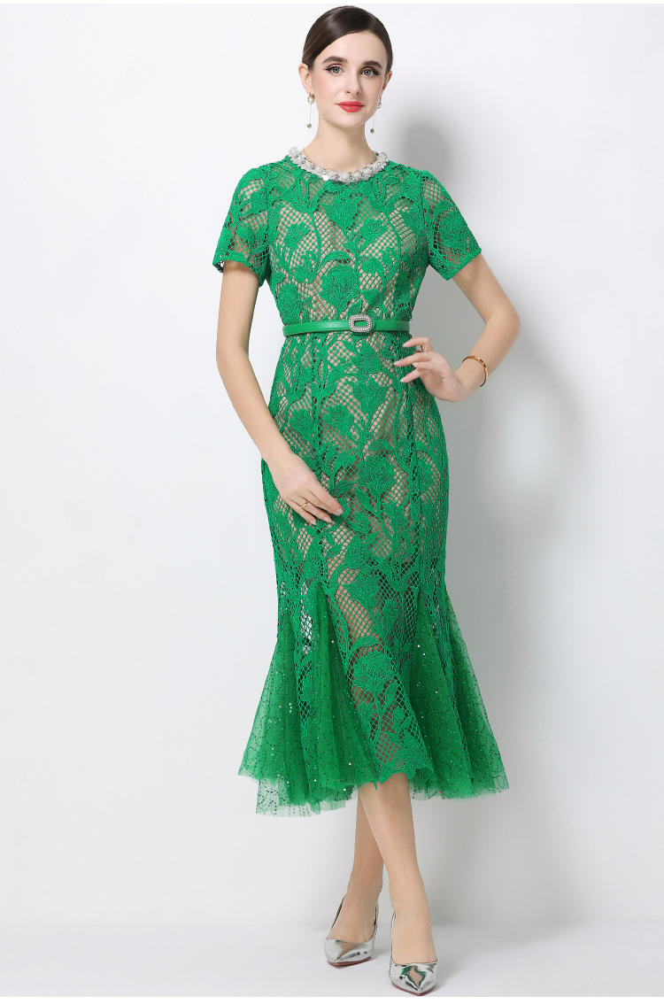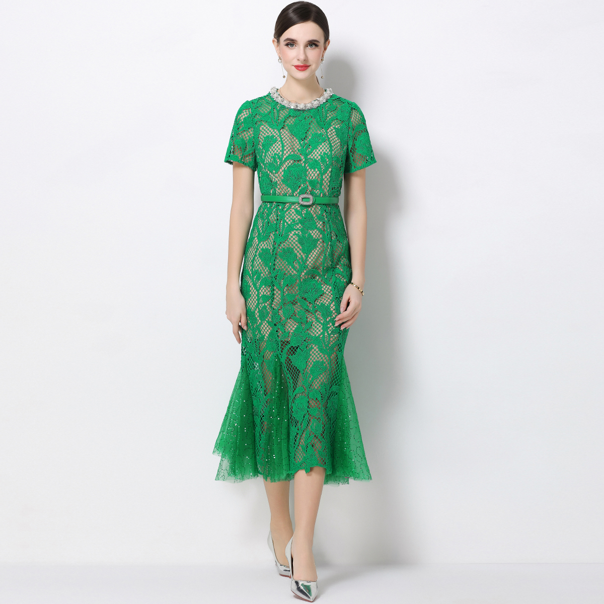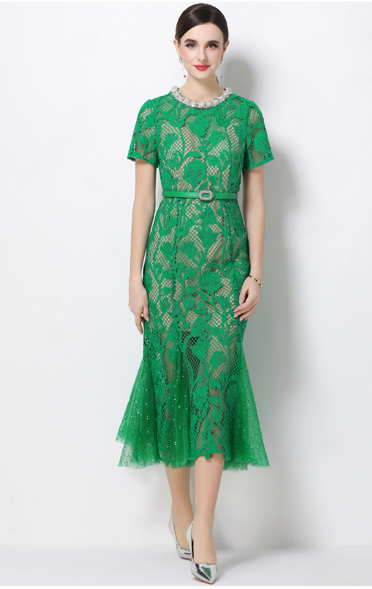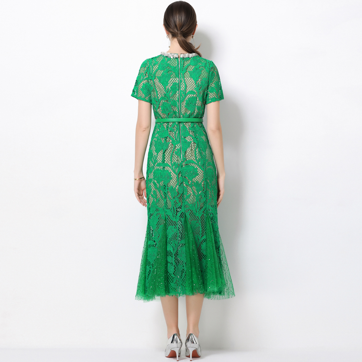 RY744# 实拍高级感重工钉珠蕾丝收腰显瘦镂空短袖鱼尾裙连衣裙配腰带