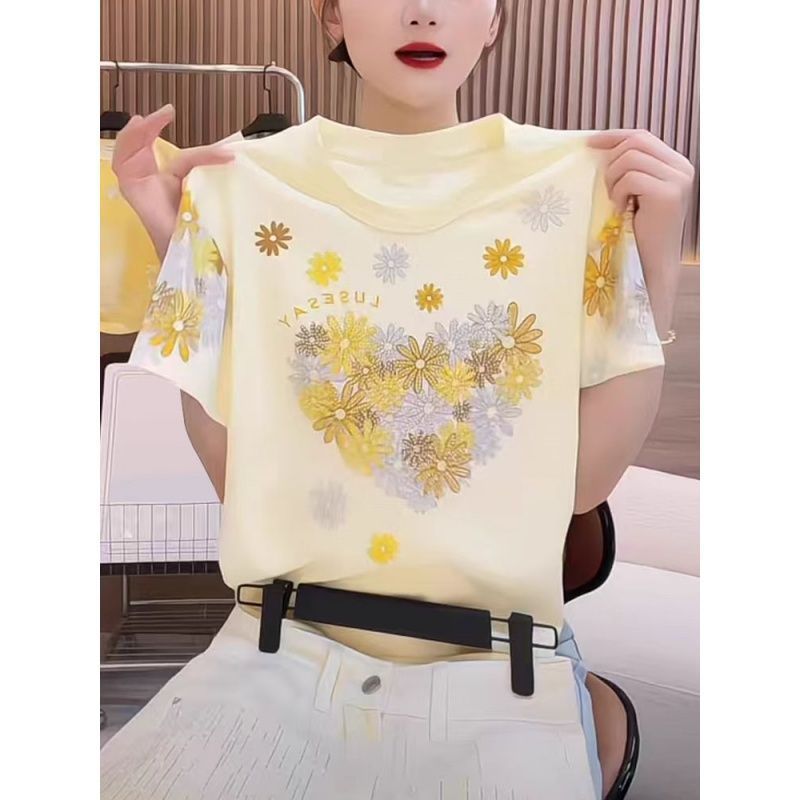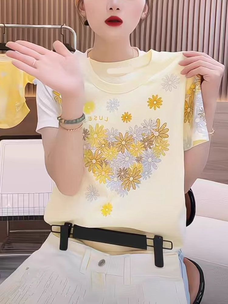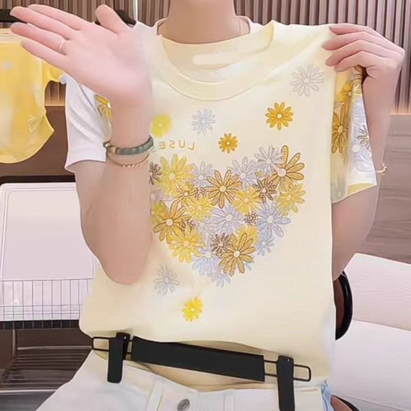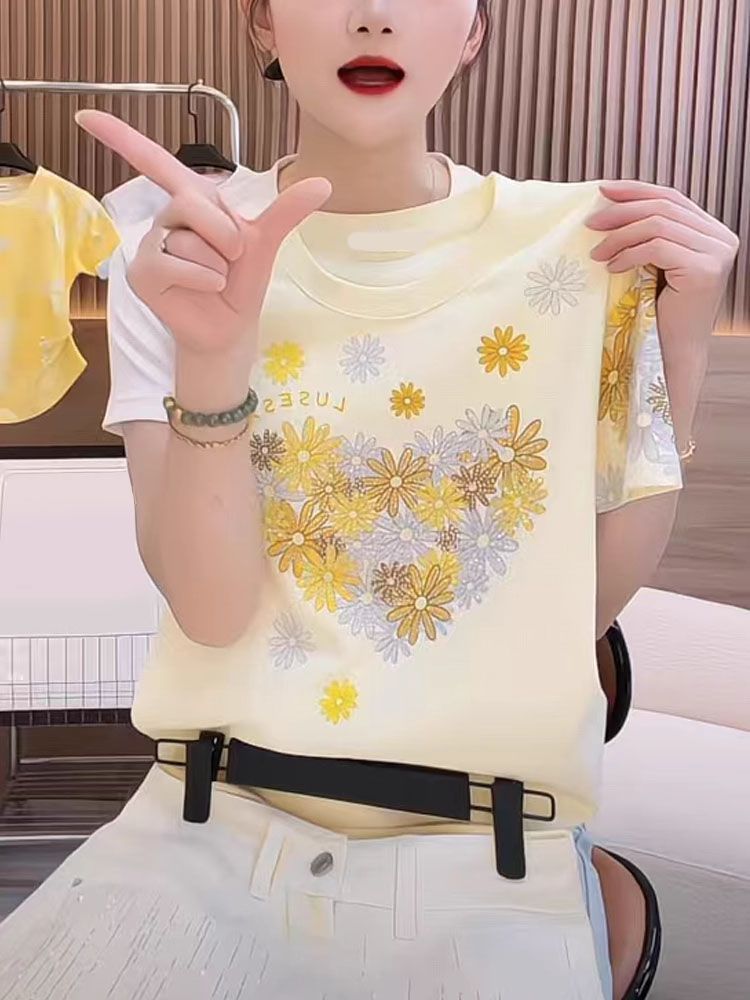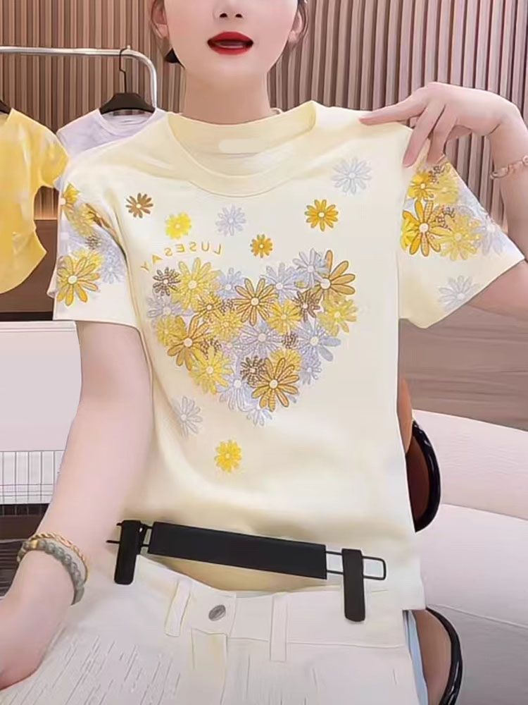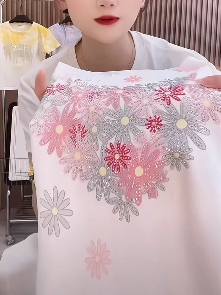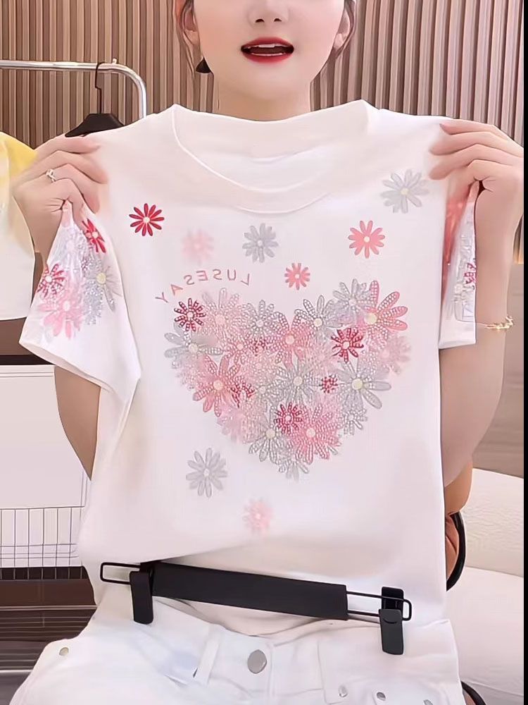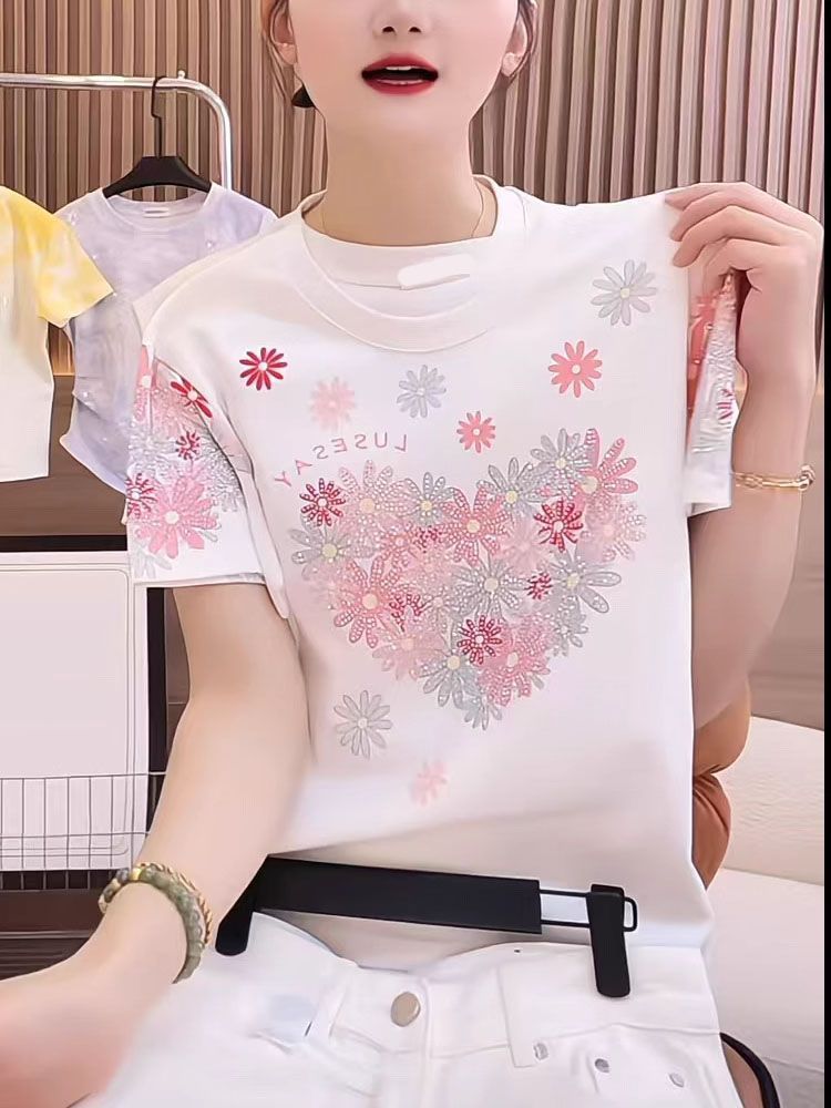 RY1121# ~爆款2026年夏季新款印花+烫钻 220克纯棉 螺纹领+包边