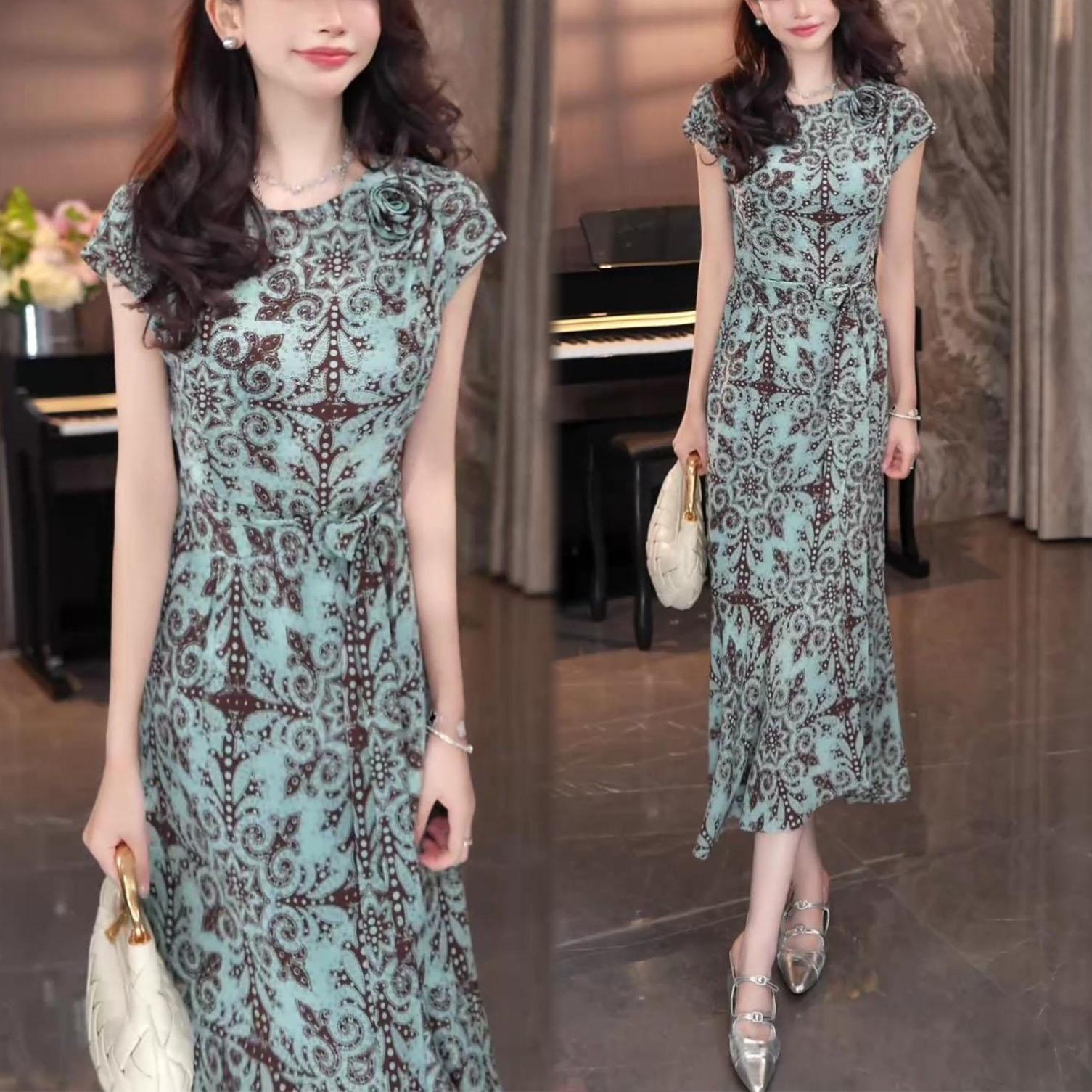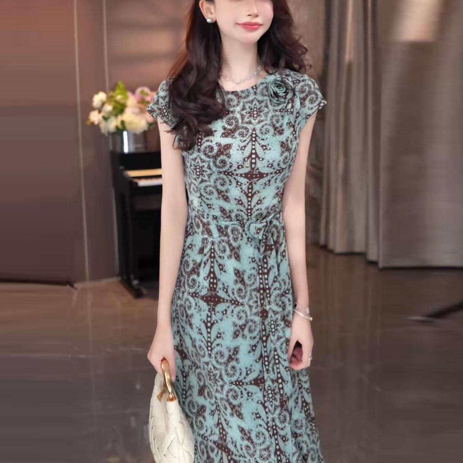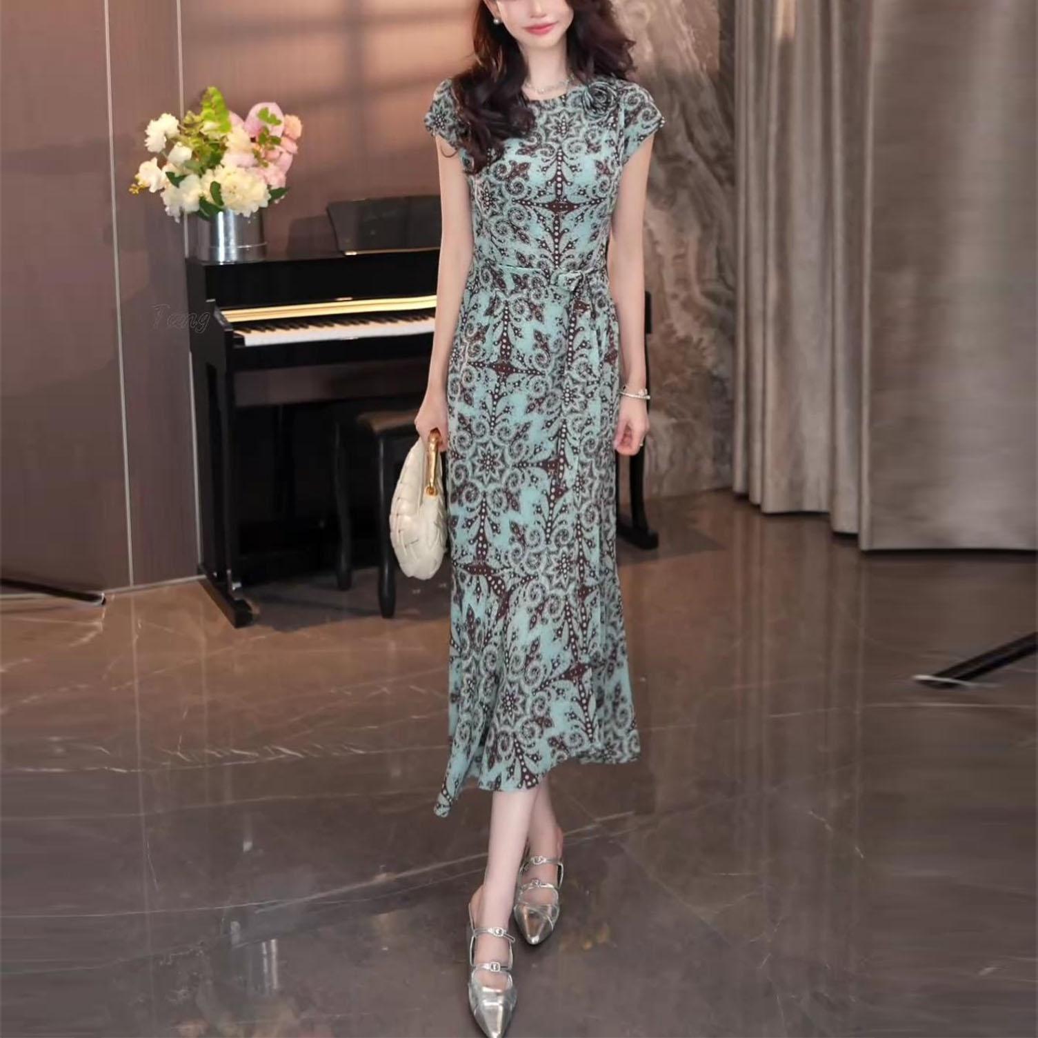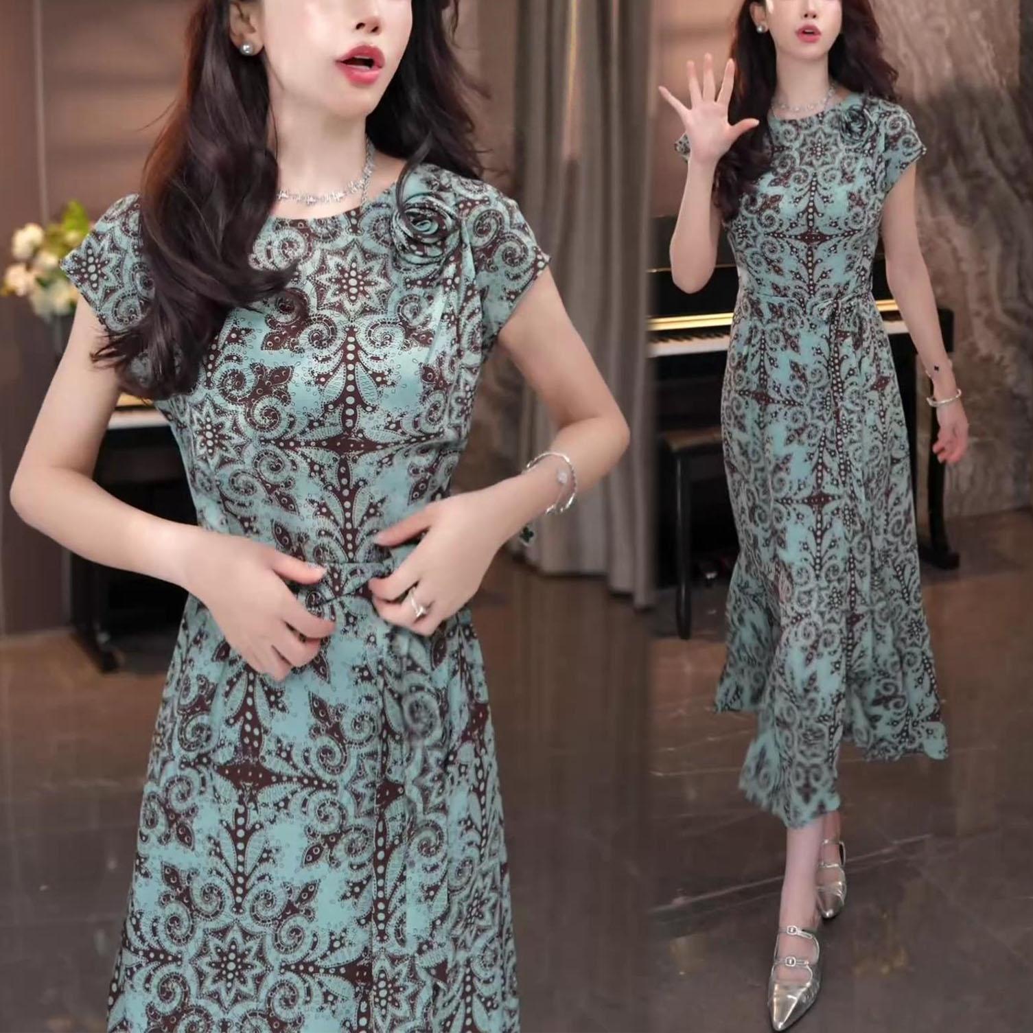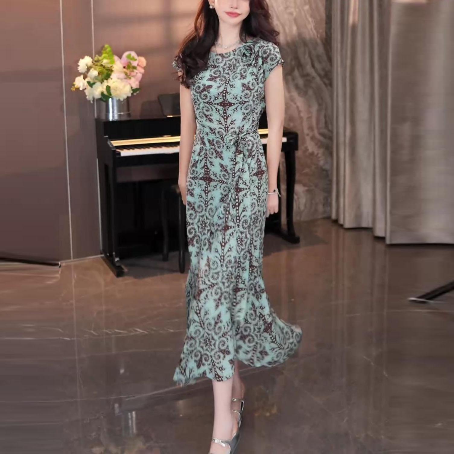 RY1684# 时尚短袖连衣裙女2026年夏季新款气质显瘦系带中长款印花休闲裙子