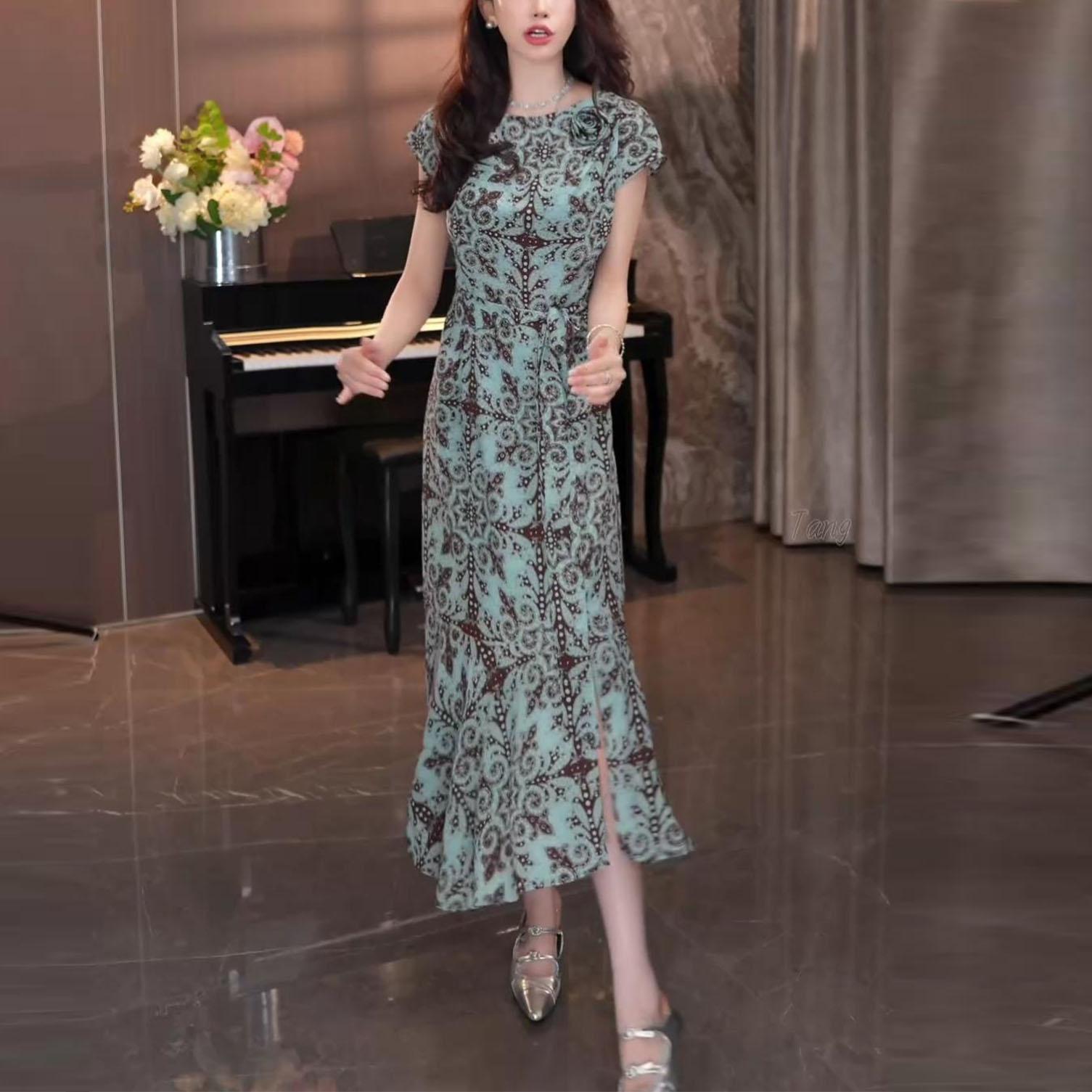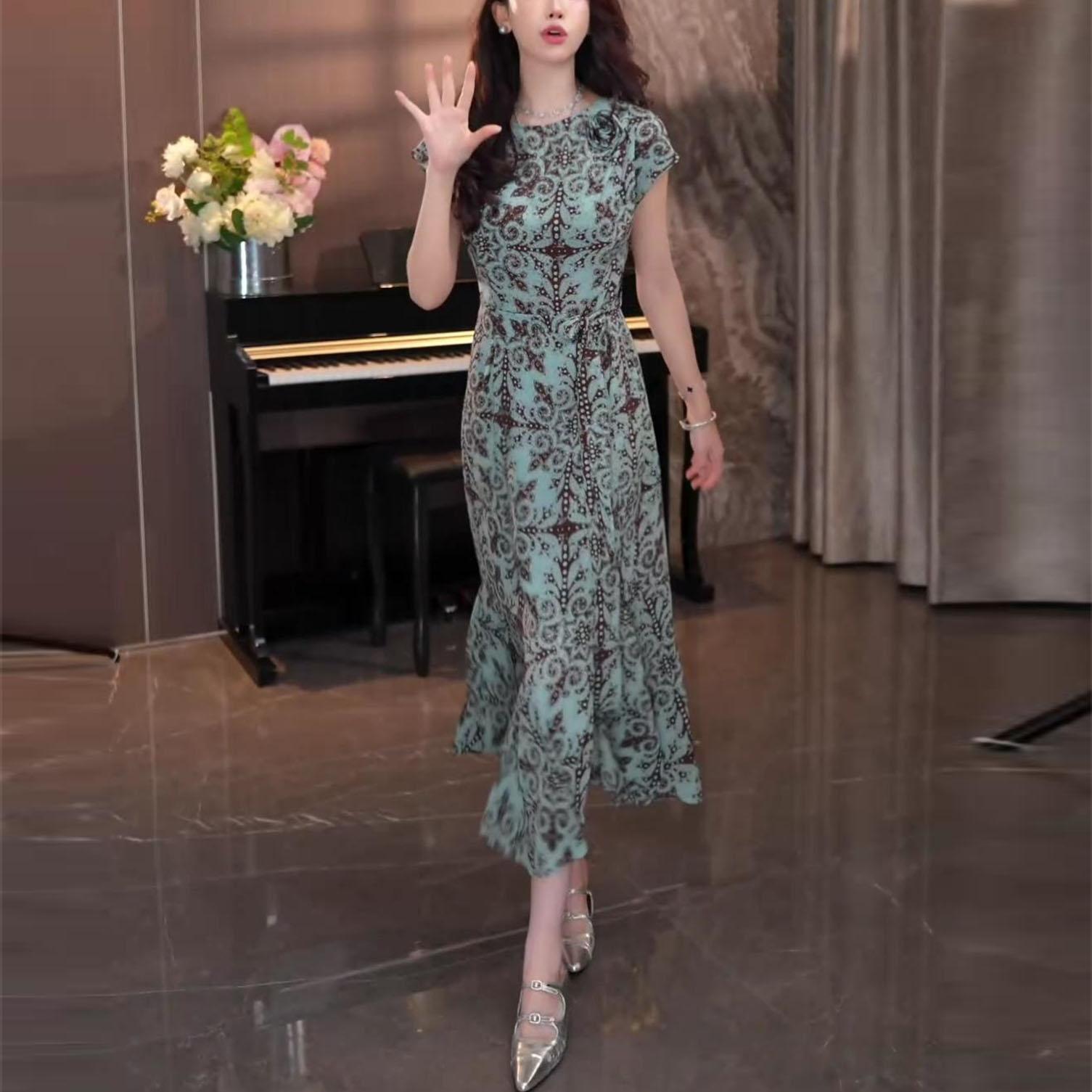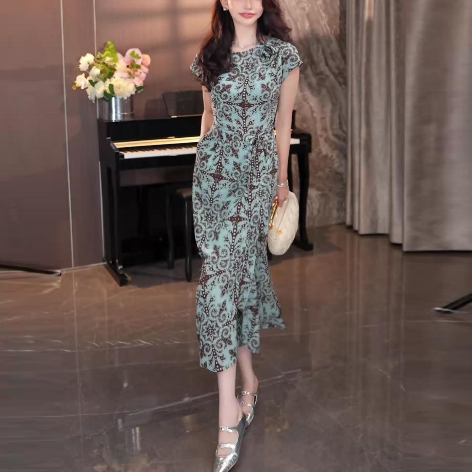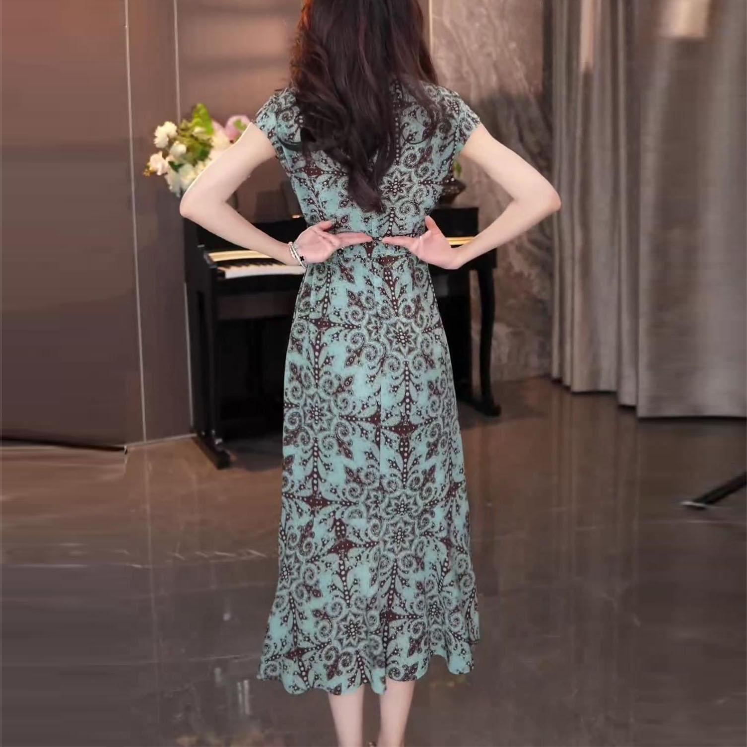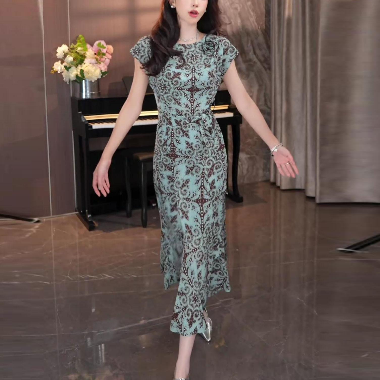 RY1684# 时尚短袖连衣裙女2026年夏季新款气质显瘦系带中长款印花休闲裙子