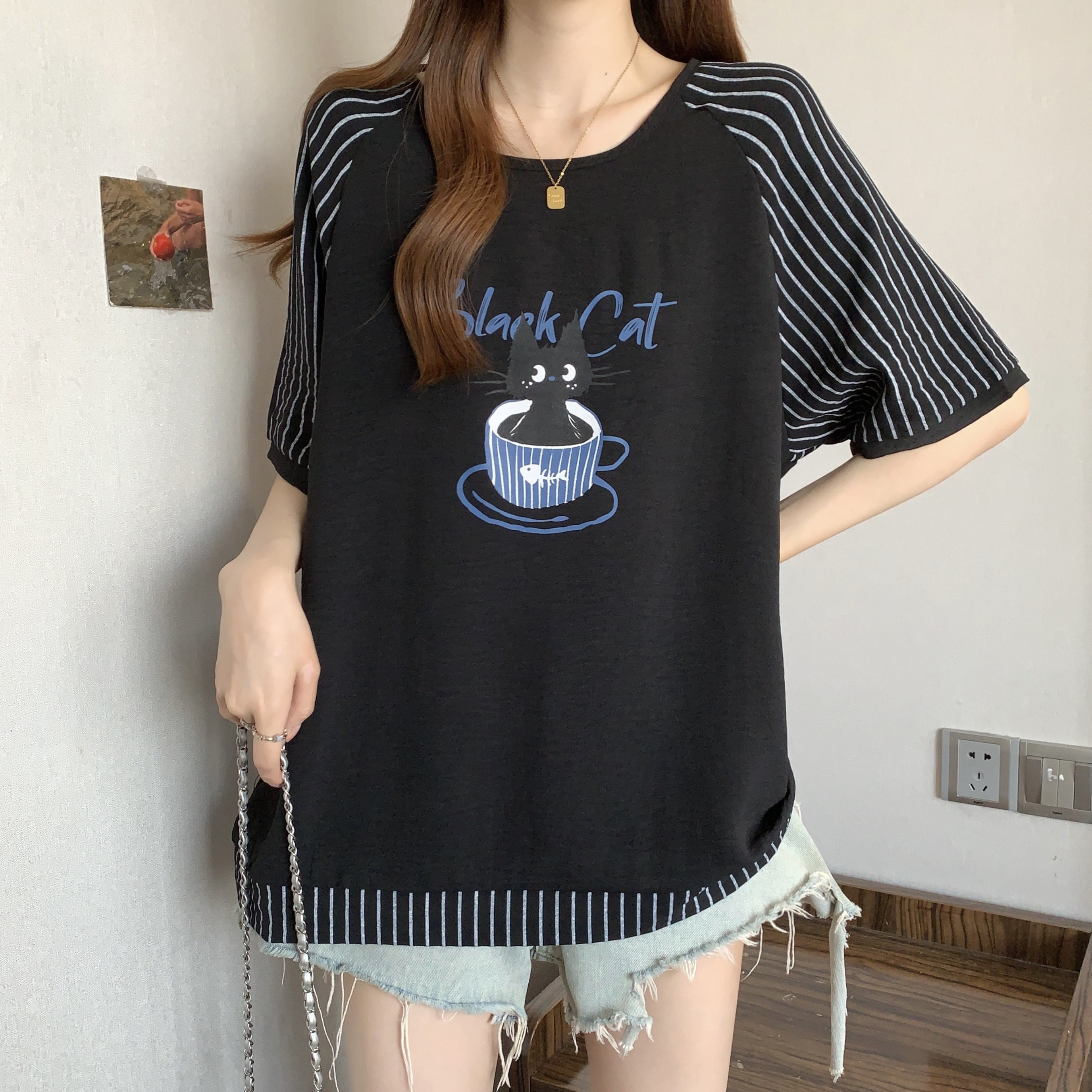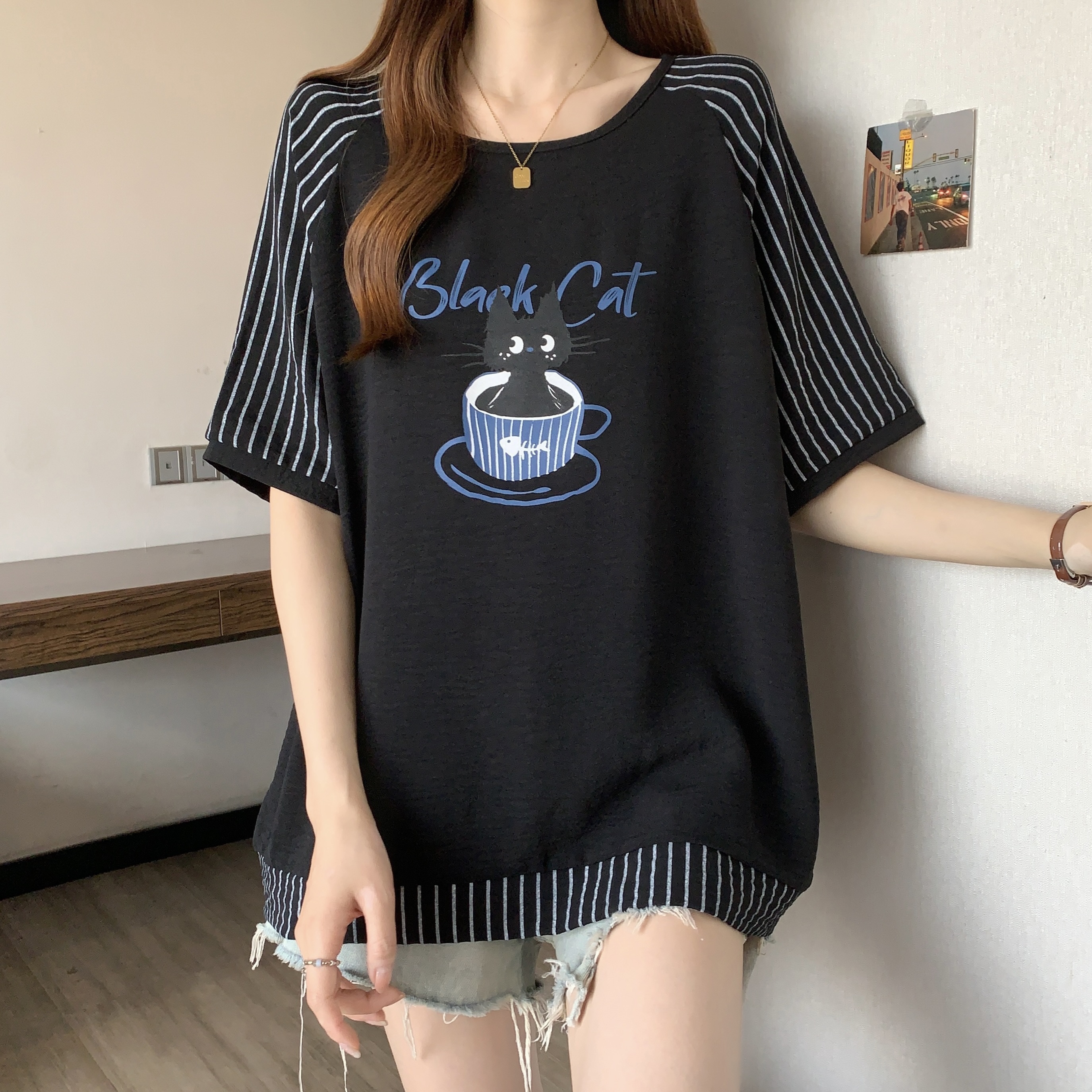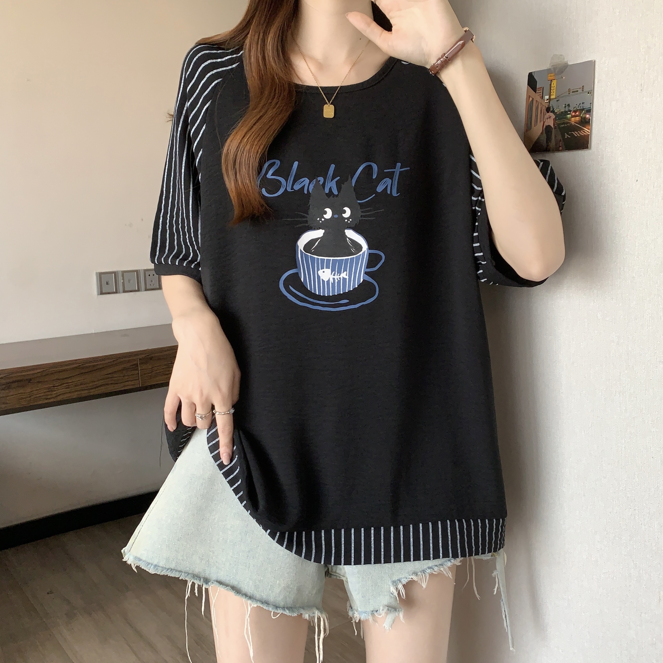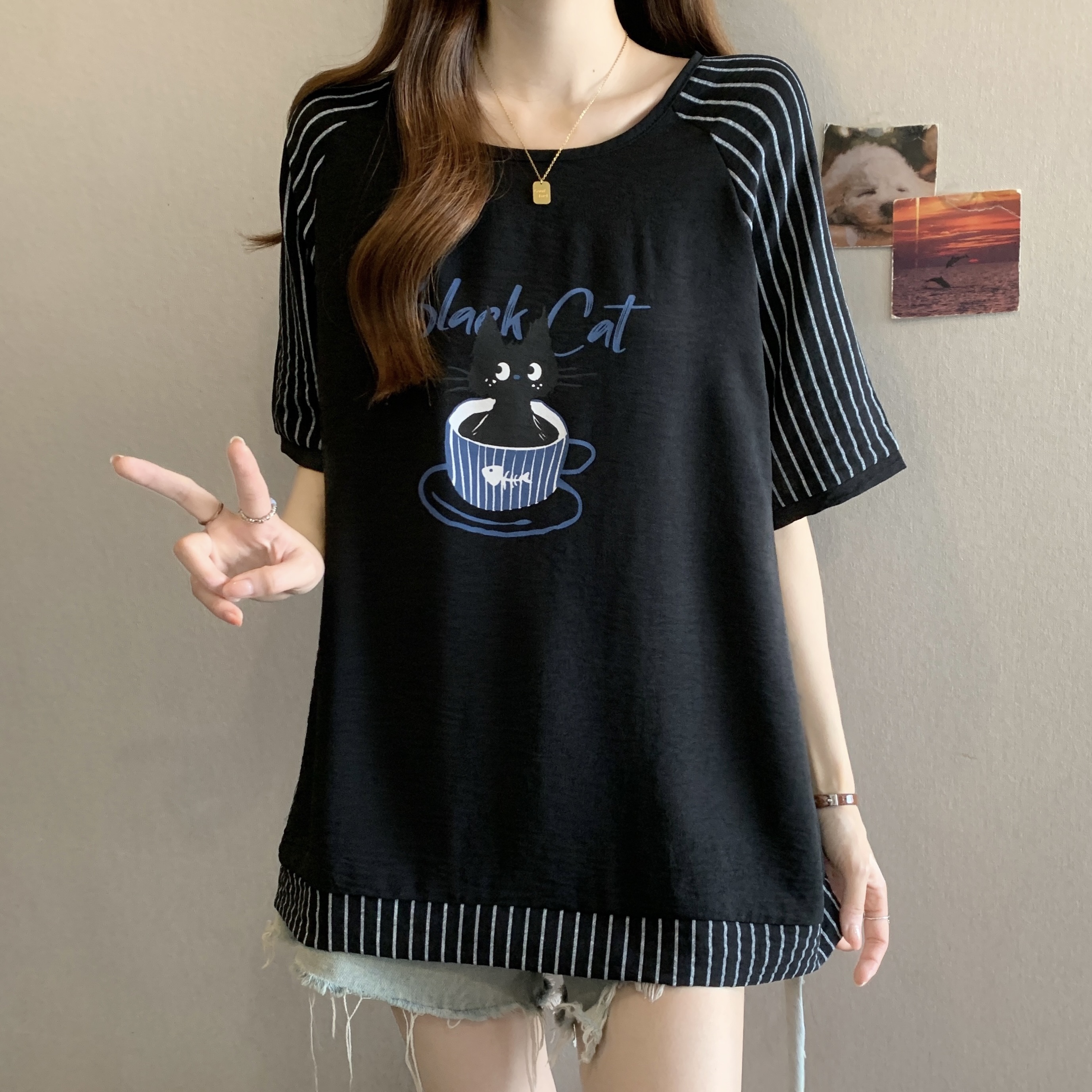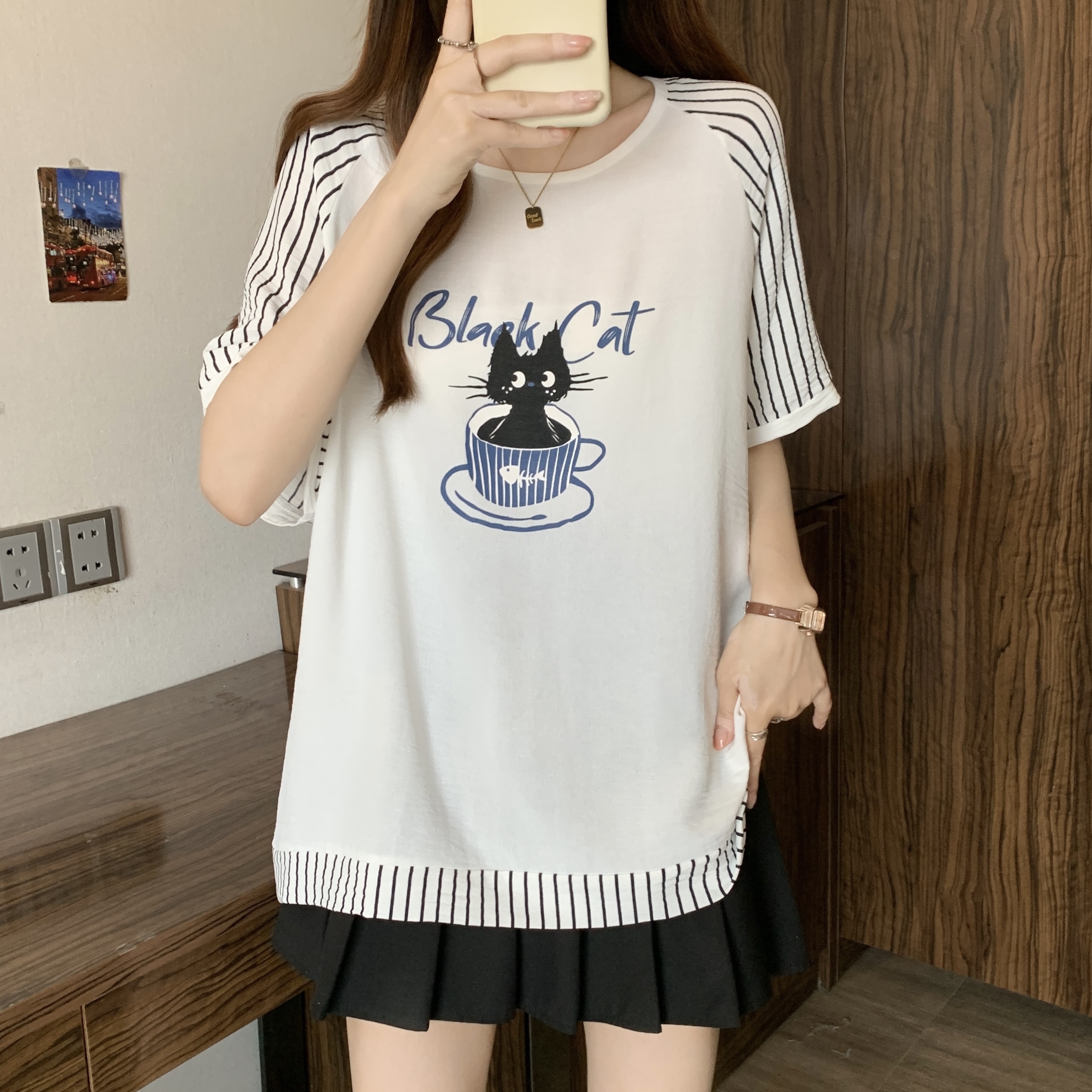 RY1692# 宽松大码撞色拼接短袖T恤女夏季爆款设计感胖mm圆领半袖上衣
