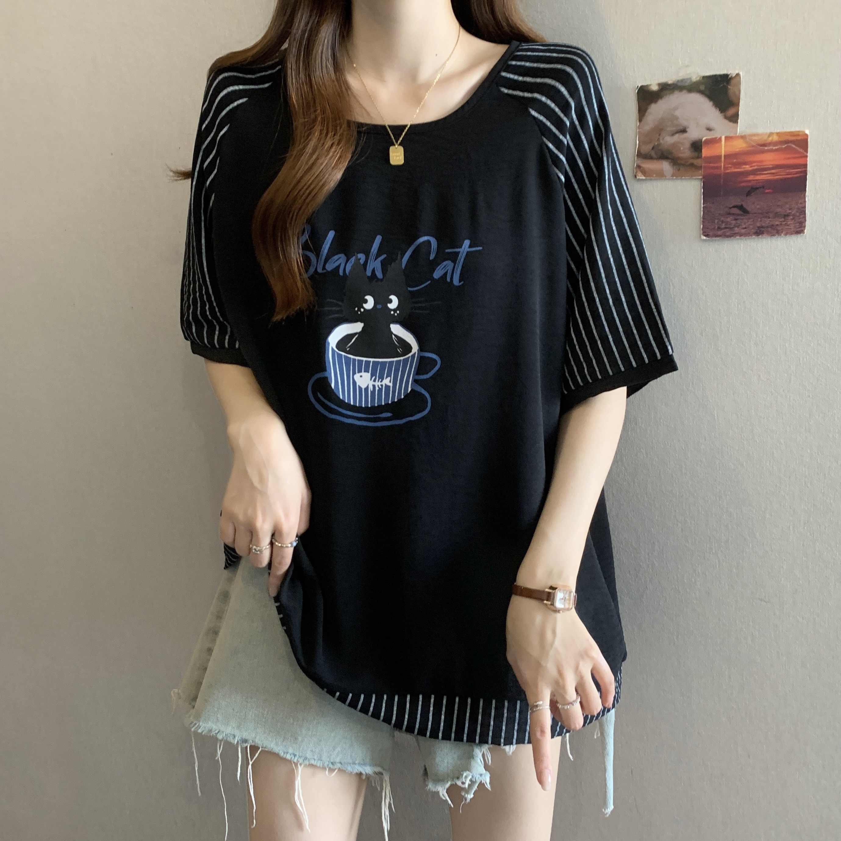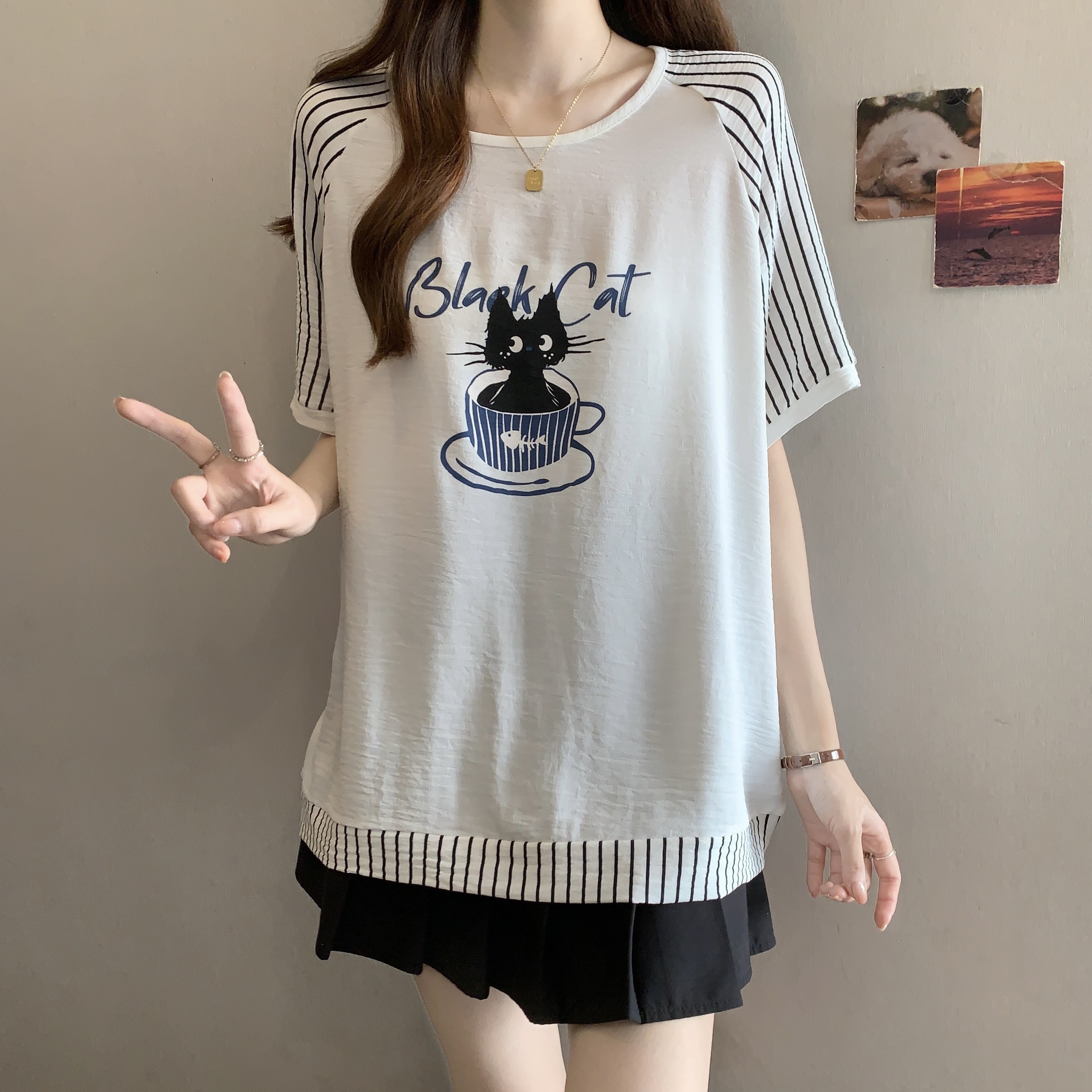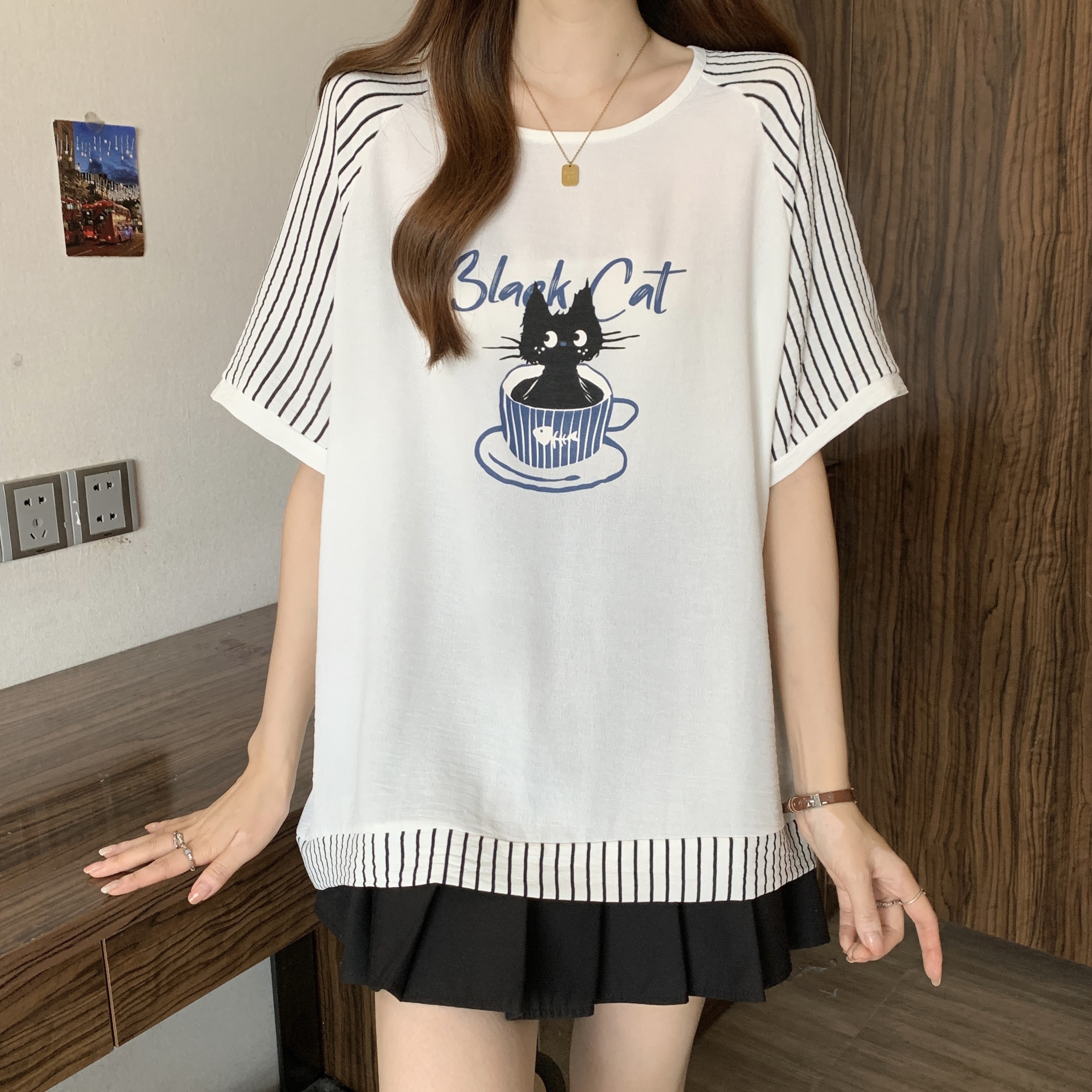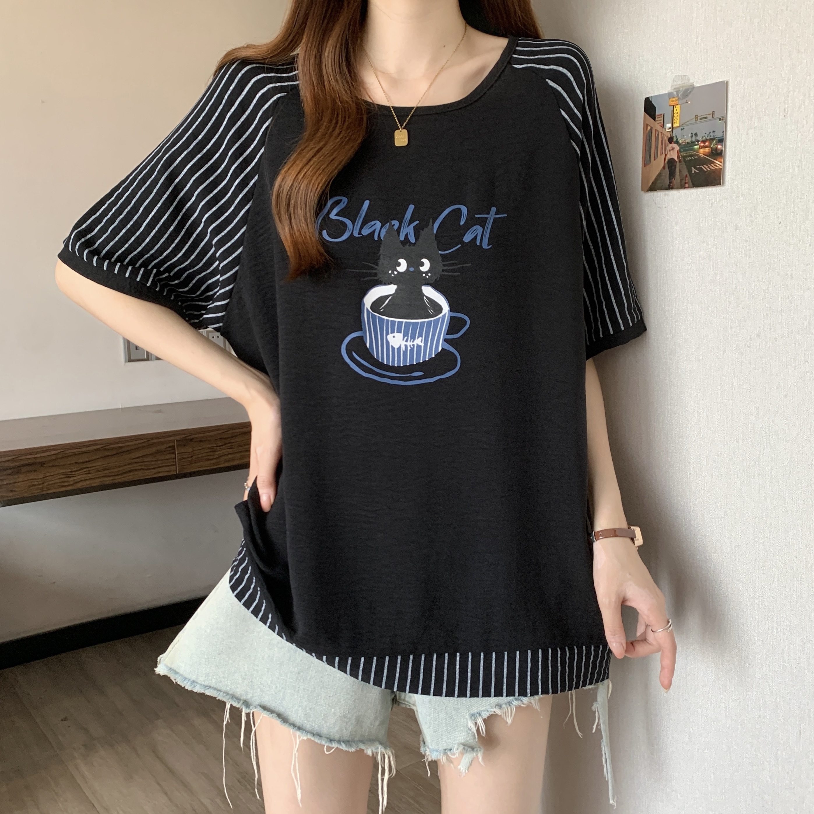 RY1692# 宽松大码撞色拼接短袖T恤女夏季爆款设计感胖mm圆领半袖上衣
