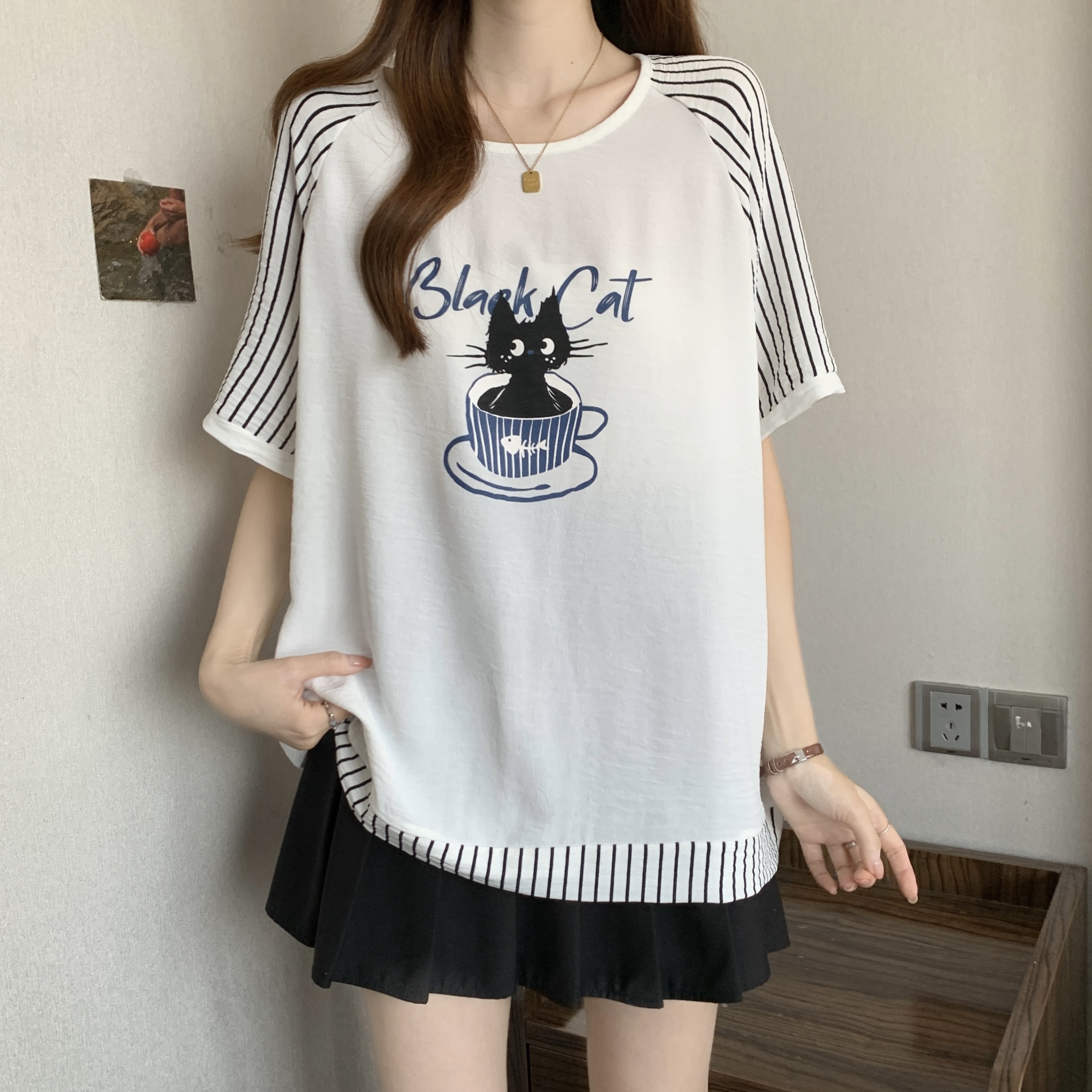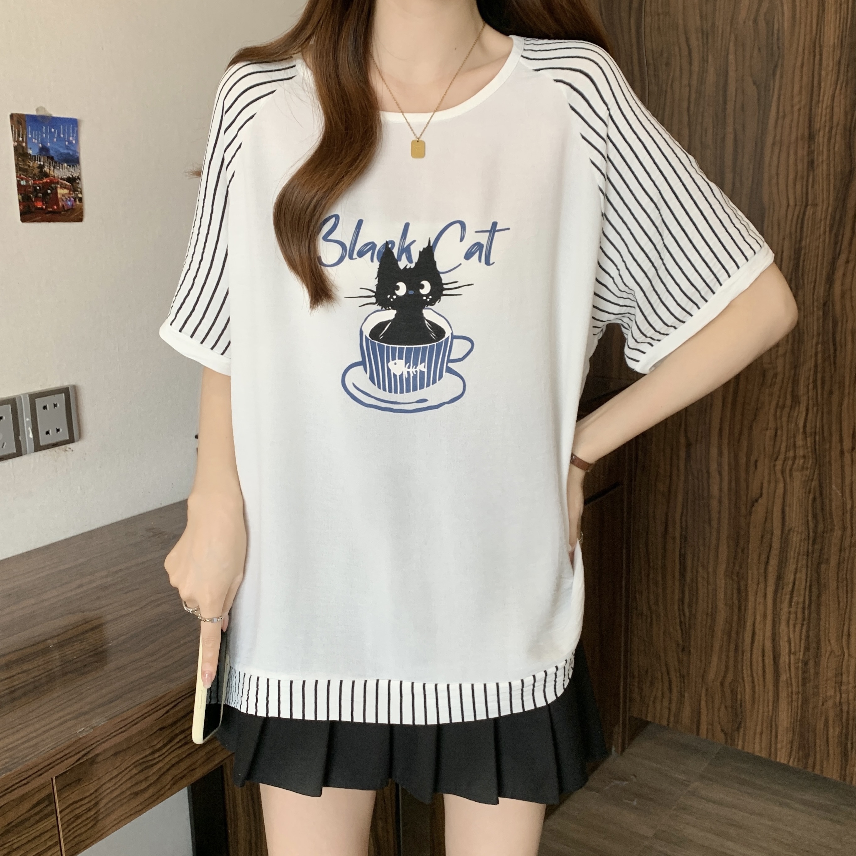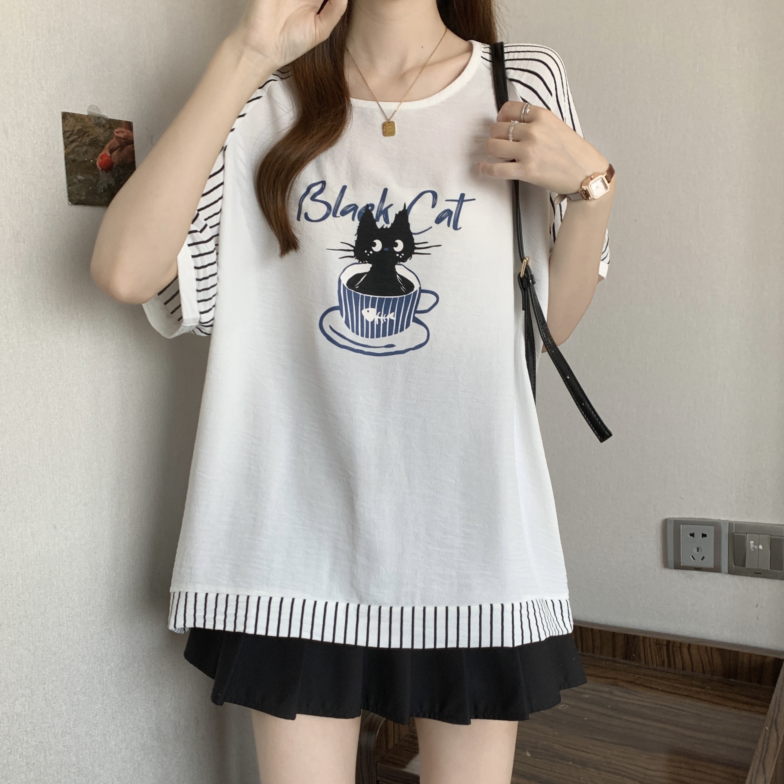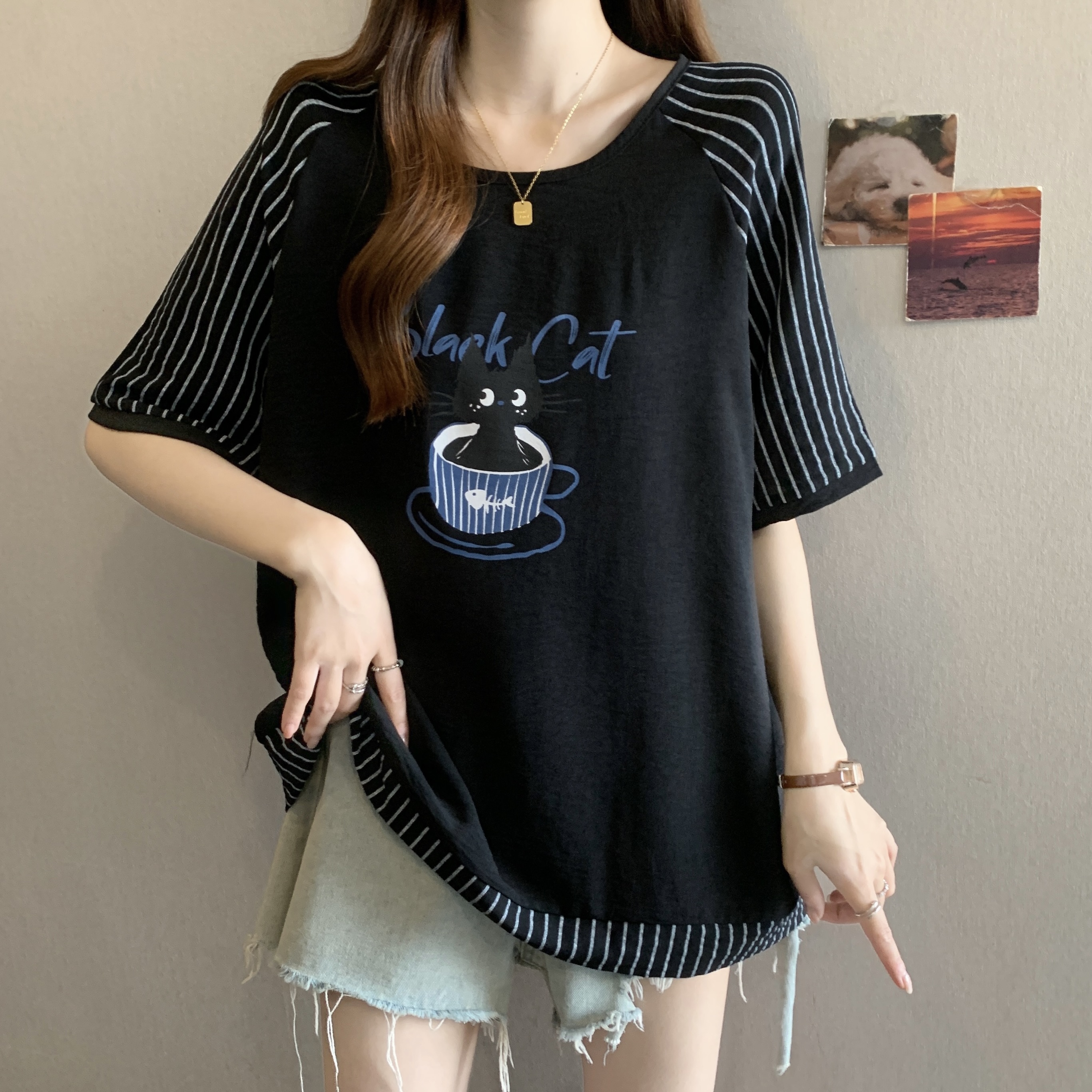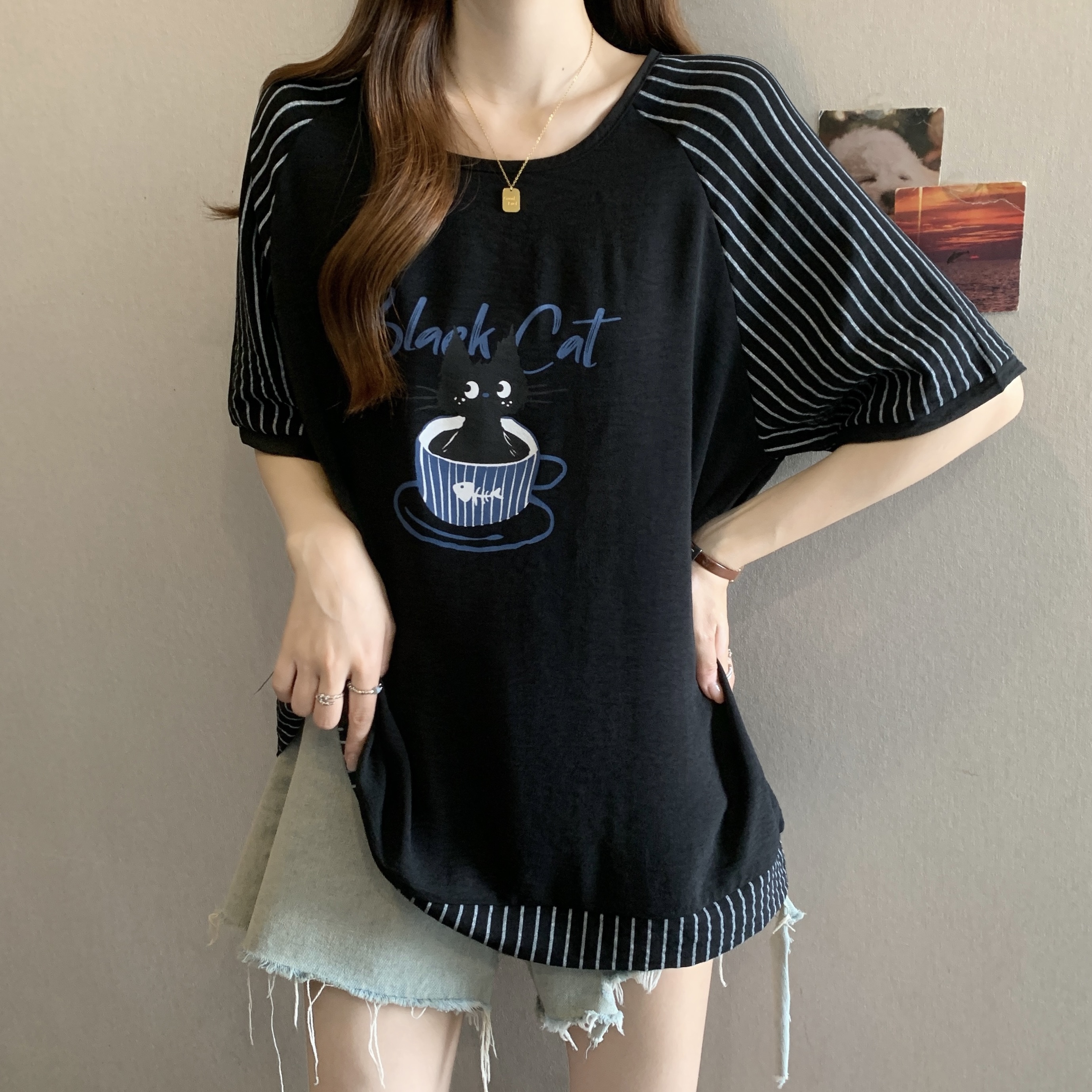 RY1692# 宽松大码撞色拼接短袖T恤女夏季爆款设计感胖mm圆领半袖上衣