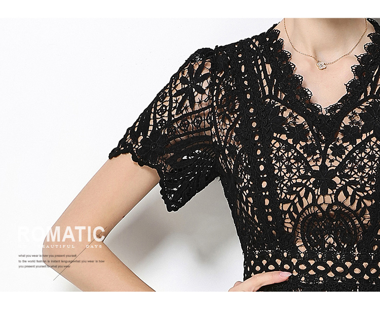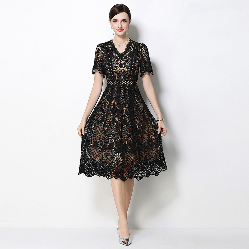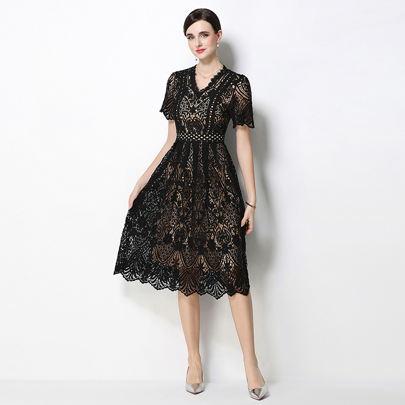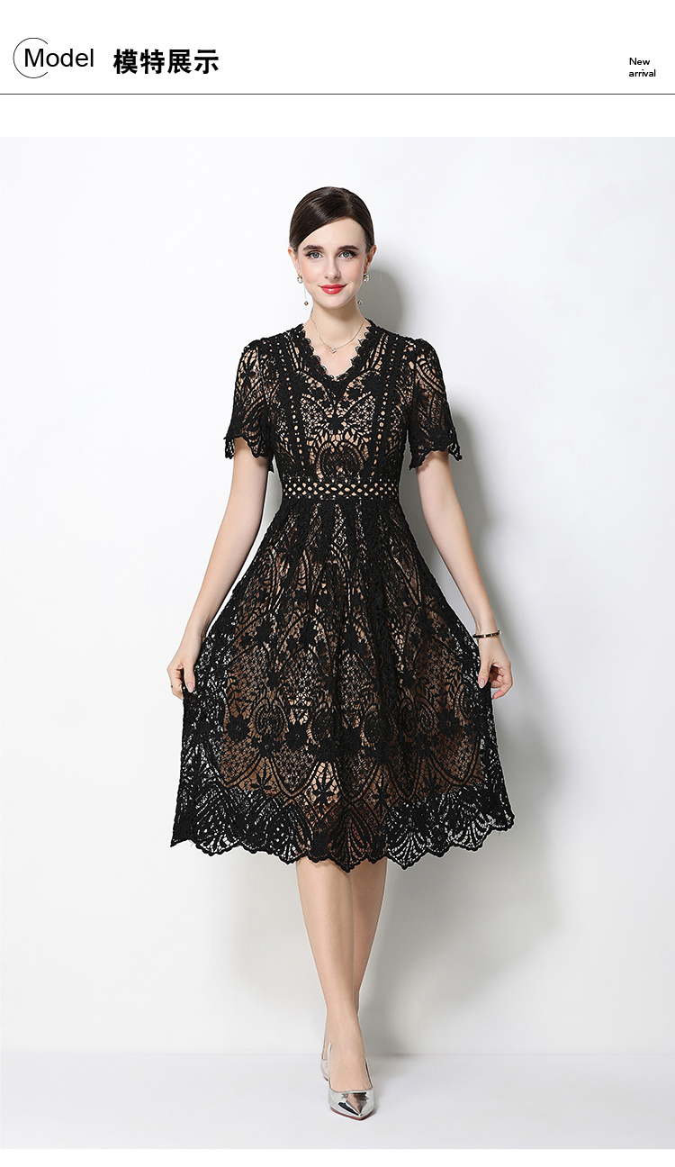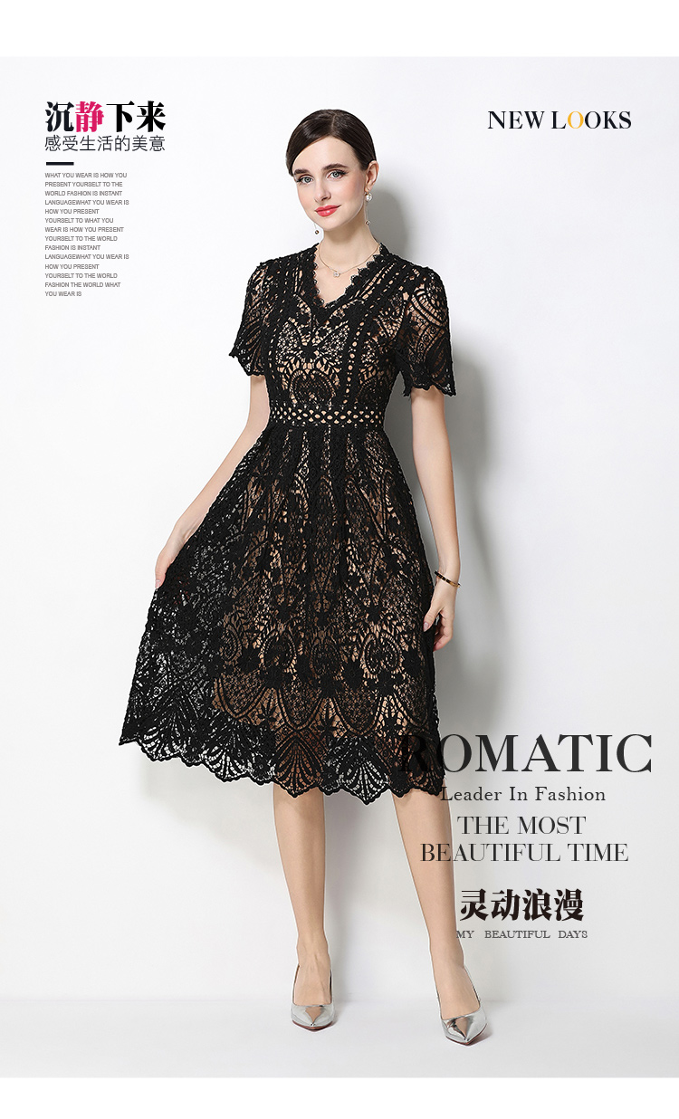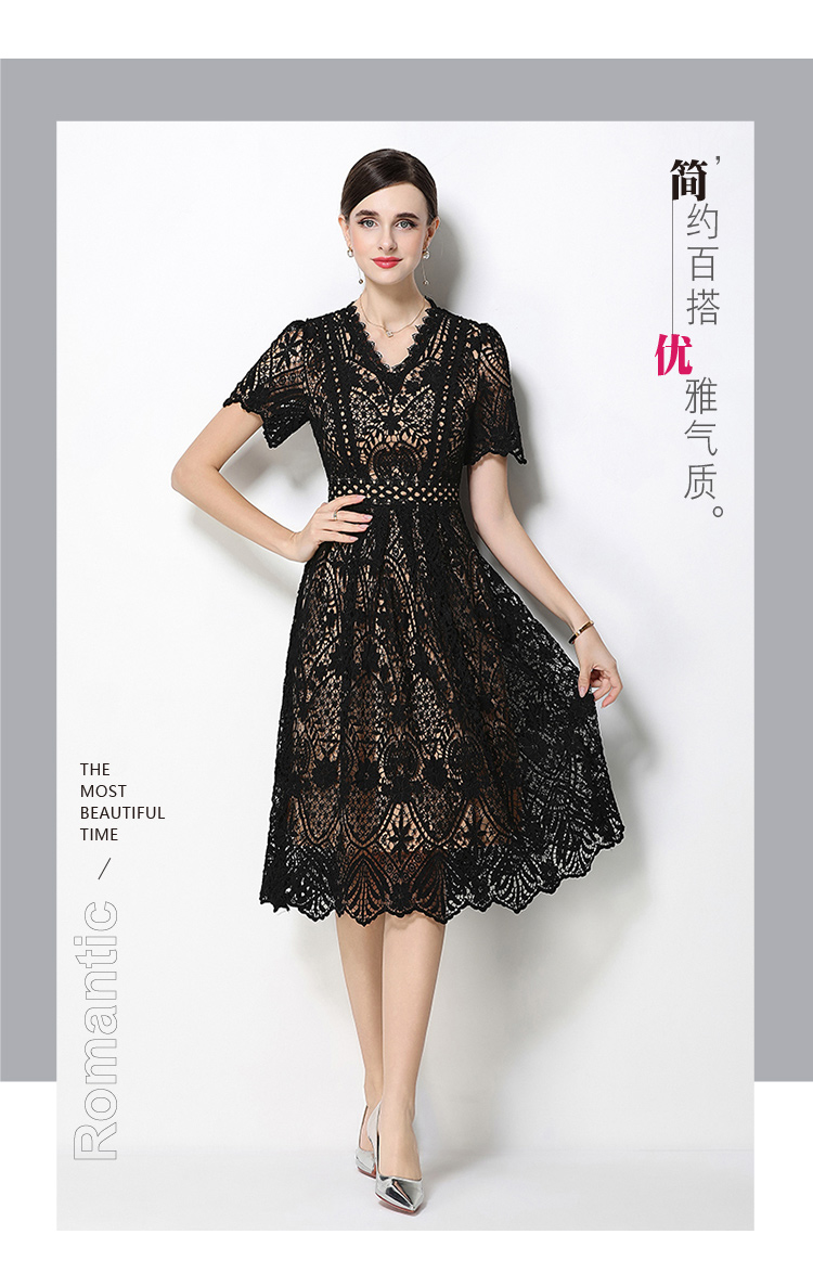 RY1705# 实拍原创V领时尚显瘦镂空水溶蕾丝定位中长款连衣裙