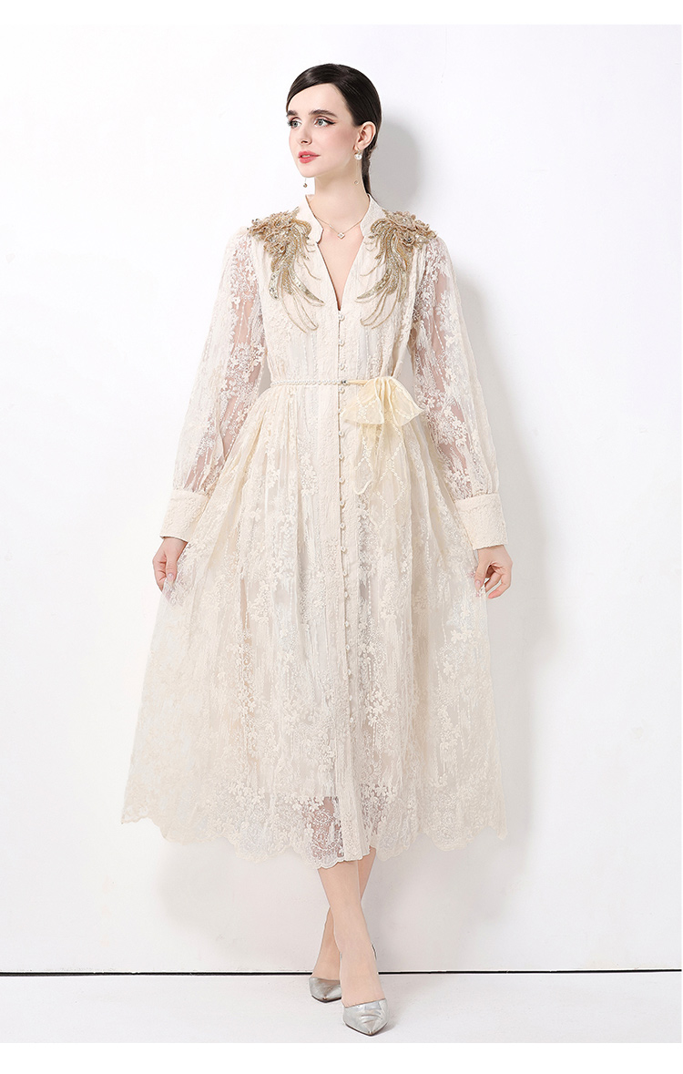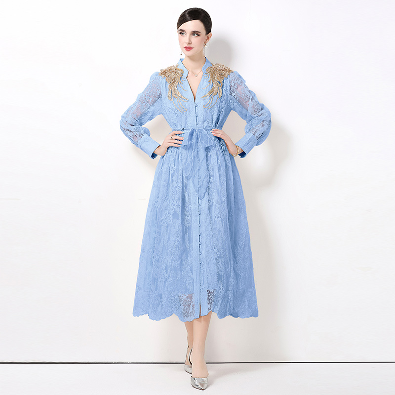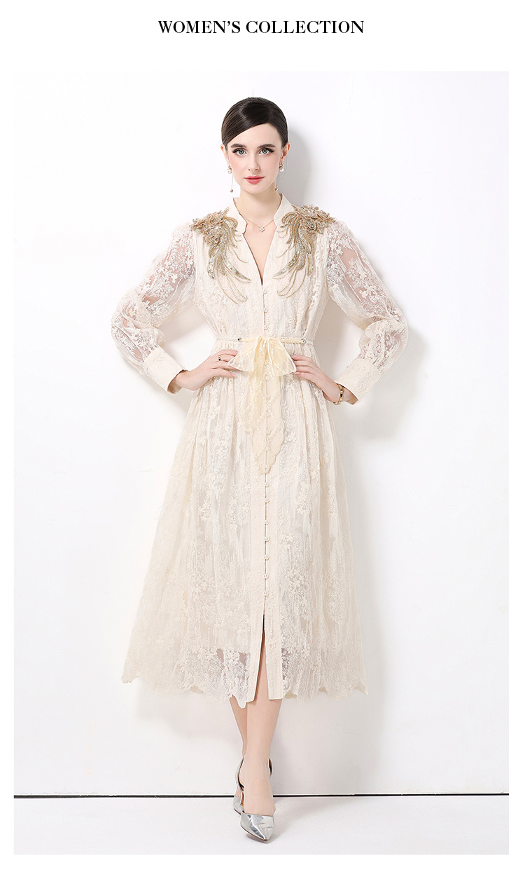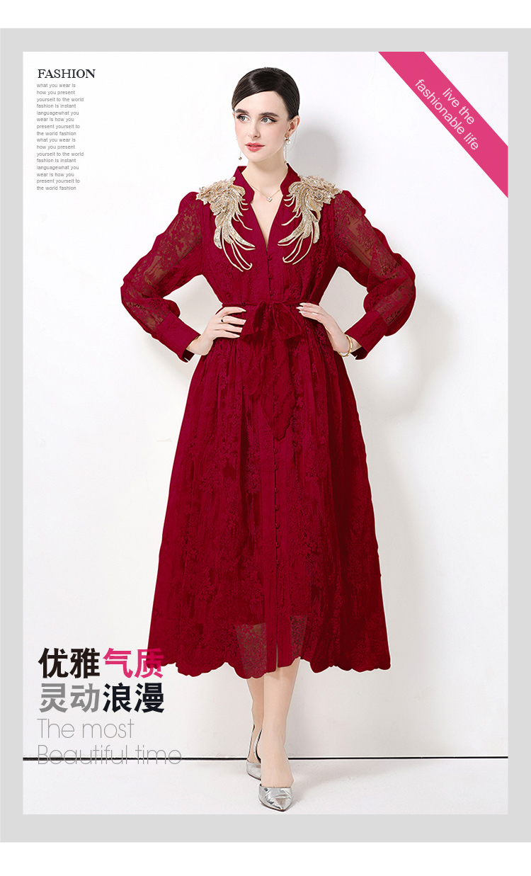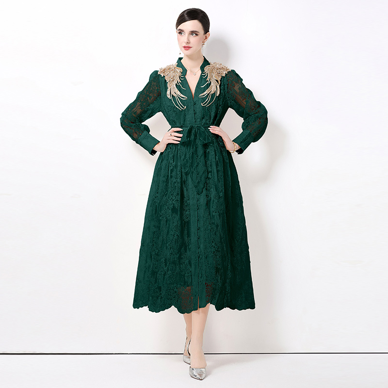 RY1727# 宫廷刺绣水溶蕾丝复古长款连衣裙重工百搭连衣裙