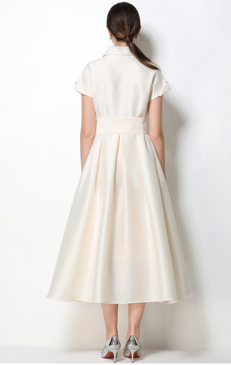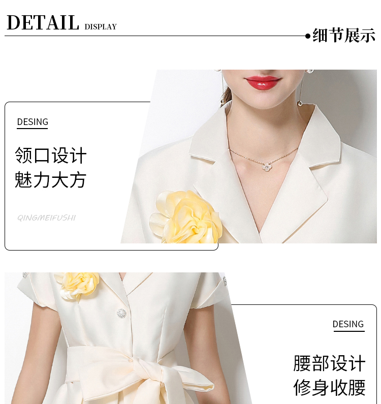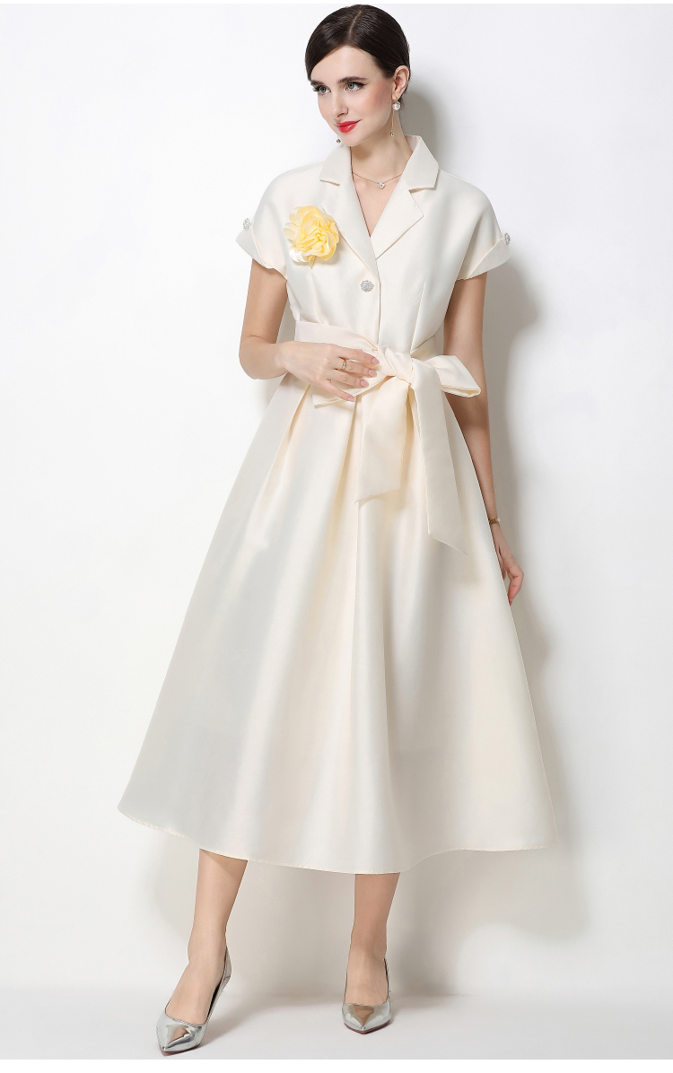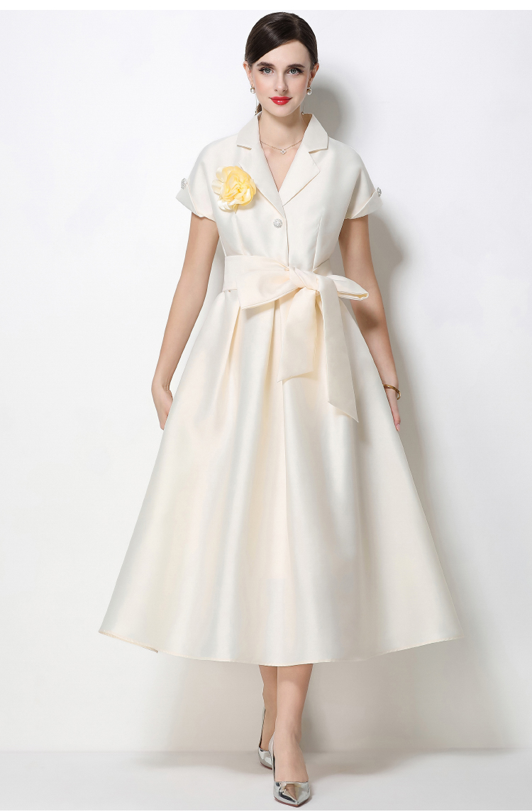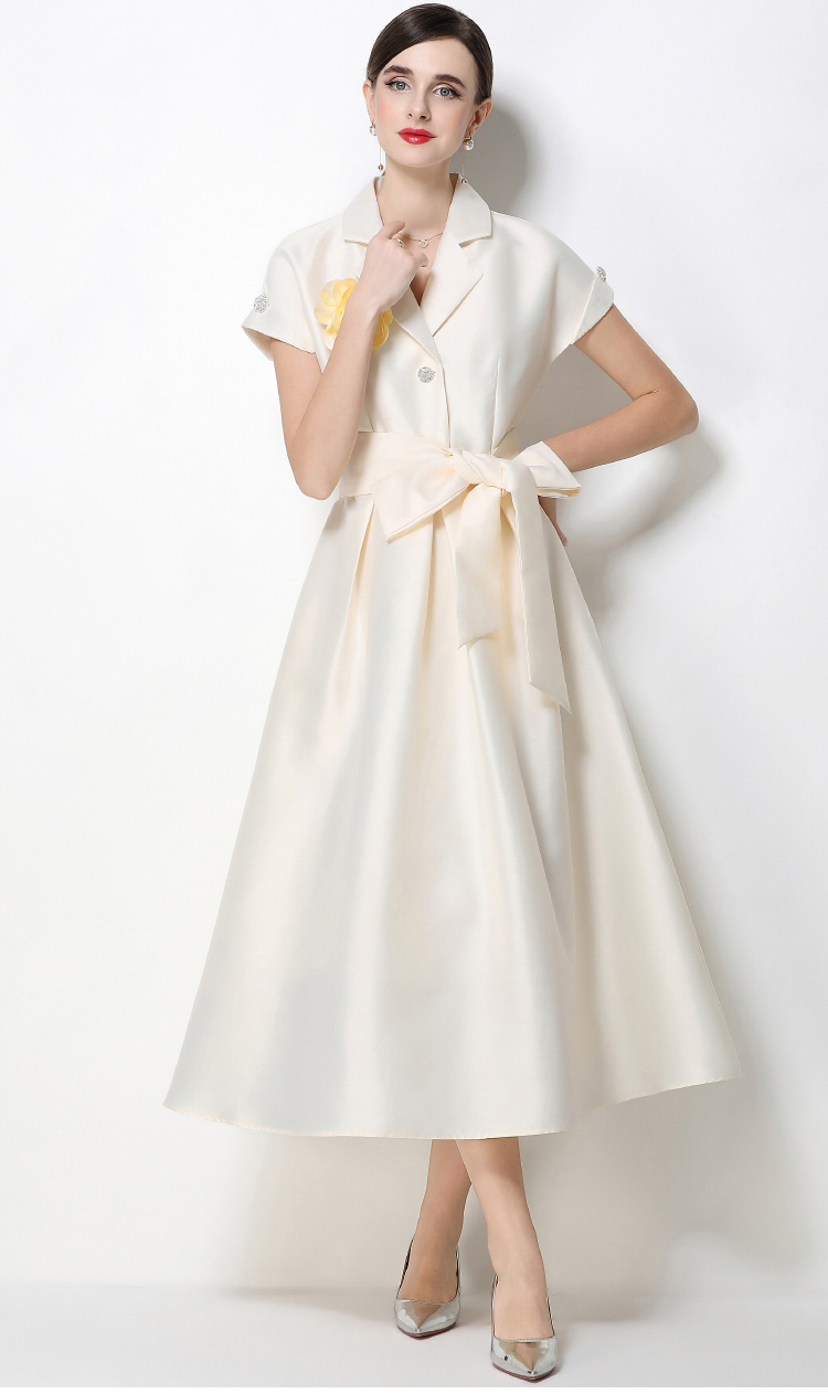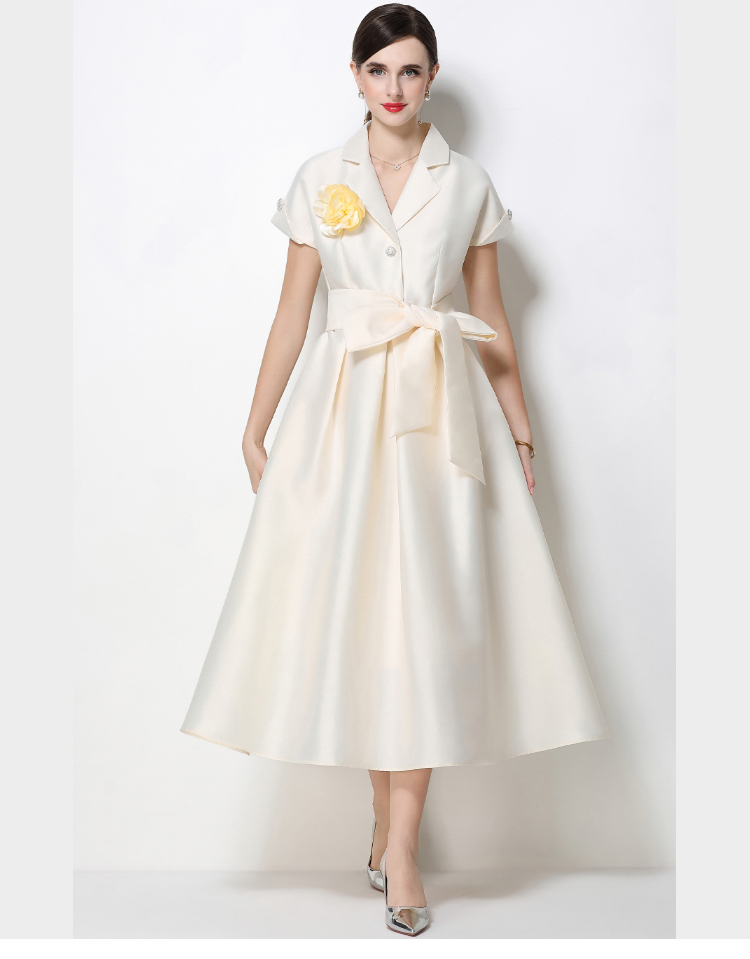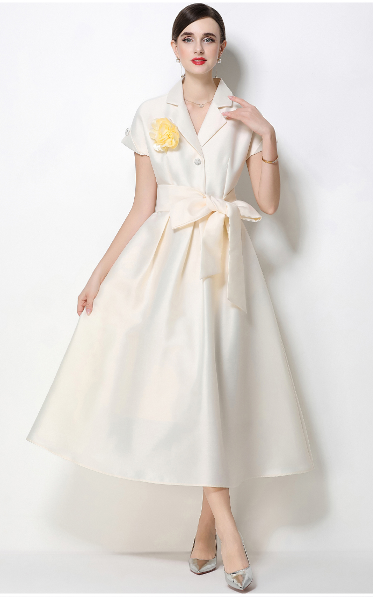 RY1737# 实拍优雅气质缎面西装领连衣裙大摆优雅收腰显瘦A字礼服裙配花朵
