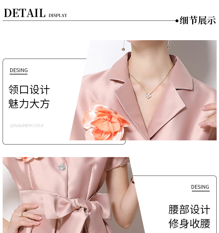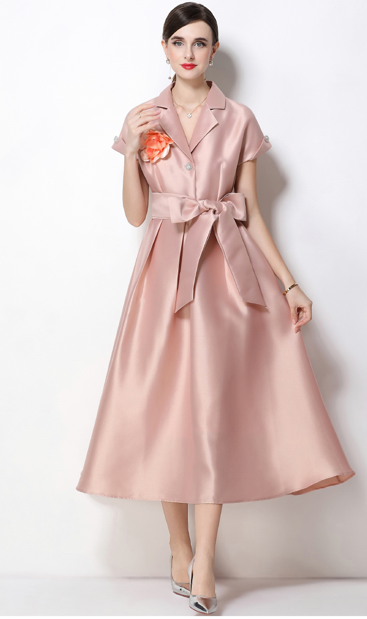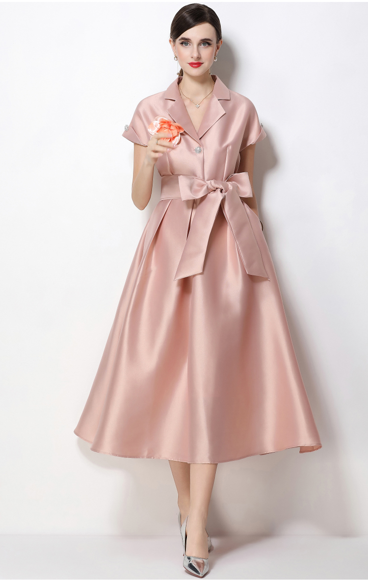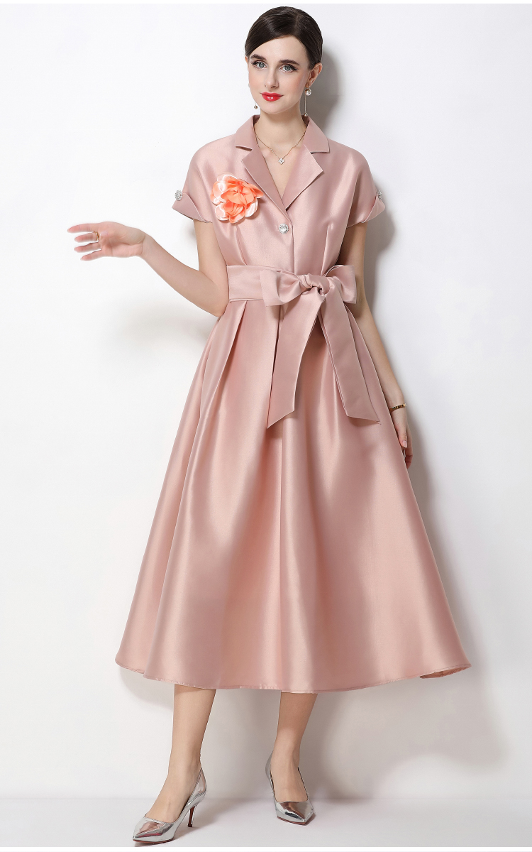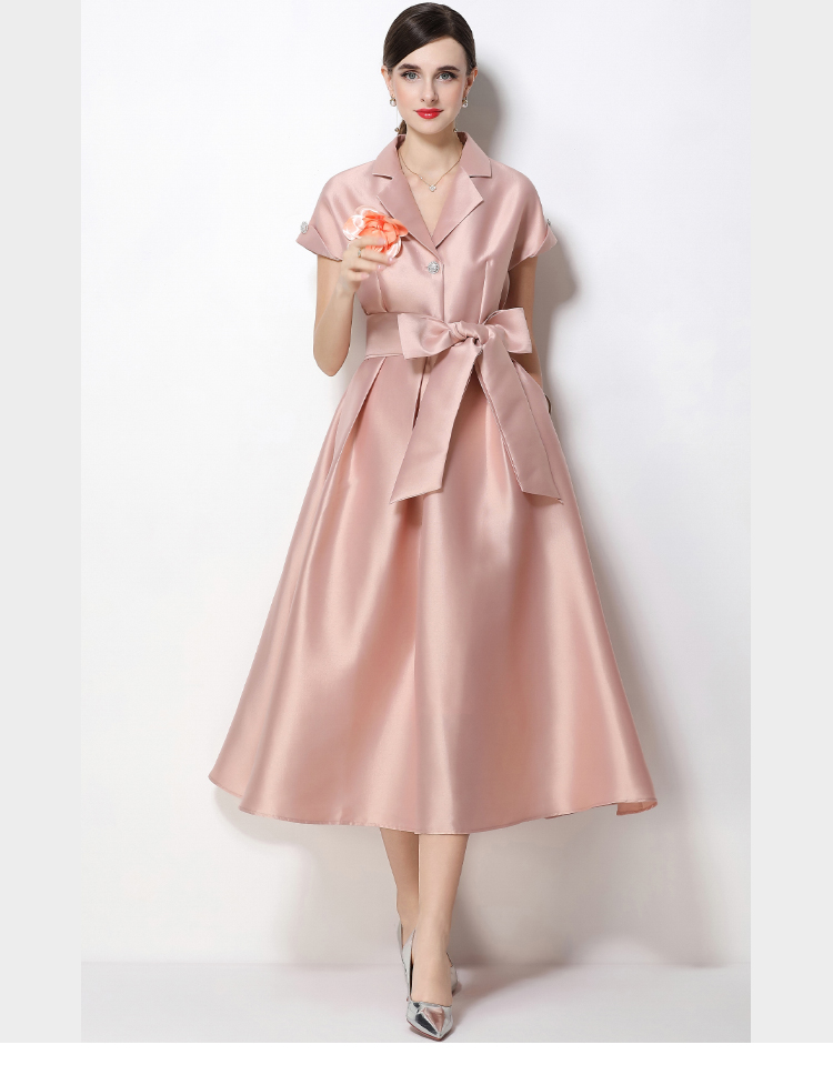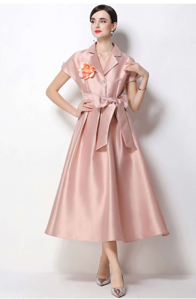RY1739# 实拍优雅气质缎面西装领连衣裙大摆优雅收腰显瘦A字礼服裙配花朵