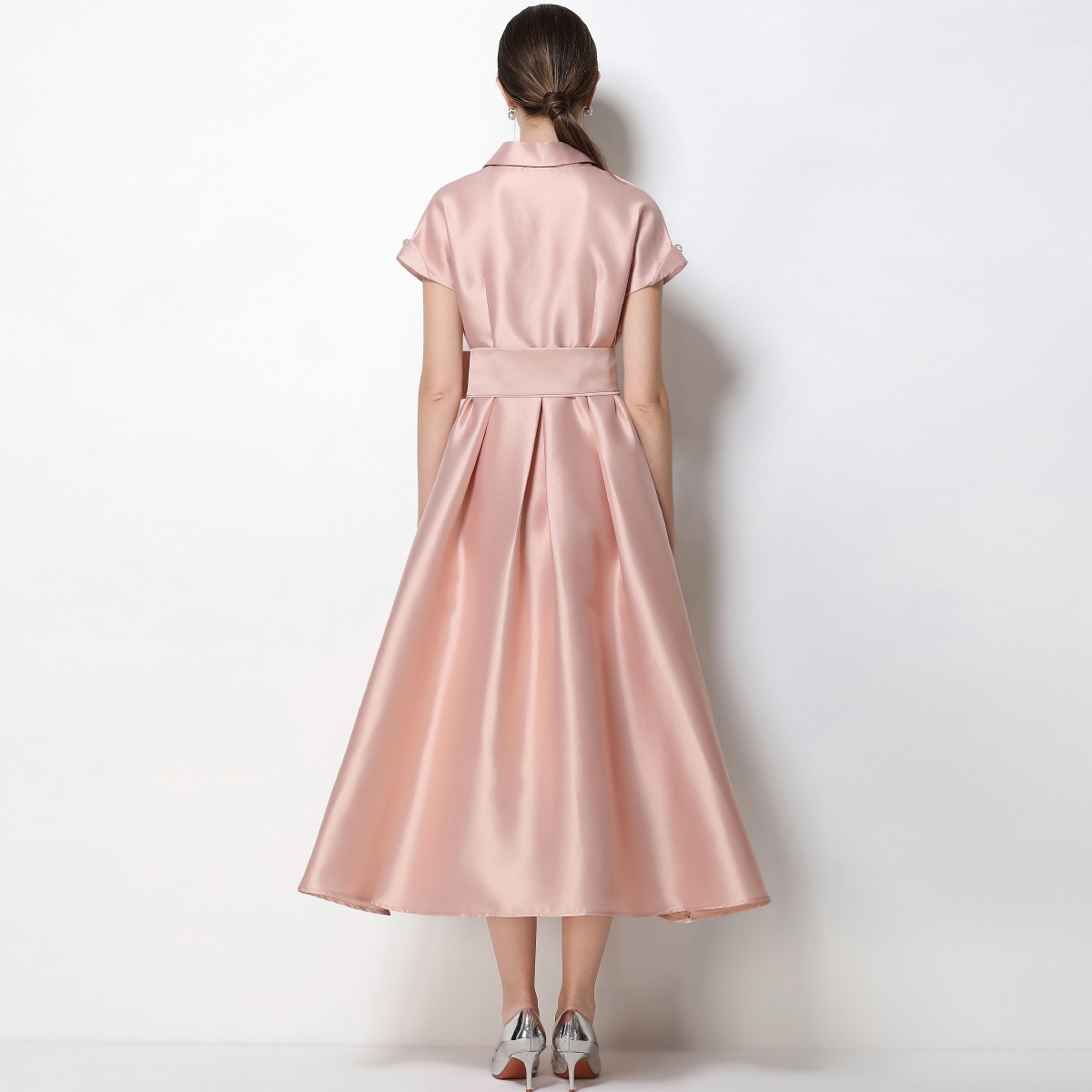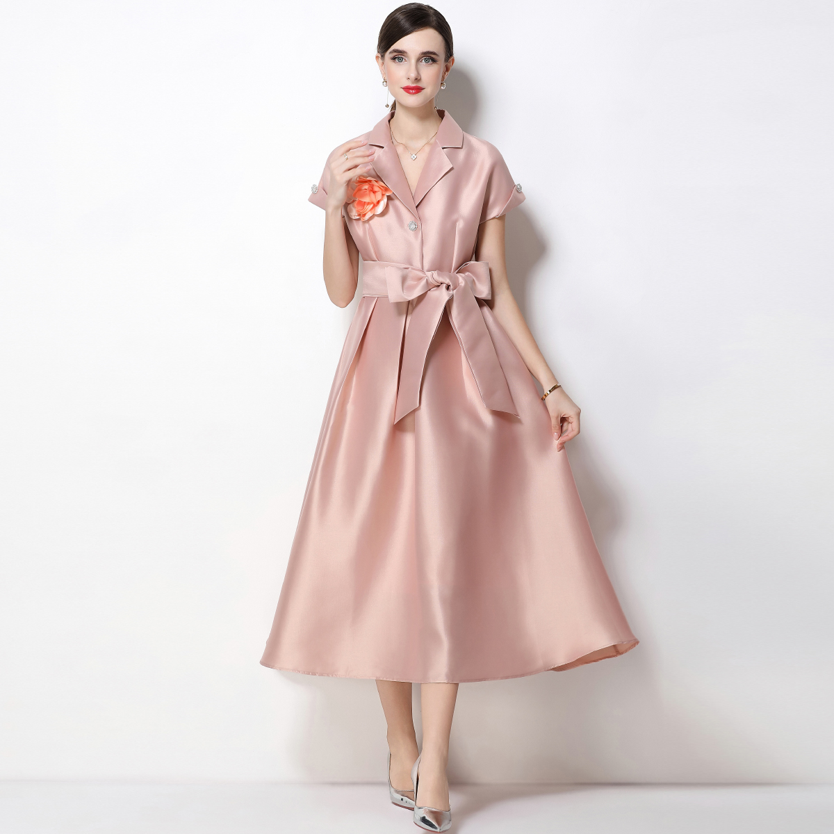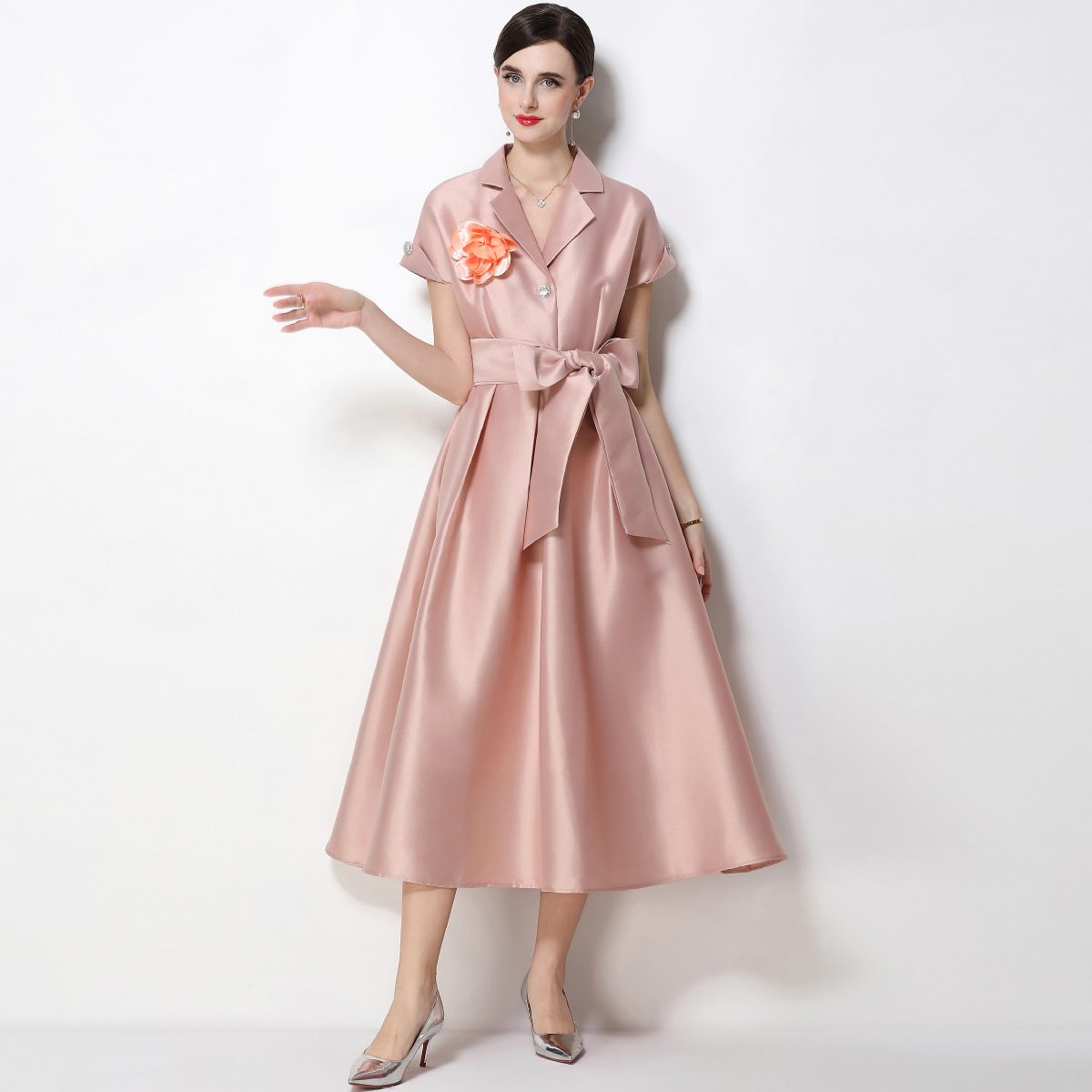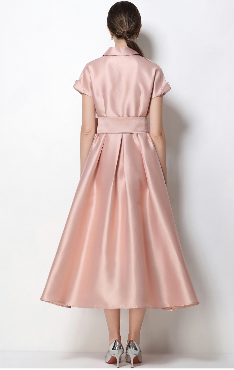 RY1739# 实拍优雅气质缎面西装领连衣裙大摆优雅收腰显瘦A字礼服裙配花朵
